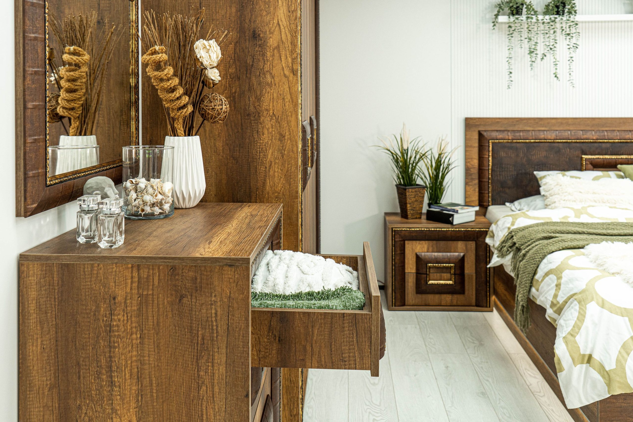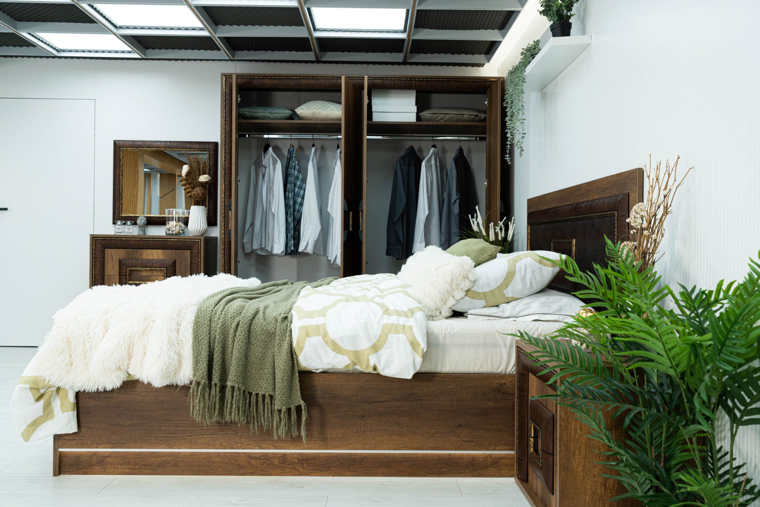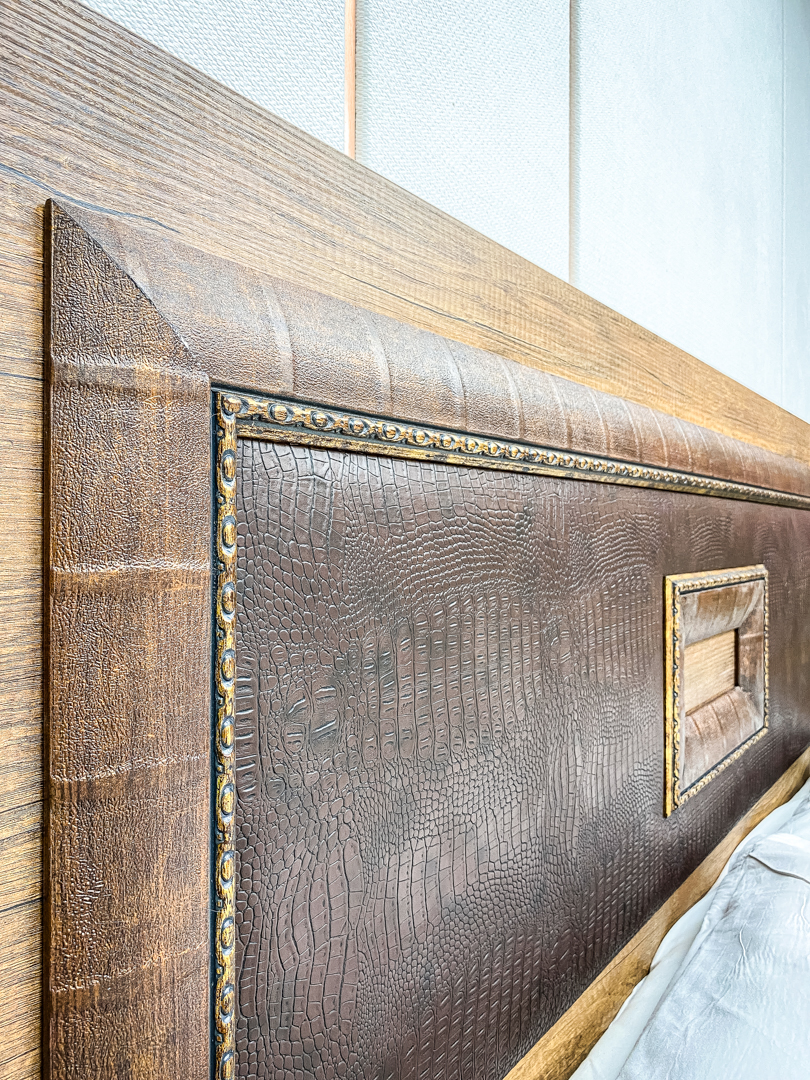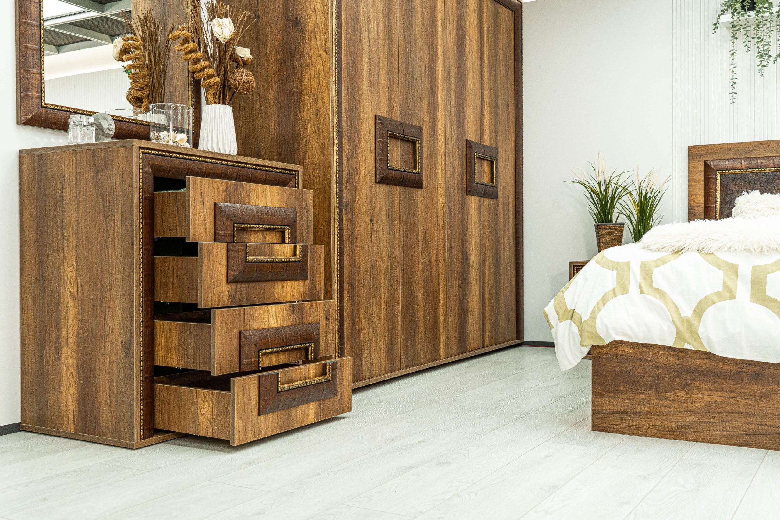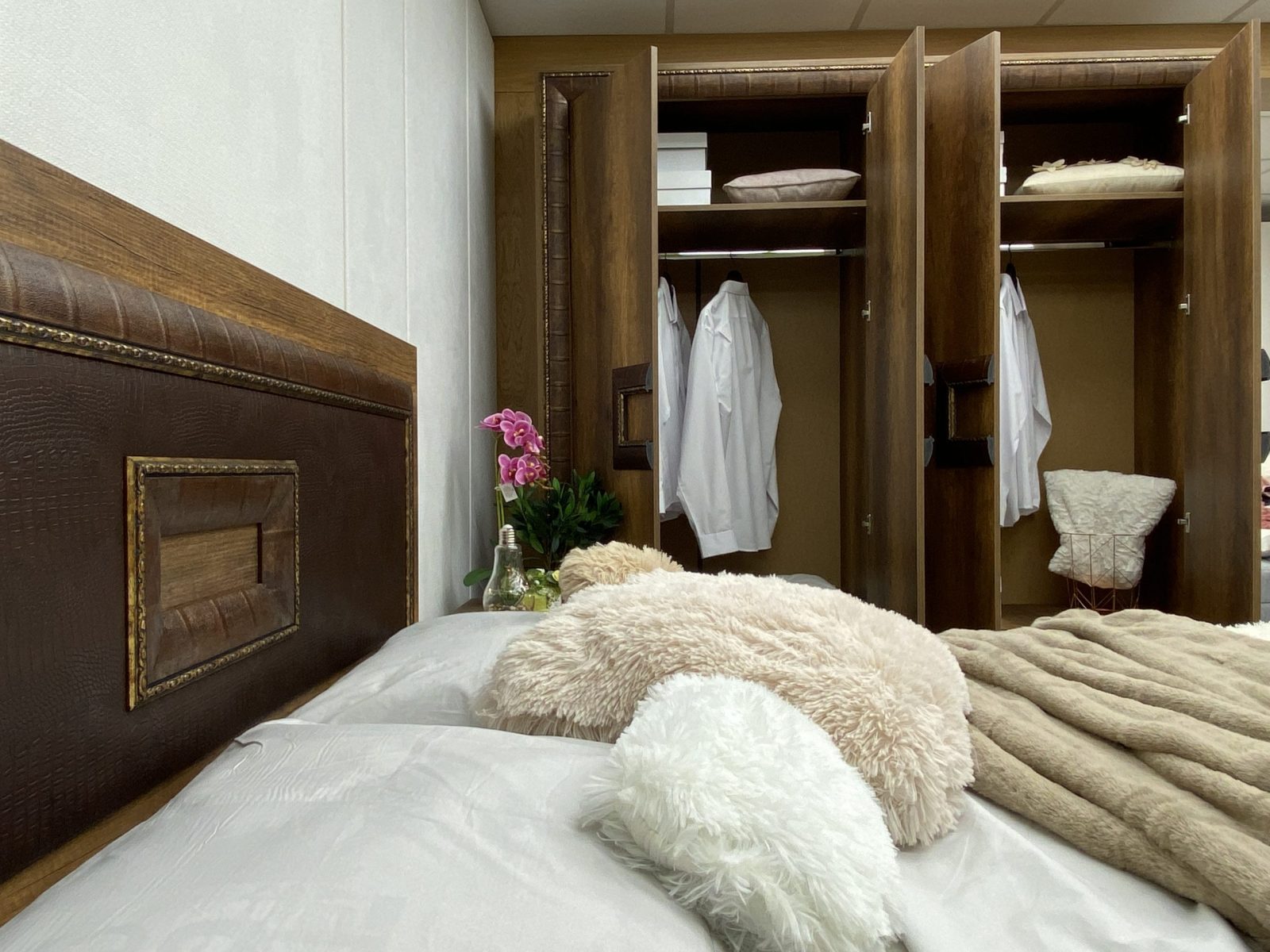 Легло: Елегантна табла, състояща се от основна плюс вградена тапицирана декоративна табла, рамкована от интериорен профил в цвят златно – кафяво, с подчертан завършващ златен ажур,  акцентирано присъствие на горещо щампована еко кожа тип „крокодилска шарка“. Базата за матрак е с вграден вътрешен мост, който гарантира прав диагонал на леглото. Всички сглобки са метални – скрит монтаж.  Дългите царги на леглото са сдвоени в които е вградено практично LED осветление с начин на работа – дистационно.