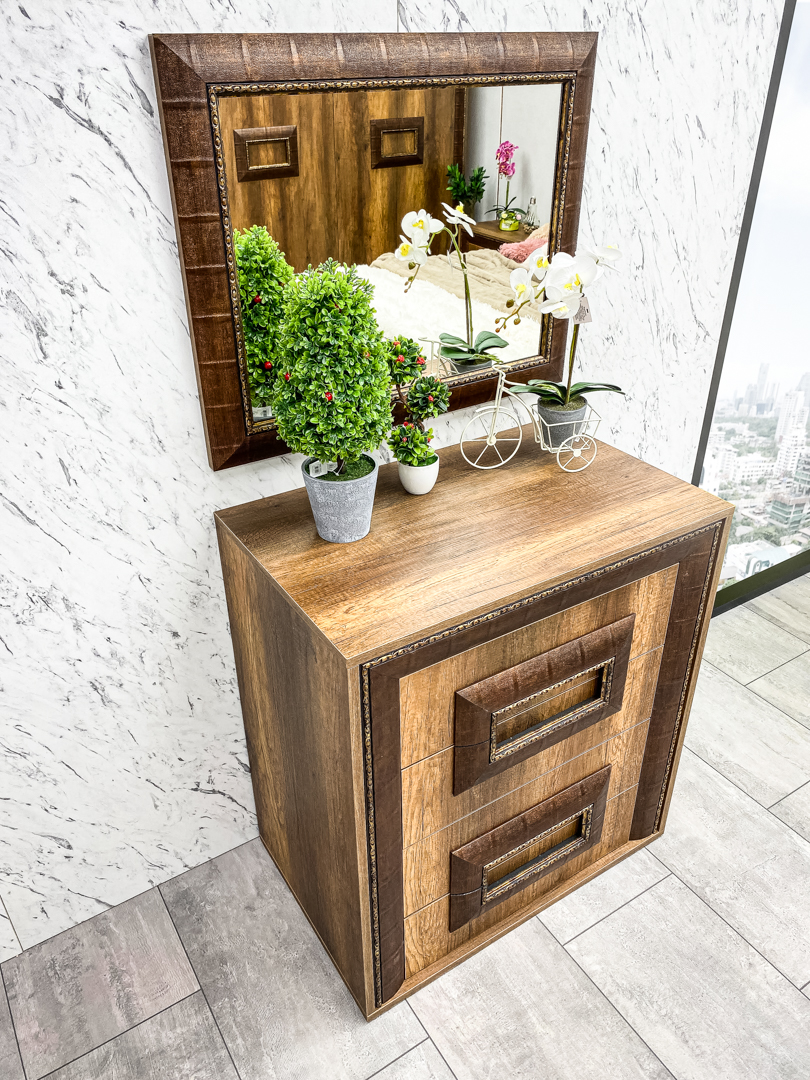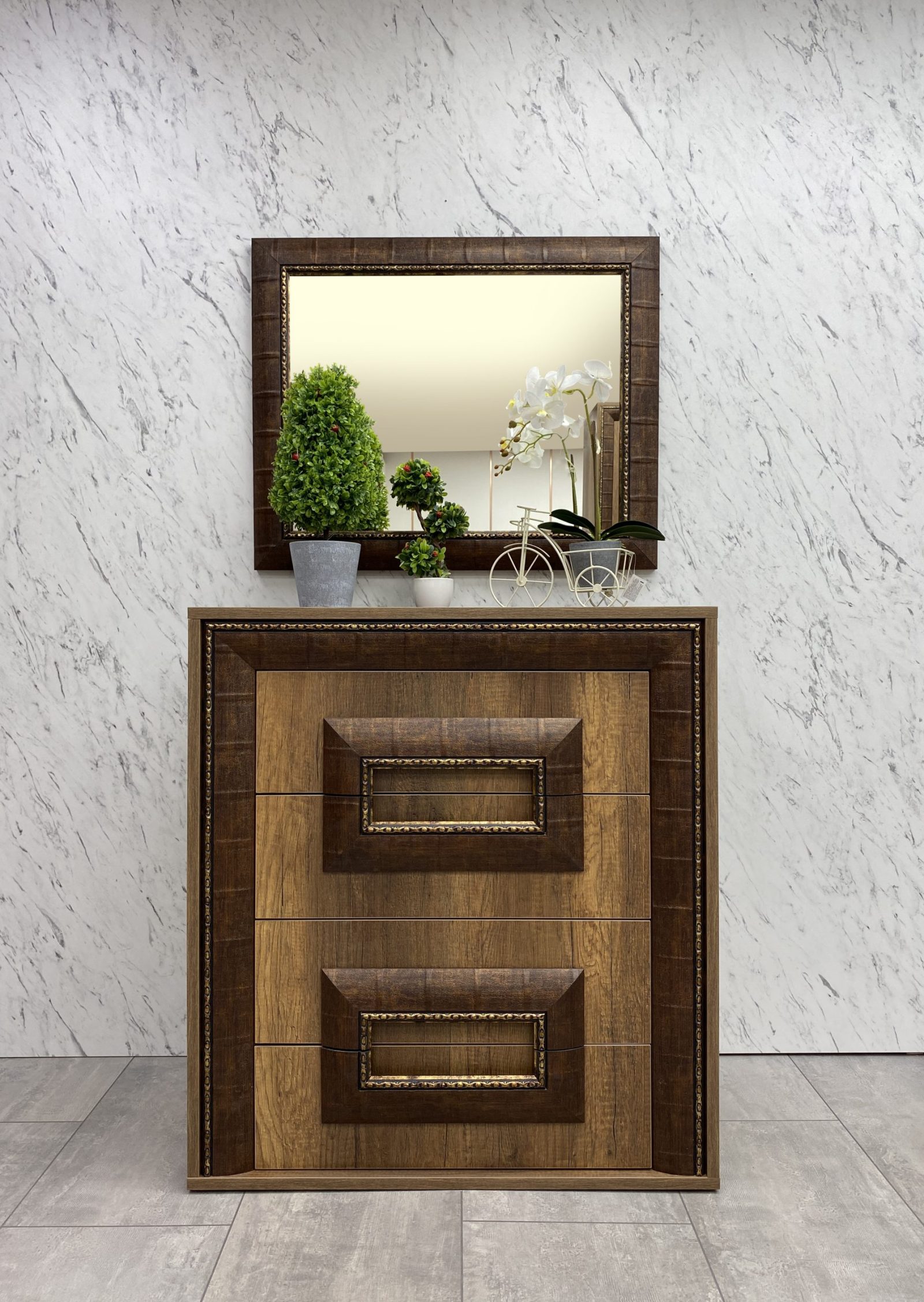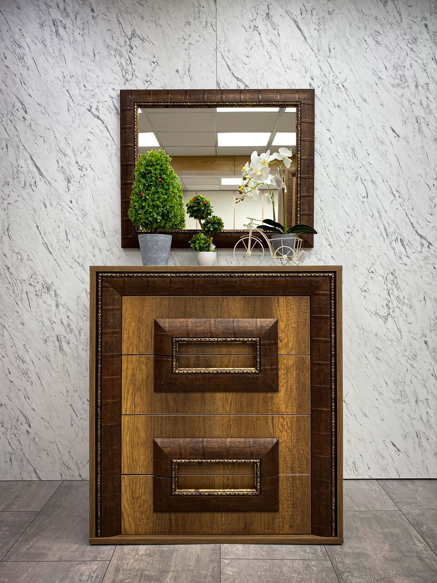 Рамкиран скрин с огледало – Опция! Четири практични чекмеджета с дръжки – система скрити водачи Quadro Hettich – плавно затваряне. Уникалният дизайн е подчертан и рамкиран с „П“ – образен интериорен профил – сглобка тип „герунг“, рамкирано огледало в същия интериорен профил, ориентирано за стенен монтаж – 1 бр. в к-т;