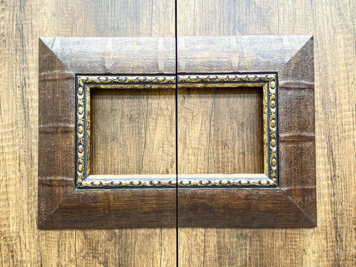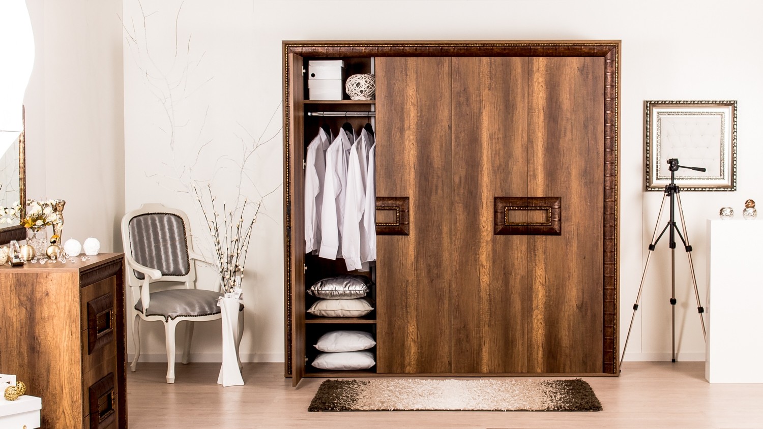 Рамкиран гардероб: Четирикрилно разпределение, системата на отваряне е с метални, вкопани панти с функция за реглаж – плавно прибиране, дръжки – прецизно изпълнение от интериорен профил цвят сребро, завършващ на сглобка тип „герунг“. Гардеробът е със скрити сглобки и метални рафтоносачи, с цел по–добър външен вид и надеждна експлоатация, лоста за дрехи е метален с елипсовидна форма и покритие – никел, панти – плавно затваряне. Уникалният дизайн е подчертан и рамкиран с „П“ – образен интериорен профил – сглобка тип „герунг“ –  1 бр. в к-т;