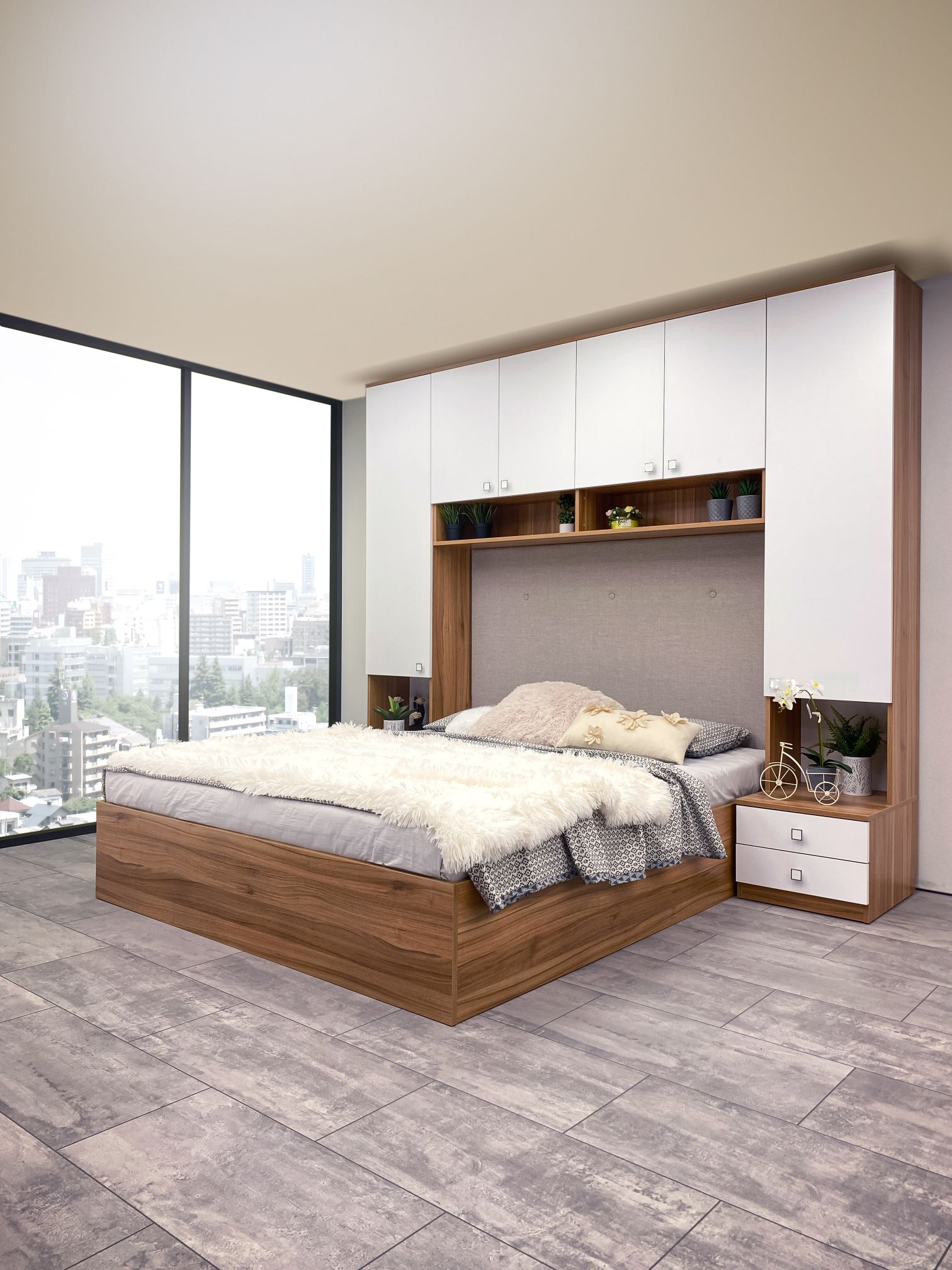 Легло: Тапицирана табла – жакардова дамаска, база за матрак с вграден вътрешен мост, гарантиращ прав диагонал на леглото. Всички използвани сглобки са метални – скрит монтаж, осигуряващи изряден външен вид на изделието, включено е дъно и мех. за повдигане. Странични царги – сдвоени от двата декора с обща дебелина 36 мм, опция – осветление LED система;