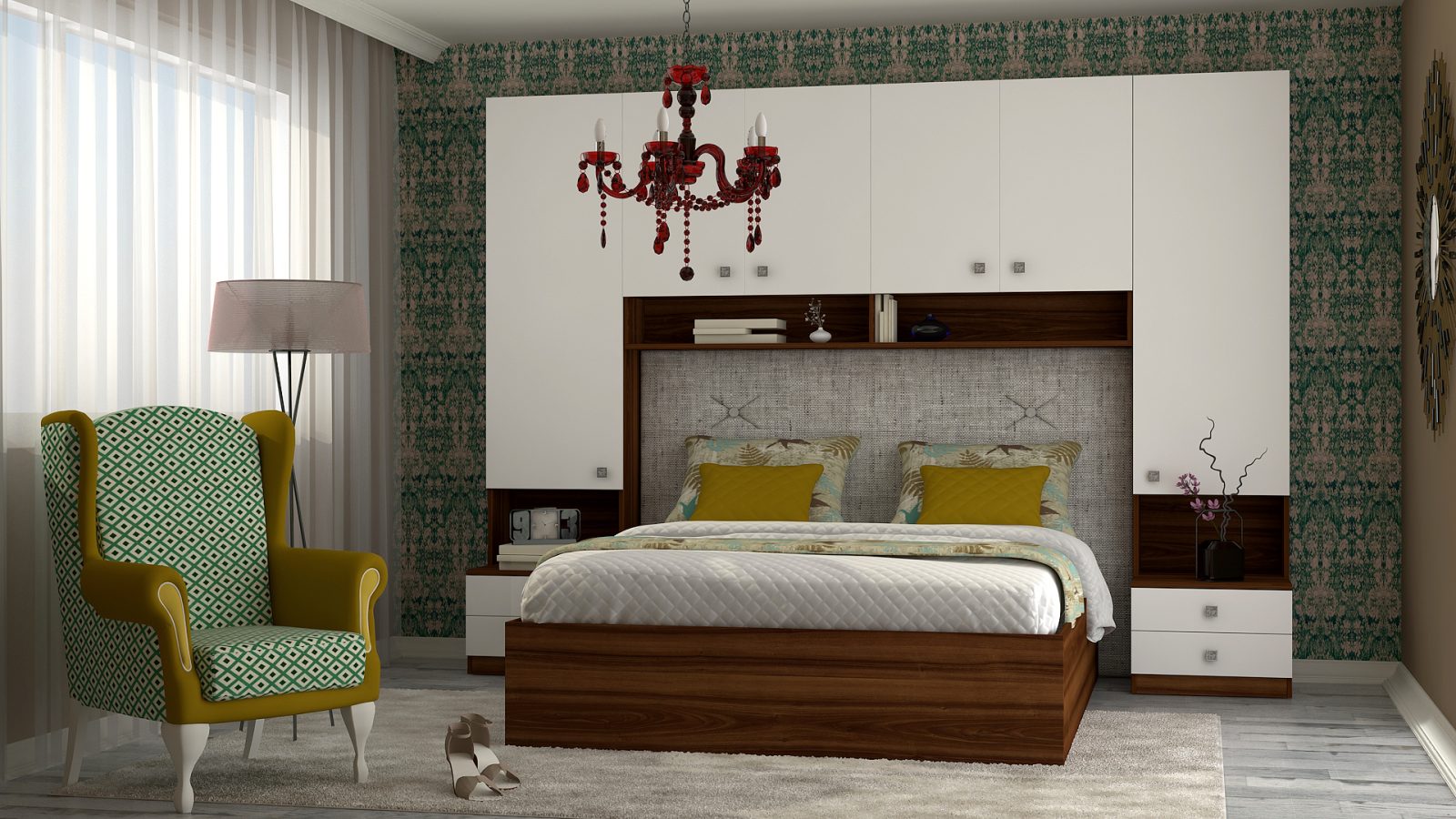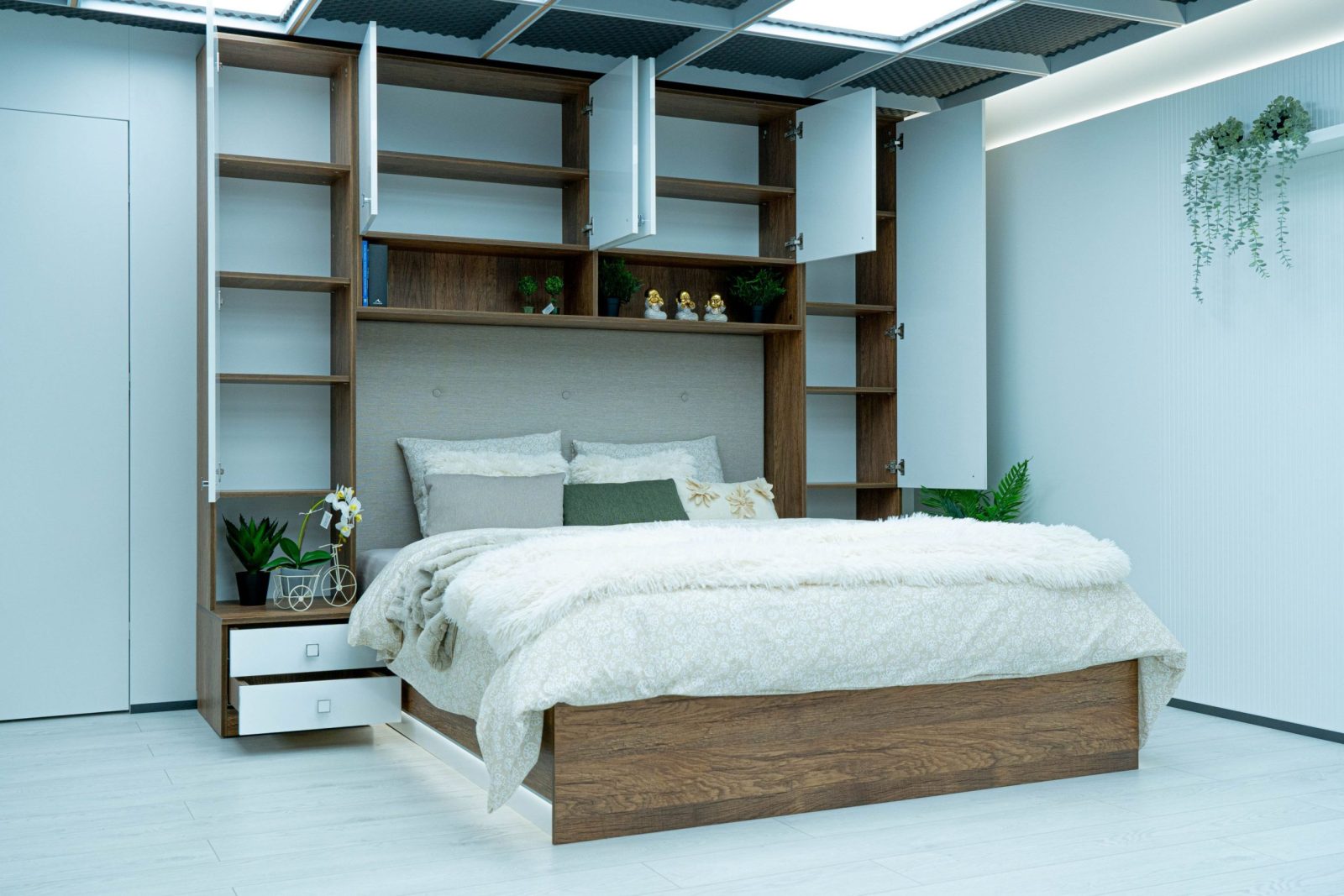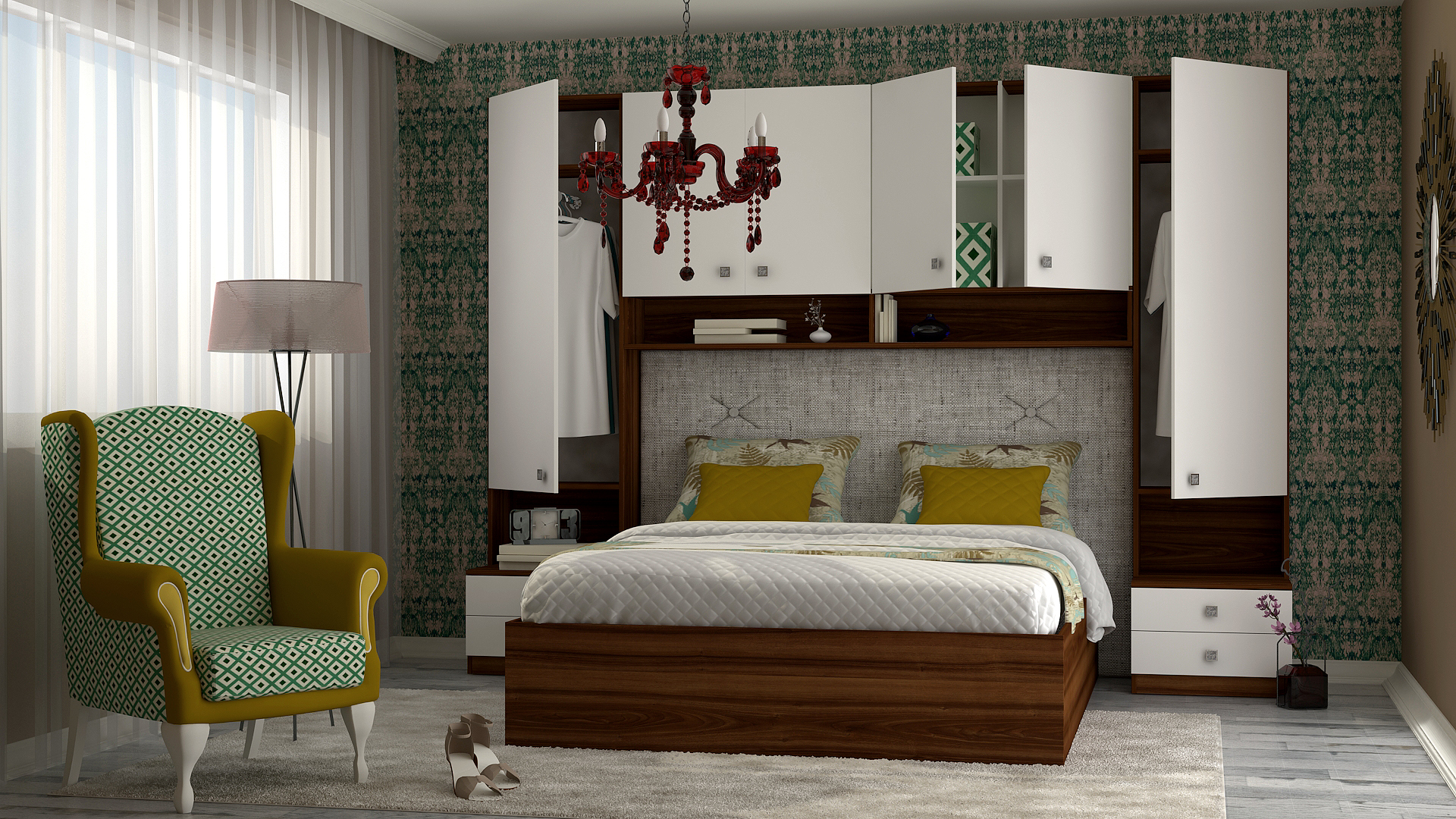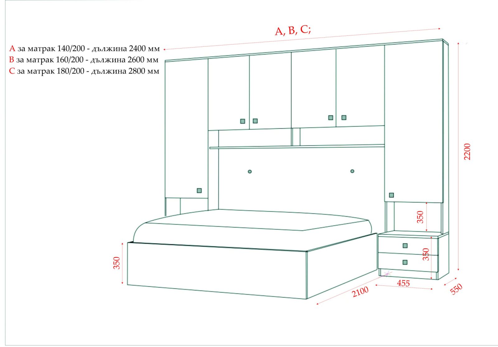 Гардероби: основа 2 бр практични чекмеджета – система скрити водачи Quadro Hettich – плавно затваряне,  врати – отваряне – панта плавно затваряне, използвани са сглобки – скрит монтаж, метални рафтоносачи за стабилност на рафтовете,  дръжки –  никел – бяла сърцевина,  разпределение на гардероби и надстройка – рафтове;