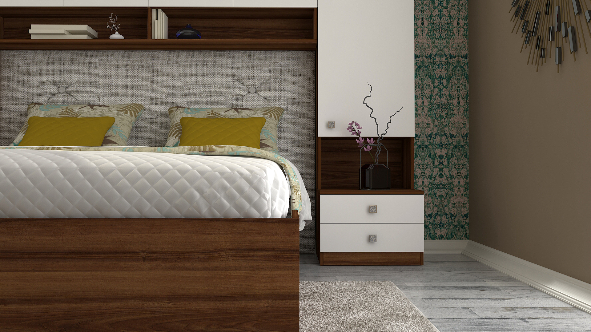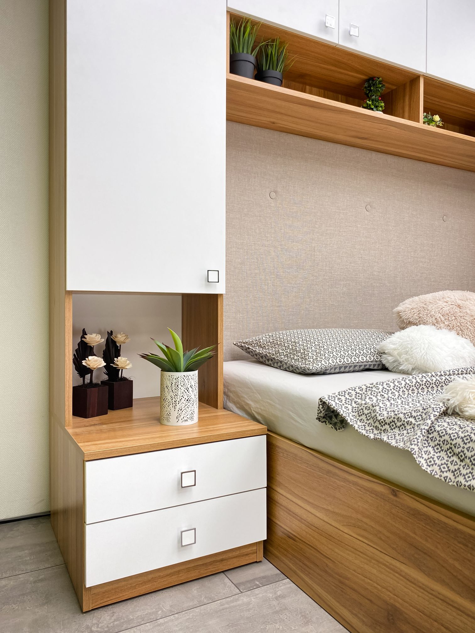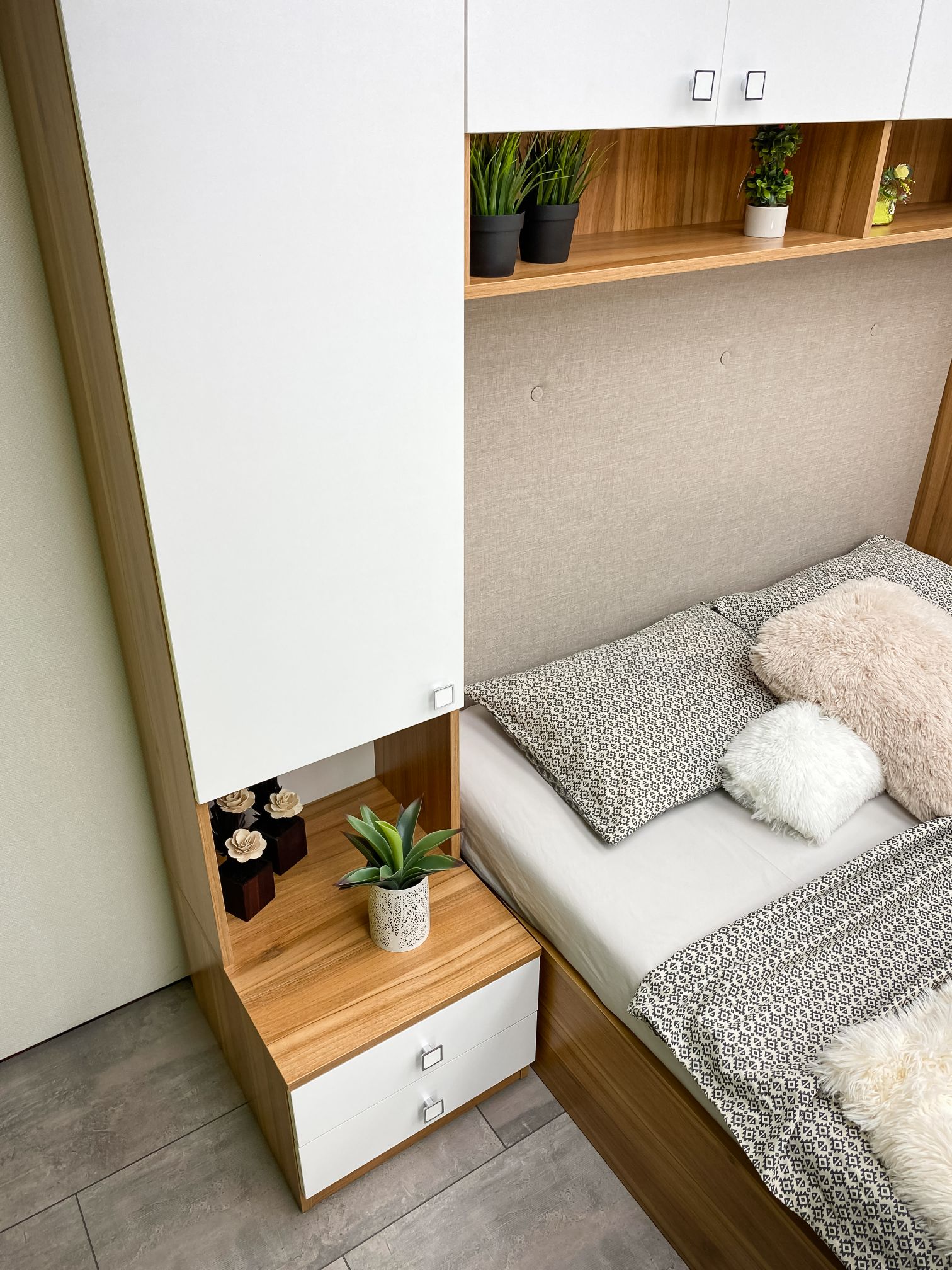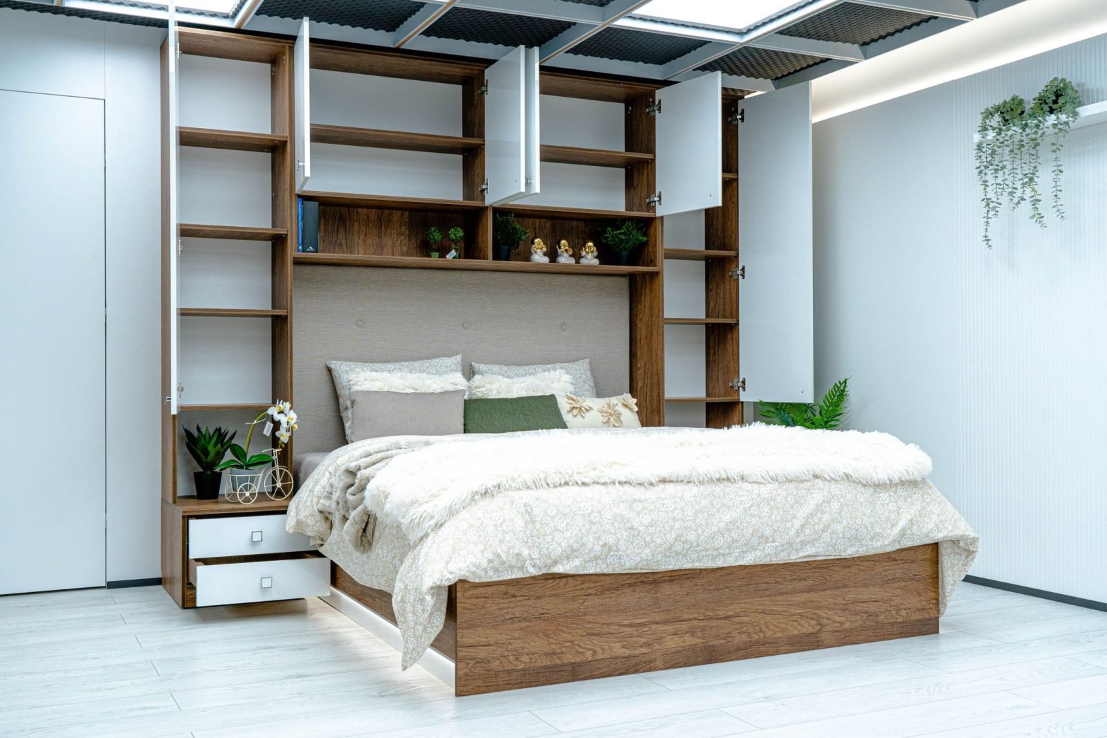 Гардероби: основа 2 бр практични чекмеджета – система скрити водачи Quadro Hettich – плавно затваряне,  врати – отваряне – панта плавно затваряне, използвани са сглобки – скрит монтаж, метални рафтоносачи за стабилност на рафтовете,  дръжки –  никел – бяла сърцевина,  разпределение на гардероби и надстройка – рафтове;