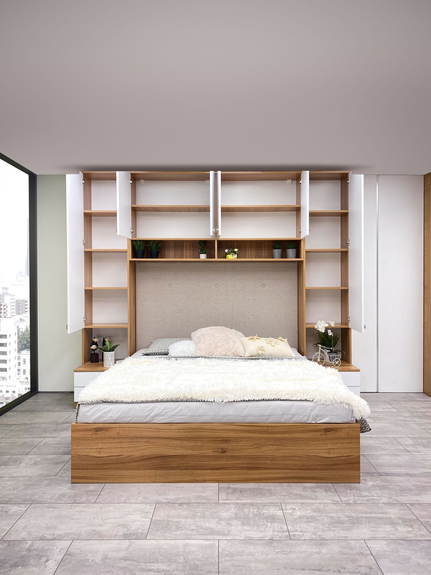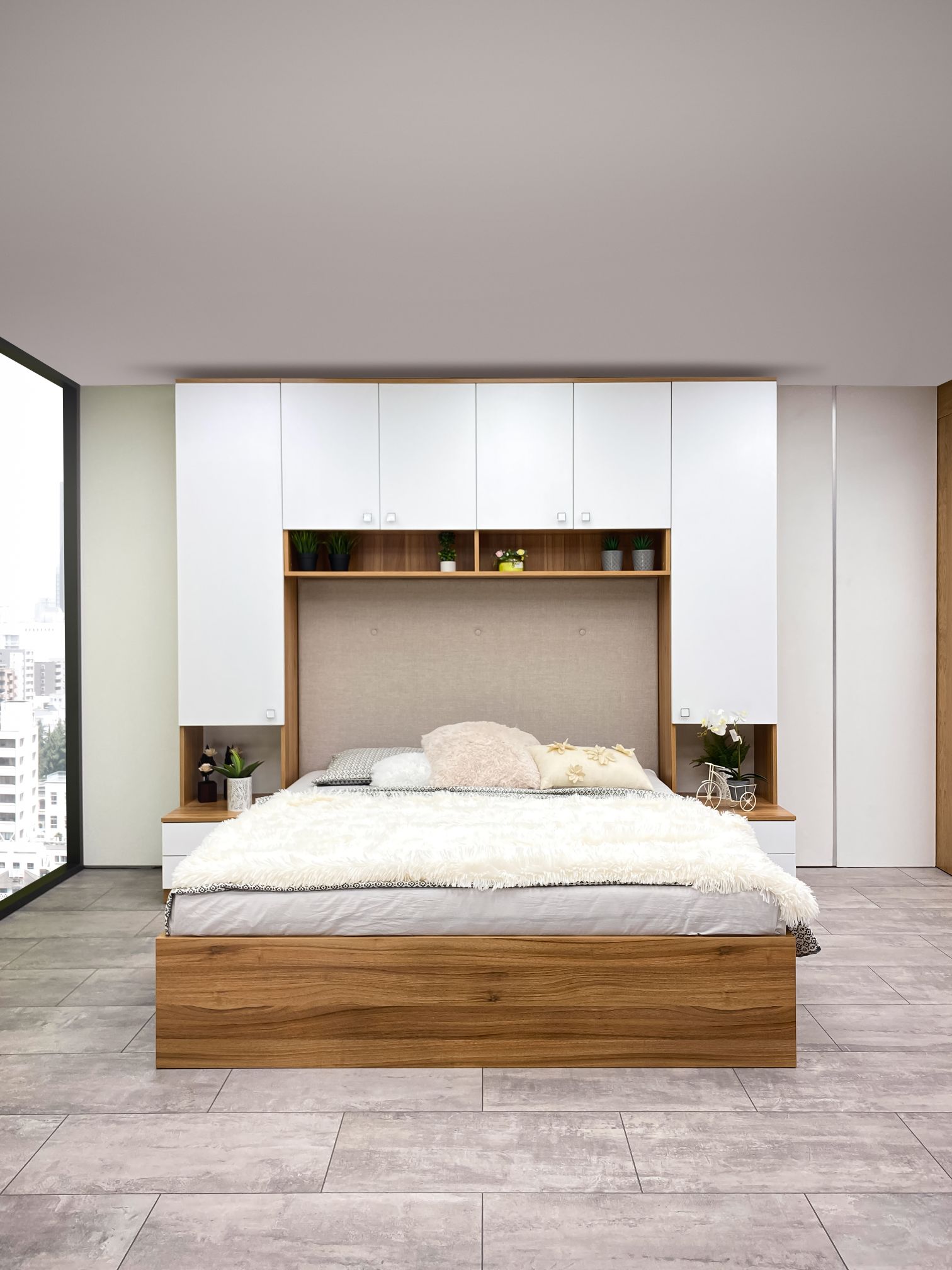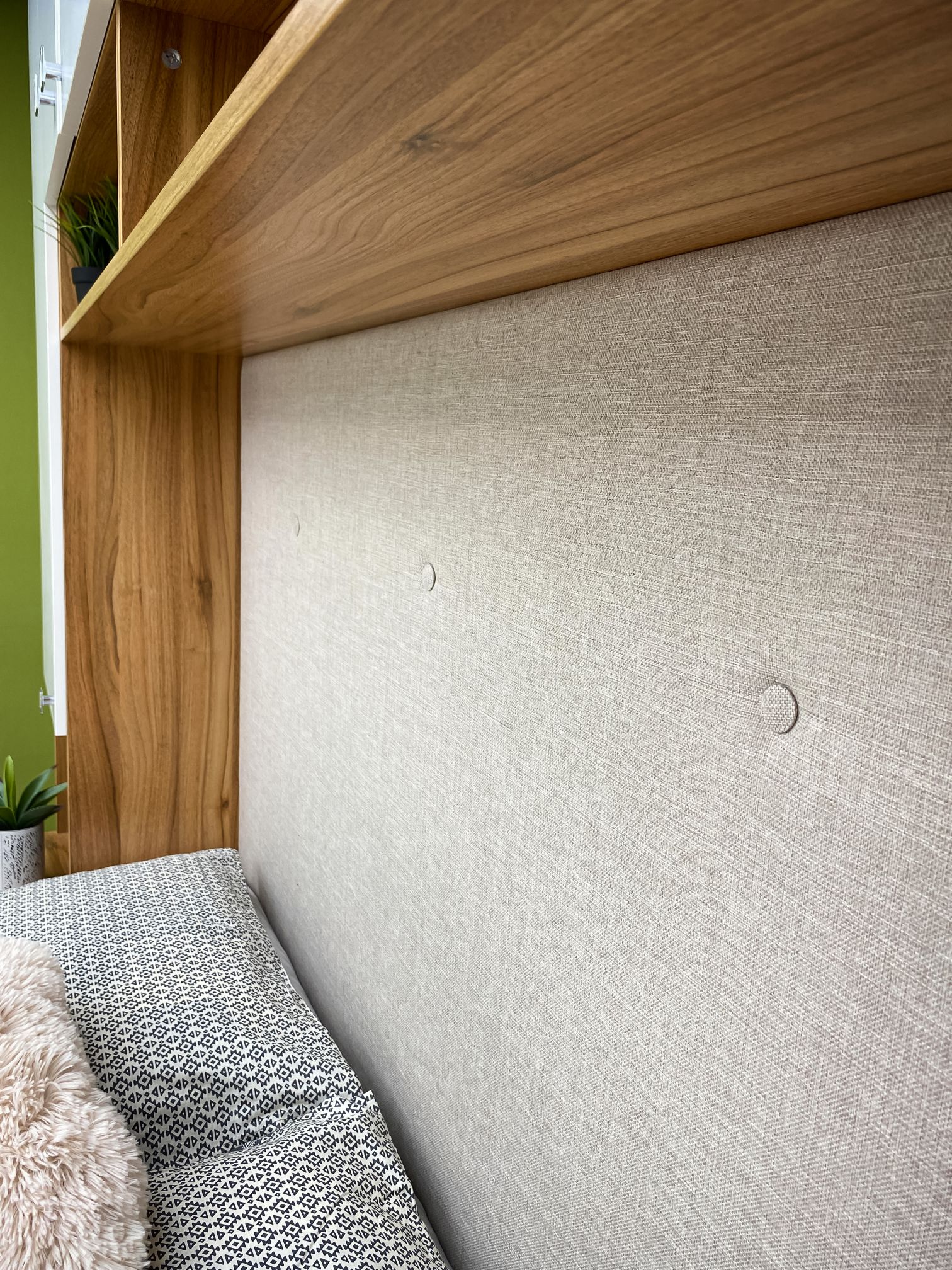 Легло: Тапицирана табла – жакардова дамаска, база за матрак с вграден вътрешен мост, гарантиращ прав диагонал на леглото. Всички използвани сглобки са метални – скрит монтаж, осигуряващи изряден външен вид на изделието, включено е дъно и мех. за повдигане. Странични царги – сдвоени от двата декора с обща дебелина 36 мм, опция – осветление LED система;