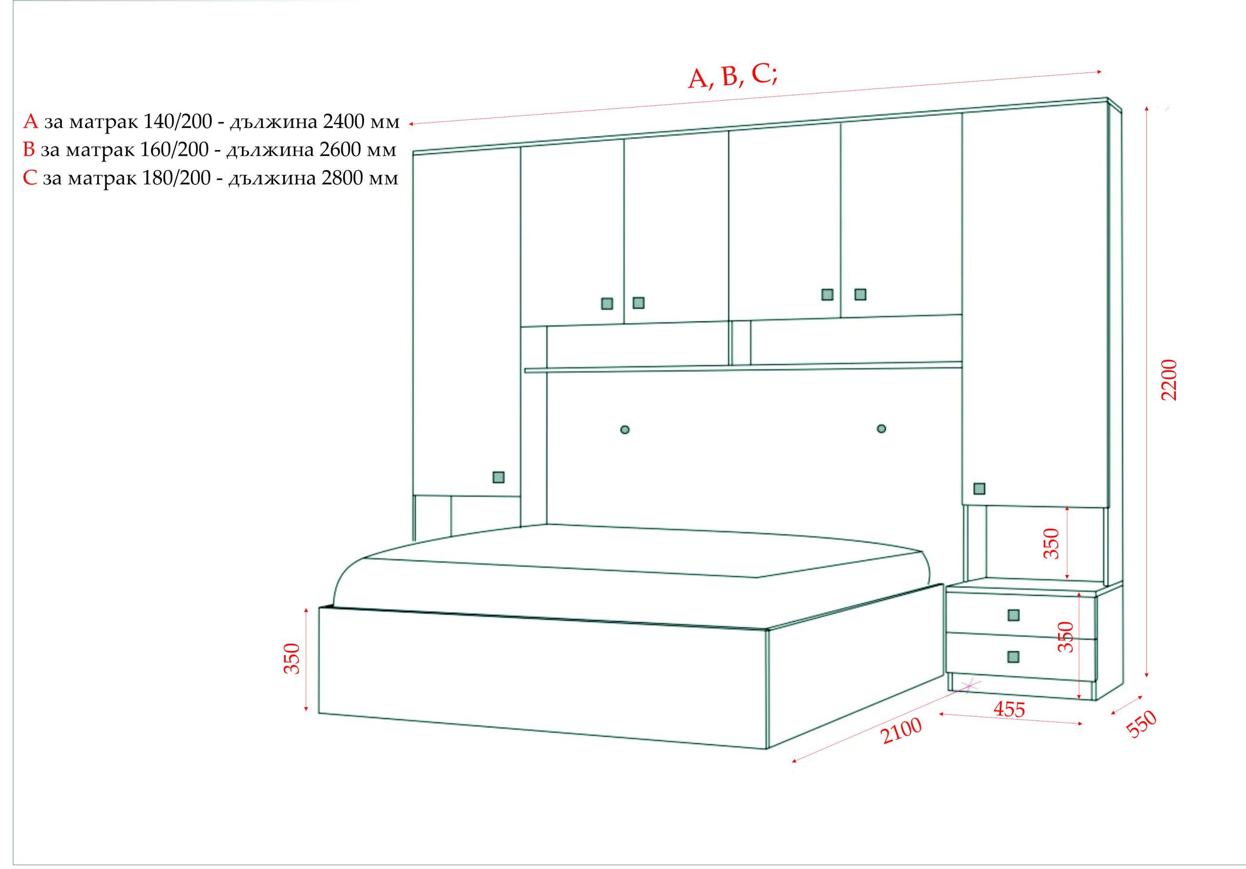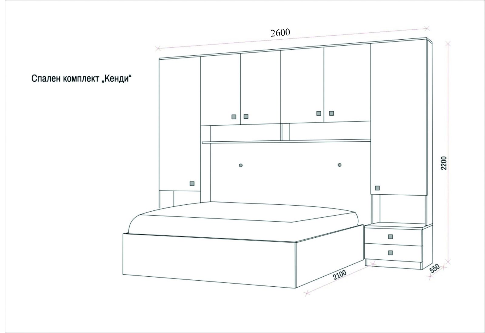 [vc_row type=“in_container“ full_screen_row_position=“middle“ column_margin=“default“ column_direction=“default“ column_direction_tablet=“default“ column_direction_phone=“default“ scene_position=“center“ text_color=“dark“ text_align=“left“ row_border_radius=“none“ row_border_radius_applies=“bg“ overflow=“visible“ overlay_strength=“0.3″ gradient_direction=“left_to_right“ shape_divider_position=“bottom“ bg_image_animation=“none“][vc_column column_padding=“no-extra-padding“ column_padding_tablet=“inherit“ column_padding_phone=“inherit“ column_padding_position=“all“ column_element_direction_desktop=“default“ column_element_spacing=“default“ desktop_text_alignment=“default“ tablet_text_alignment=“default“ phone_text_alignment=“default“ background_color_opacity=“1″ background_hover_color_opacity=“1″ column_backdrop_filter=“none“ column_shadow=“none“ column_border_radius=“none“ column_link_target=“_self“ column_position=“default“ gradient_direction=“left_to_right“ overlay_strength=“0.3″ width=“1/1″ tablet_width_inherit=“default“ animation_type=“default“ bg_image_animation=“none“ border_type=“simple“ column_border_width=“none“ column_border_style=“solid“][vc_column_text el_class=“description-holder-field“]спален комплект „Кенди“ е произведен от висококачествено ламинирано ПДЧ 18 мм, основен декор – дъб монтерей, съпътстващ  декор – снежно бял гланц – опция за избор, кантиран с 1 мм кант – фасетиран по ръбовете;