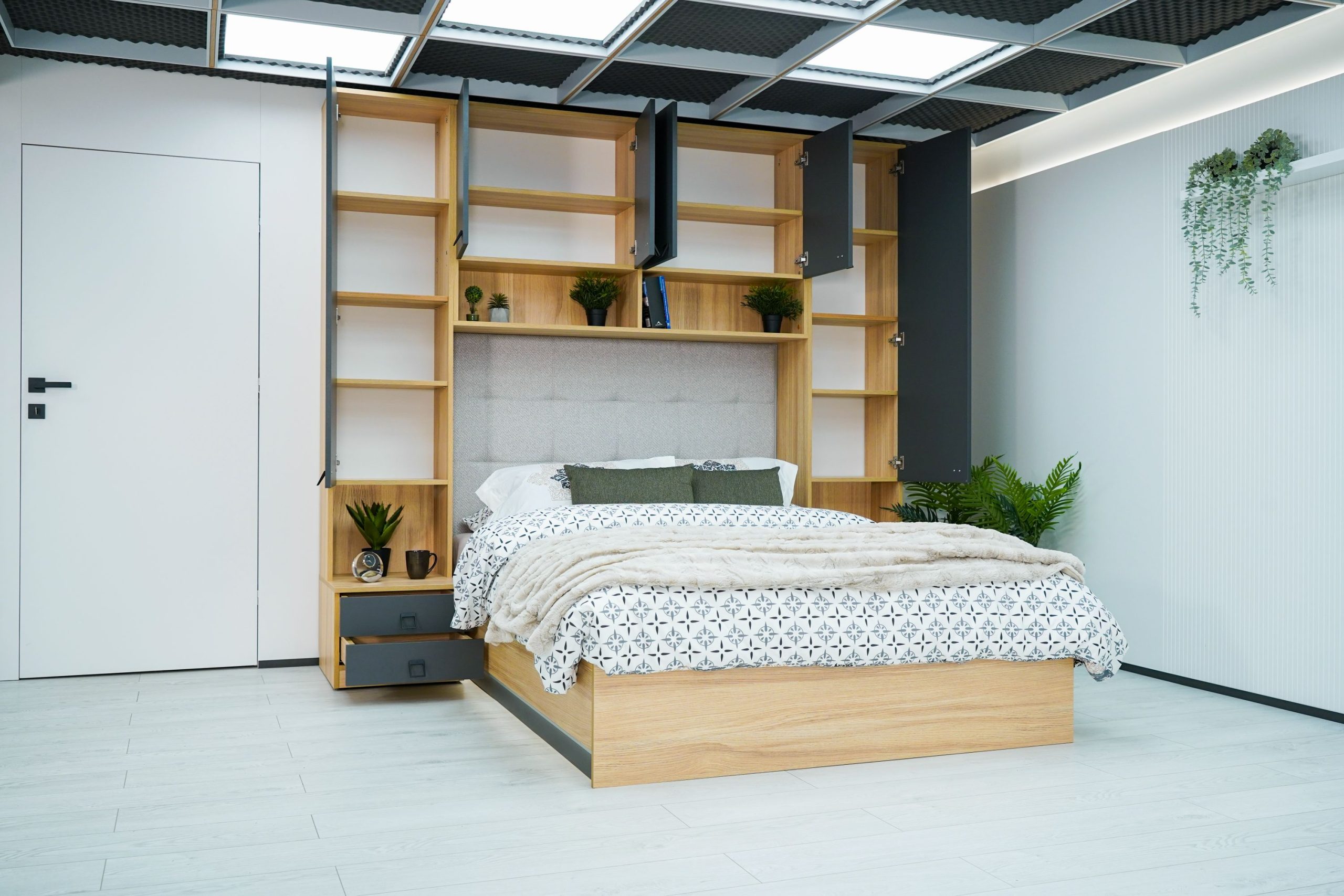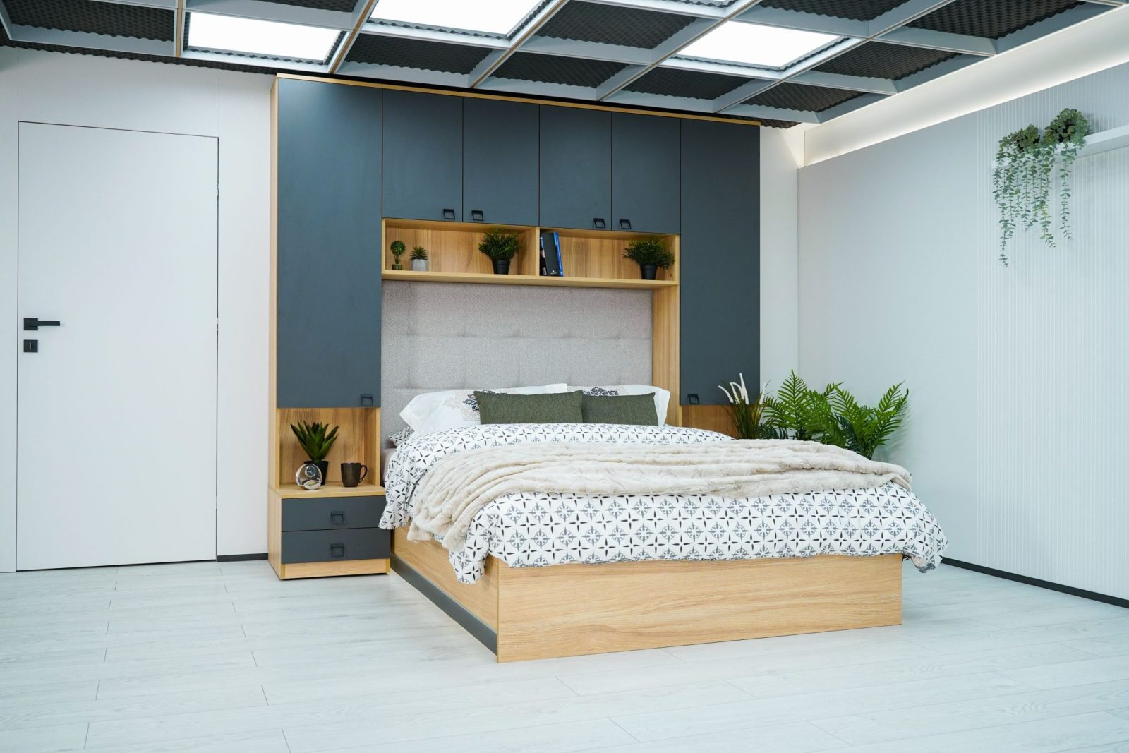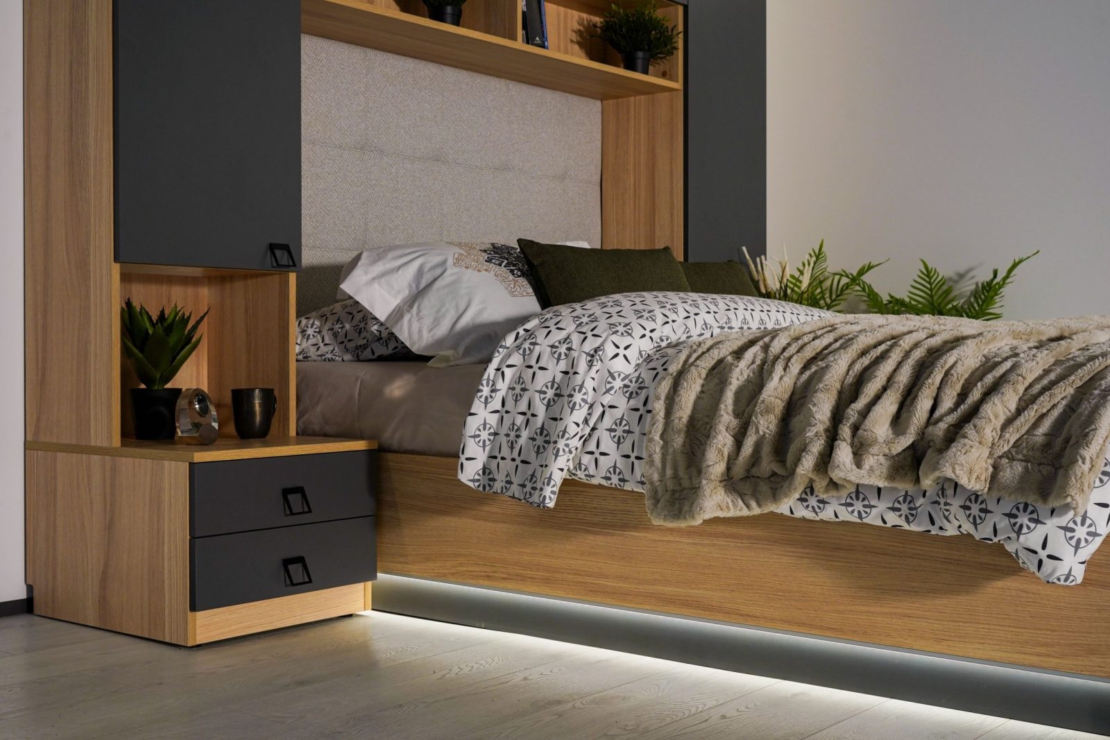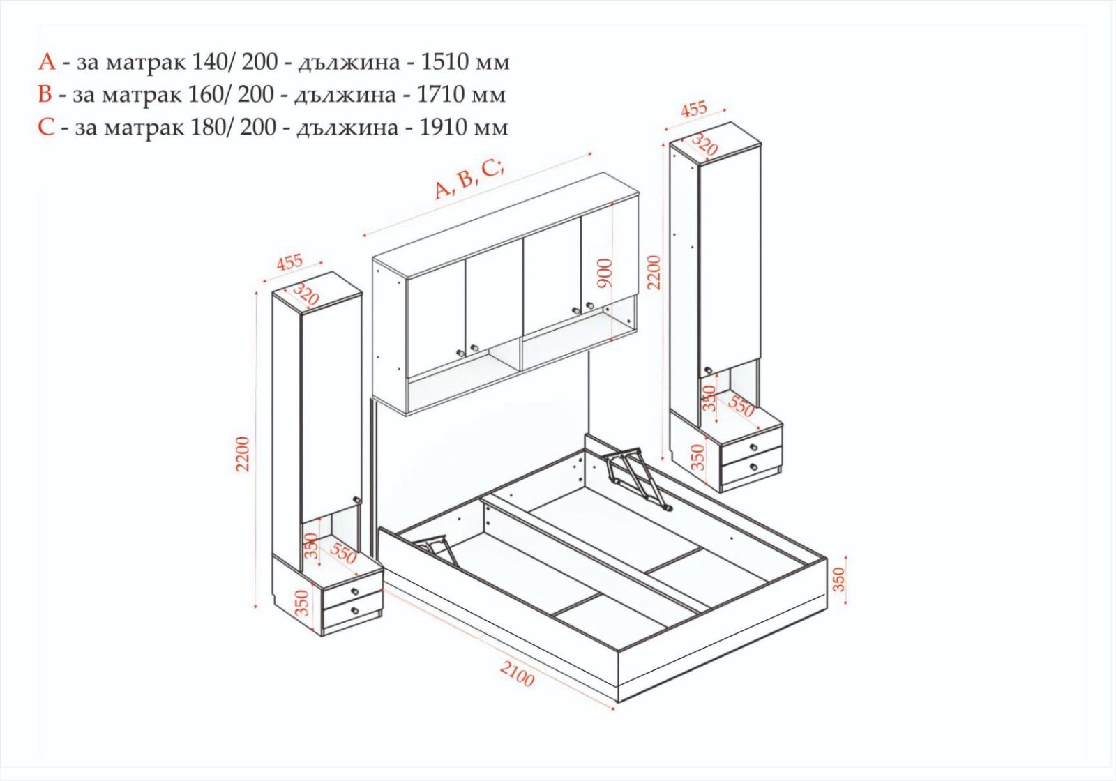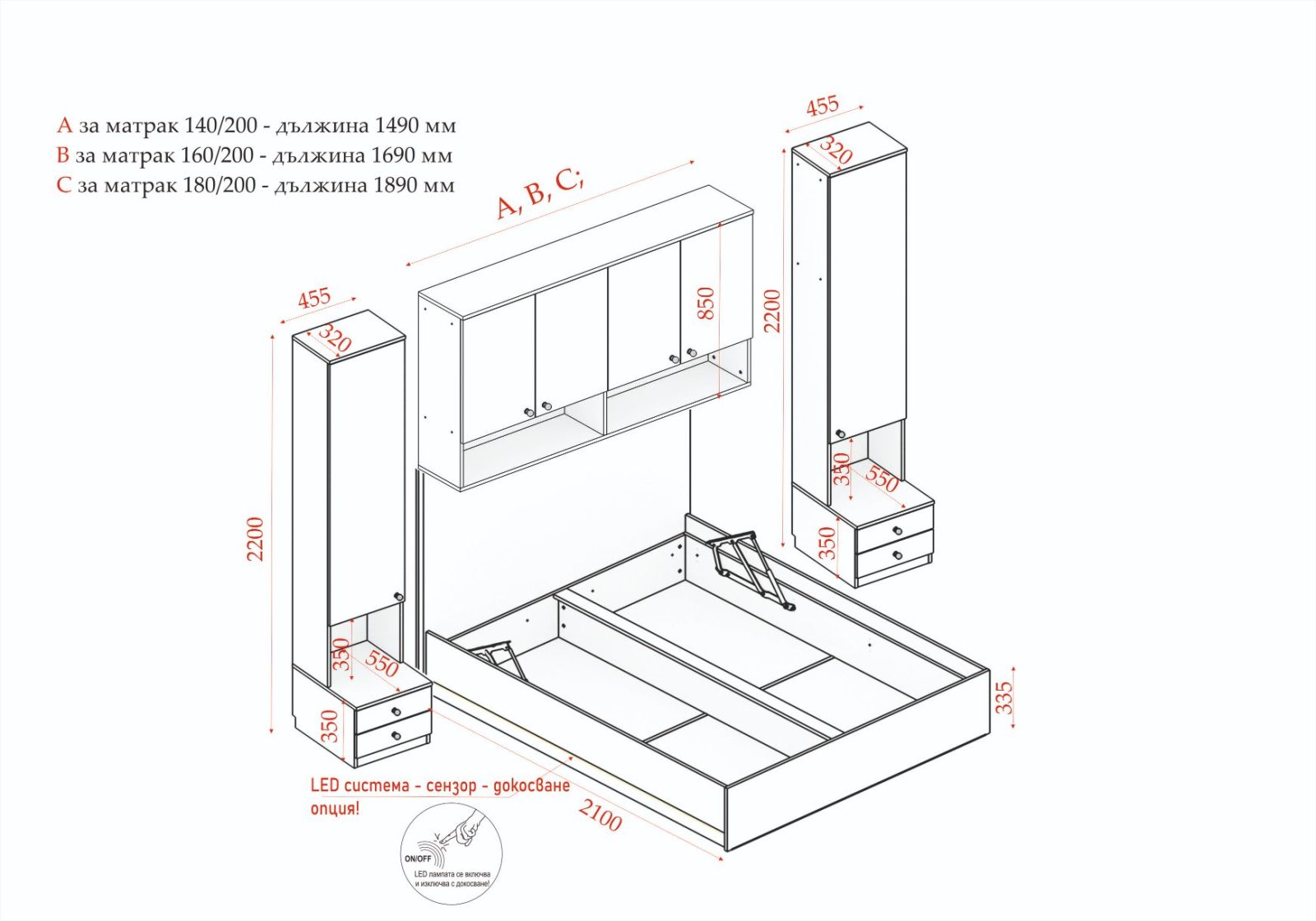 Легло: Удобна тапицирана табла – жакардова дамаска – цвят меланж, базата за матрак е с заработен вътрешен мост, гарантиращ прав диагонал на леглото, сдвоени царги – обща дебелина 36 мм. Всички използвани сглобки са метални – скрит монтаж, осигуряващи изряден външен вид на изделието, включени са дъно и механизъм. Опция – с допълнително заплащане – LED система – допир контрол;
