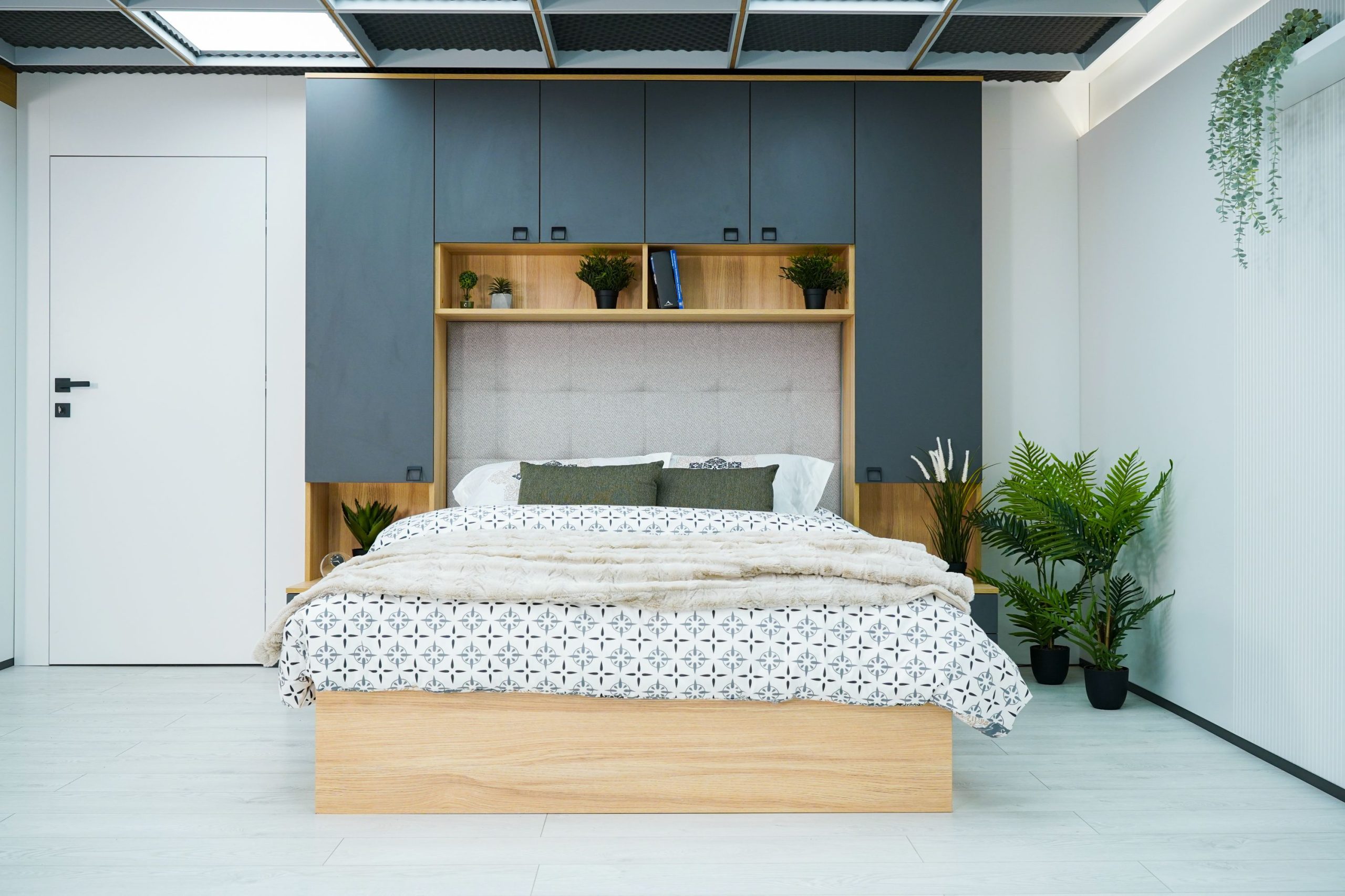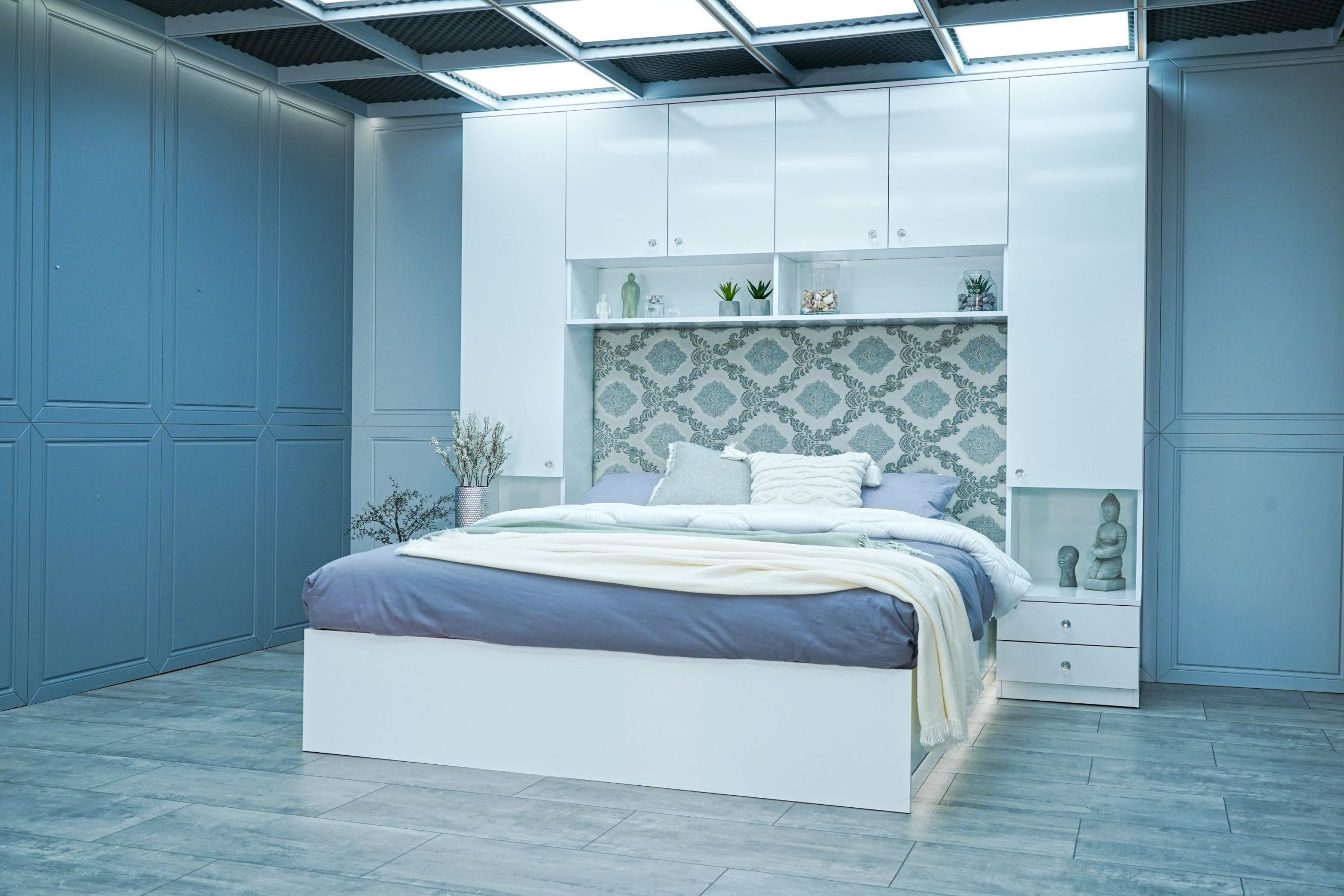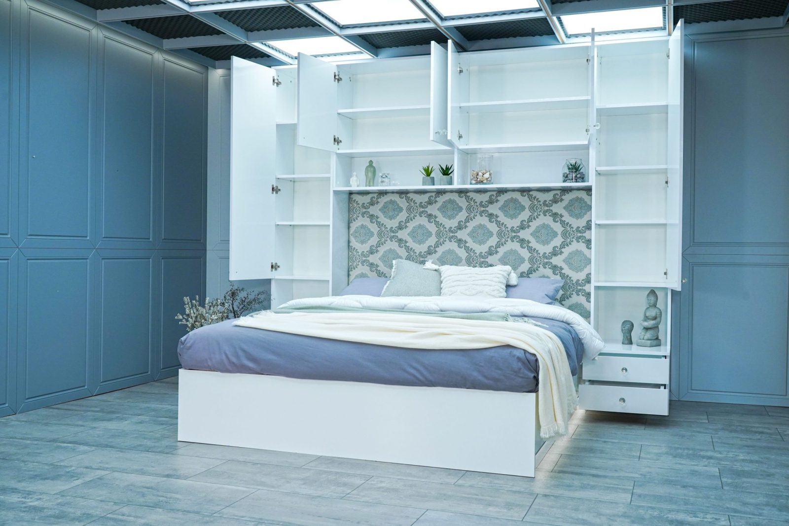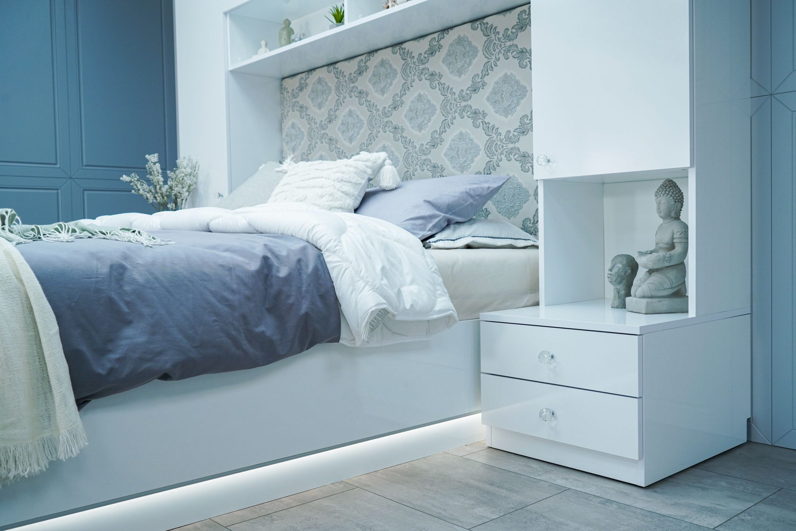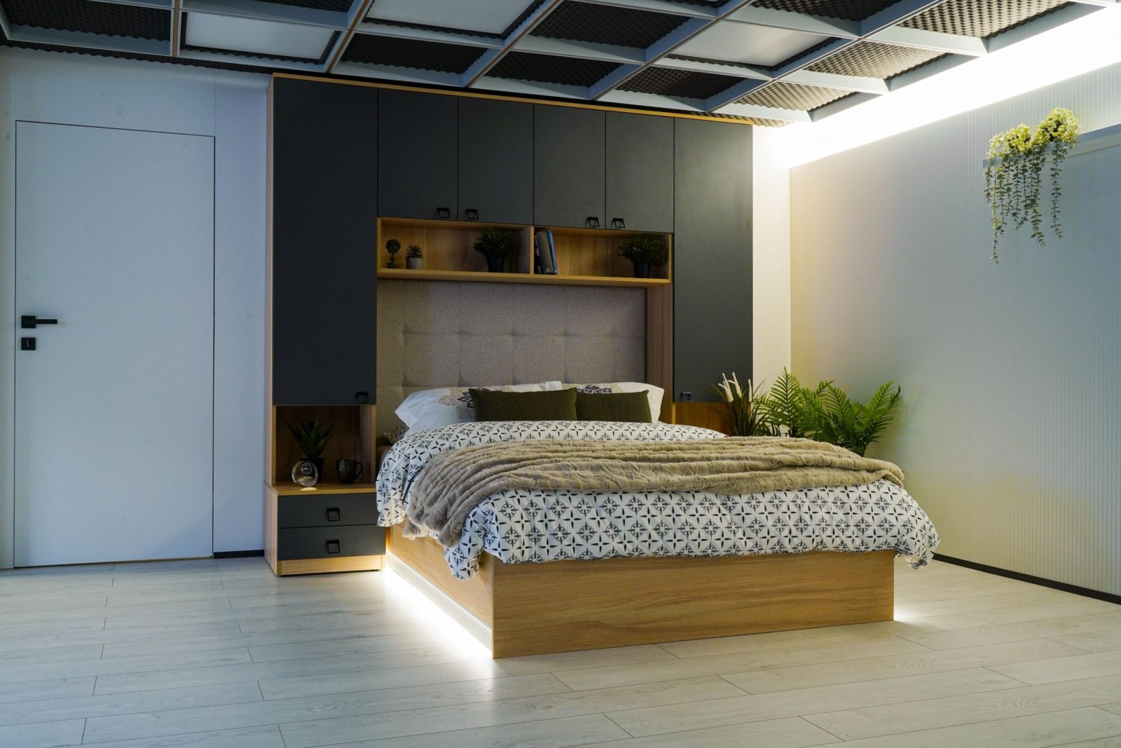 Легло: Удобна тапицирана табла – жакардова дамаска – цвят меланж, базата за матрак е с заработен вътрешен мост, гарантиращ прав диагонал на леглото, сдвоени царги – обща дебелина 36 мм. Всички използвани сглобки са метални – скрит монтаж, осигуряващи изряден външен вид на изделието, включени са дъно и механизъм. Опция – с допълнително заплащане – LED система – допир контрол;