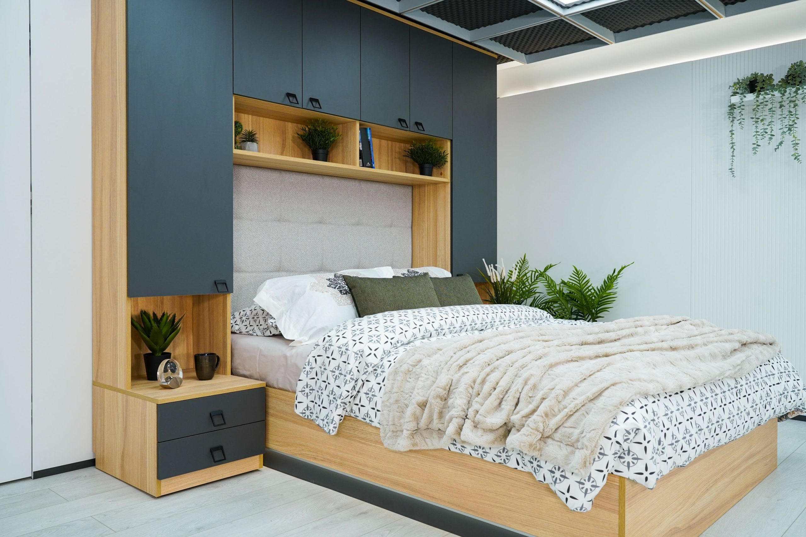 Гардероби: основа 2 бр практични чекмеджета, дръжки – метални – опушен мат – черни, врати – отваряне – панта – плавно затваряне, използвани са сглобки – скрит монтаж, метални рафтоносачи за стабилност на рафтовете, разпределение на гардероби – рафтове; чекмеджета – система скрити водачи Quadro Hettich – плавно затваряне – води чекмеджетата копринено гладко и поема действащите от всички посоки външни сили;