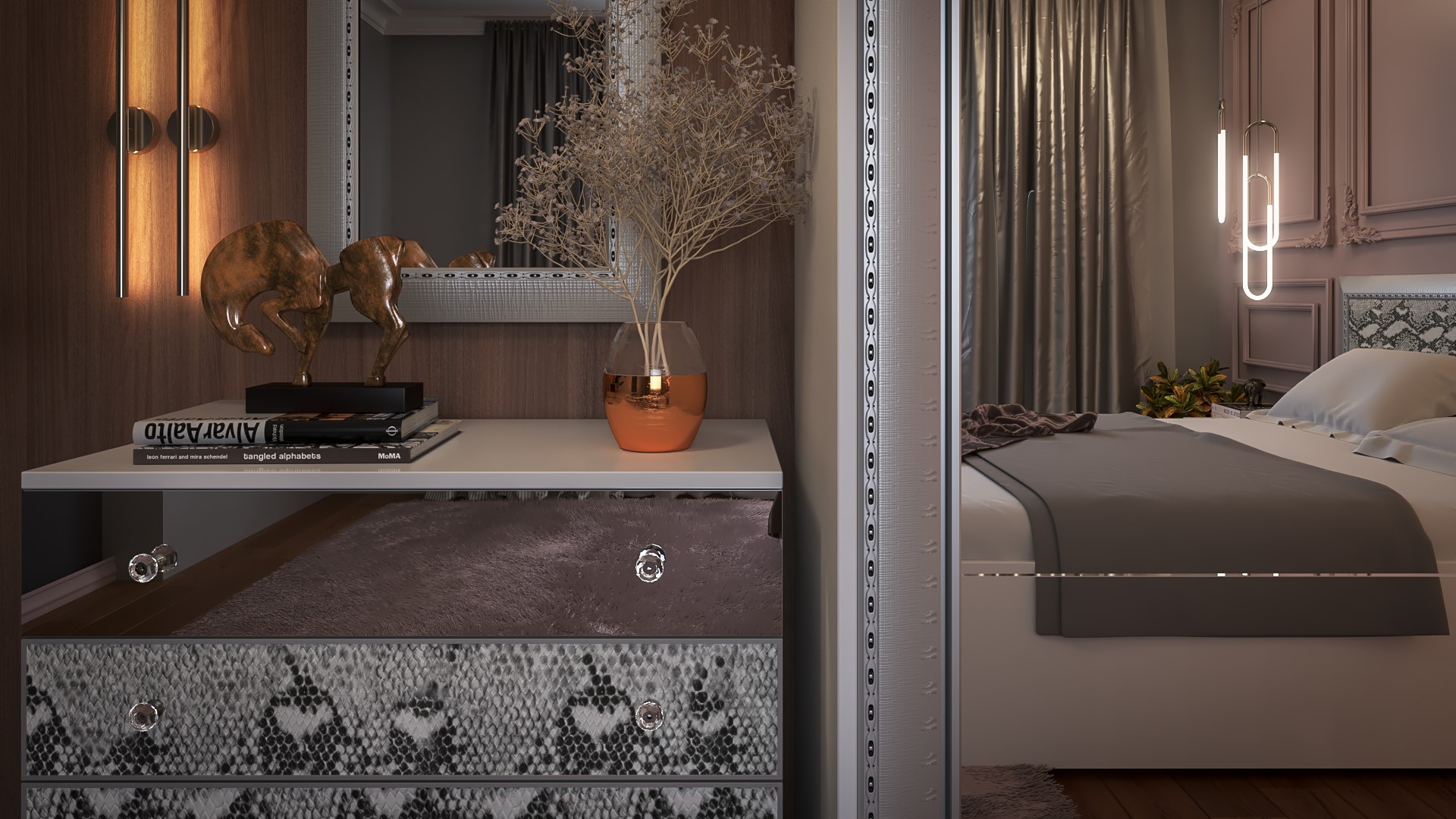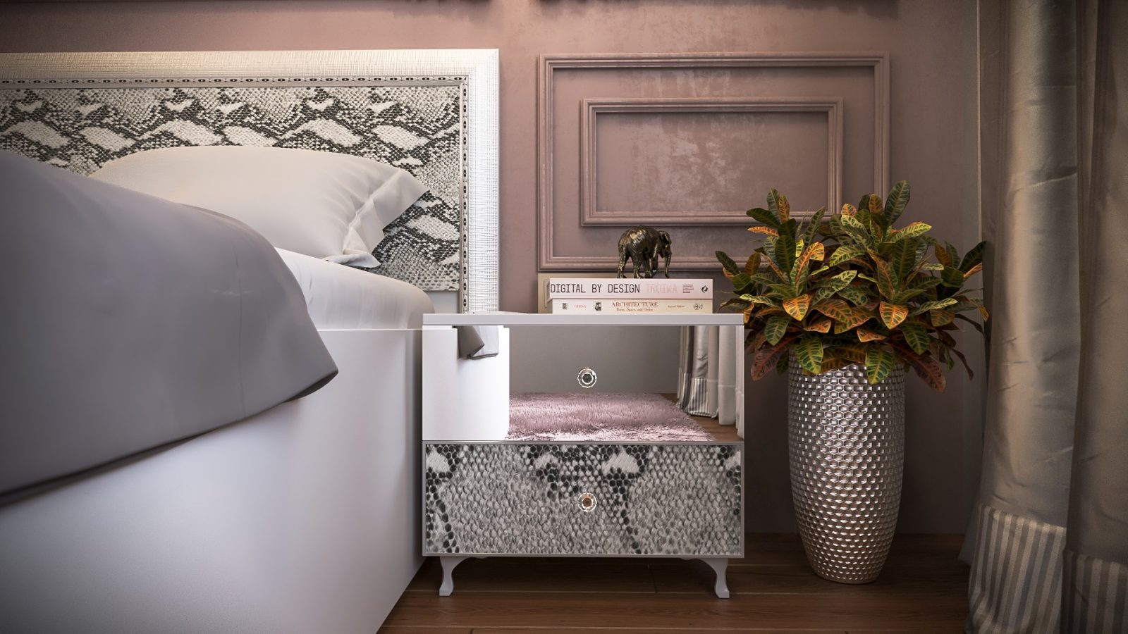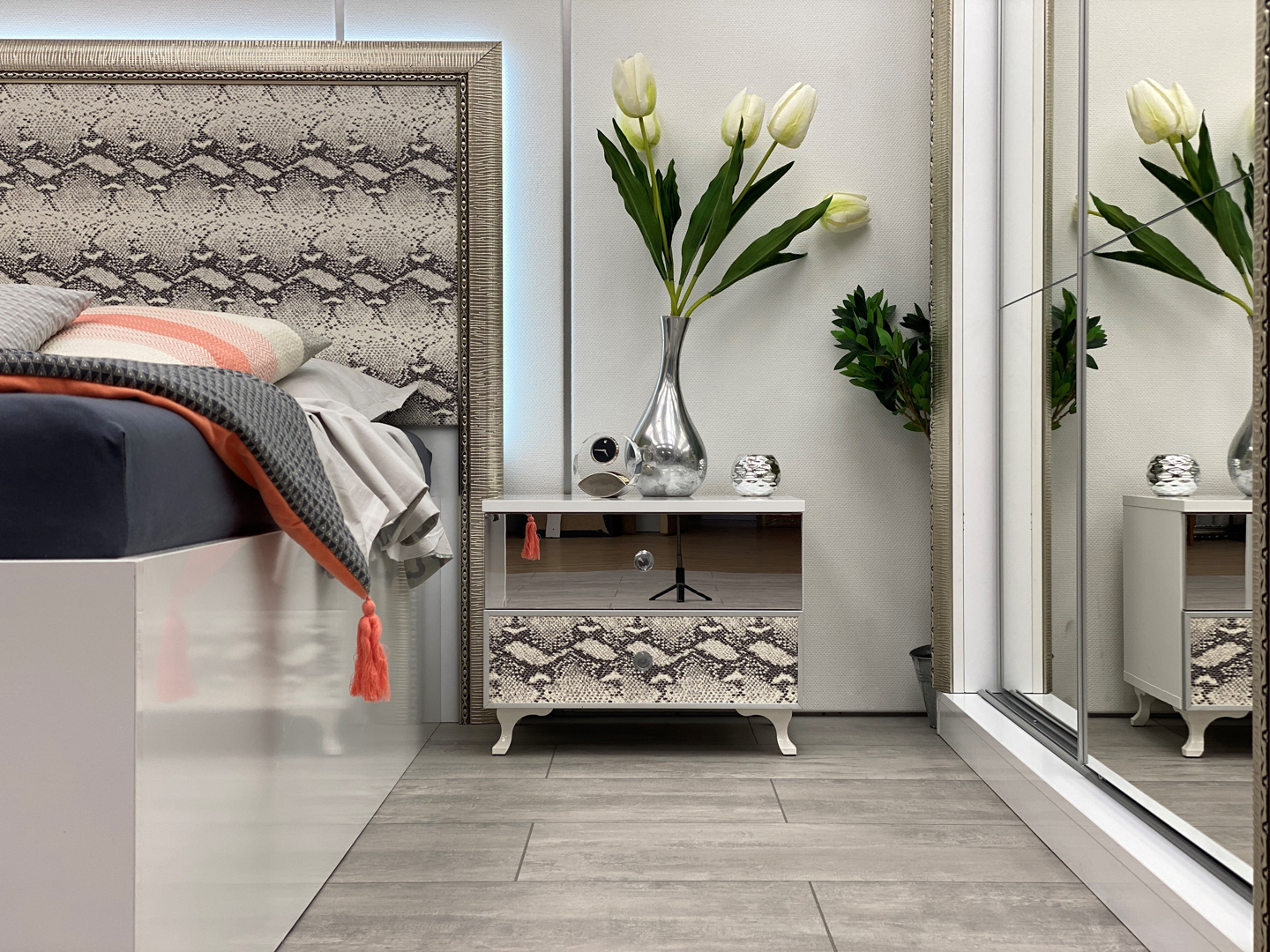 Нощно шкафче: две практични чекмеджета, дръжки от полиран кристал – форма – сфера, метални ролкови водачи, челото на горното чекмедже е с вградена огледална PVC плоча, второто чело е тапицерно с еко кожа с гравирана змийска шарка – обкантено с фин алуминиев профил – 2 бр.