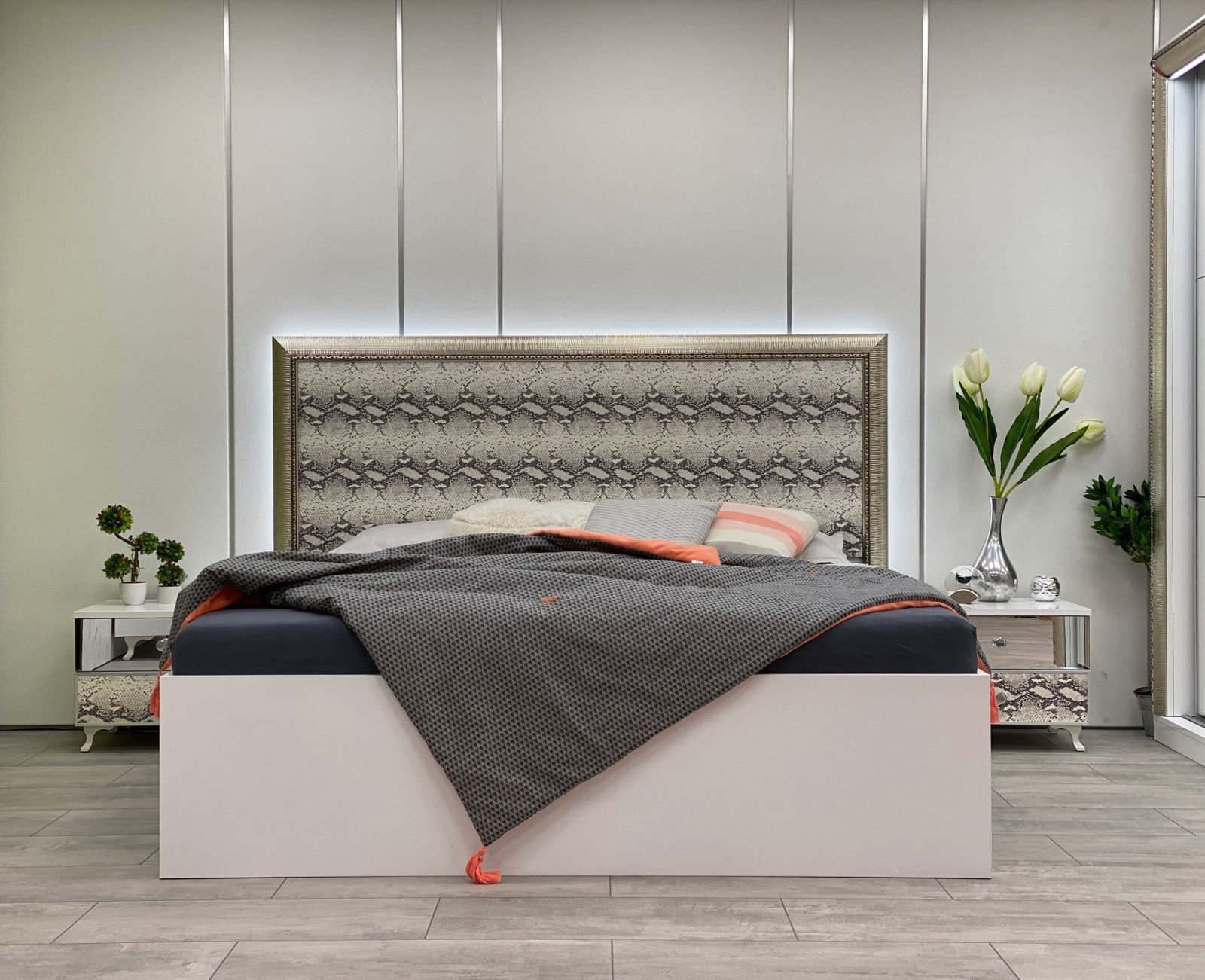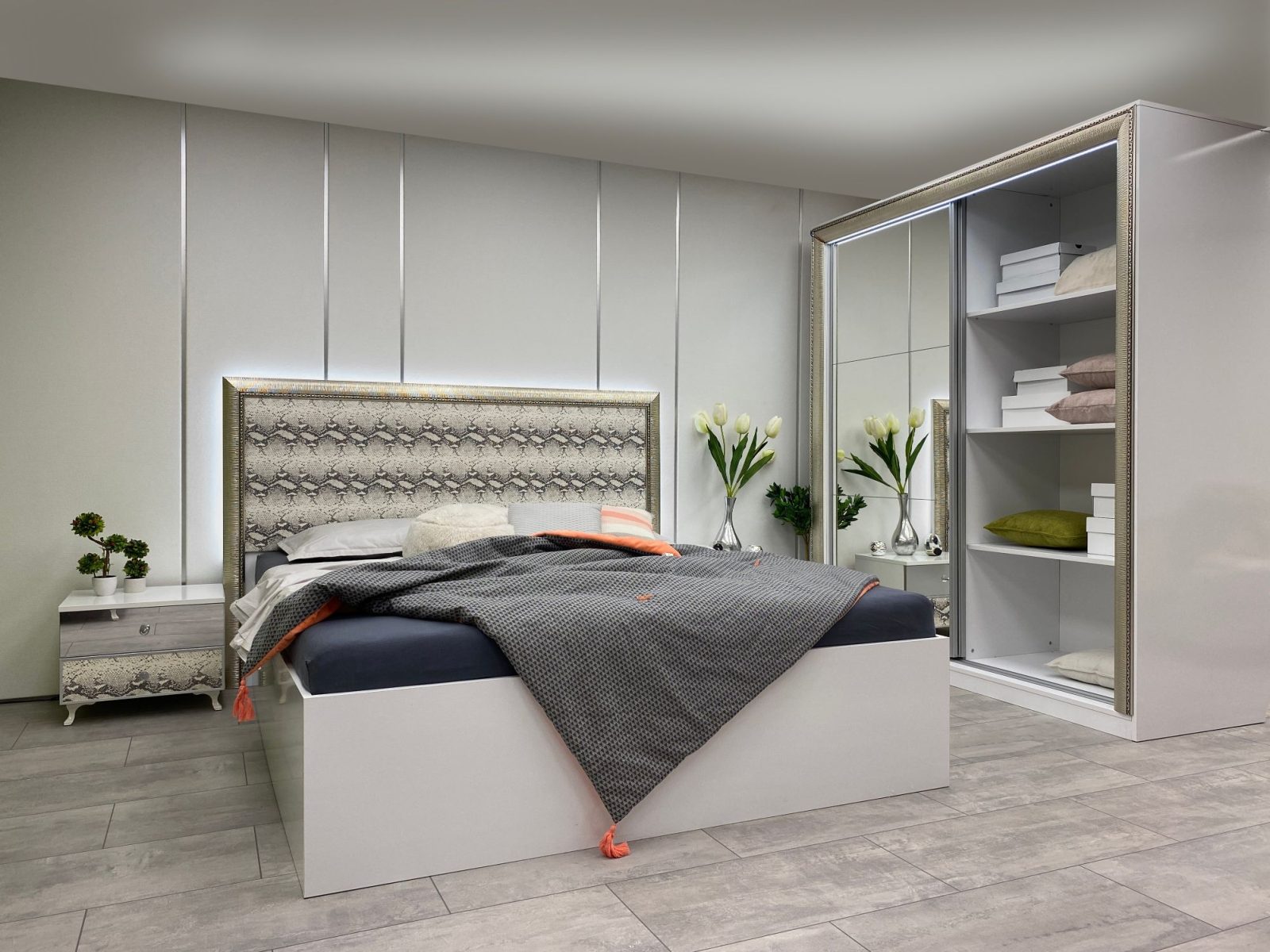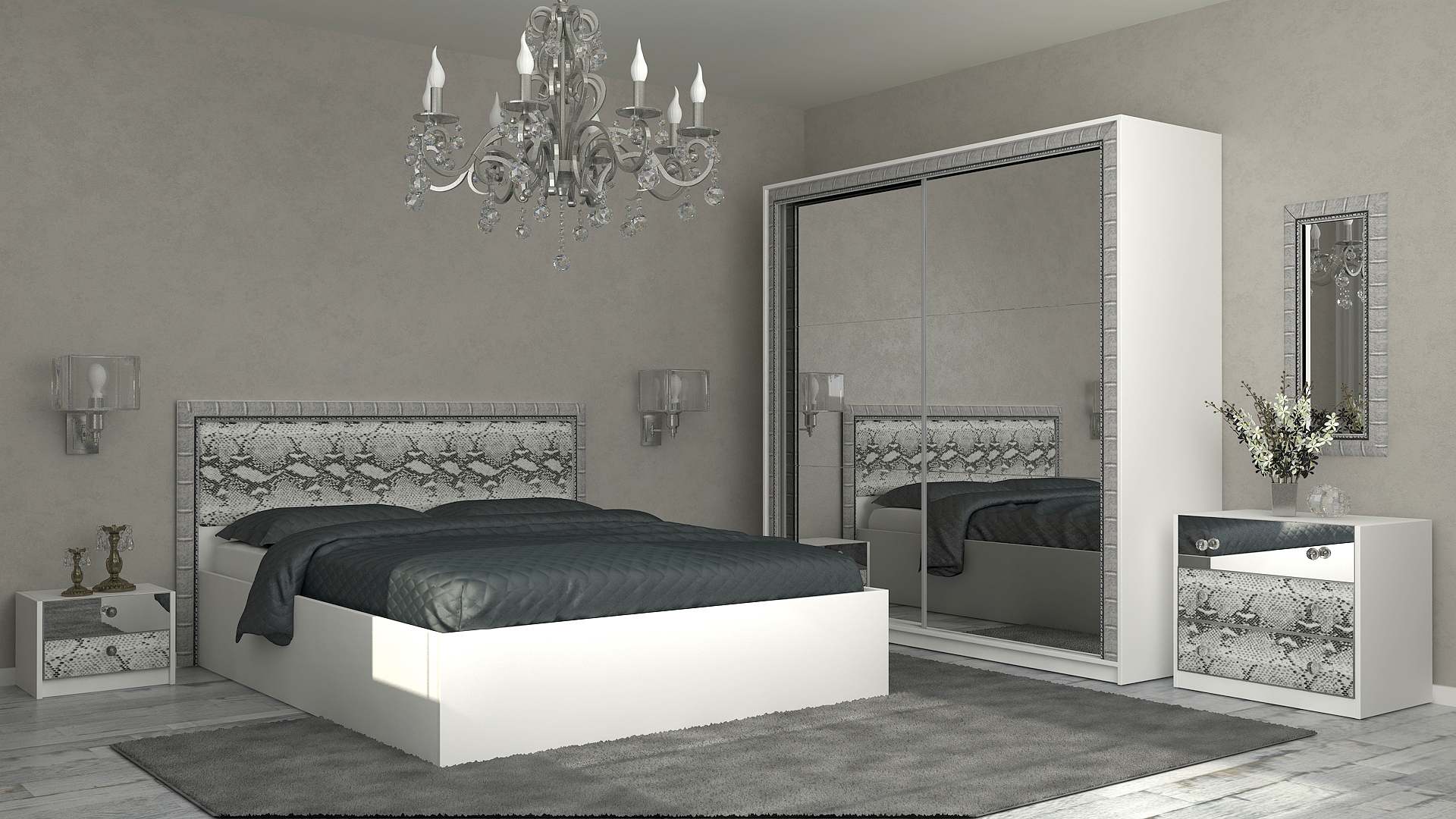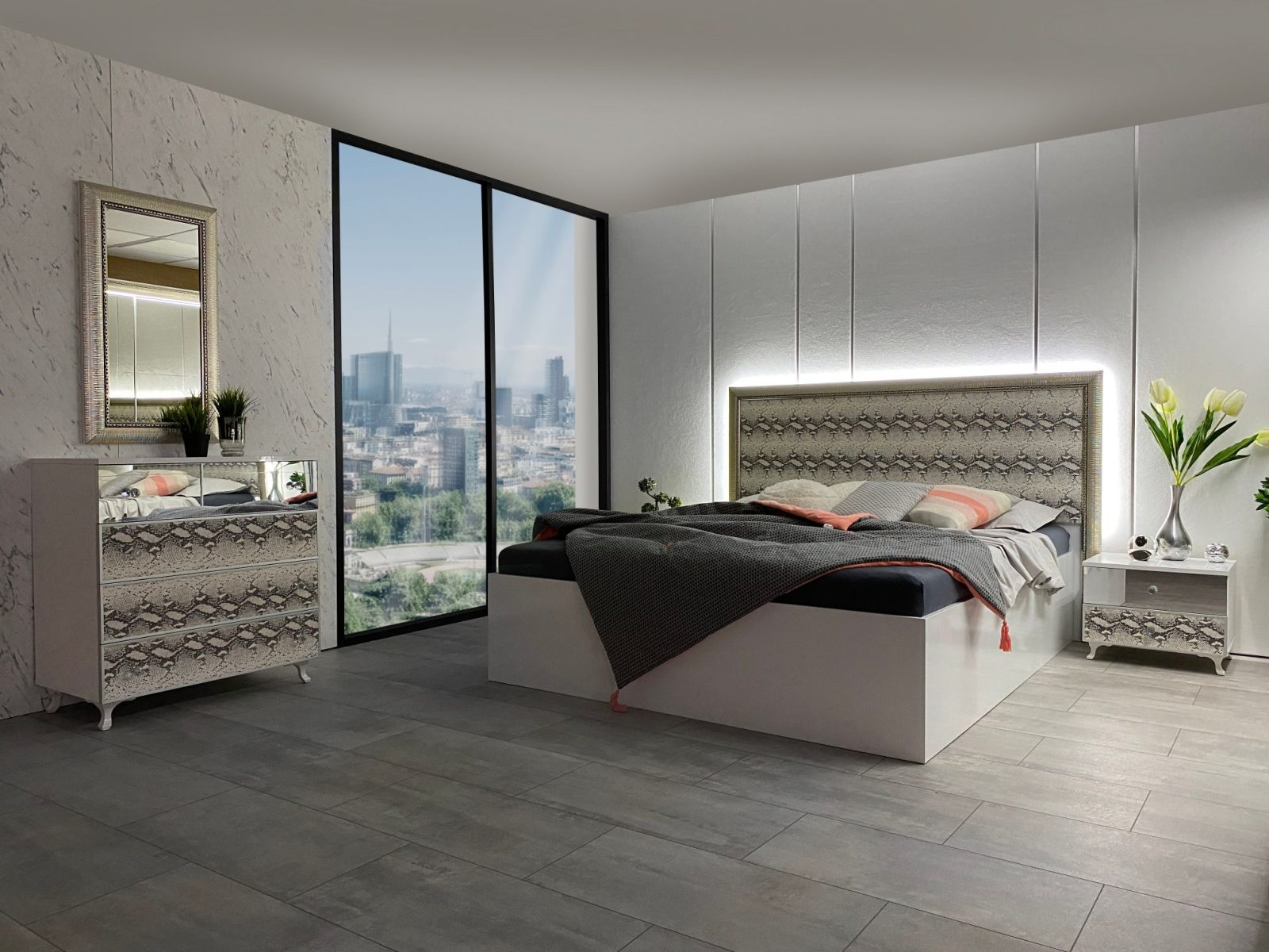 Легло: Елегантна табла, състояща се от основна плюс вградена тапицирана декоративна табла, рамкирана с интериорен профил в цвят сребро, с подчертан завършващ сребърен ажур, акцентирано присъствие на релефна еко кожа с гравирана змийска шарка. Вградено LED осветление с дистанционно. Базата за матрак е с напречен вътрешен вертикален мост, гарантиращ прав диагонал на леглото. Всички използвани сглобки са метални – скрит монтаж. Изделието е изработено за матрак с размер 160/200 см;