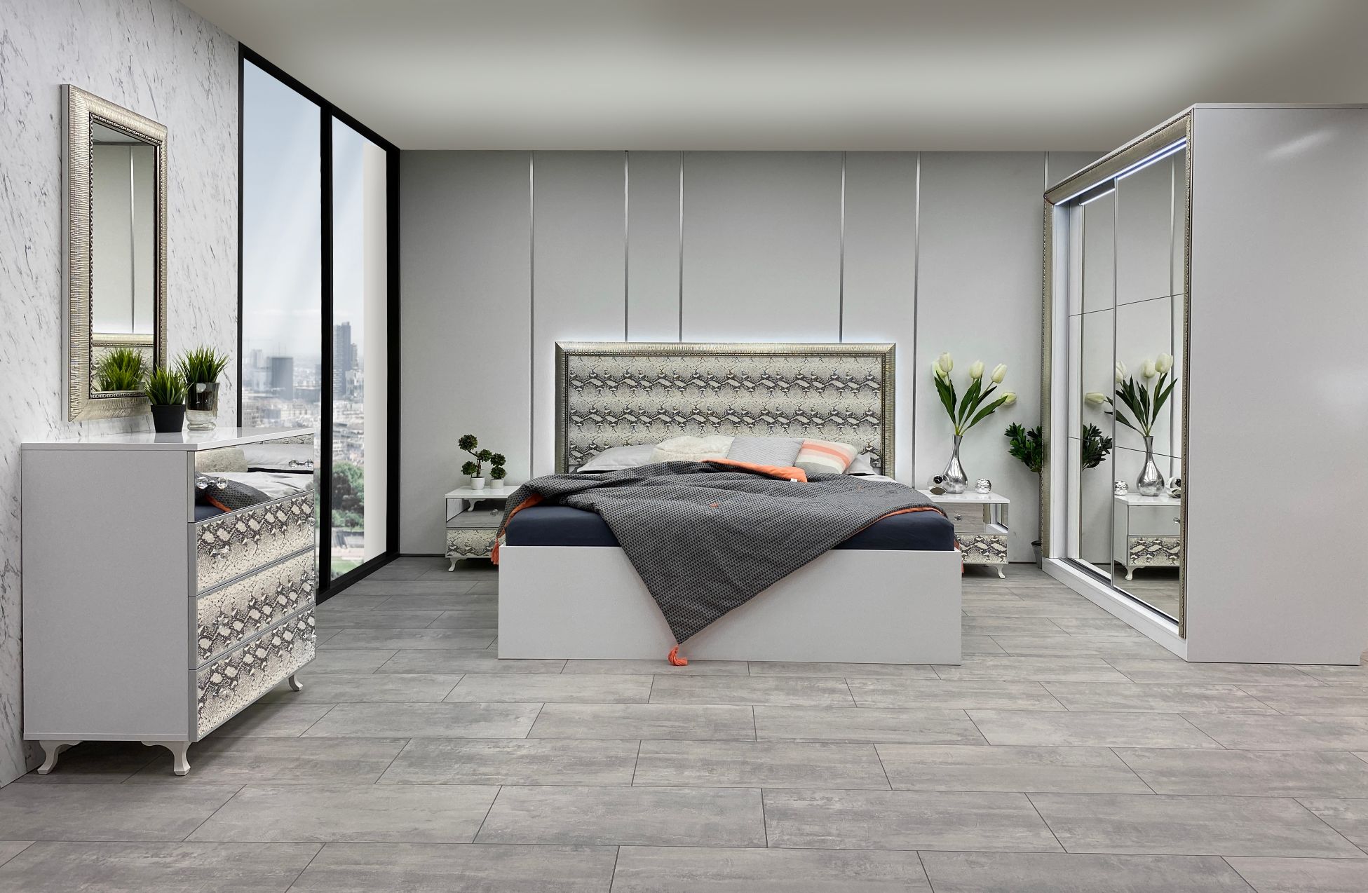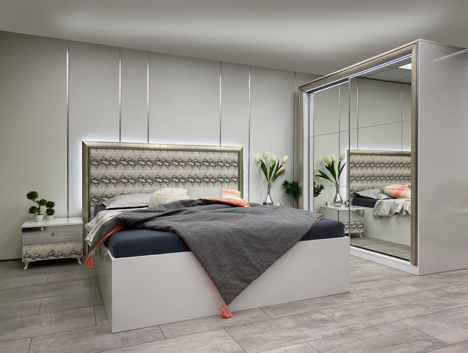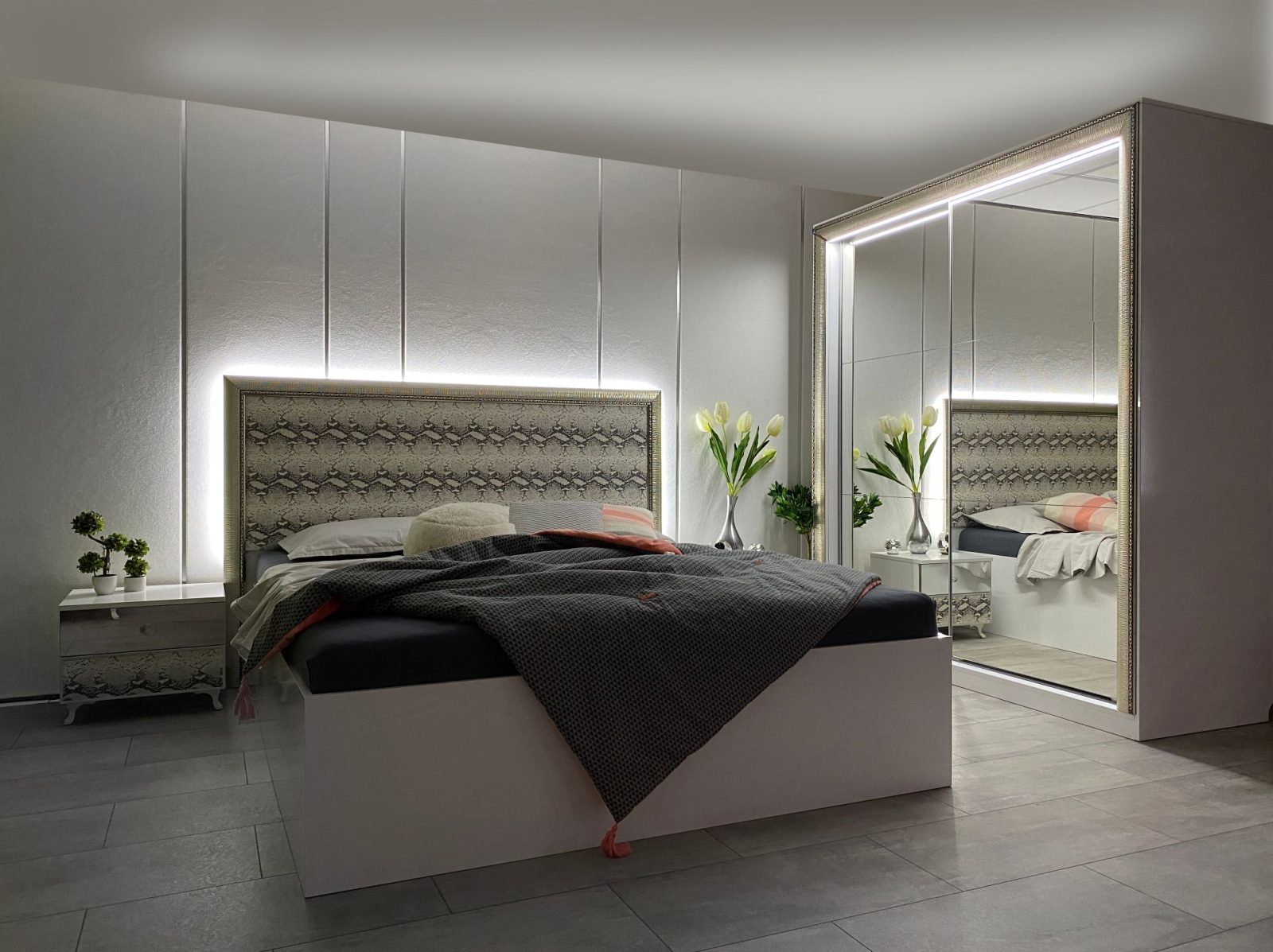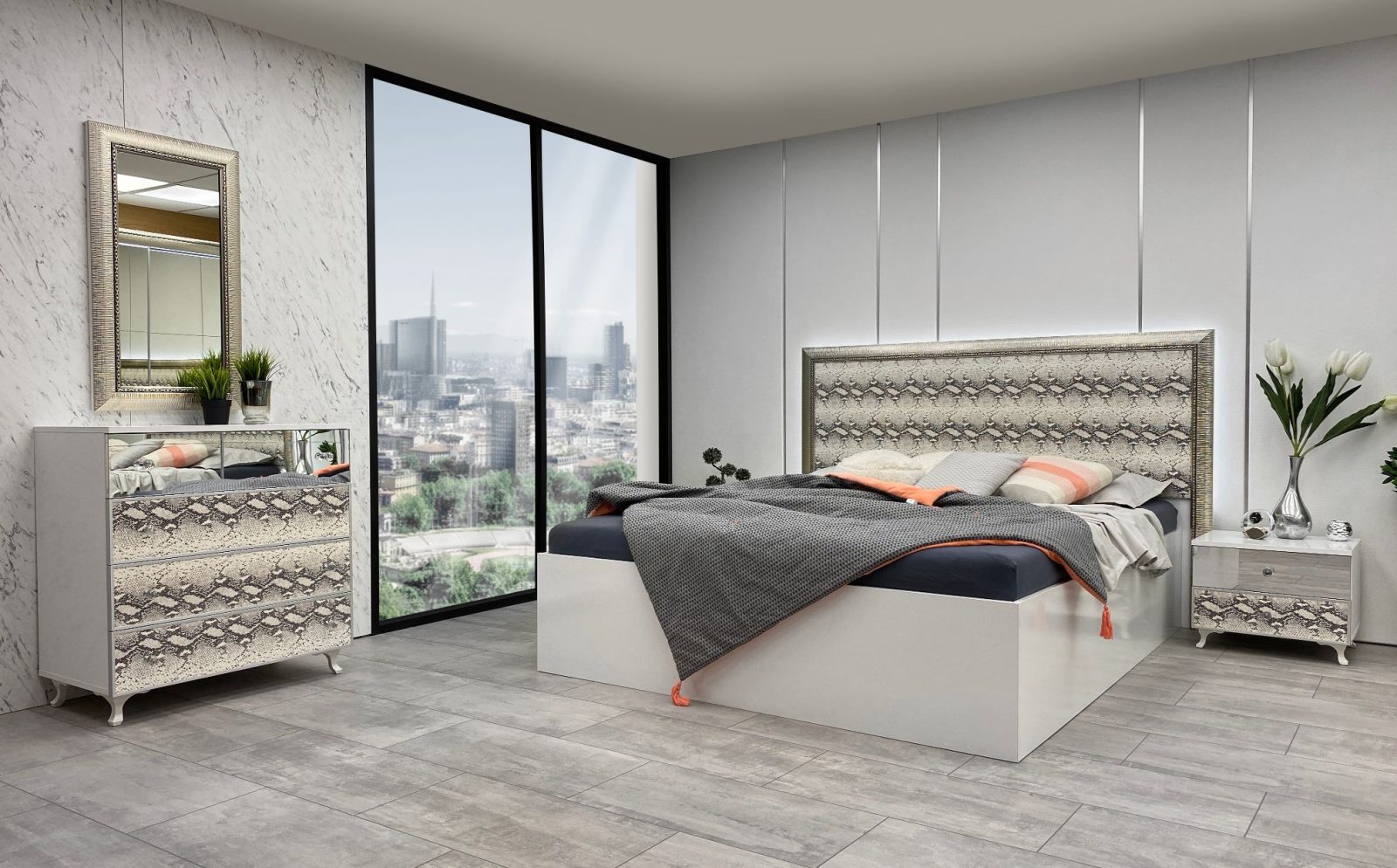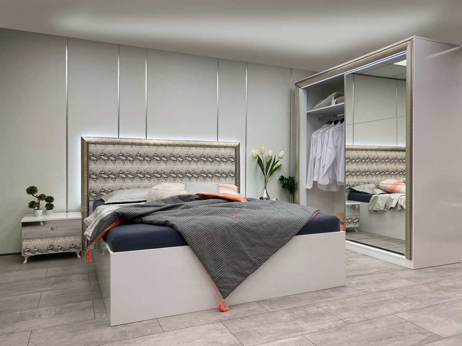 Легло: Елегантна табла, състояща се от основна плюс вградена тапицирана декоративна табла, рамкирана с интериорен профил в цвят сребро, с подчертан завършващ сребърен ажур, акцентирано присъствие на релефна еко кожа с гравирана змийска шарка. Вградено LED осветление с дистанционно. Базата за матрак е с напречен вътрешен вертикален мост, гарантиращ прав диагонал на леглото. Всички използвани сглобки са метални – скрит монтаж. Изделието е изработено за матрак с размер 160/200 см;