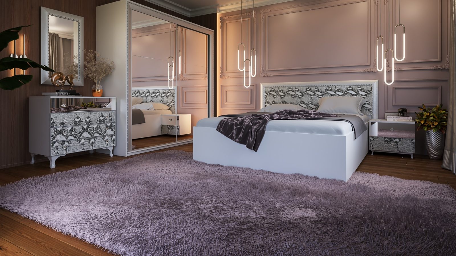 СК „Лорена Вера“ е произведен от висококачествено ламинирано ПДЧ 18 мм, декор – снежно бял гланц, акцентирано присъствие на релефна еко кожа с гравирана змийска шарка – горещо щампована, усещането за лукс е допълнено от ажурен интериорен профил в цвят сребро;