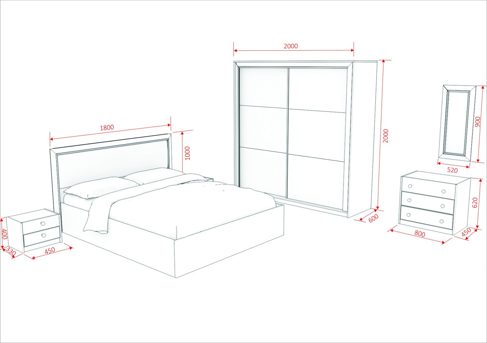 Гардероб: дължина 1800 мм, височина 2000 мм, дълбочина 600 мм;