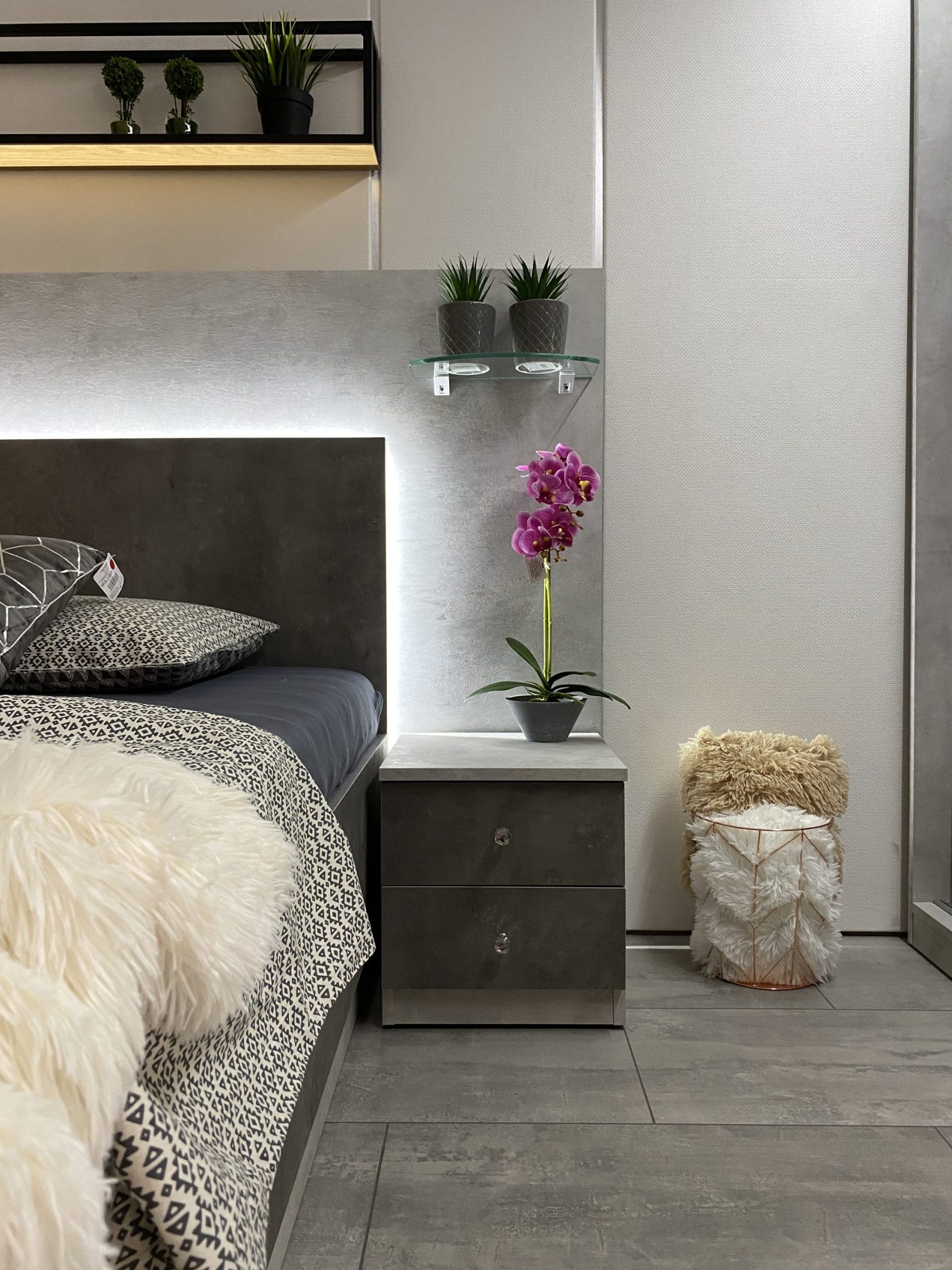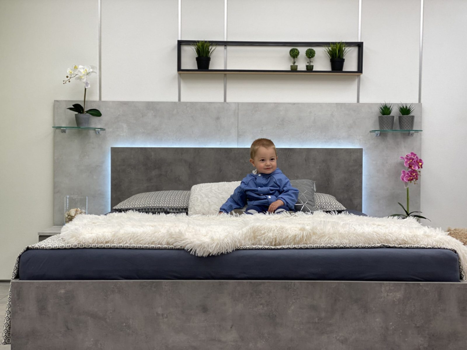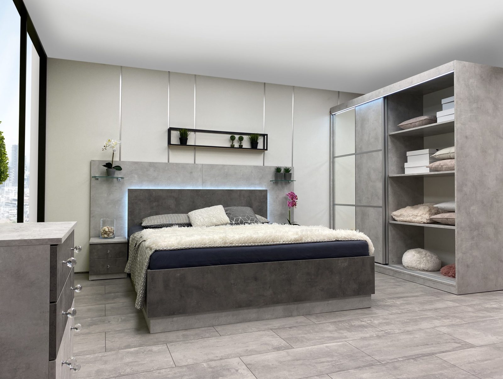 Легло: двойна табла – основна – ПДЧ бетон- светъл, втора табла – декор – бетон тъмен с вградено LED осветление по канта, режим на работа – дистанционно с опция за регулиране силата на светлина, база за матрак с вътрешна вертикална бленда – гарантираща прав диагонал на леглото. Всички използвани сглобки са метални – скрит монтаж. Леглото е изработено за матрак с размер 160/200 см;