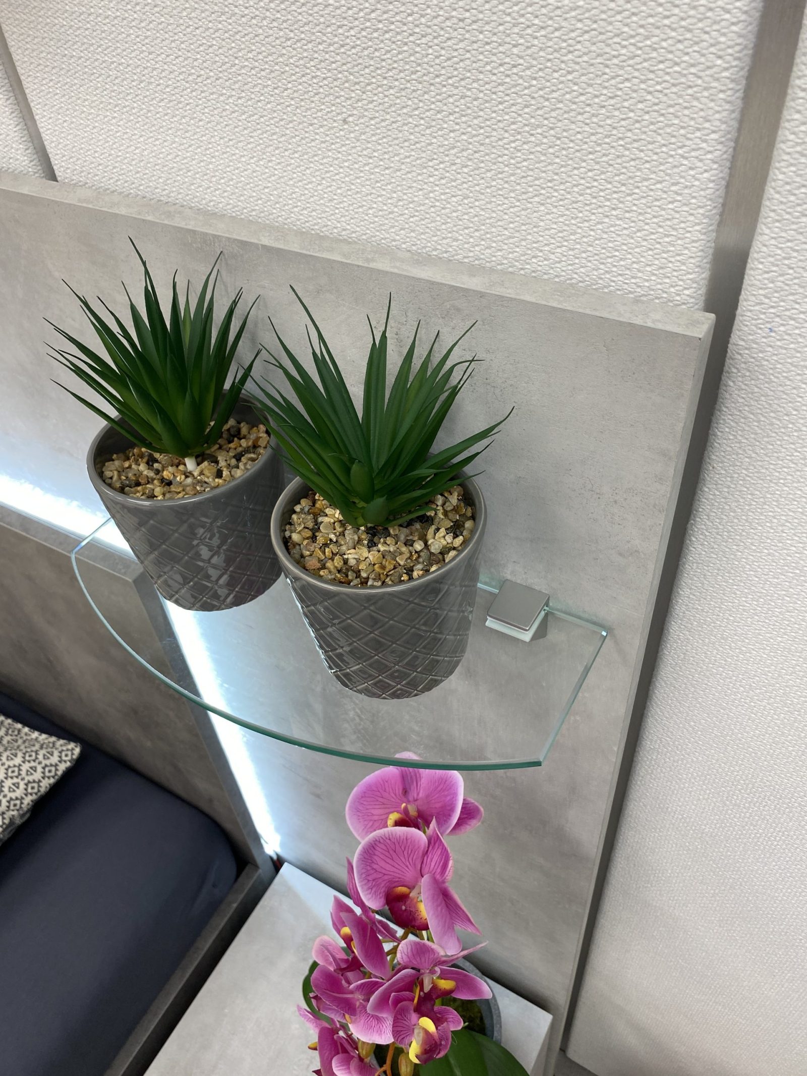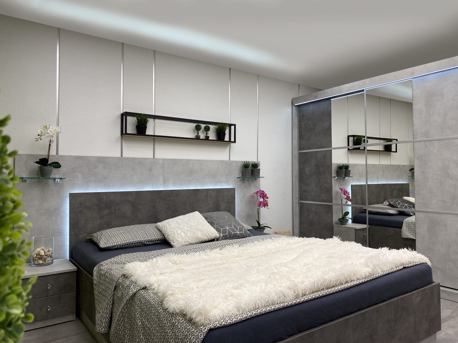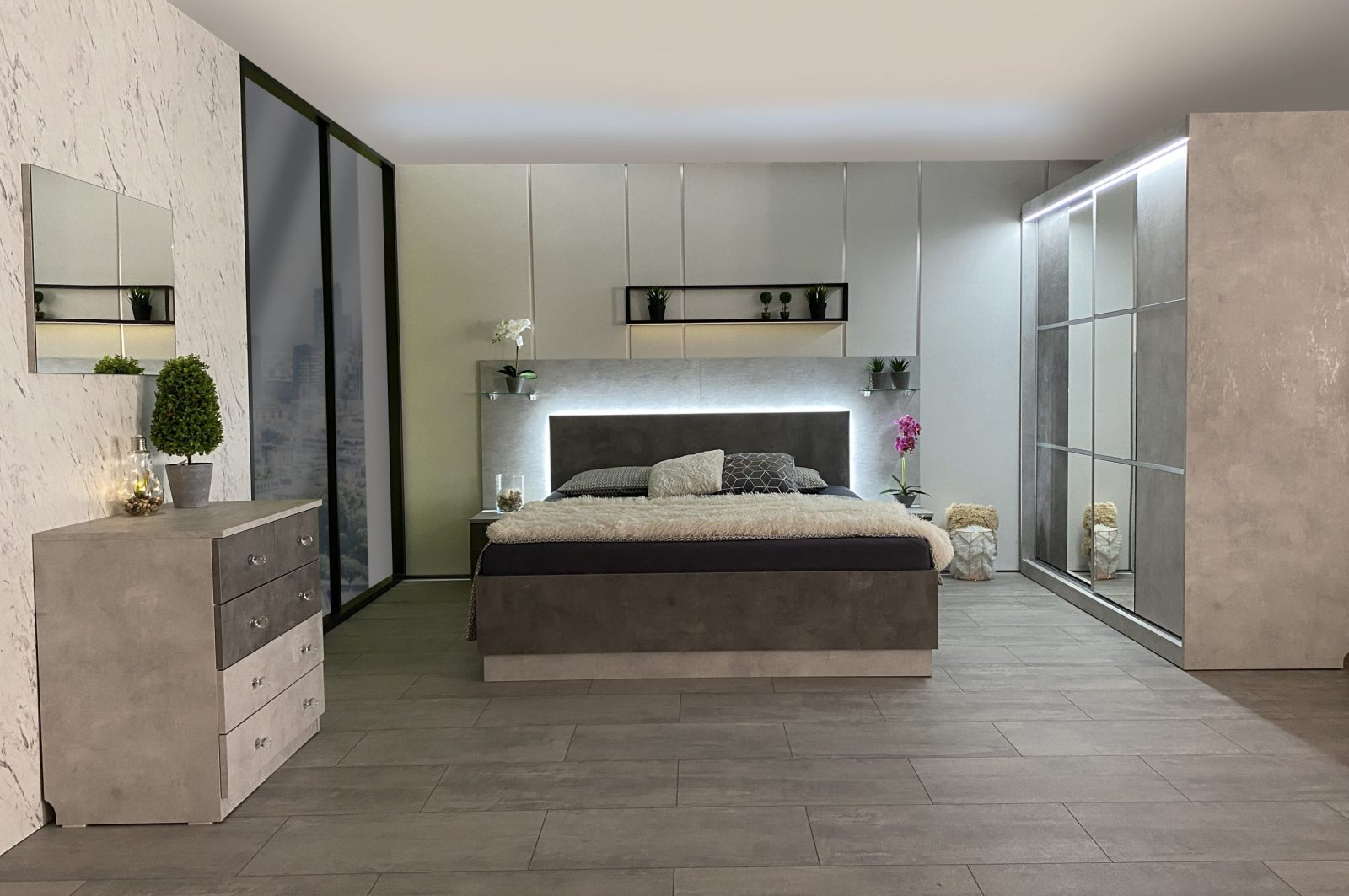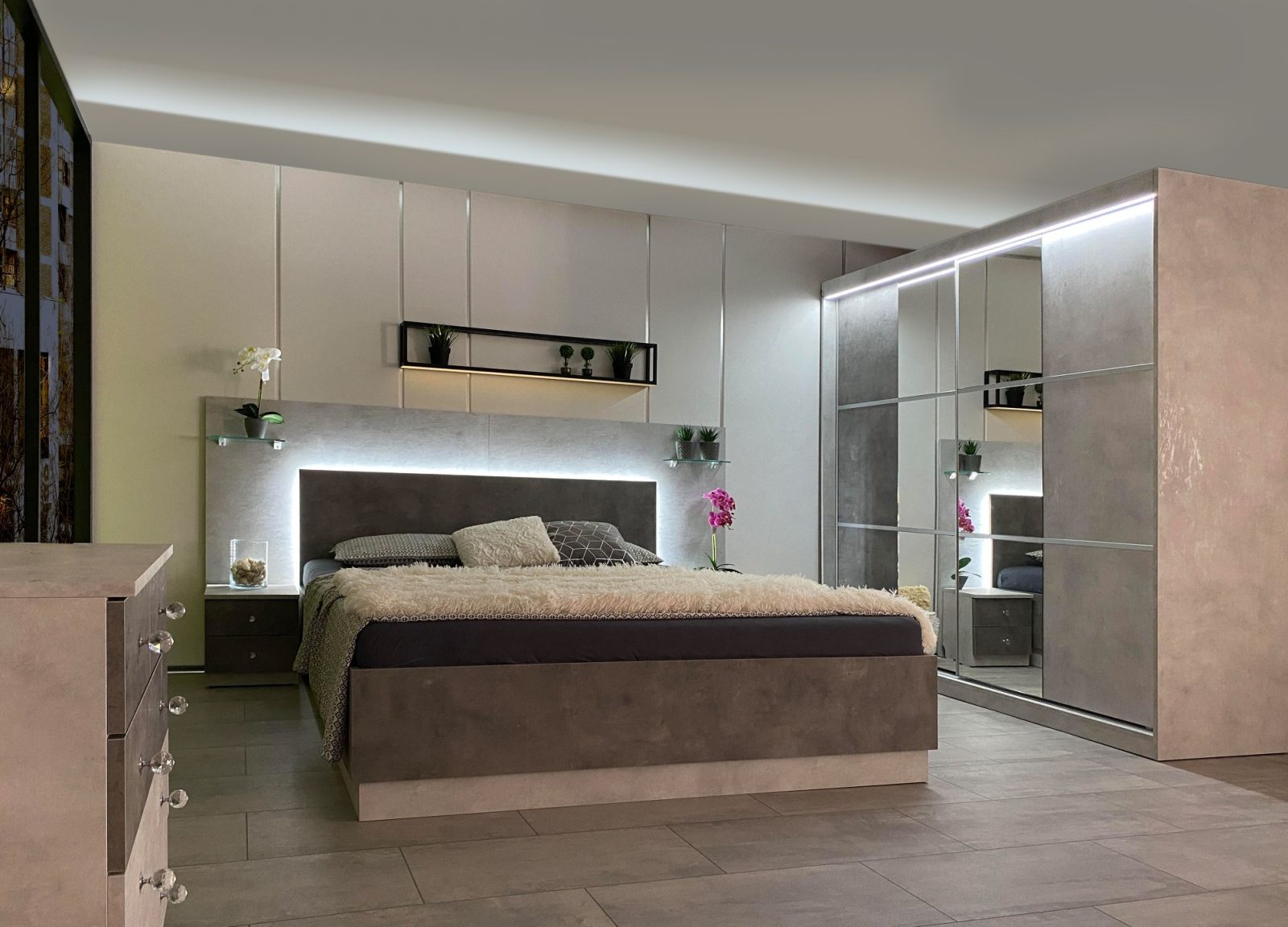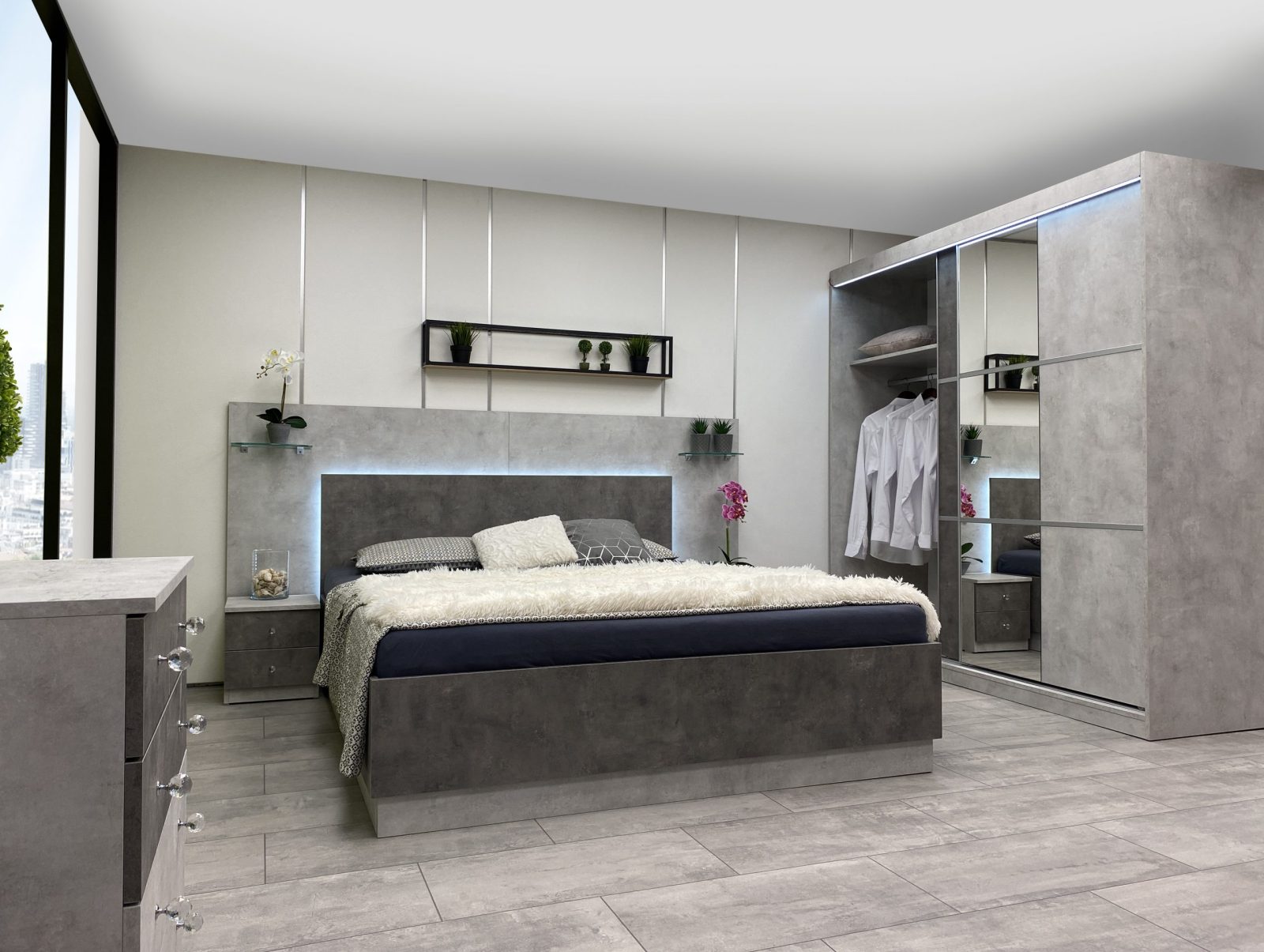 Гардероб: плъзгаща система вътрешно водене, вградено LED осветление по канта, вертикално разположени вградени алуминиеви „П“- образни кант дръжки с допълнително излят външен улей за лесно и удобно захващане, спомагащи ефективното плъзгане на системата – гарантиращи устойчивост и здравина на вратите, използвани са сглобки – скрит монтаж, метални рафтоносачи за стабилност на рафтовете, лост за дрехи – метален – форма – елипса – покритие – никел, цялата конструкция на гардероба е монтирана върху метални реглажни „пети“ – осигуряващи изрядна нивелация на изделието и правилната му експлоатация, вратите са изработени от пана декор тъмен и светъл бетон + вградени огледала – 1 бр. в к-т;;