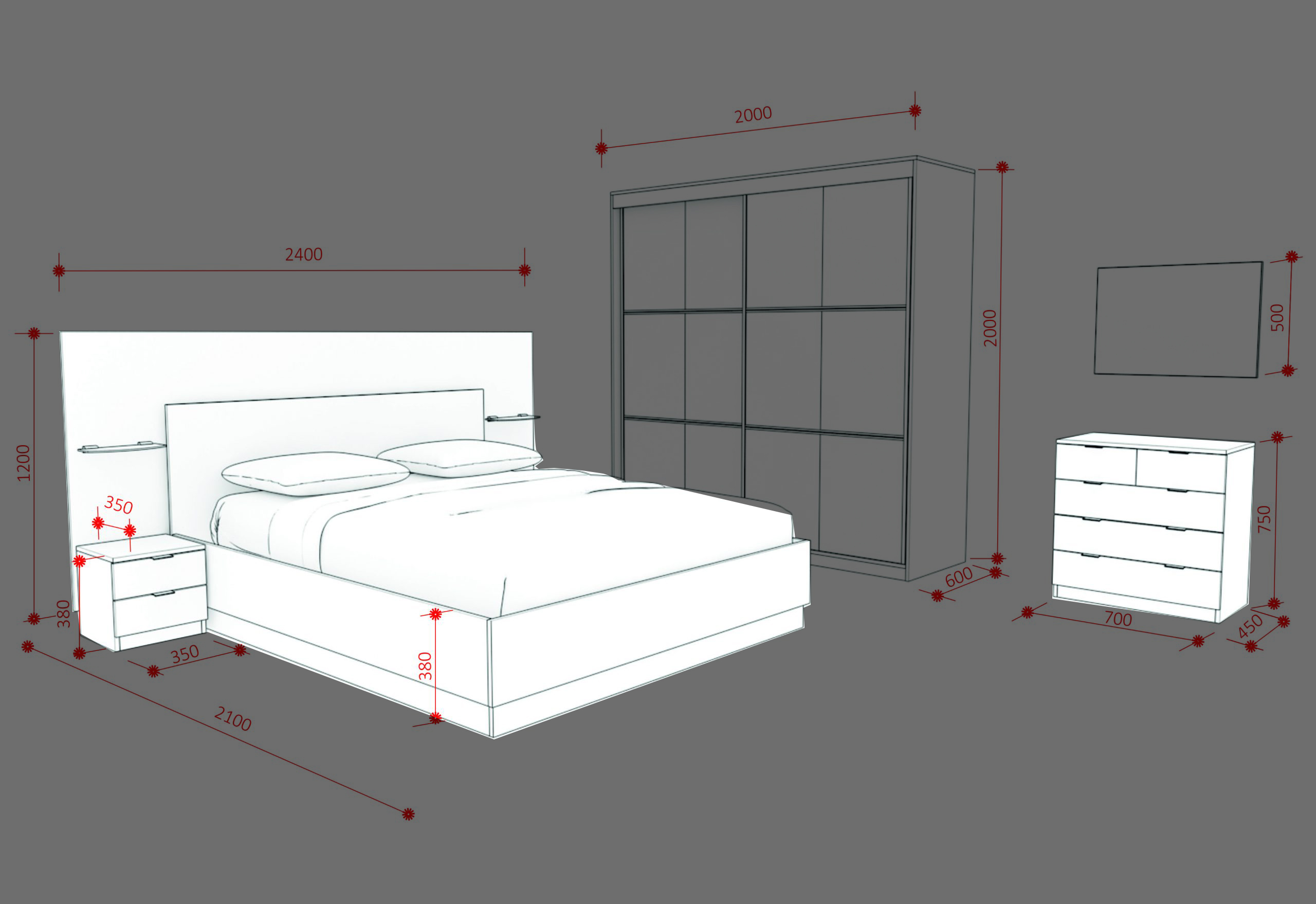 Нощно шкафче: дължина 350 мм, височина 380 мм, дълбочина 350 мм;