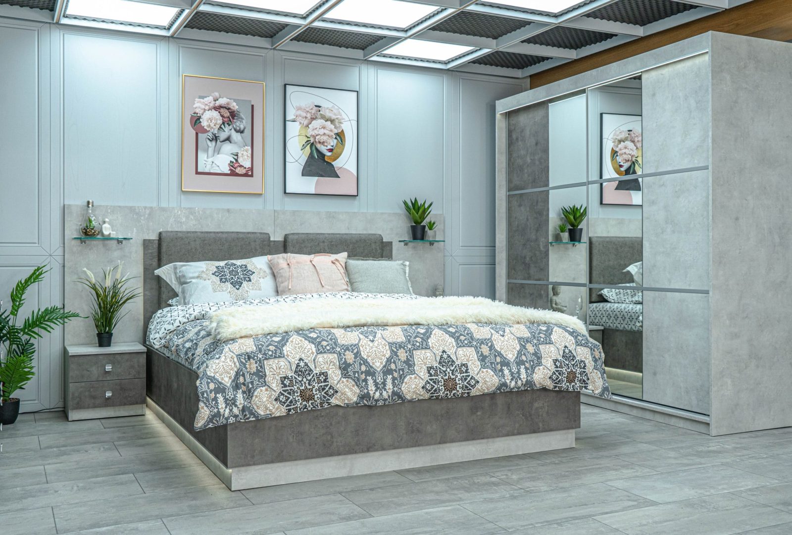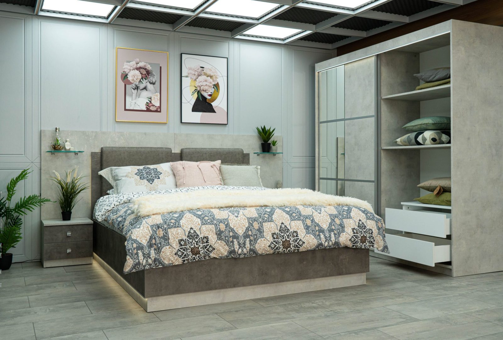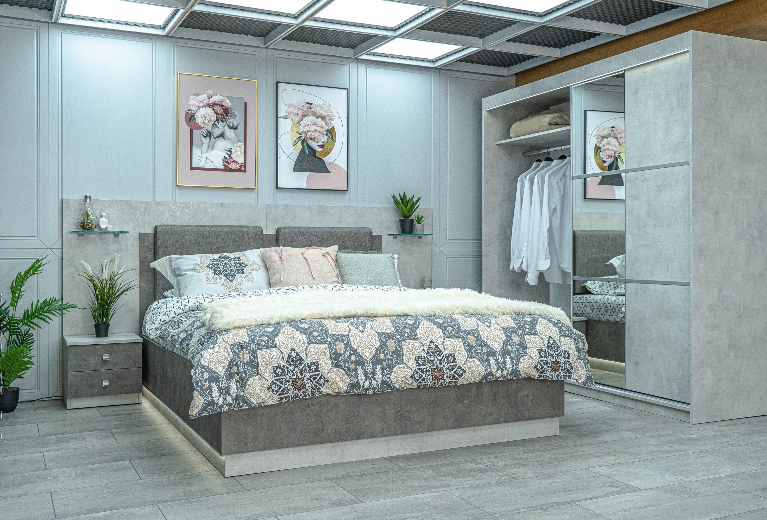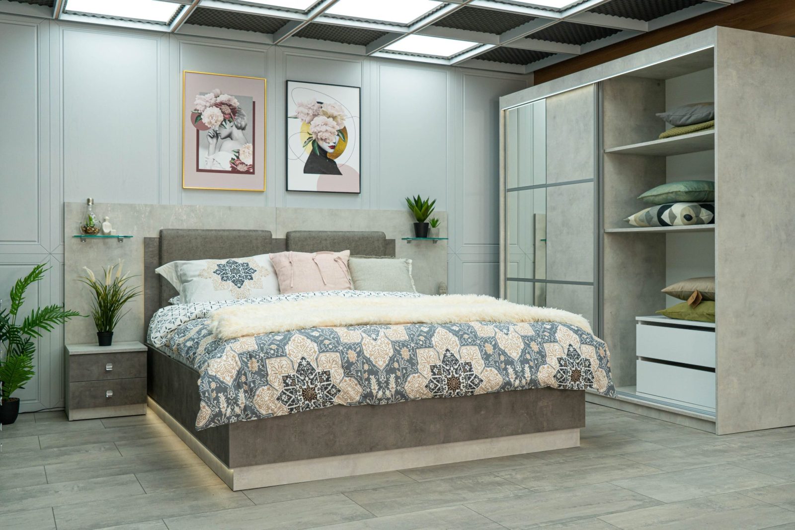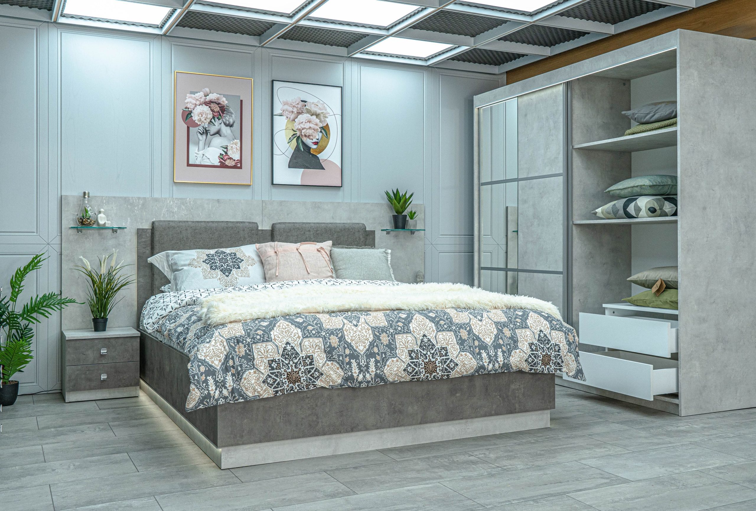 Легло: двойна табла – основна – ПДЧ бетон- светъл, втора табла – декор – бетон тъмен с вградено LED осветление, режим на работа – дистанционно с опция за регулиране силата на светлина, за допълнителен комфорт са монтирани 2 бр. тапицирани пана от полиуретанова пяна – текстил – сив, база за матрак с вътрешен мост – гарантиращ прав диагонал на леглото. Всички използвани сглобки са метални – скрит монтаж, осигуряващи изряден външен вид на изделието;
