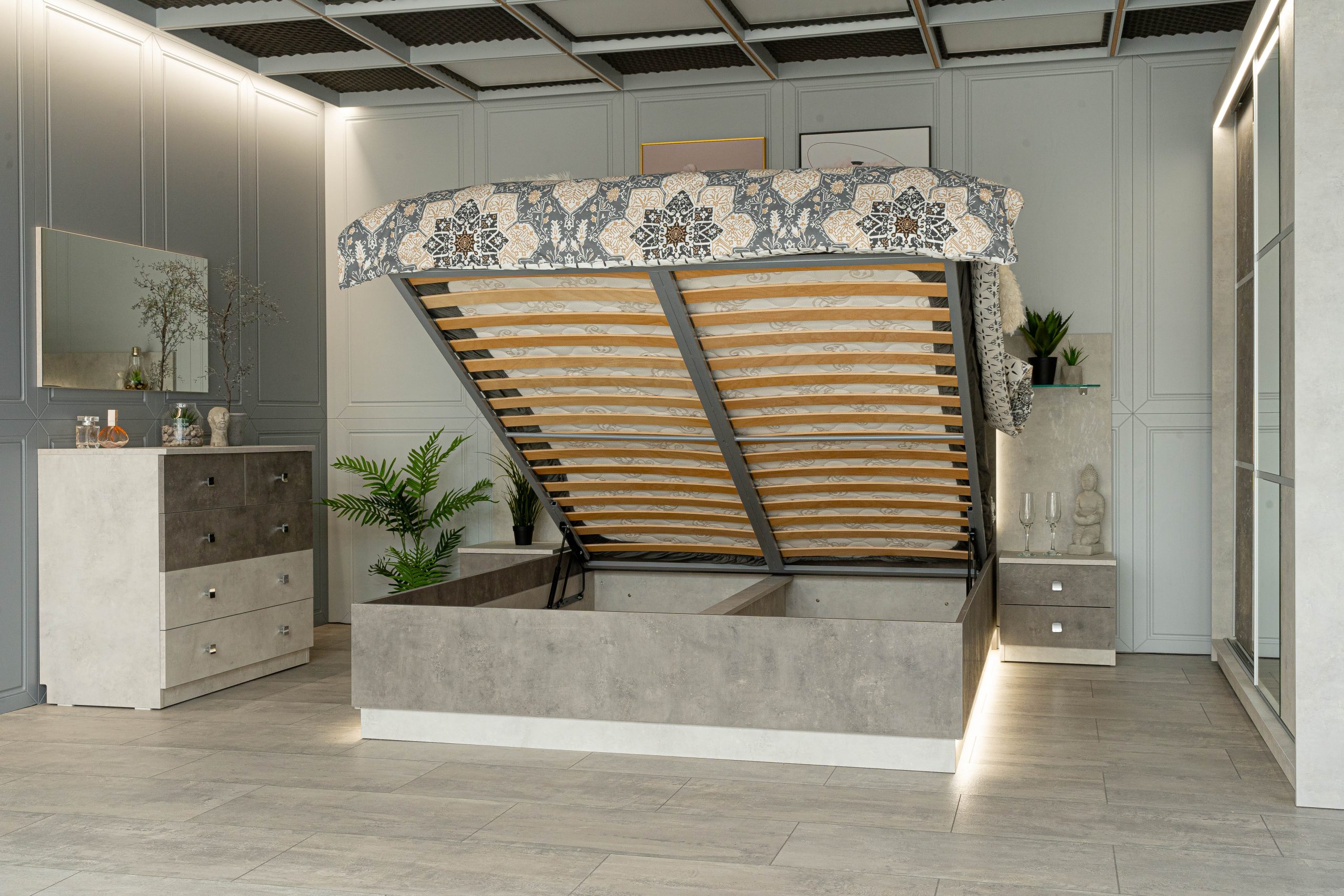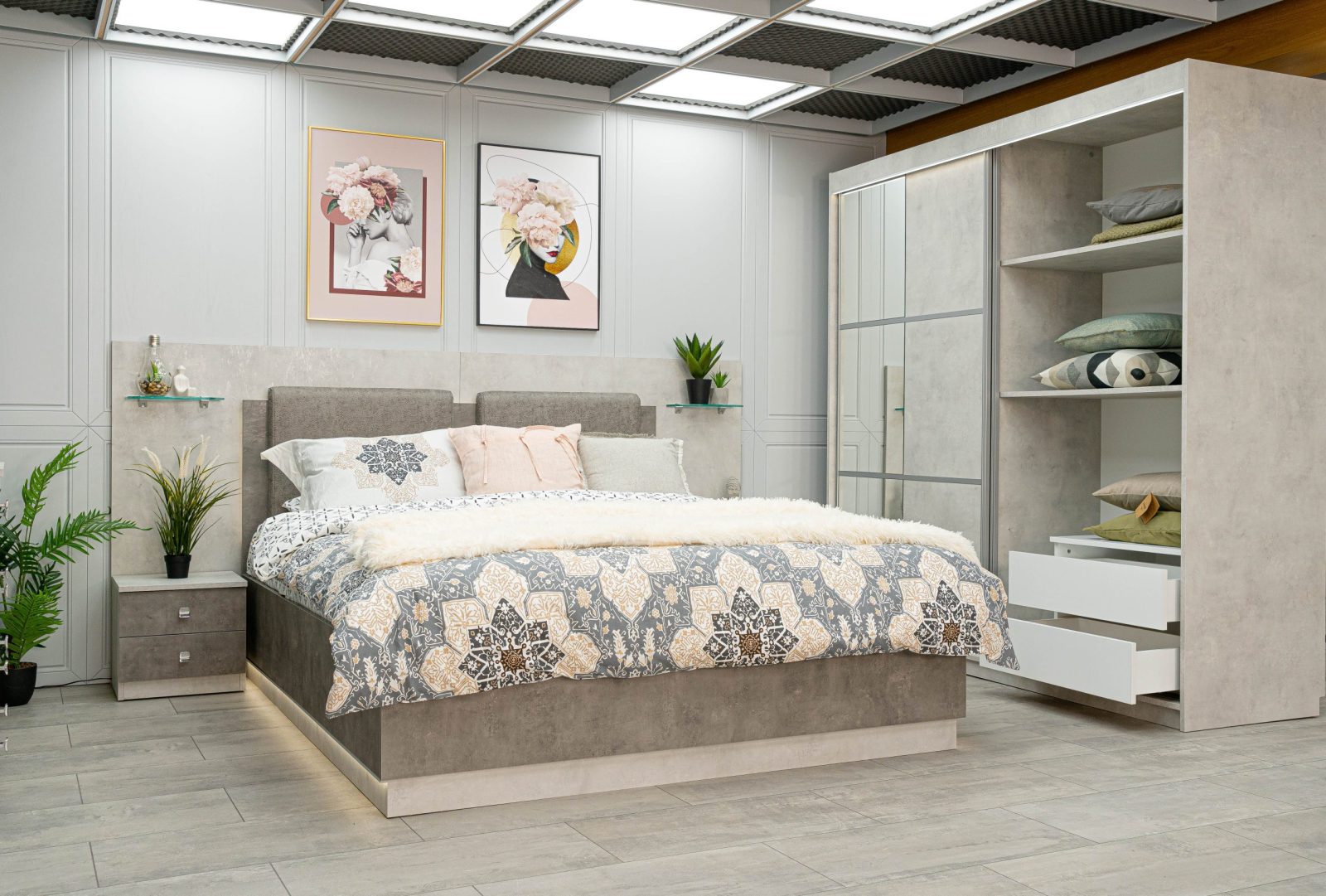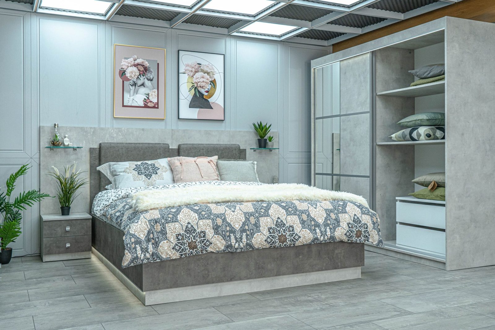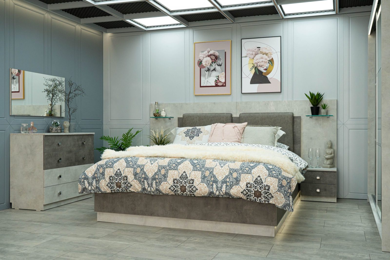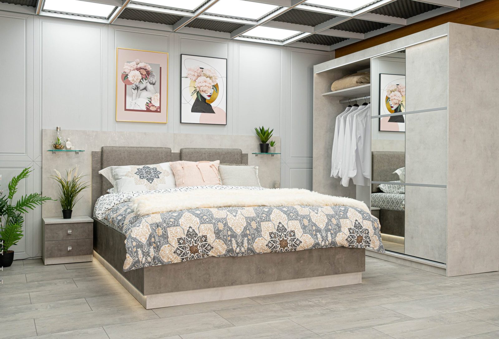 Легло: двойна табла – основна – ПДЧ бетон- светъл, втора табла – декор – бетон тъмен с вградено LED осветление, режим на работа – дистанционно с опция за регулиране силата на светлина, за допълнителен комфорт са монтирани 2 бр. тапицирани пана от полиуретанова пяна – текстил – сив, база за матрак с вътрешен мост – гарантиращ прав диагонал на леглото. Всички използвани сглобки са метални – скрит монтаж, осигуряващи изряден външен вид на изделието;