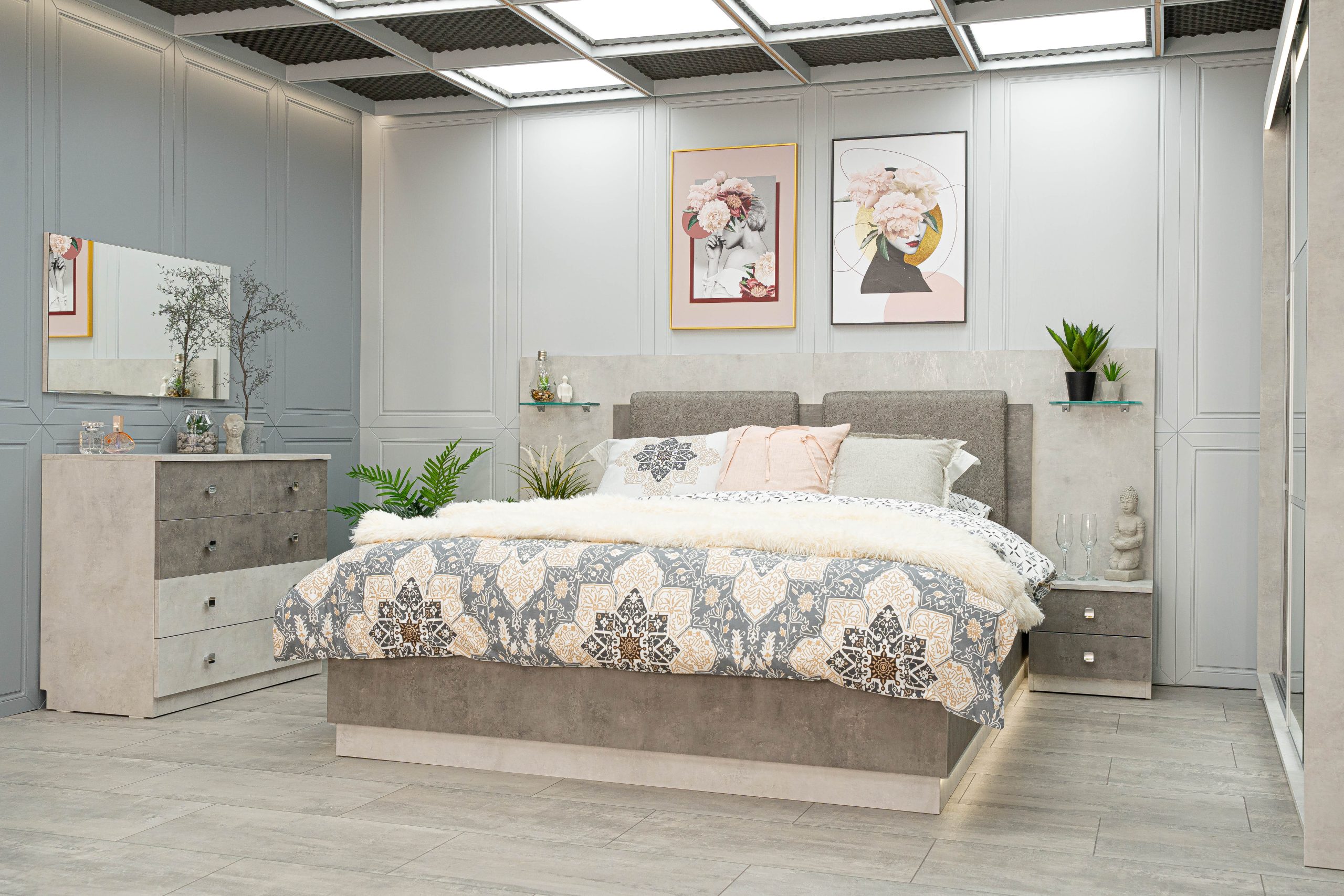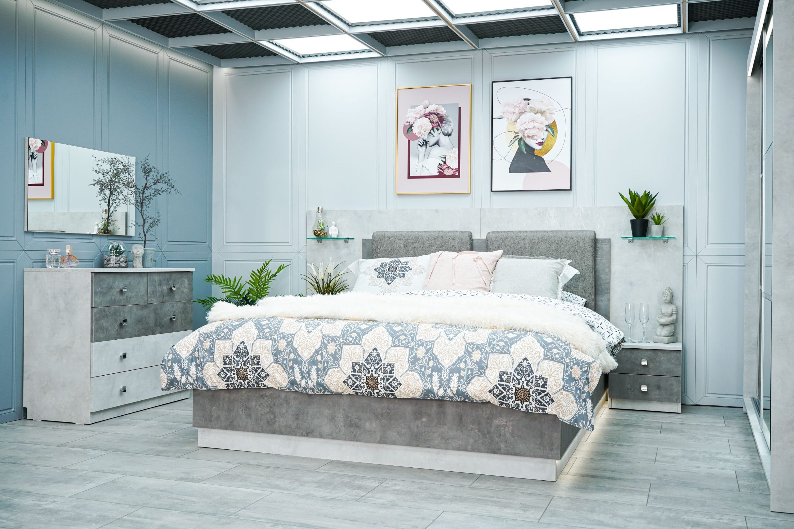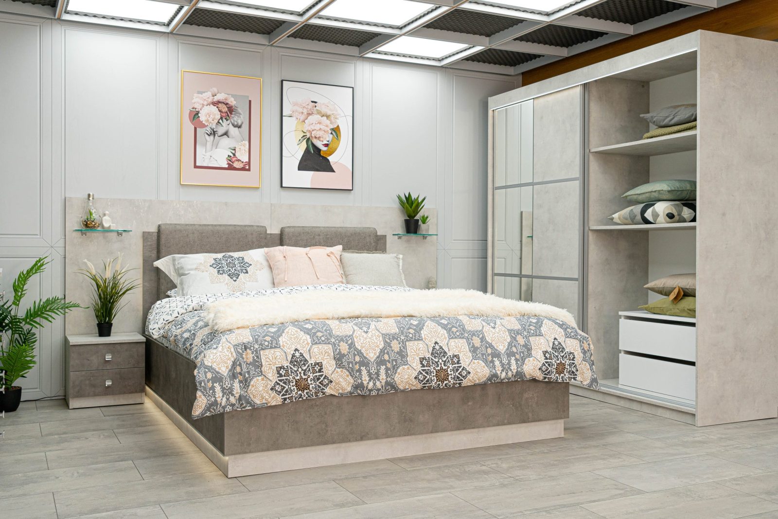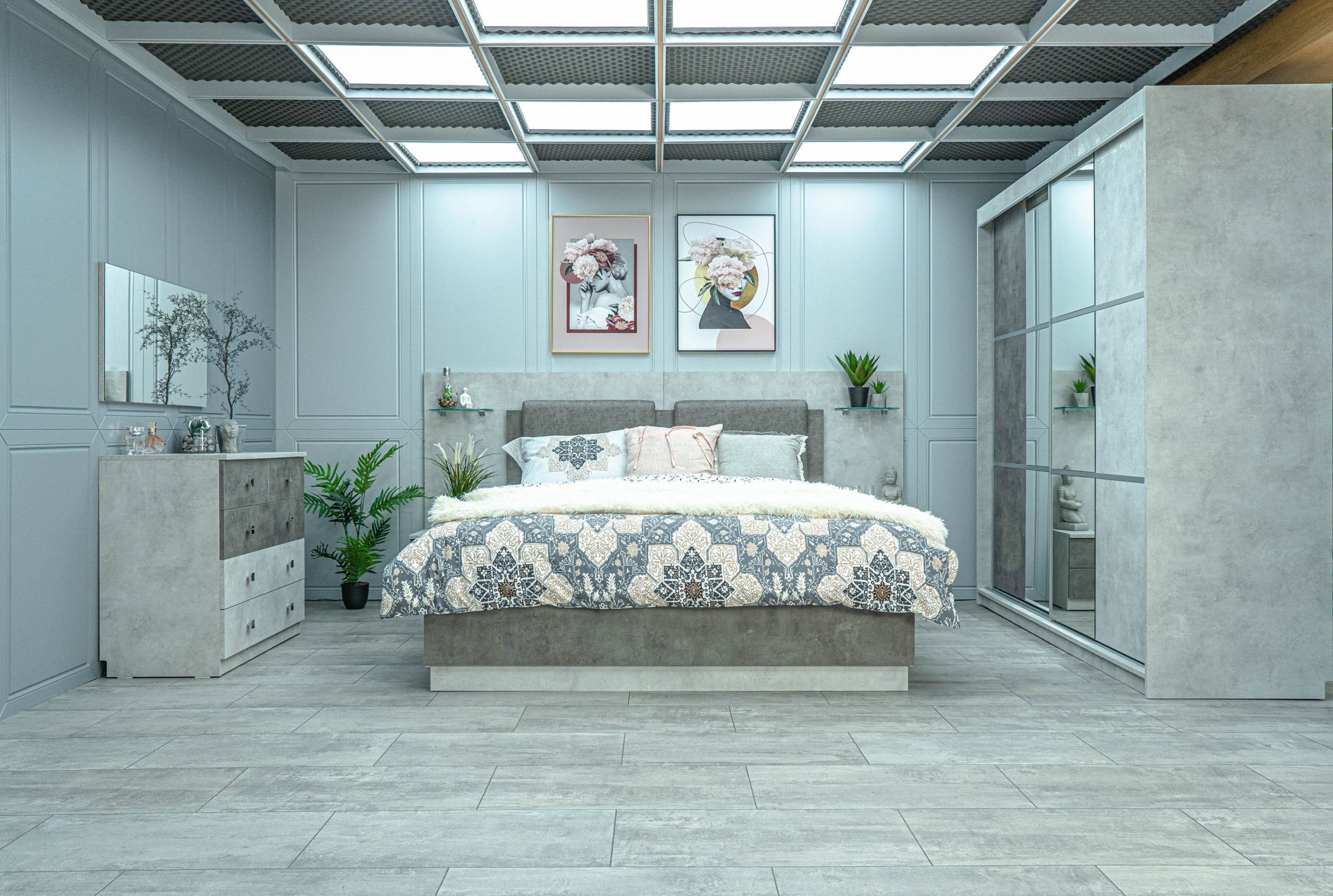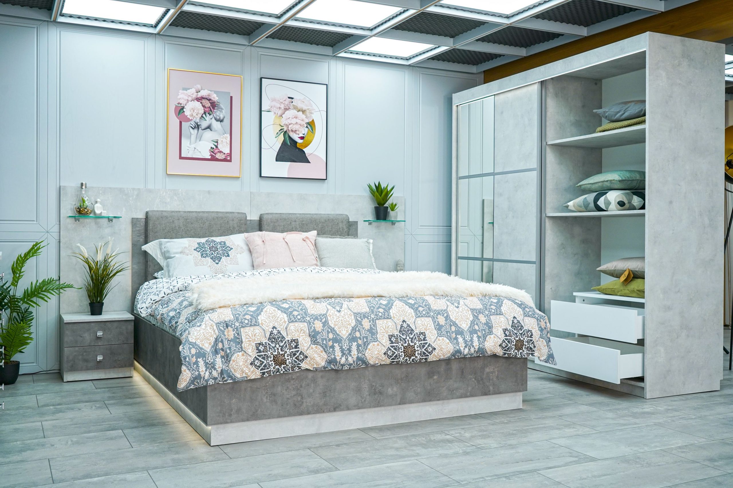 Легло: двойна табла – основна – ПДЧ бетон- светъл, втора табла – декор – бетон тъмен с вградено LED осветление, режим на работа – дистанционно с опция за регулиране силата на светлина, за допълнителен комфорт са монтирани 2 бр. тапицирани пана от полиуретанова пяна – текстил – сив, база за матрак с вътрешен мост – гарантиращ прав диагонал на леглото. Всички използвани сглобки са метални – скрит монтаж, осигуряващи изряден външен вид на изделието;