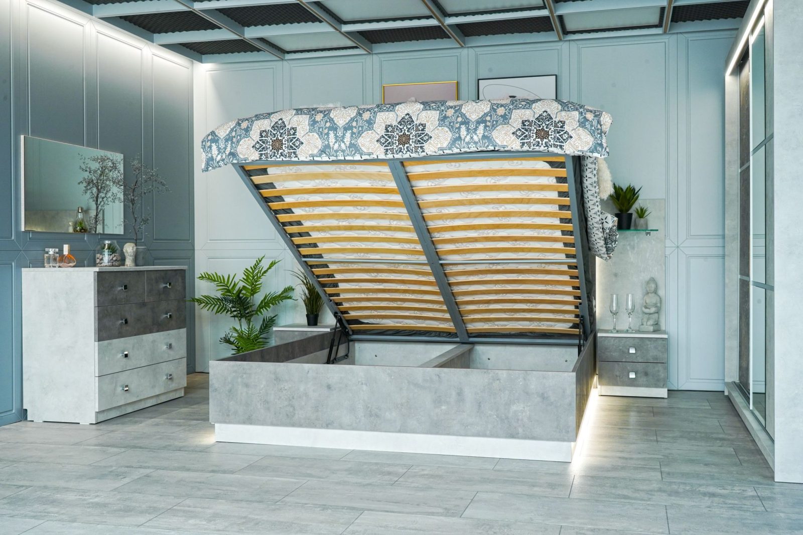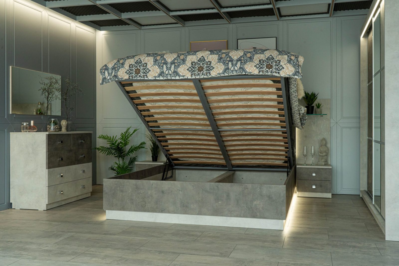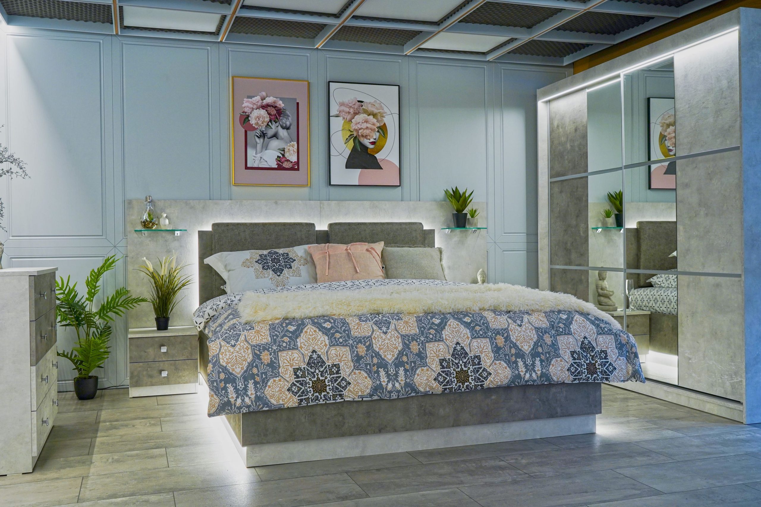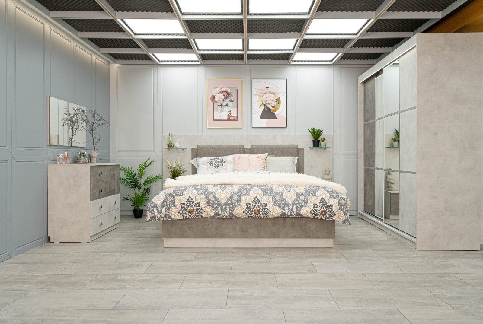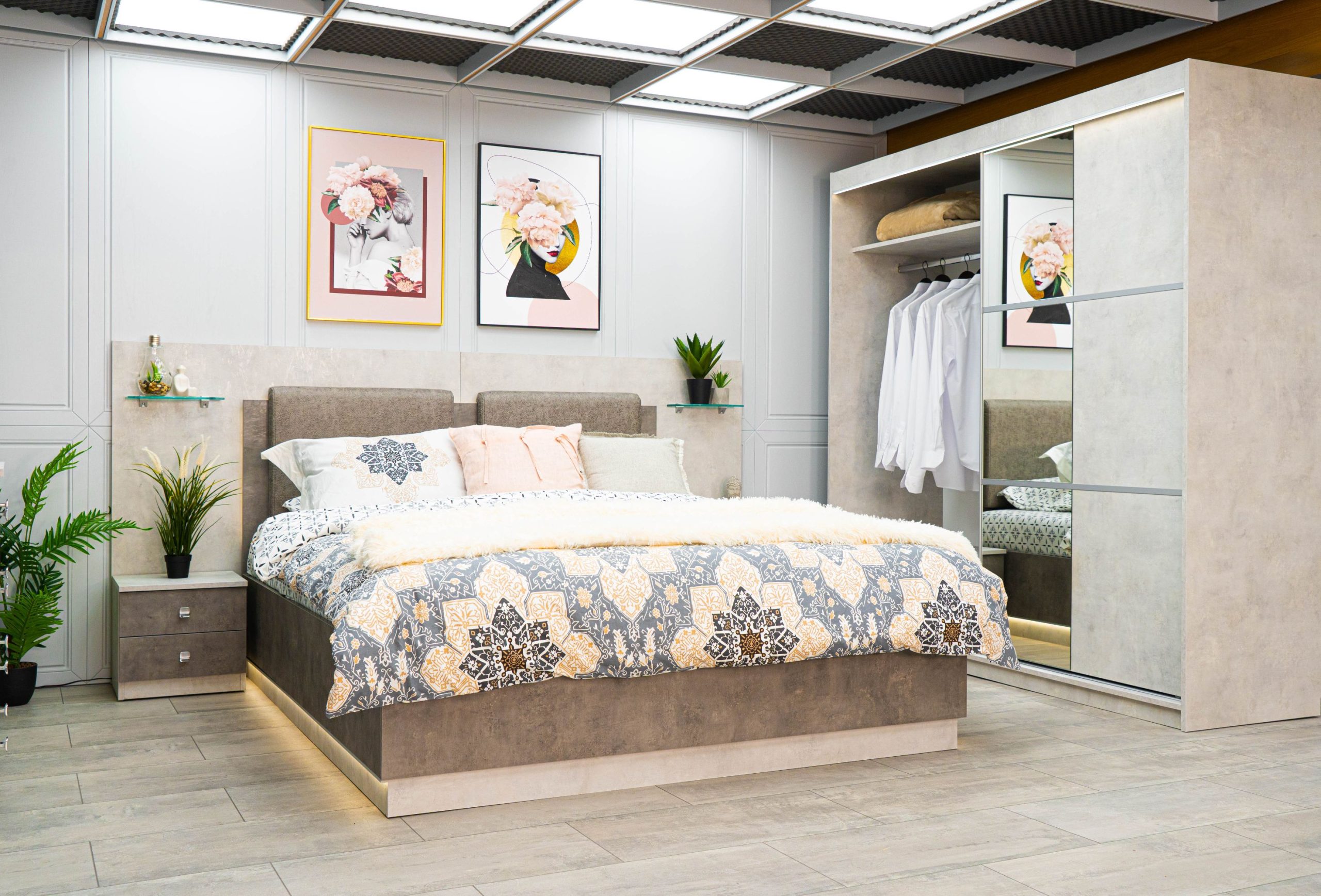 Легло: двойна табла – основна – ПДЧ бетон- светъл, втора табла – декор – бетон тъмен с вградено LED осветление, режим на работа – дистанционно с опция за регулиране силата на светлина, за допълнителен комфорт са монтирани 2 бр. тапицирани пана от полиуретанова пяна – текстил – сив, база за матрак с вътрешен мост – гарантиращ прав диагонал на леглото. Всички използвани сглобки са метални – скрит монтаж, осигуряващи изряден външен вид на изделието;
