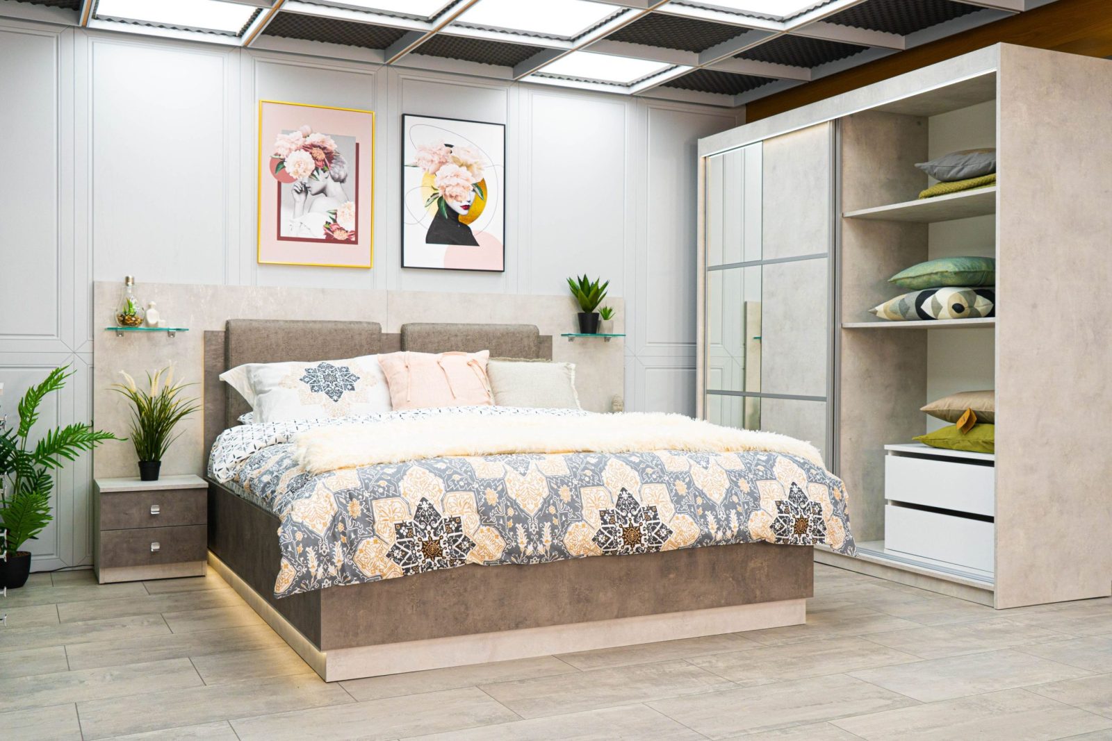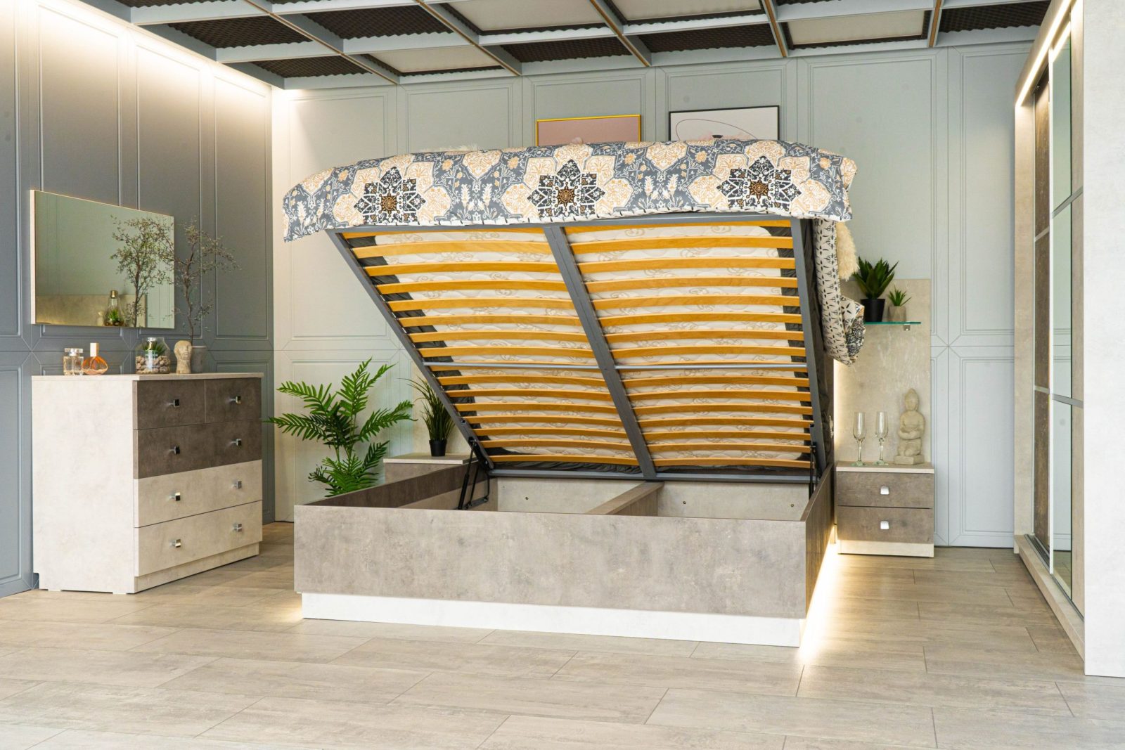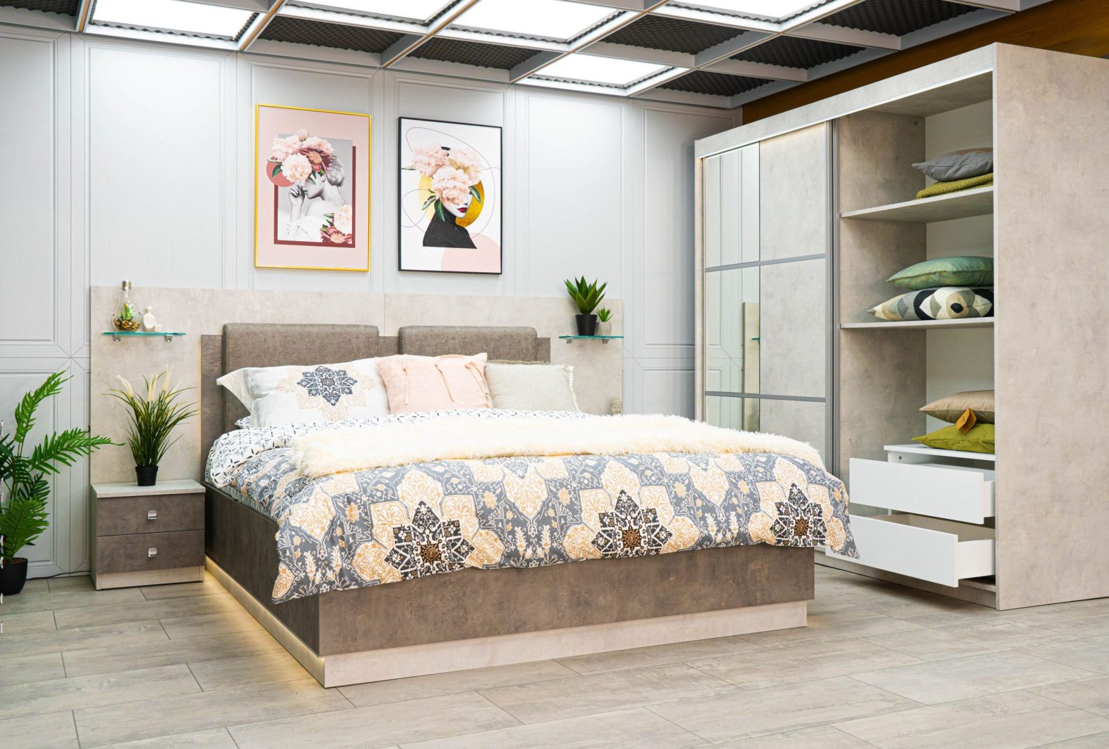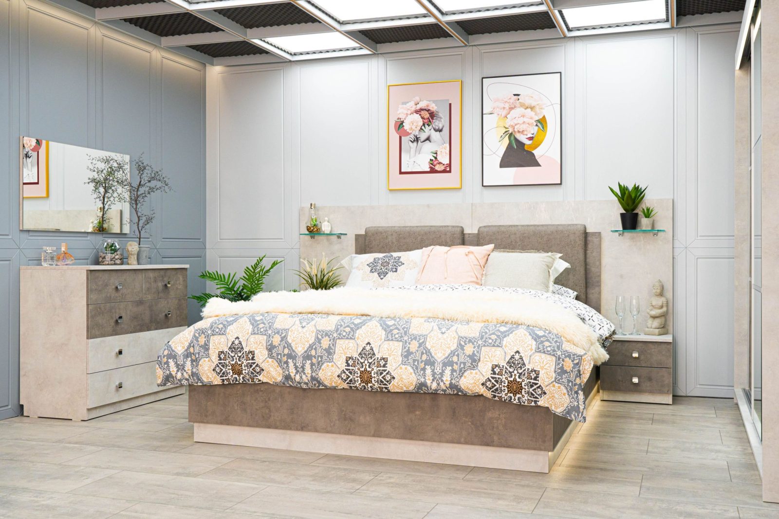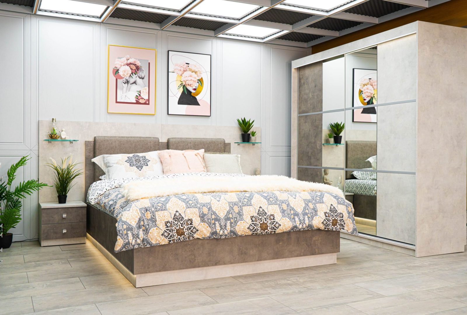 Легло: двойна табла – основна – ПДЧ бетон- светъл, втора табла – декор – бетон тъмен с вградено LED осветление, режим на работа – дистанционно с опция за регулиране силата на светлина, за допълнителен комфорт са монтирани 2 бр. тапицирани пана от полиуретанова пяна – текстил – сив, база за матрак с вътрешен мост – гарантиращ прав диагонал на леглото. Всички използвани сглобки са метални – скрит монтаж, осигуряващи изряден външен вид на изделието;