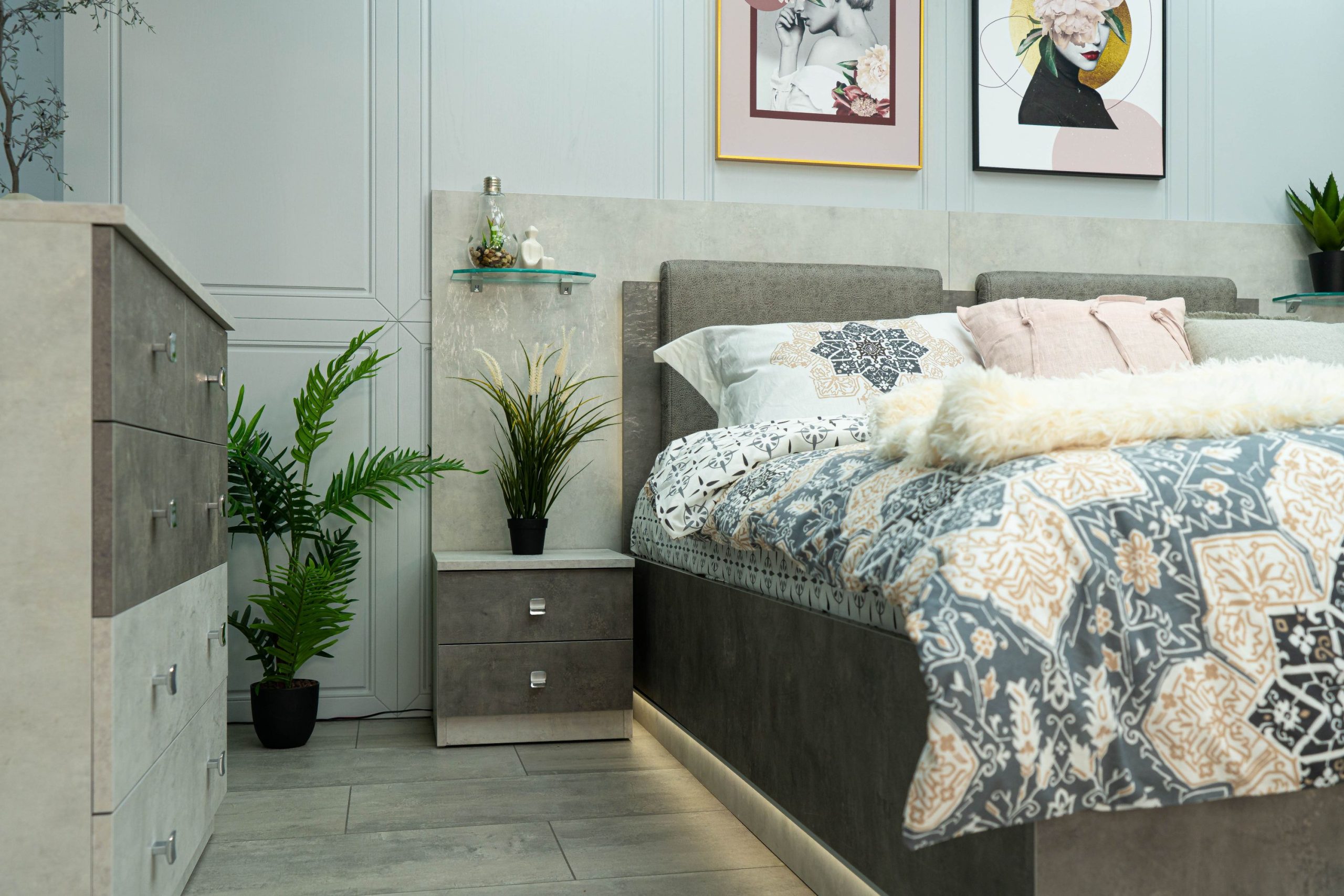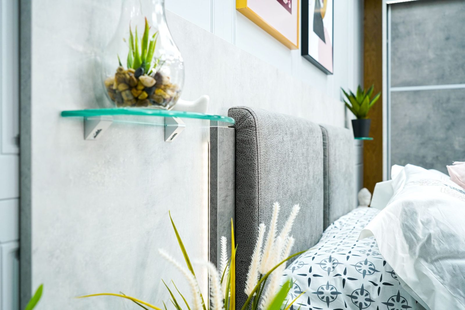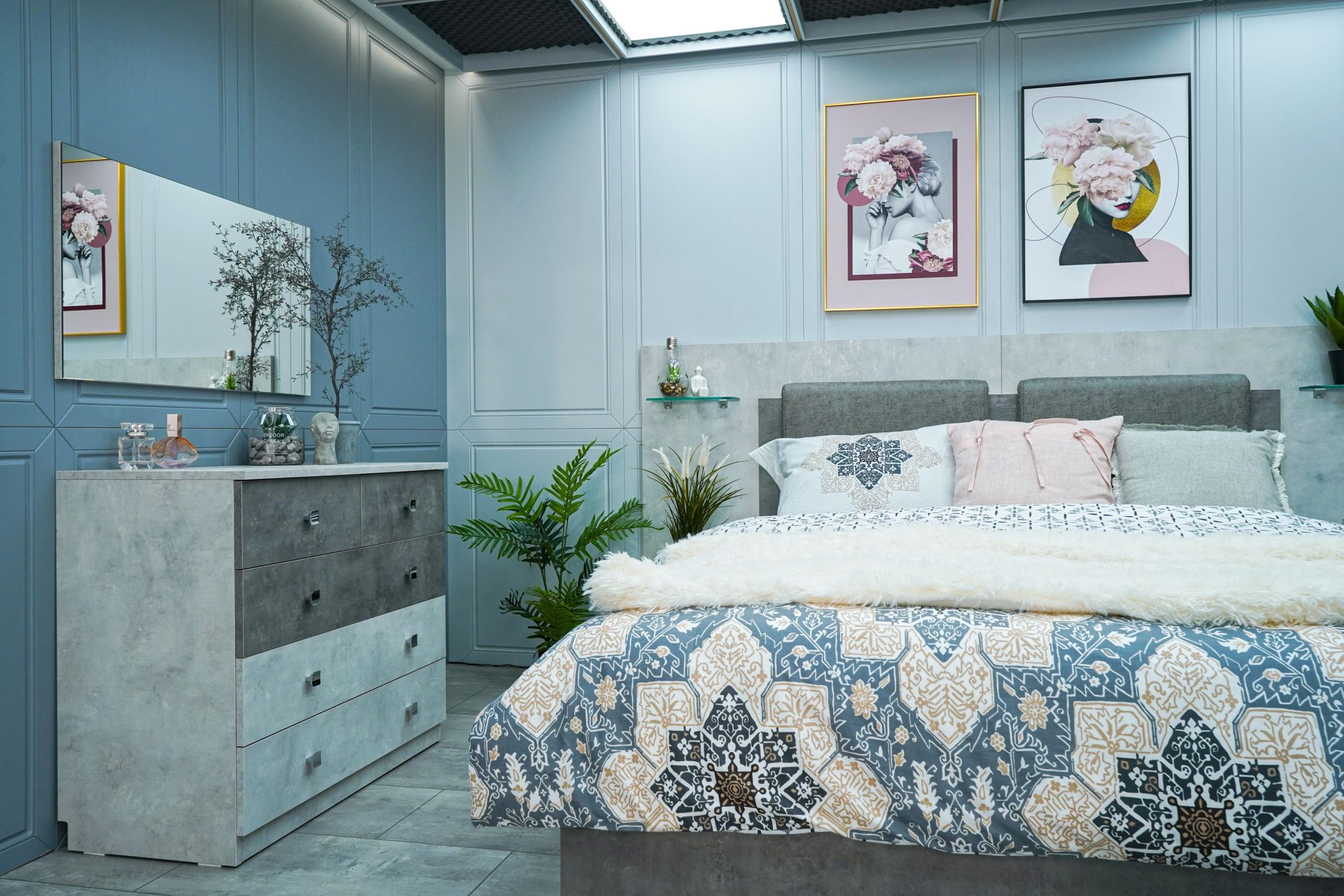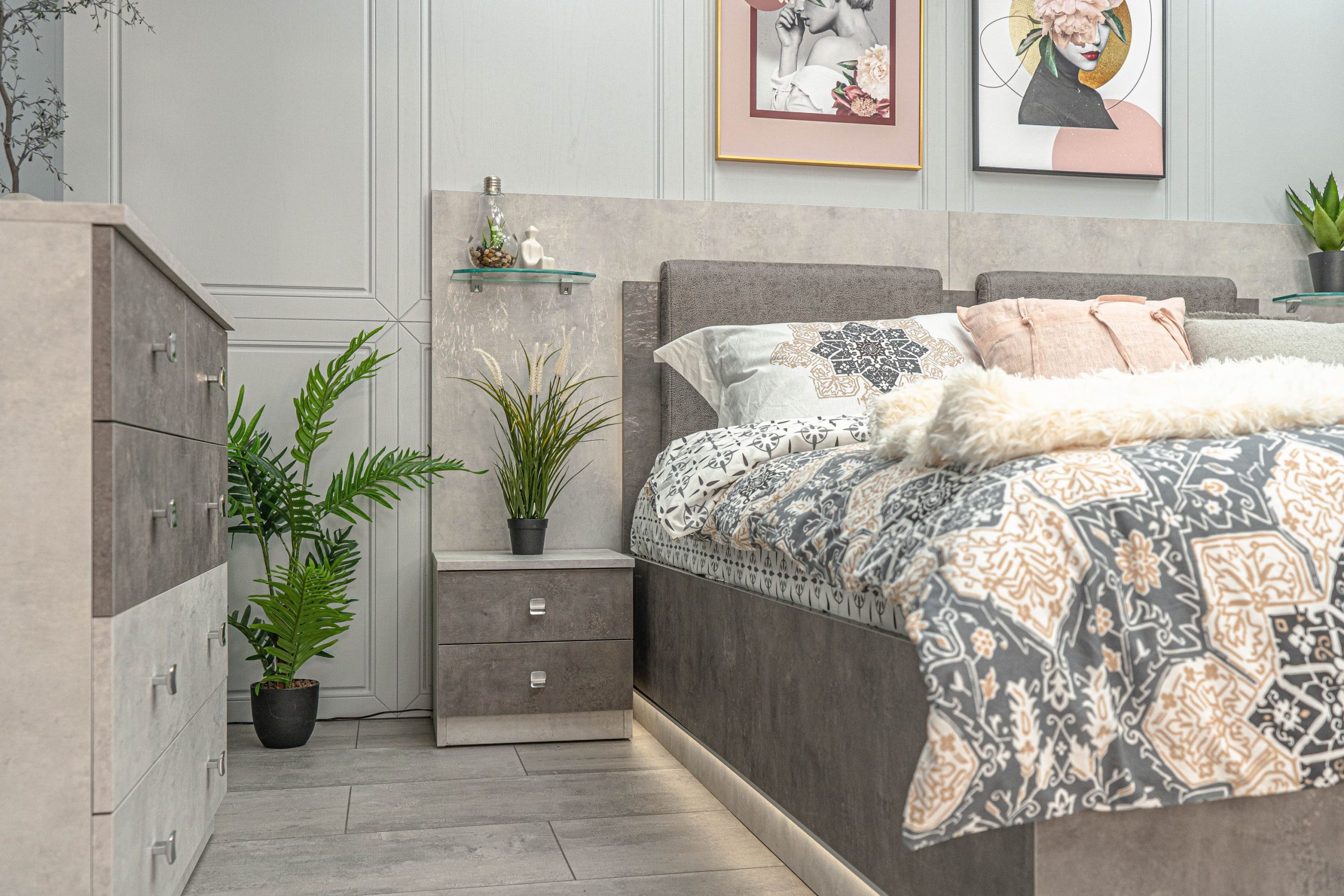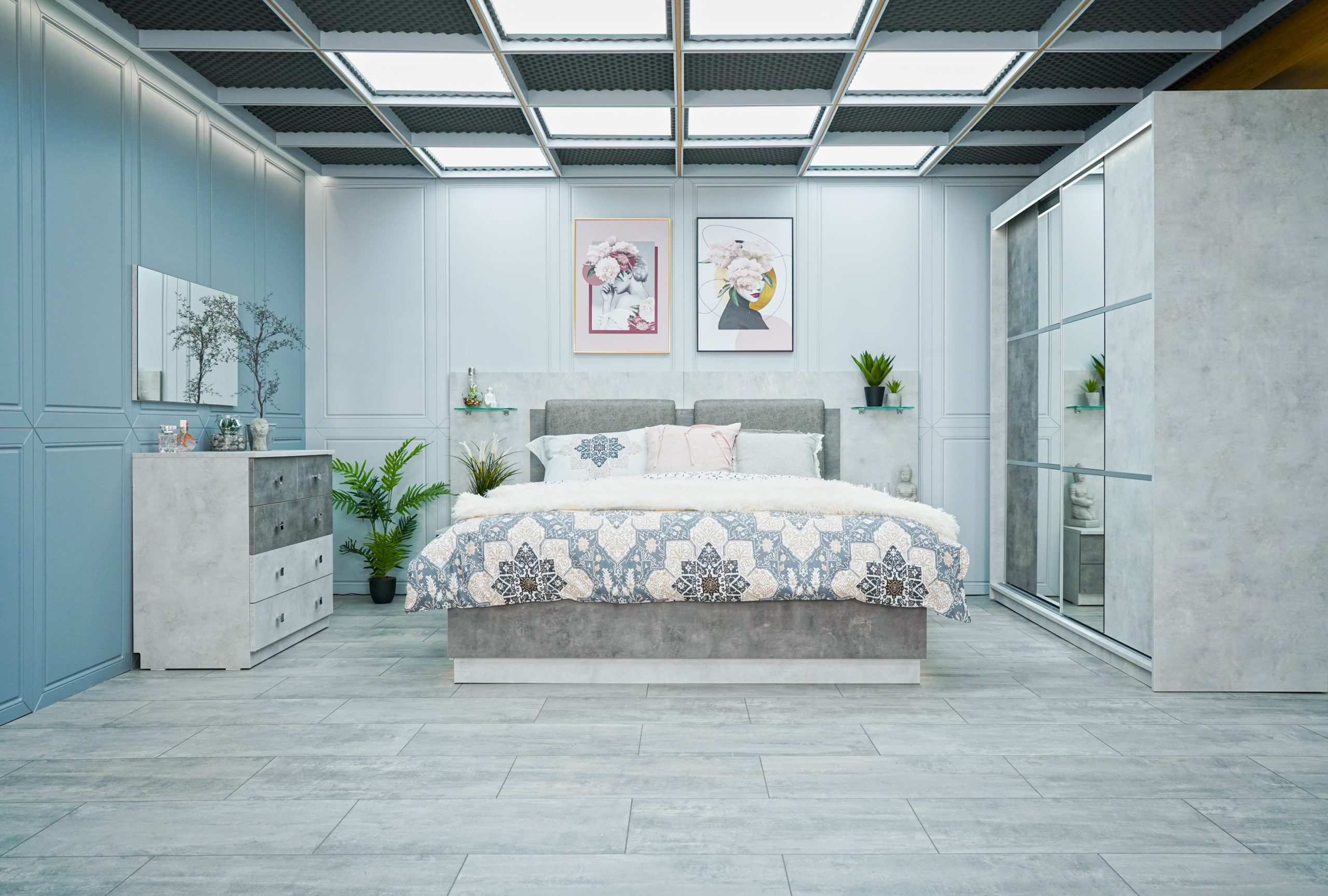Легло: двойна табла – основна – ПДЧ бетон- светъл, втора табла – декор – бетон тъмен с вградено LED осветление, режим на работа – дистанционно с опция за регулиране силата на светлина, за допълнителен комфорт са монтирани 2 бр. тапицирани пана от полиуретанова пяна – текстил – сив, база за матрак с вътрешен мост – гарантиращ прав диагонал на леглото. Всички използвани сглобки са метални – скрит монтаж, осигуряващи изряден външен вид на изделието;