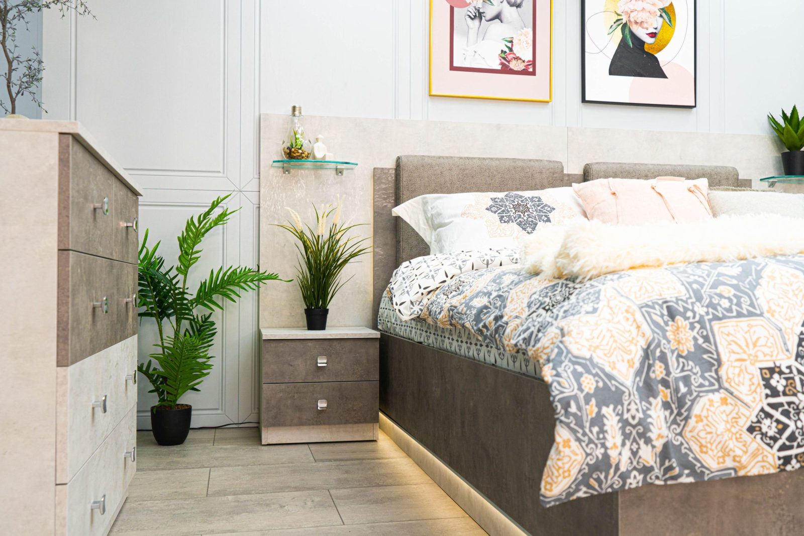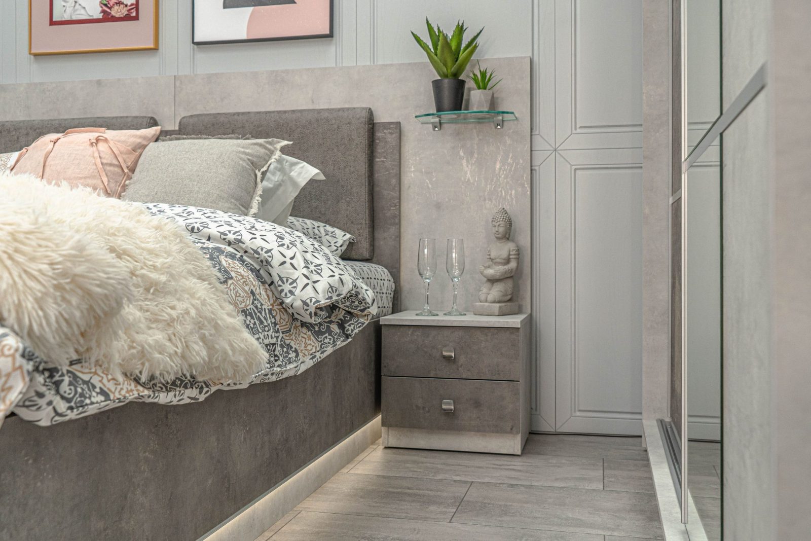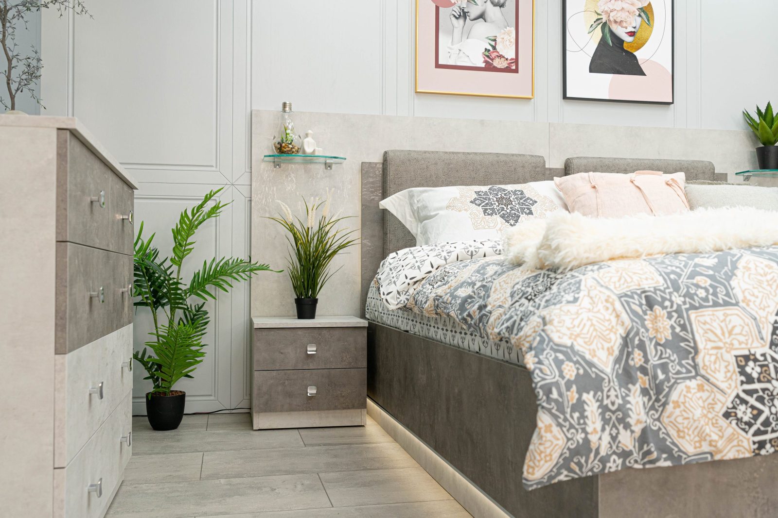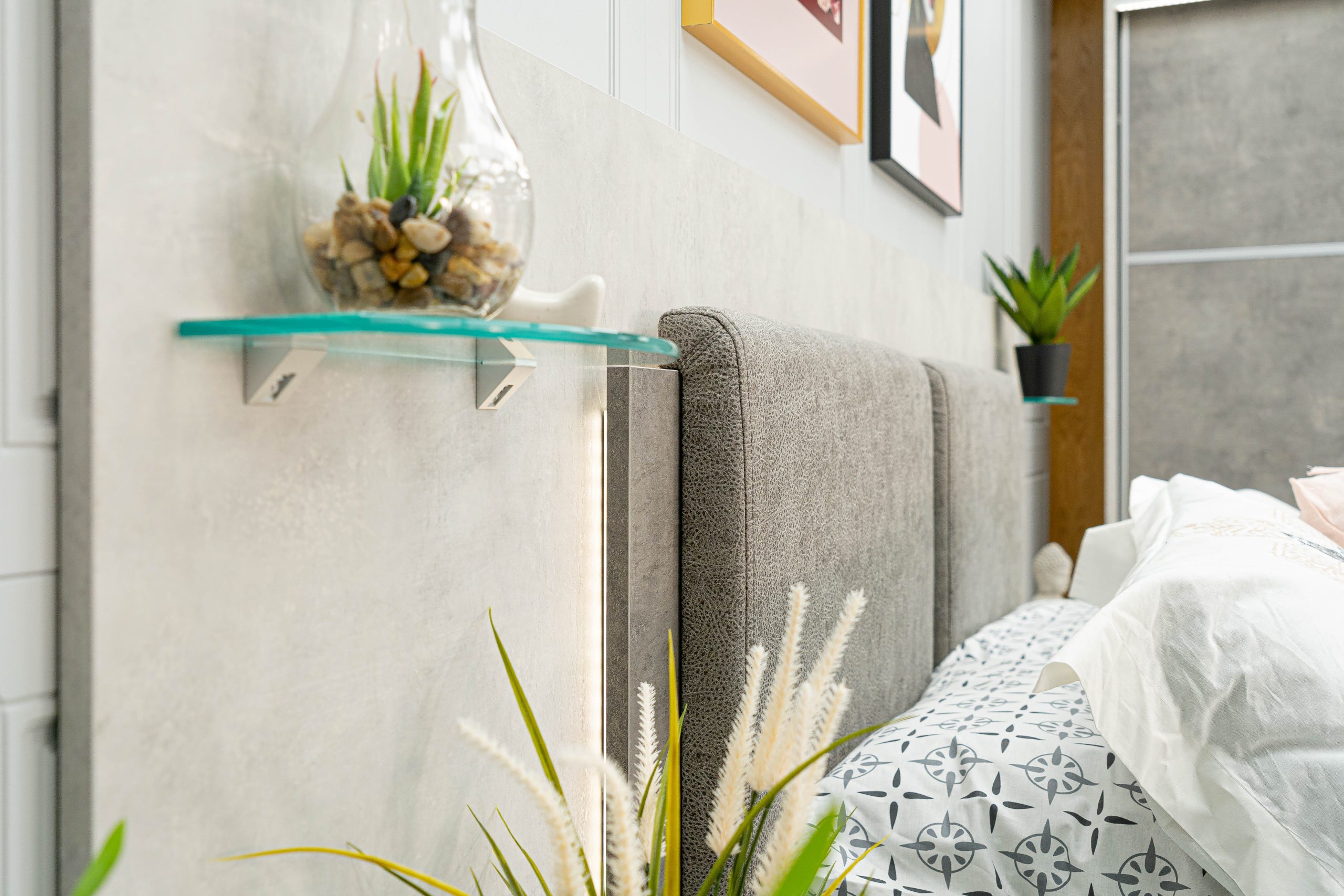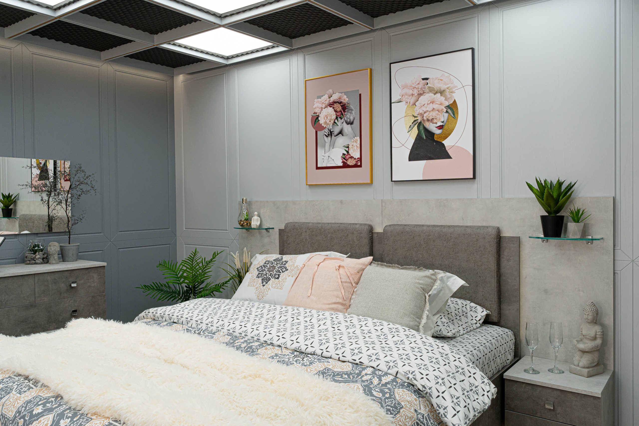 Легло: двойна табла – основна – ПДЧ бетон- светъл, втора табла – декор – бетон тъмен с вградено LED осветление, режим на работа – дистанционно с опция за регулиране силата на светлина, за допълнителен комфорт са монтирани 2 бр. тапицирани пана от полиуретанова пяна – текстил – сив, база за матрак с вътрешен мост – гарантиращ прав диагонал на леглото. Всички използвани сглобки са метални – скрит монтаж, осигуряващи изряден външен вид на изделието;