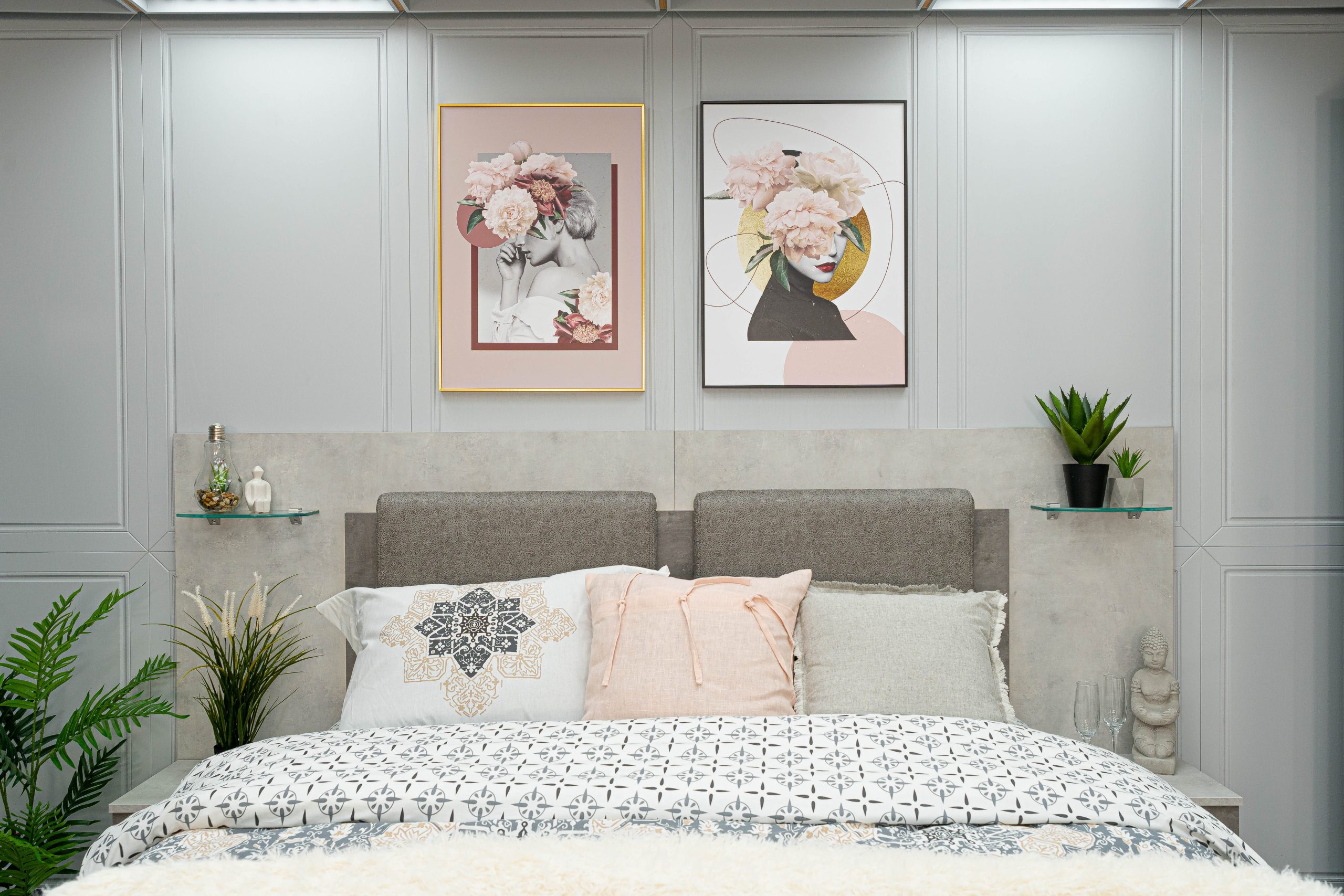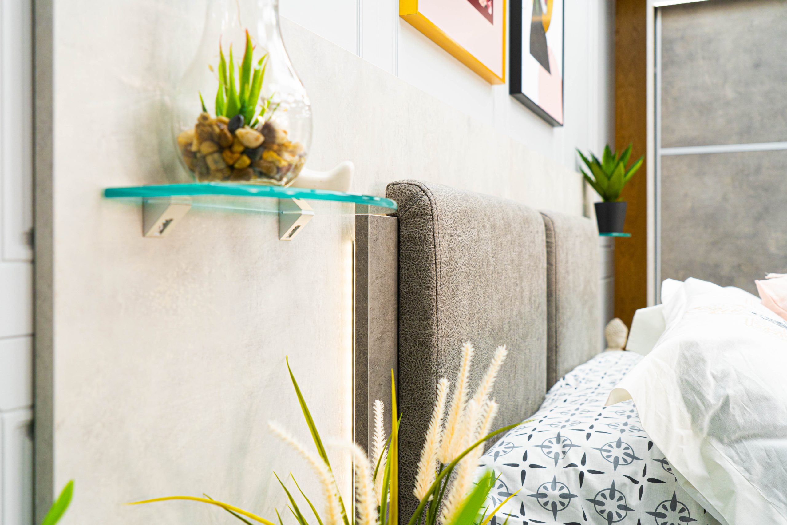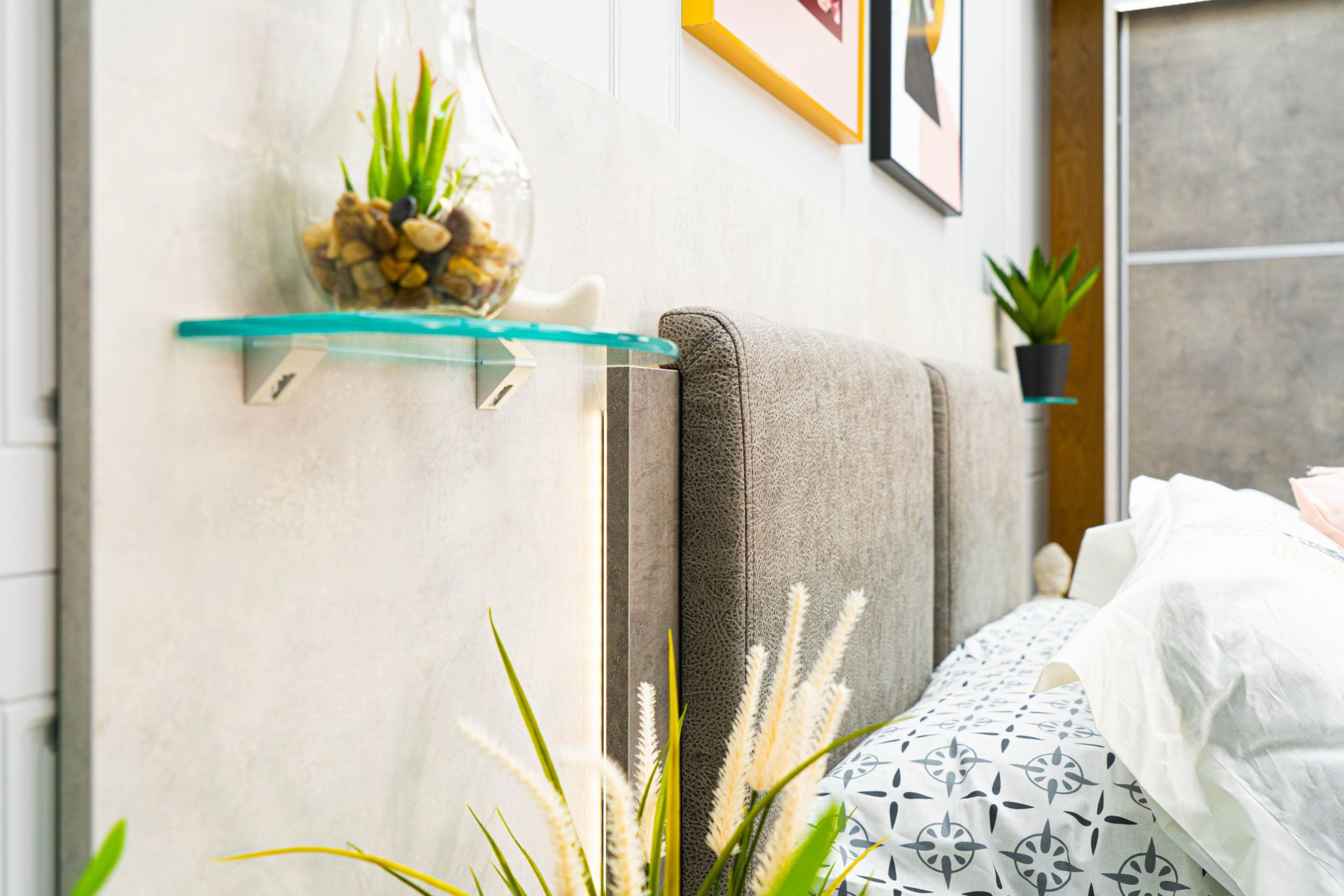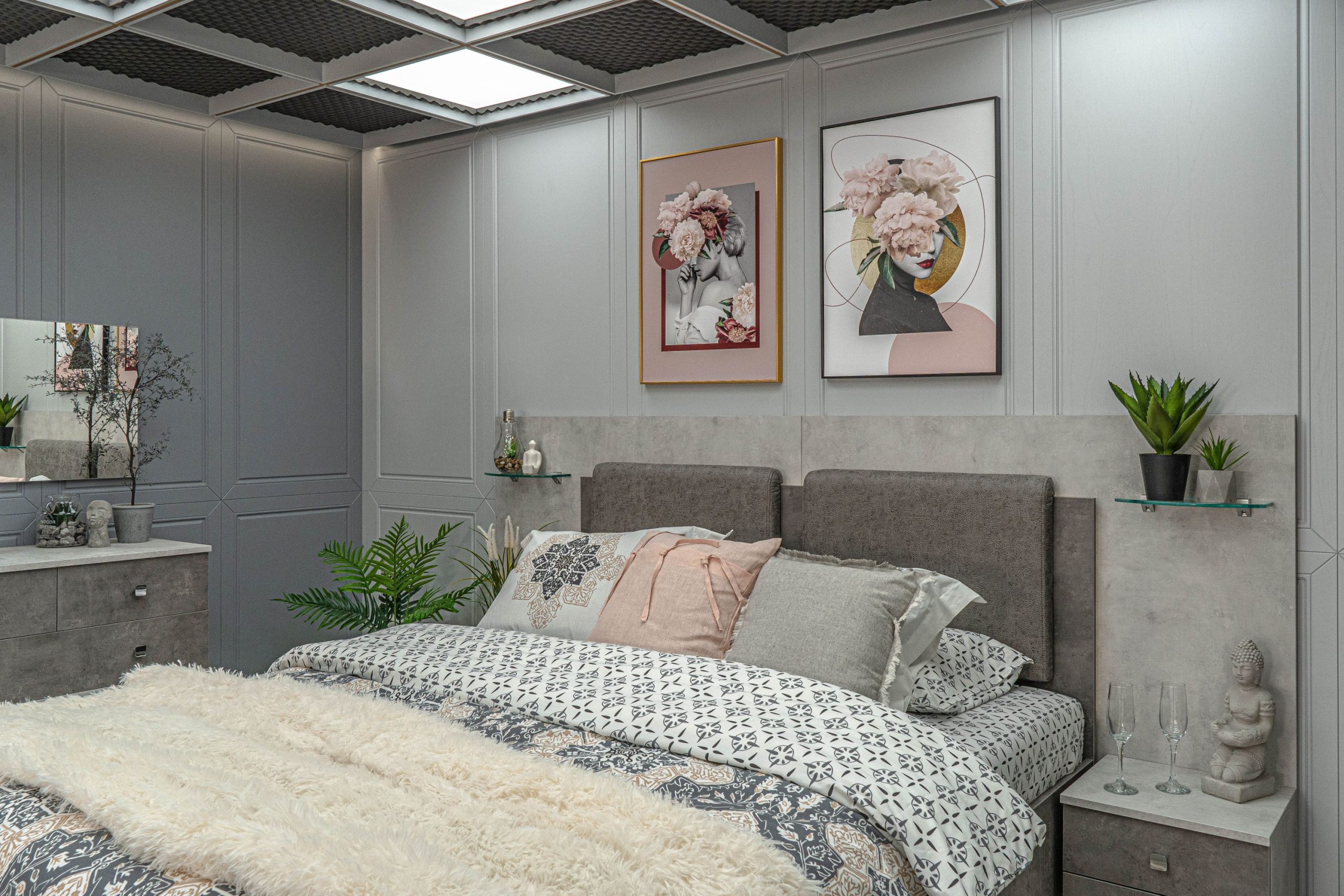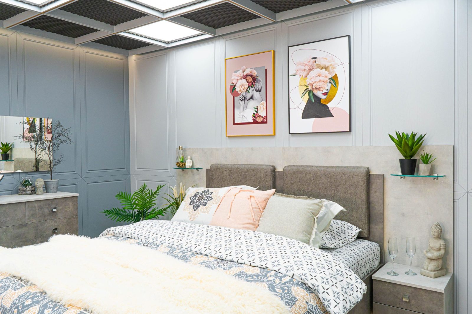 Легло: двойна табла – основна – ПДЧ бетон- светъл, втора табла – декор – бетон тъмен с вградено LED осветление, режим на работа – дистанционно с опция за регулиране силата на светлина, за допълнителен комфорт са монтирани 2 бр. тапицирани пана от полиуретанова пяна – текстил – сив, база за матрак с вътрешен мост – гарантиращ прав диагонал на леглото. Всички използвани сглобки са метални – скрит монтаж, осигуряващи изряден външен вид на изделието;