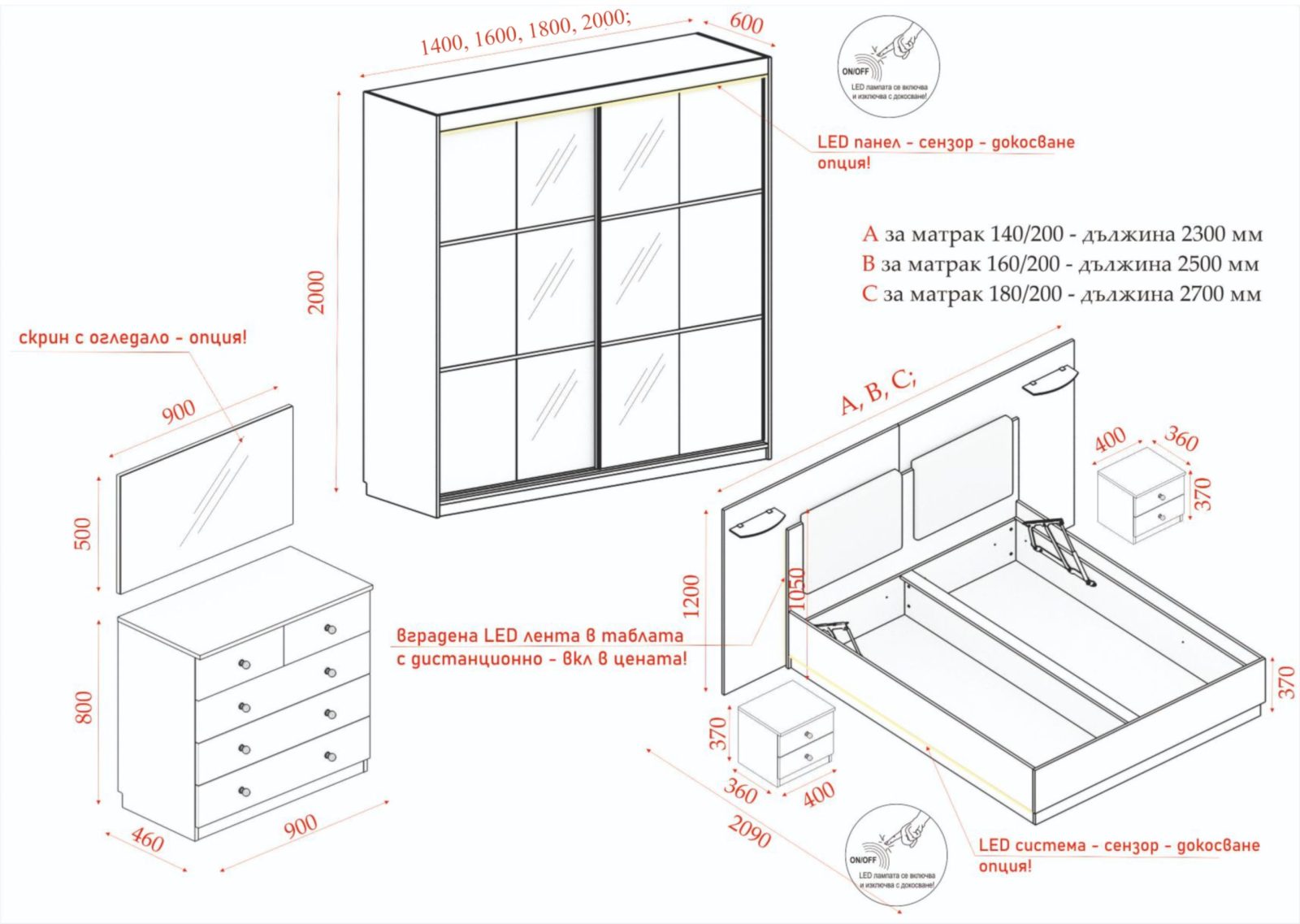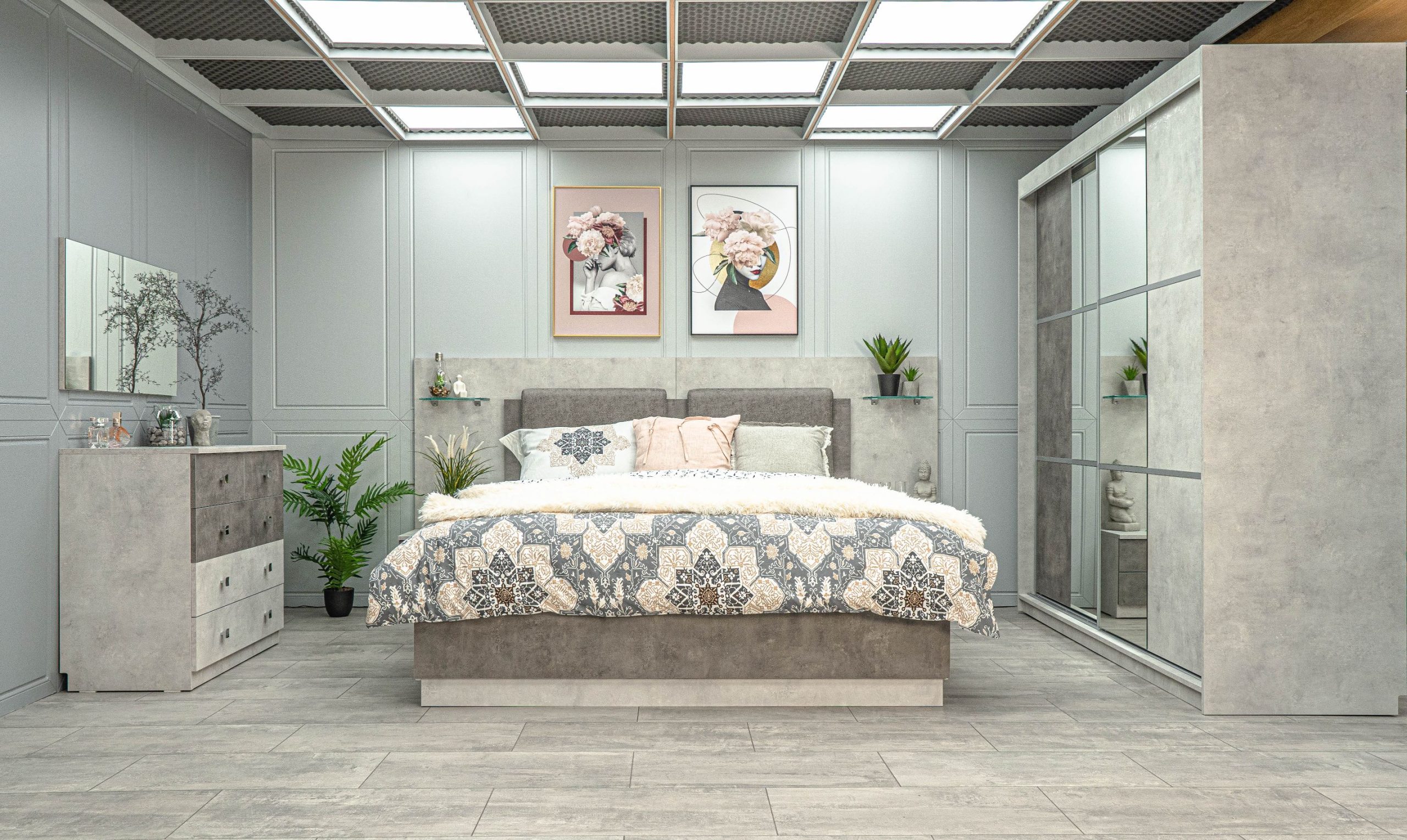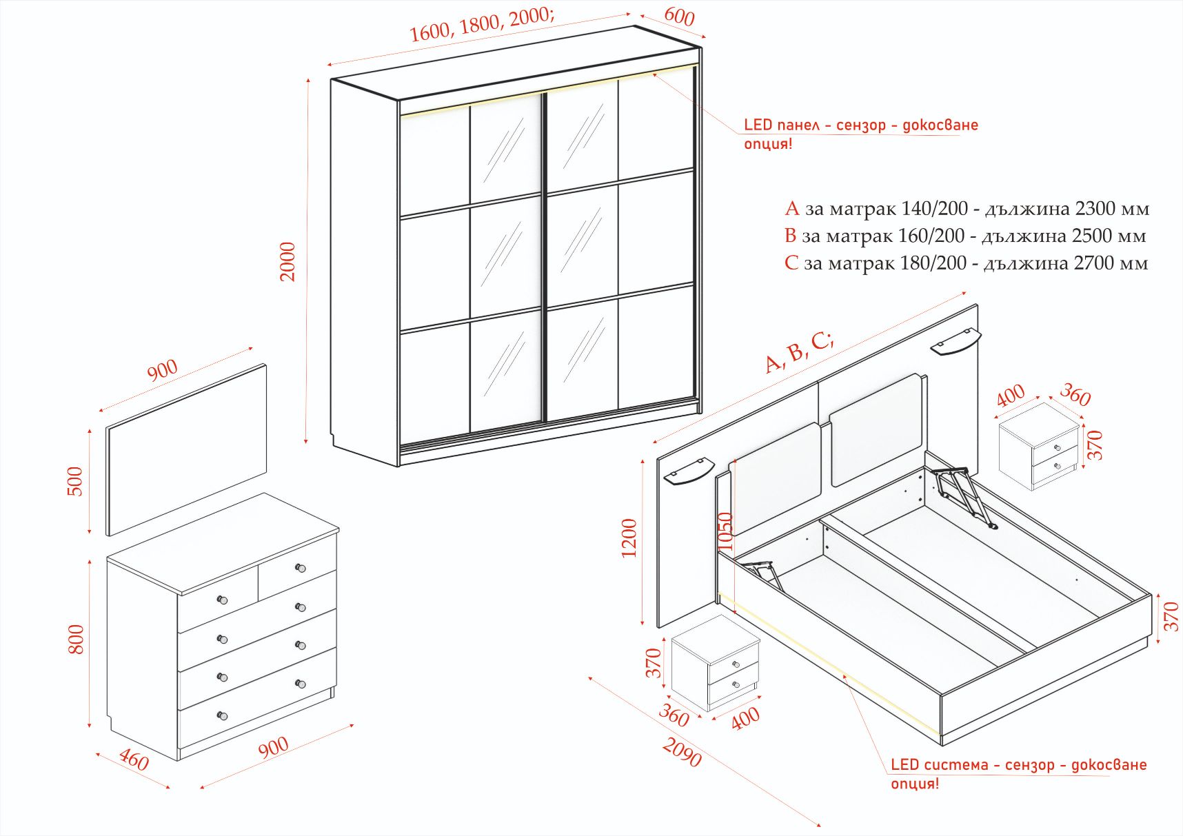 Гардероб: плъзгаща система вътрешно водене, вертикално разположени вградени алуминиеви „П“- образни кант дръжки с допълнително излят външен улей за лесно и удобно захващане, спомагащи ефективното плъзгане на системата – гарантиращи устойчивост и здравина на вратите, използвани са сглобки – скрит монтаж, метални рафтоносачи за стабилност на рафтовете, лост за дрехи – метален – форма – елипса – покритие – никел, цялата конструкция на гардероба е монтирана върху метални реглажни „пети“ – осигуряващи изрядна нивелация на изделието и правилната му експлоатация, вратите са изработени от пана декор тъмен и светъл бетон + вградени огледала на двете врати – 1 бр. в к-т;