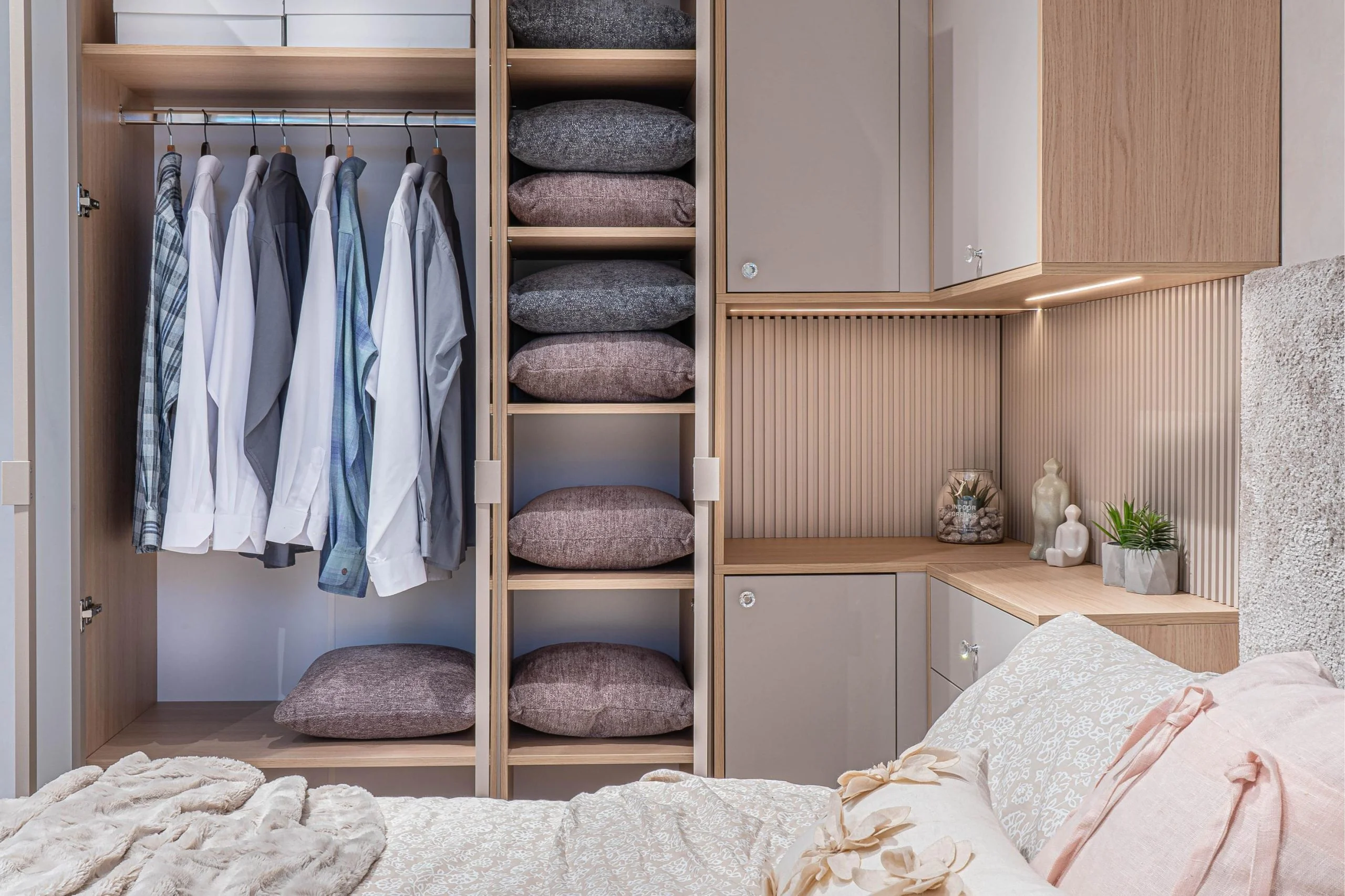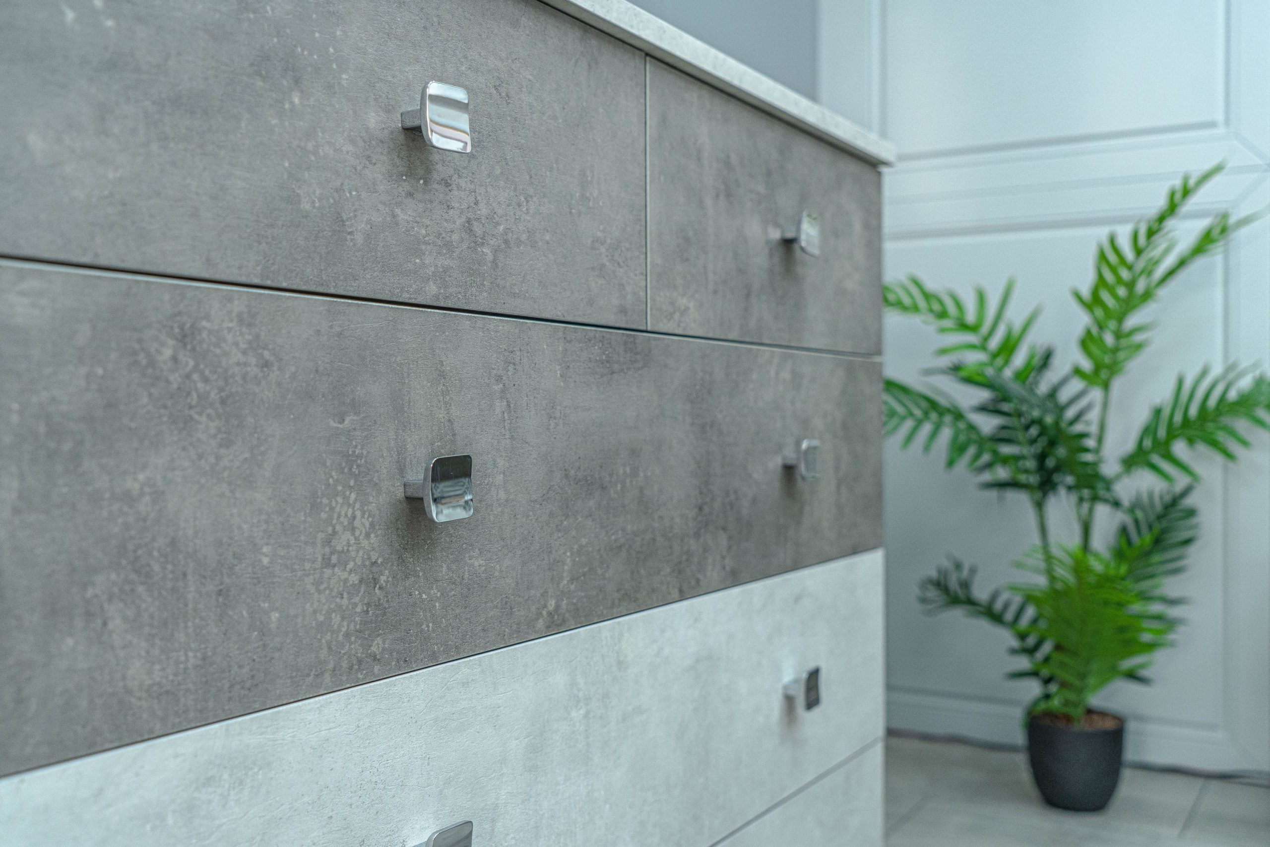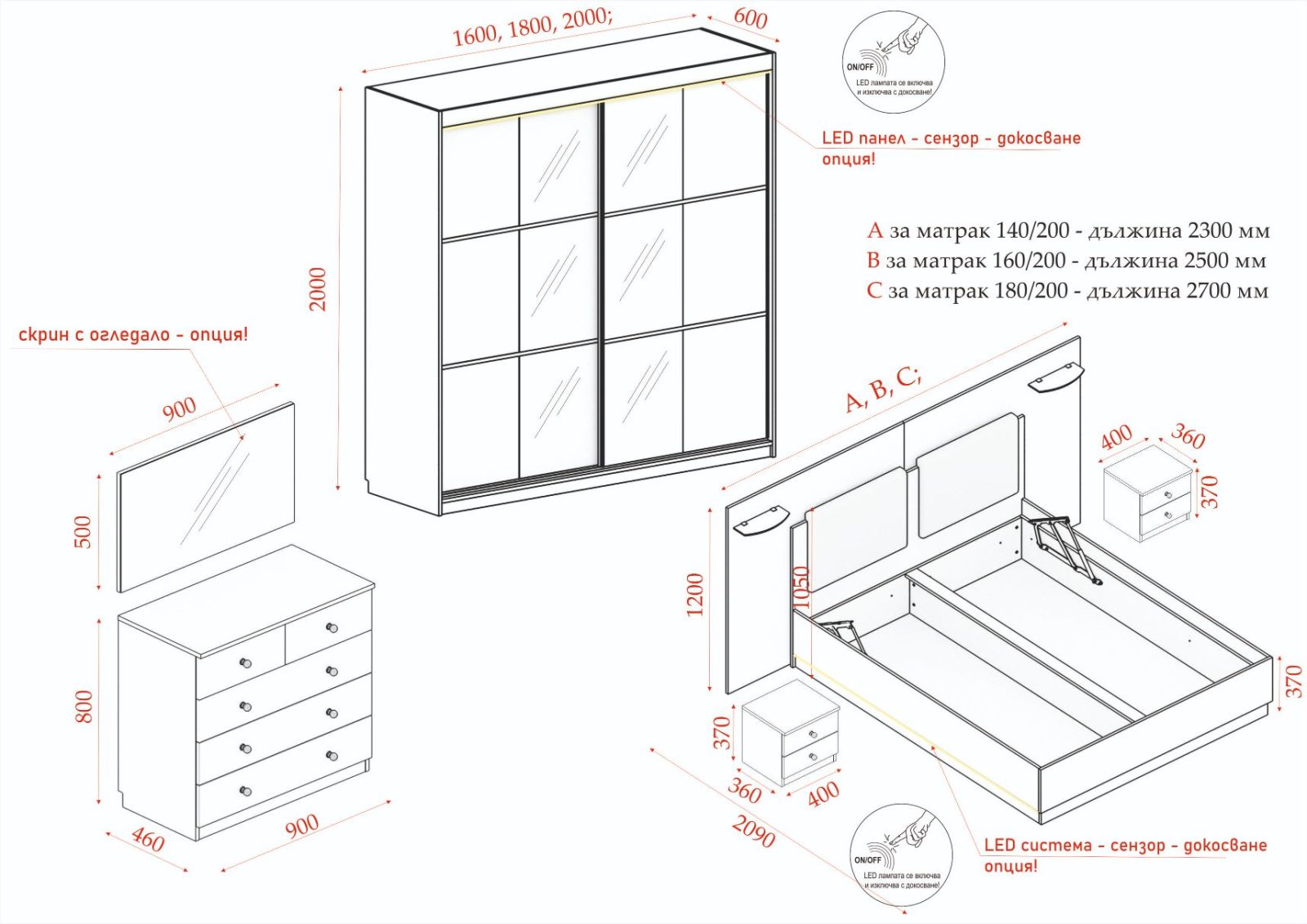 Гардероб: плъзгаща система вътрешно водене, вертикално разположени вградени алуминиеви „П“- образни кант дръжки с допълнително излят външен улей за лесно и удобно захващане, спомагащи ефективното плъзгане на системата – гарантиращи устойчивост и здравина на вратите, използвани са сглобки – скрит монтаж, метални рафтоносачи за стабилност на рафтовете, лост за дрехи – метален – форма – елипса – покритие – никел, цялата конструкция на гардероба е монтирана върху метални реглажни „пети“ – осигуряващи изрядна нивелация на изделието и правилната му експлоатация, вратите са изработени от пана декор тъмен и светъл бетон + вградени огледала на двете врати – 1 бр. в к-т;