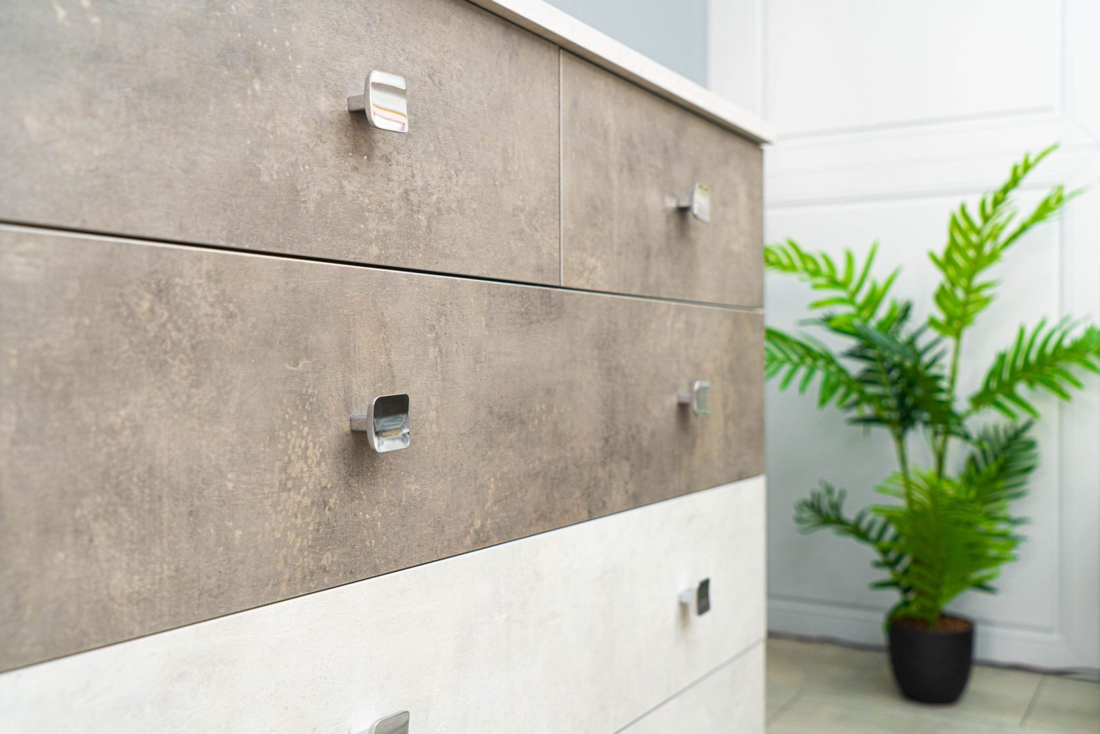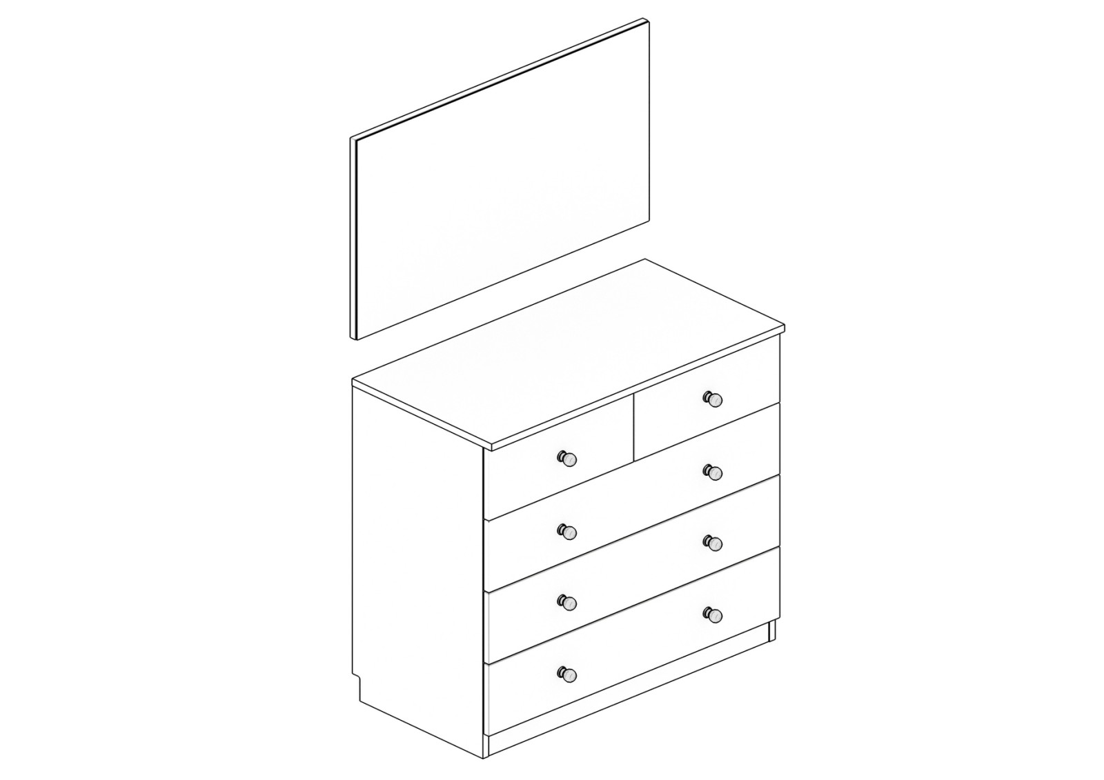 Скрин с огледало – опция! 5 бр практични чекмеджета, дръжки – полиран никел – форма – квадрат, система скрити водачи Quadro Hettich – плавно затваряне – води чекмеджетата копринено гладко и поема действащите от всички посоки външни сили, паното с огледало е с възможност за хоризонтален или вертикален монтаж.