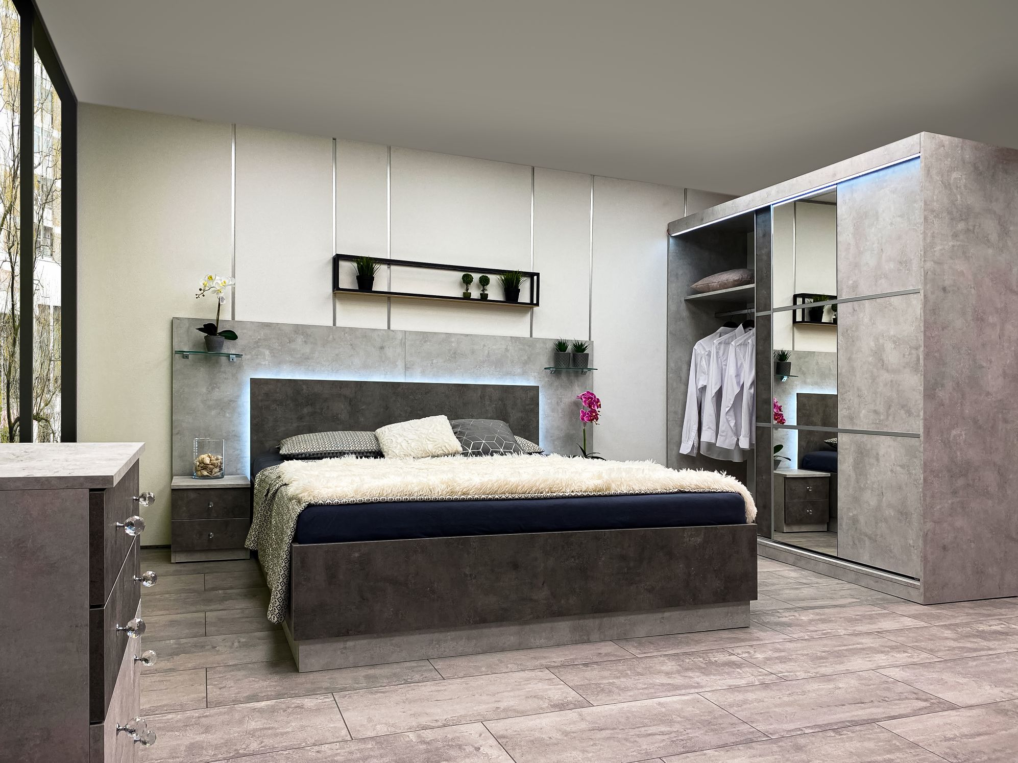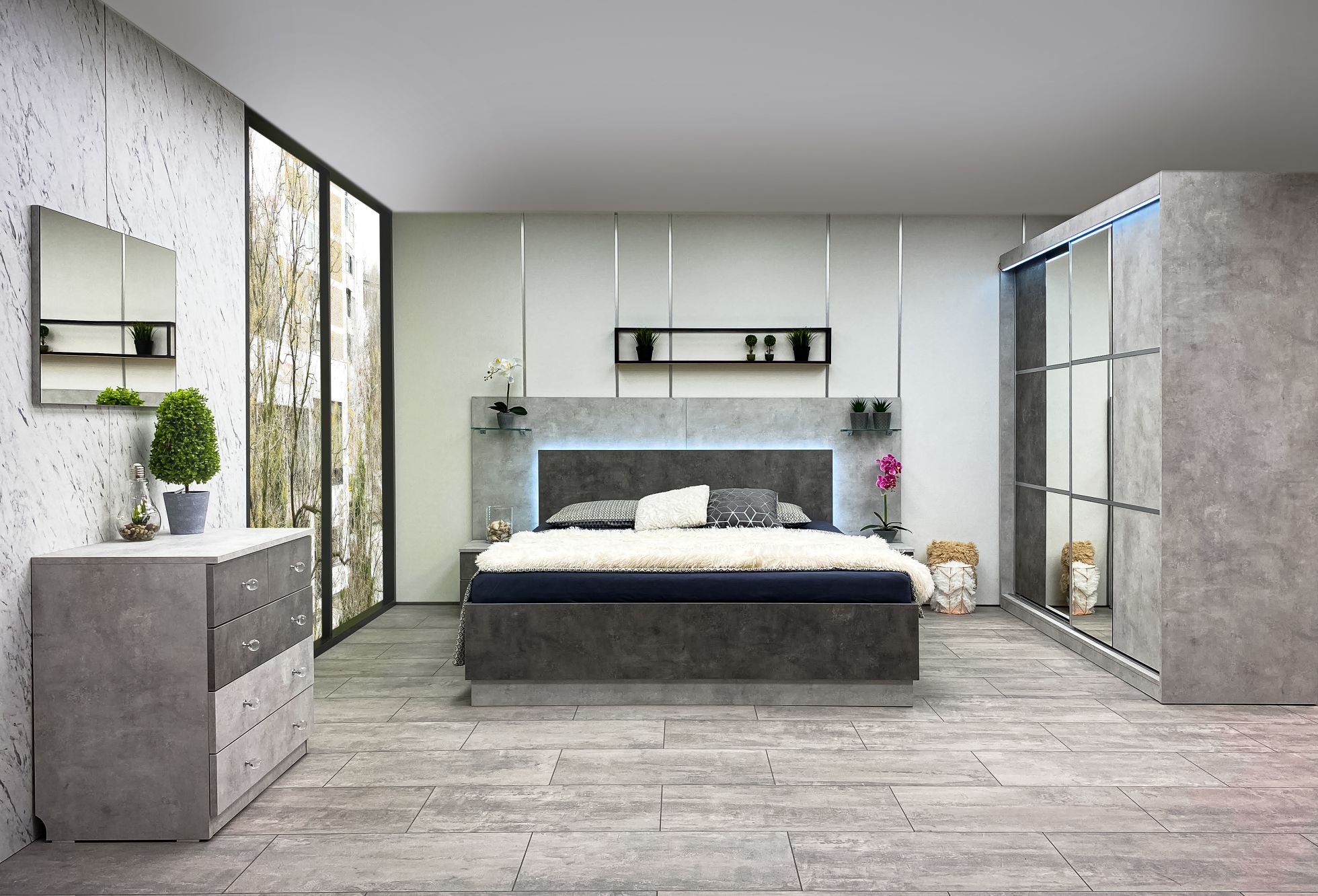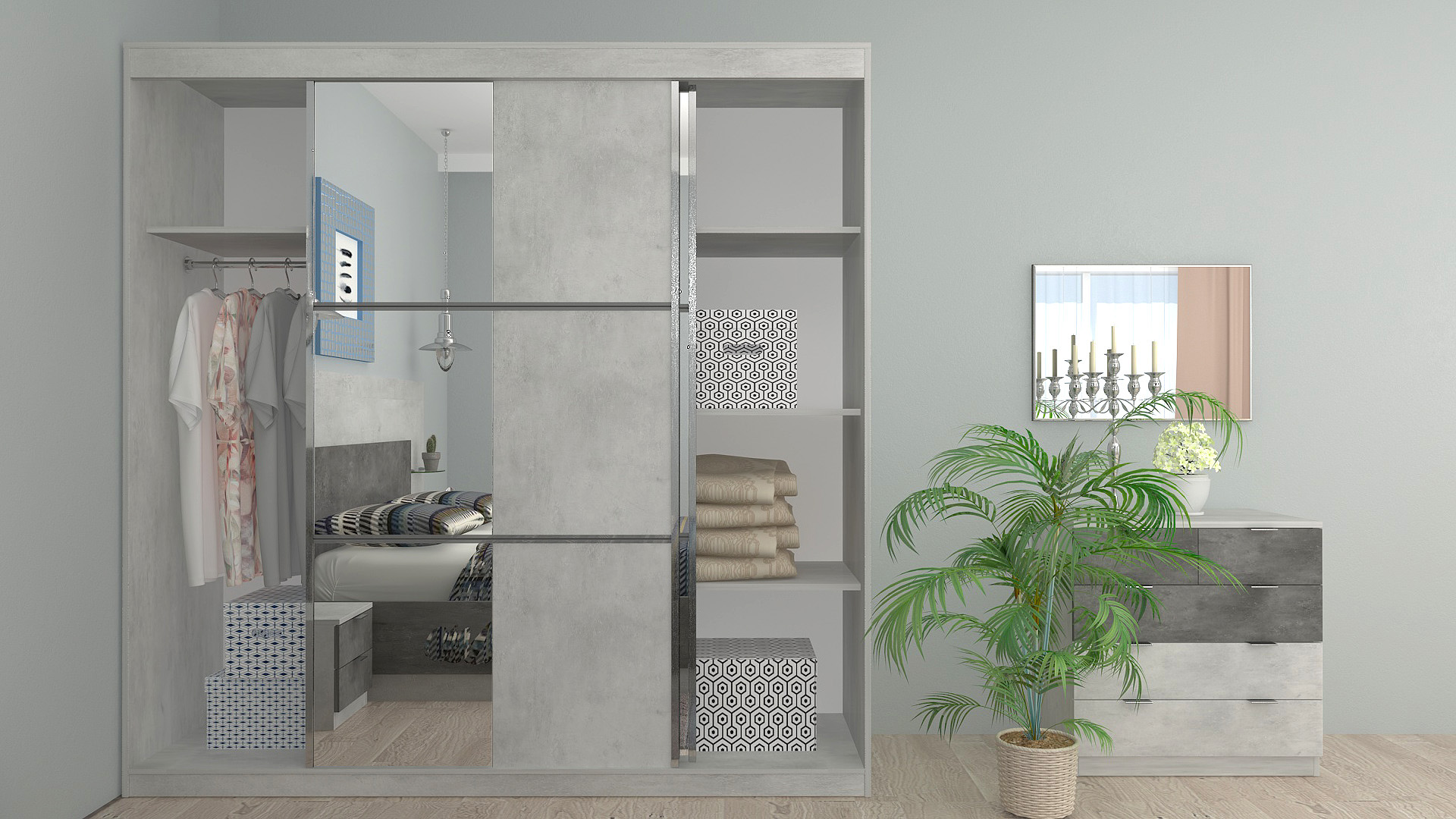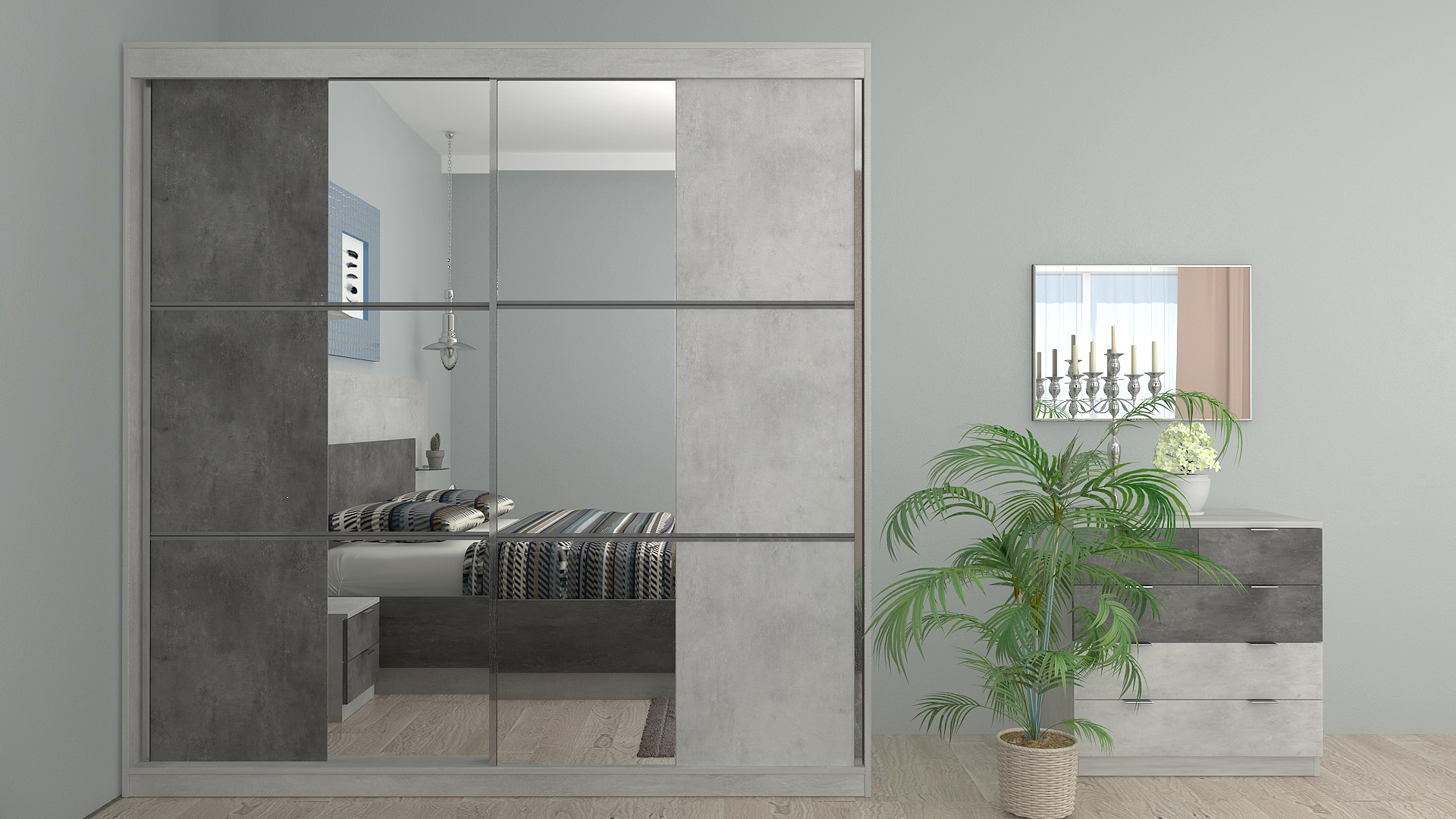 Гардероб: плъзгаща система вътрешно водене, вградено LED осветление по канта, вертикално разположени вградени алуминиеви „П“- образни кант дръжки с допълнително излят външен улей за лесно и удобно захващане, спомагащи ефективното плъзгане на системата – гарантиращи устойчивост и здравина на вратите, използвани са сглобки – скрит монтаж, метални рафтоносачи за стабилност на рафтовете, лост за дрехи – метален – форма – елипса – покритие – никел, цялата конструкция на гардероба е монтирана върху метални реглажни „пети“  – осигуряващи изрядна нивелация на изделието и правилната му експлоатация, вратите са изработени от пана декор тъмен и светъл бетон + вградени огледала  – 1 бр. в к-т;
