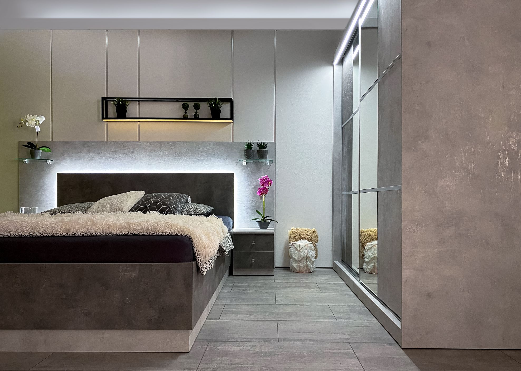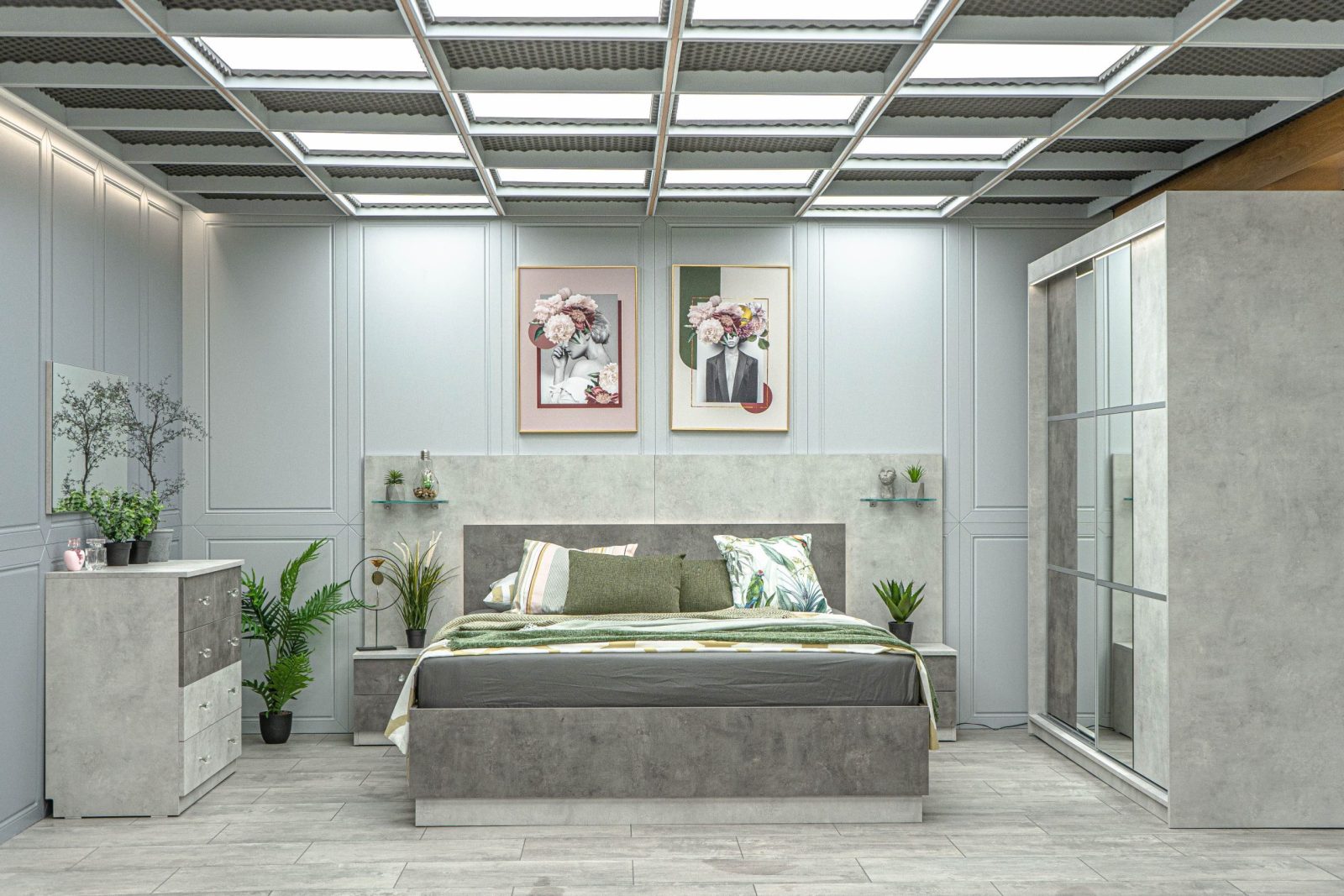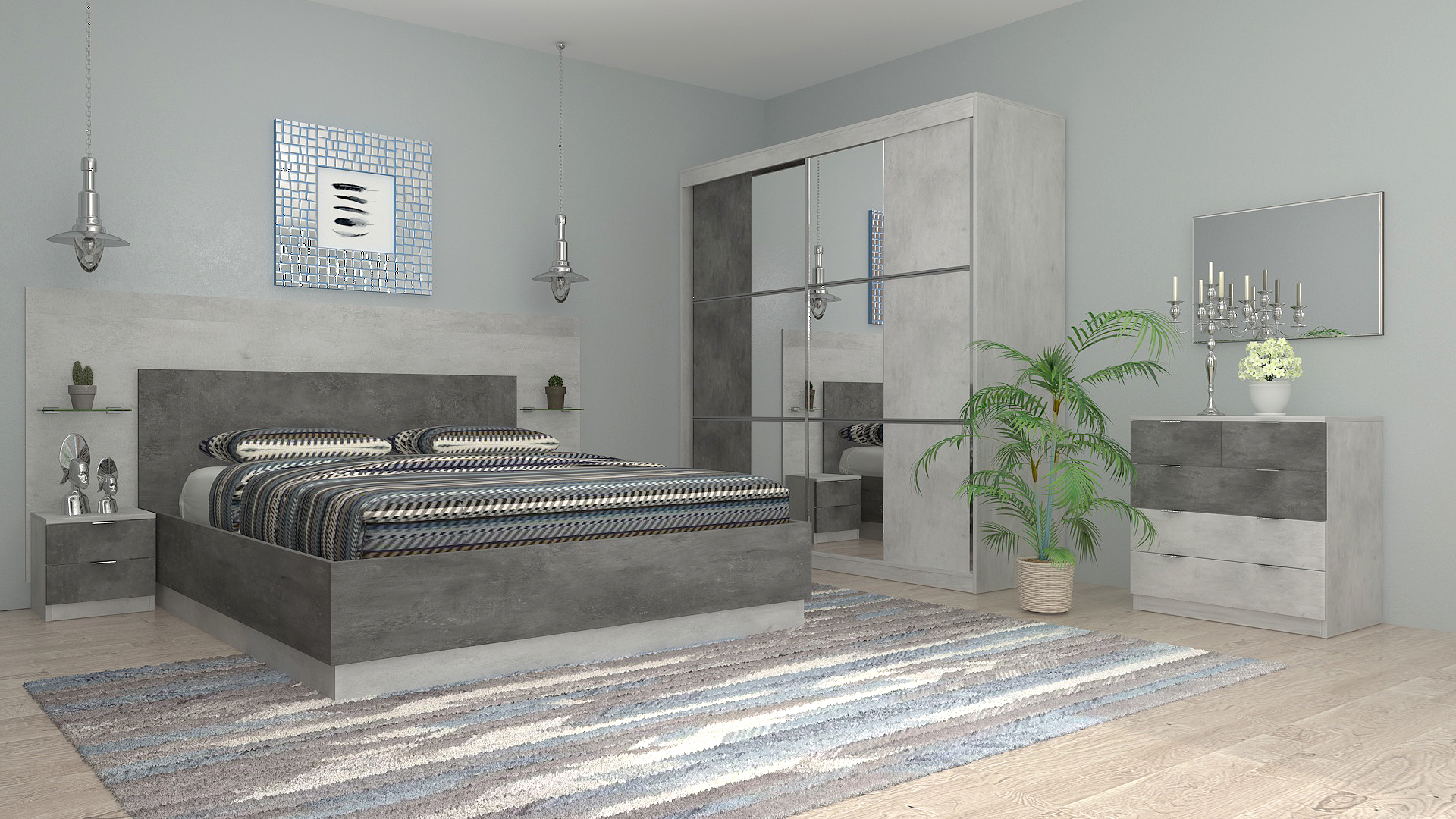 Гардероб: плъзгаща система вътрешно водене, вградено LED осветление по канта, вертикално разположени вградени алуминиеви „П“- образни кант дръжки с допълнително излят външен улей за лесно и удобно захващане, спомагащи ефективното плъзгане на системата – гарантиращи устойчивост и здравина на вратите, използвани са сглобки – скрит монтаж, метални рафтоносачи за стабилност на рафтовете, лост за дрехи – метален – форма – елипса – покритие – никел, цялата конструкция на гардероба е монтирана върху метални реглажни „пети“  – осигуряващи изрядна нивелация на изделието и правилната му експлоатация, вратите са изработени от пана декор тъмен и светъл бетон + вградени огледала  – 1 бр. в к-т;