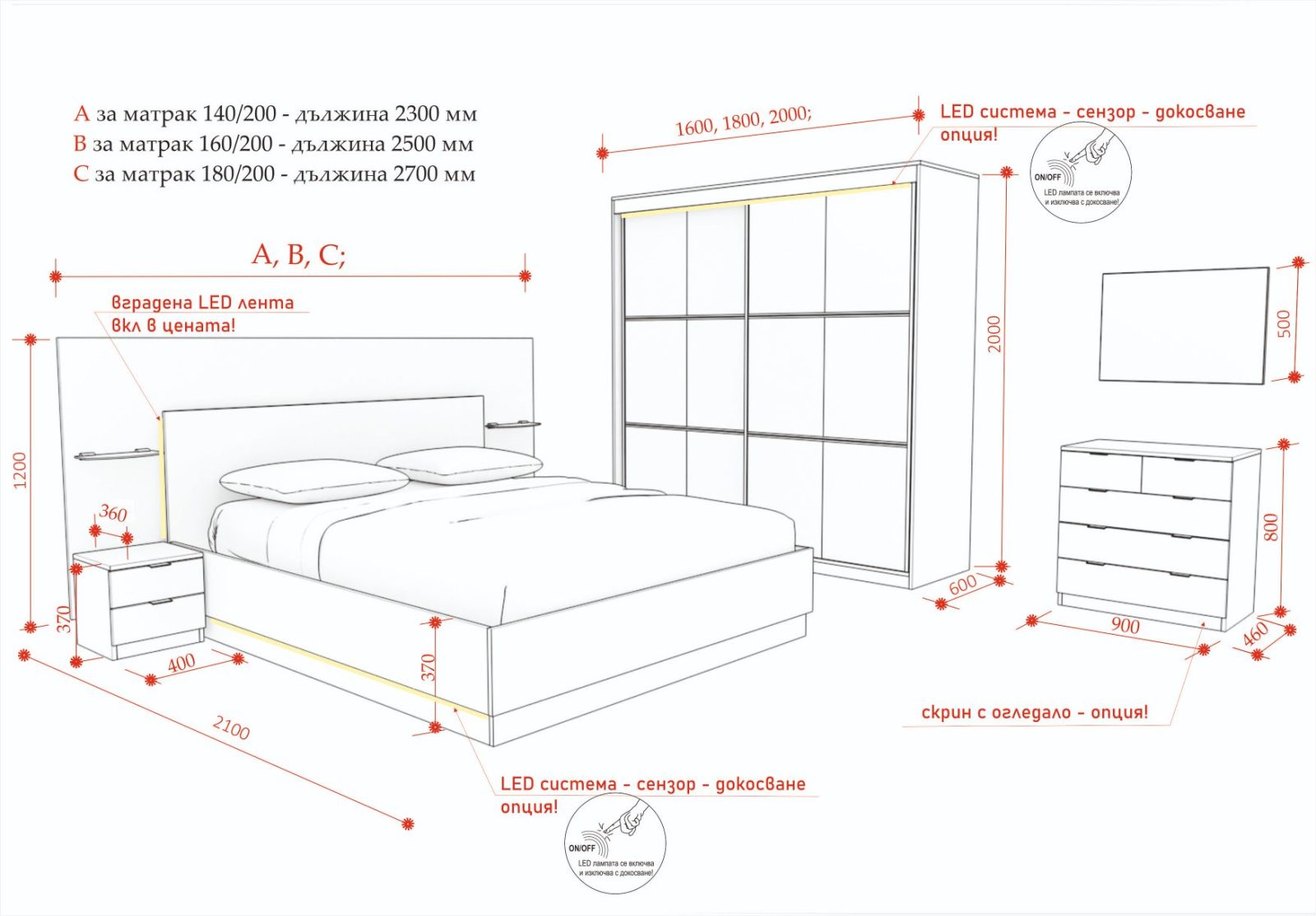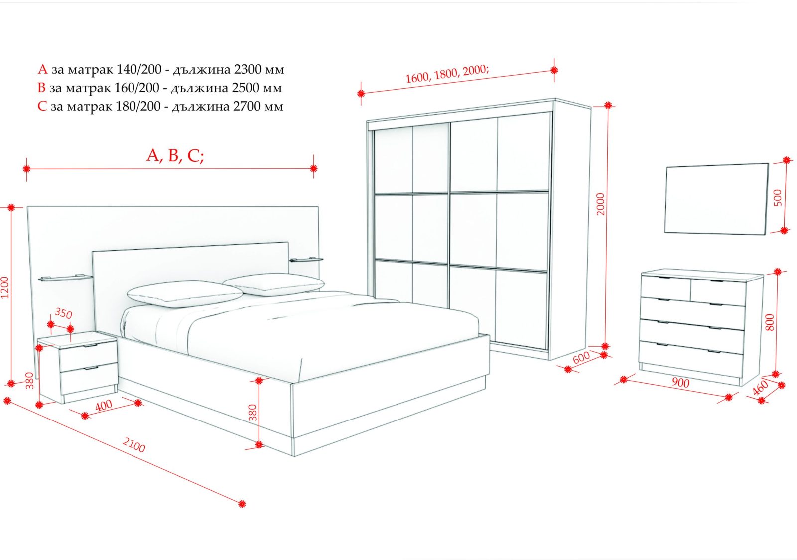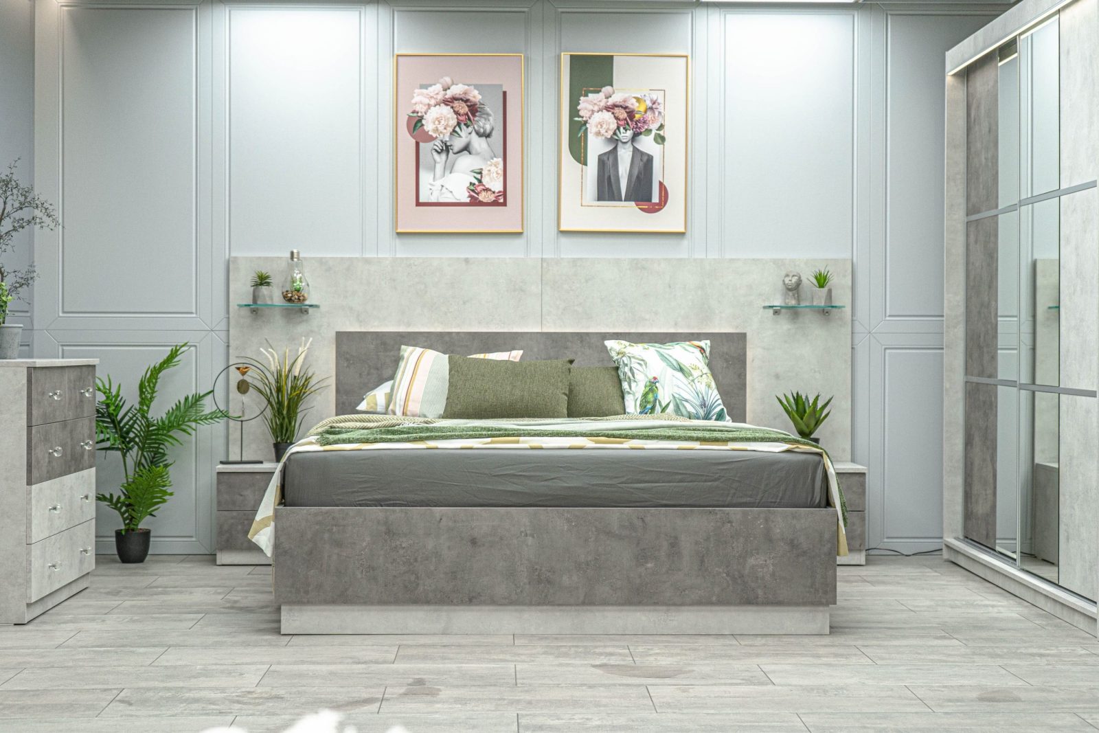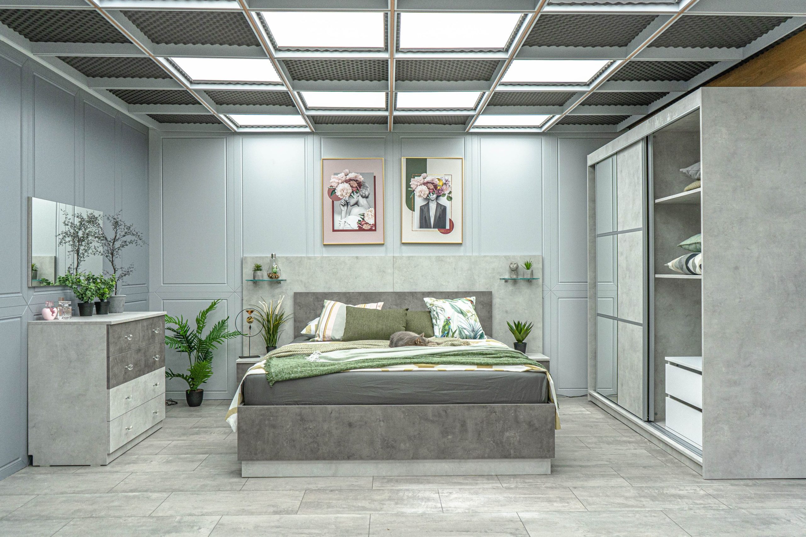 Гардероб: плъзгаща система вътрешно водене, вградено LED осветление по канта, вертикално разположени вградени алуминиеви „П“- образни кант дръжки с допълнително излят външен улей за лесно и удобно захващане, спомагащи ефективното плъзгане на системата – гарантиращи устойчивост и здравина на вратите, използвани са сглобки – скрит монтаж, метални рафтоносачи за стабилност на рафтовете, лост за дрехи – метален – форма – елипса – покритие – никел, цялата конструкция на гардероба е монтирана върху метални реглажни „пети“  – осигуряващи изрядна нивелация на изделието и правилната му експлоатация, вратите са изработени от пана декор тъмен и светъл бетон + вградени огледала  – 1 бр. в к-т;