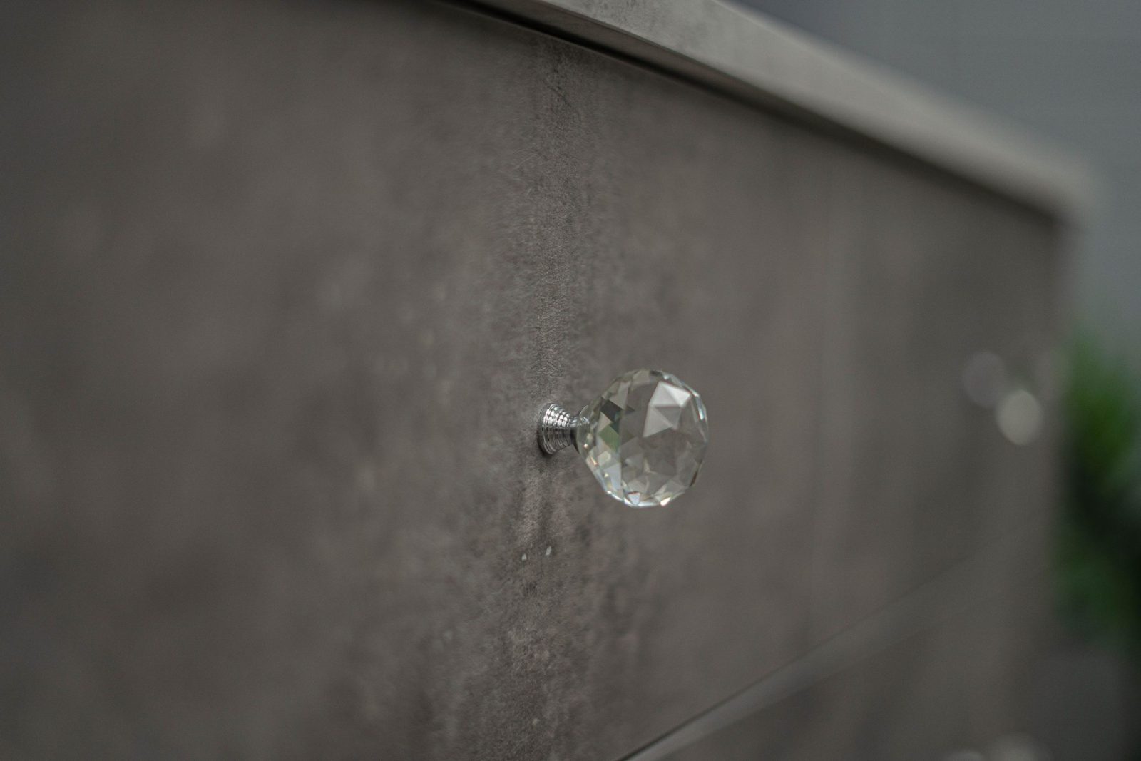 Скрин с огледало – Опция!  5 бр практични чекмеджета,  дръжки – полиран кристал – форма – сфера, система скрити водачи Quadro Hettich – плавно затваряне – води чекмеджетата копринено гладко и поема действащите от всички посоки външни сили, паното с огледало е с възможност за хоризонтален или вертикален монтаж.