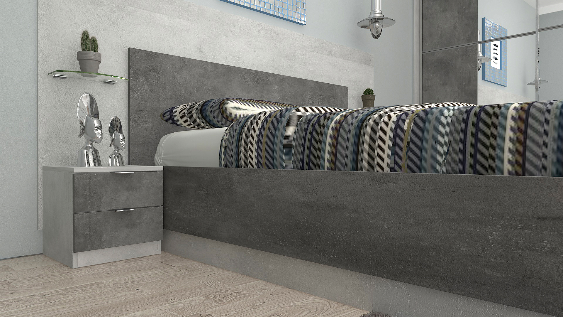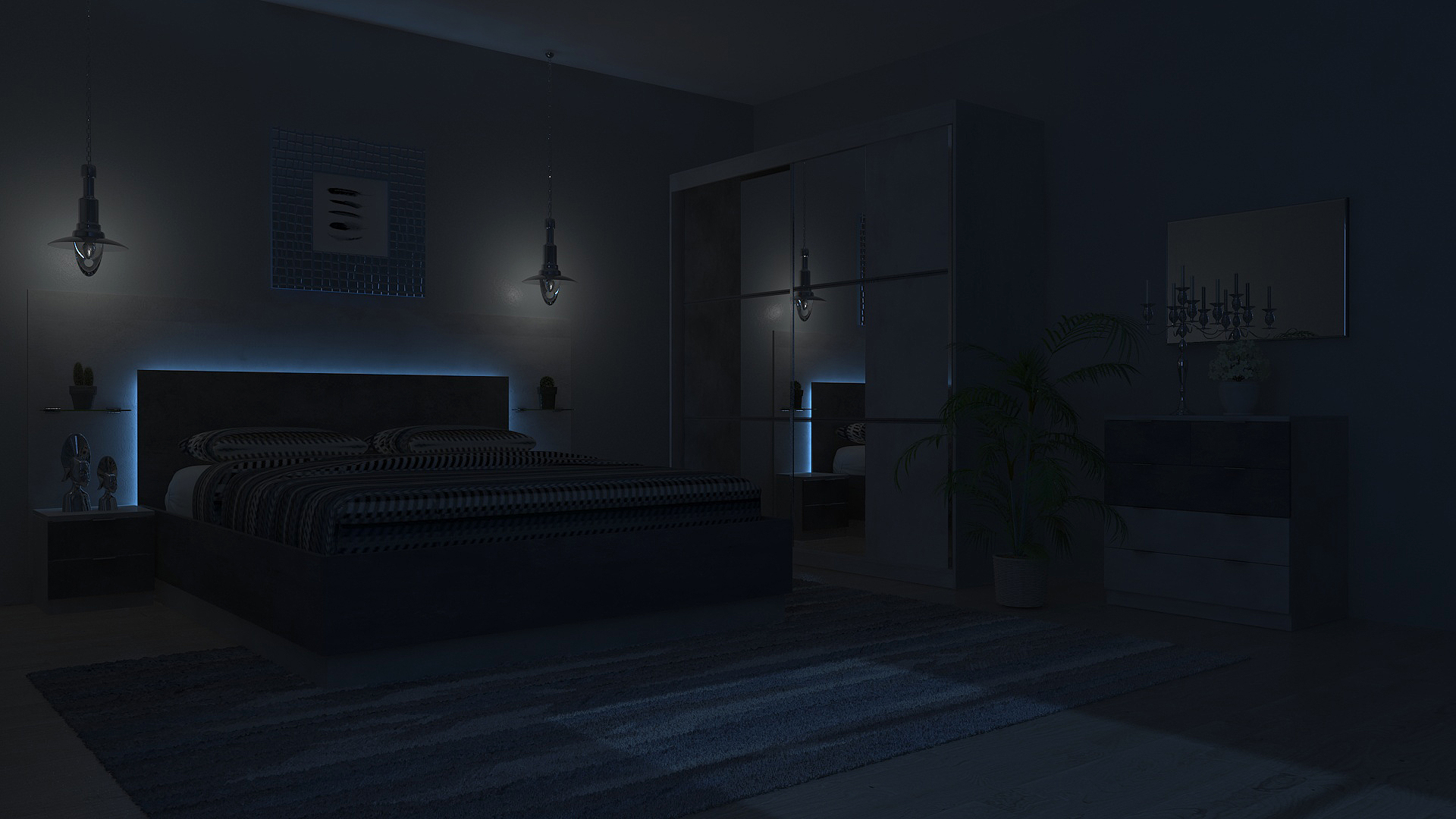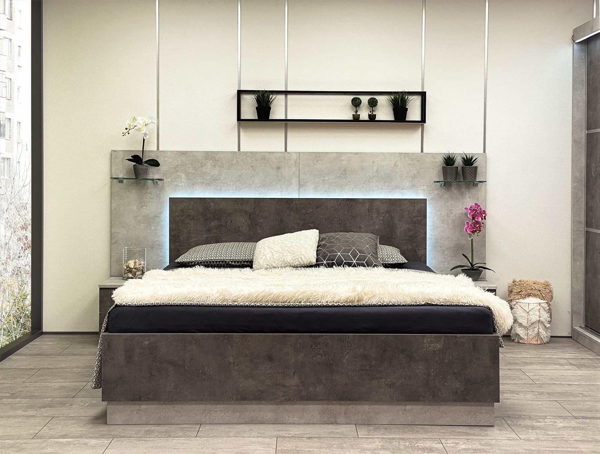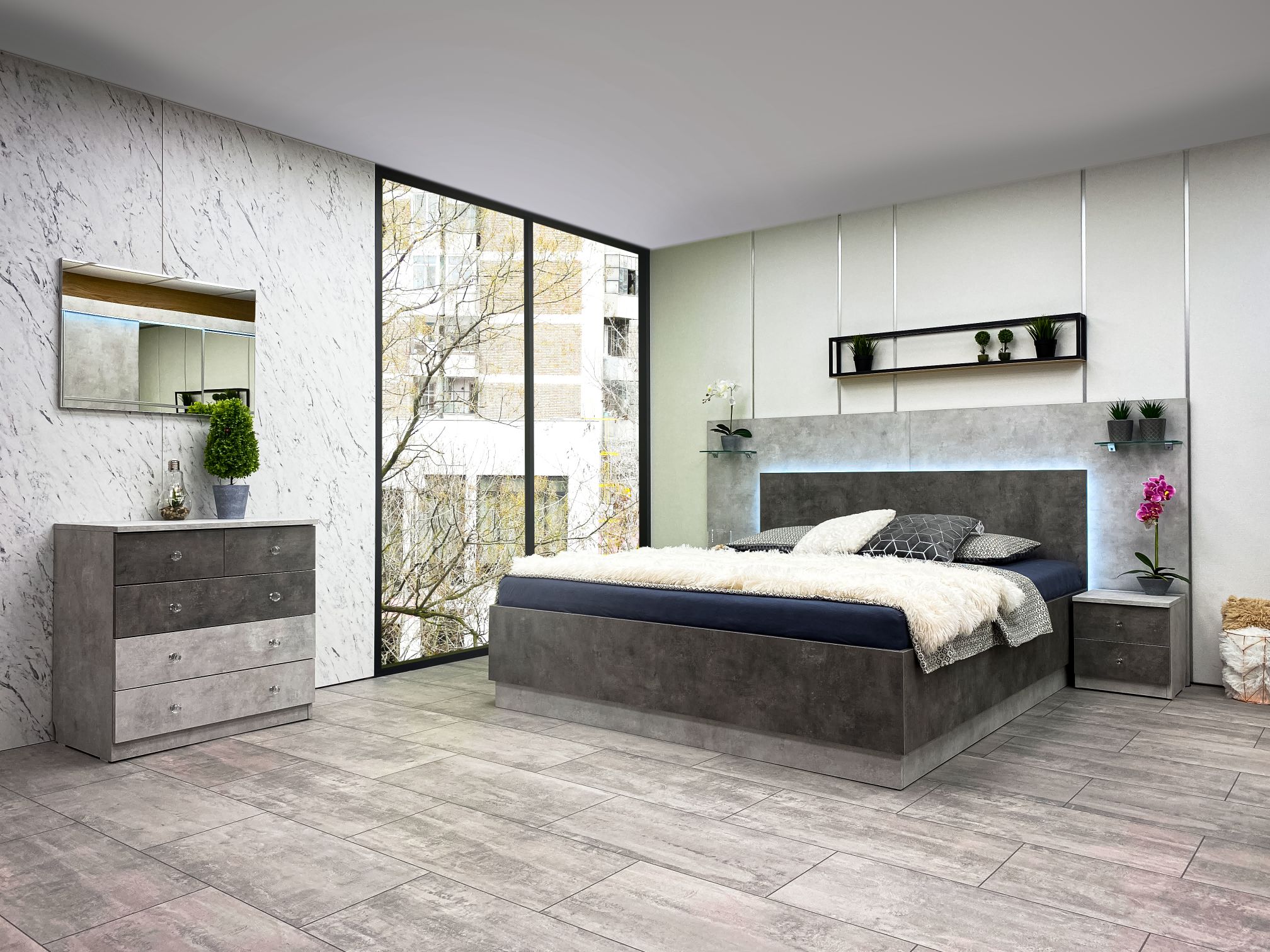 Легло: двойна табла  – основна – ПДЧ бетон- светъл, втора табла –  декор – бетон тъмен с вградено LED осветление по канта, режим на работа –  дистанционно с опция за регулиране силата на светлина,  база за матрак с вътрешна вертикална бленда  – гарантираща прав диагонал на леглото. Всички използвани сглобки са метални – скрит монтаж. Всички царги са сдвоени с обща дебелина 36 мм. Включени дъно и механизъм.