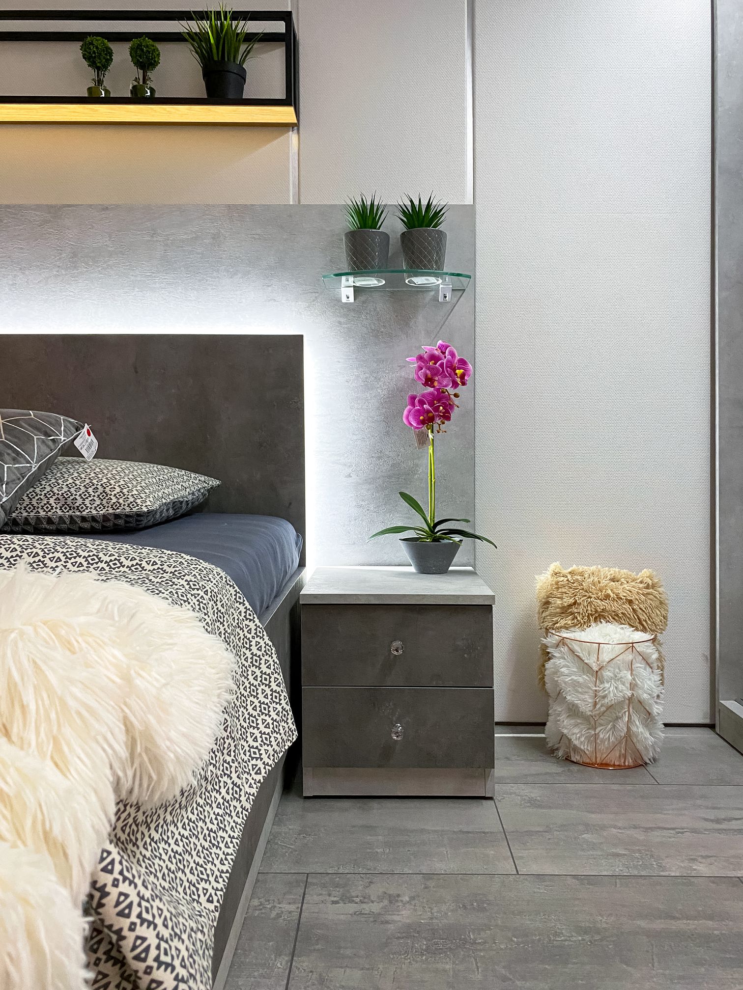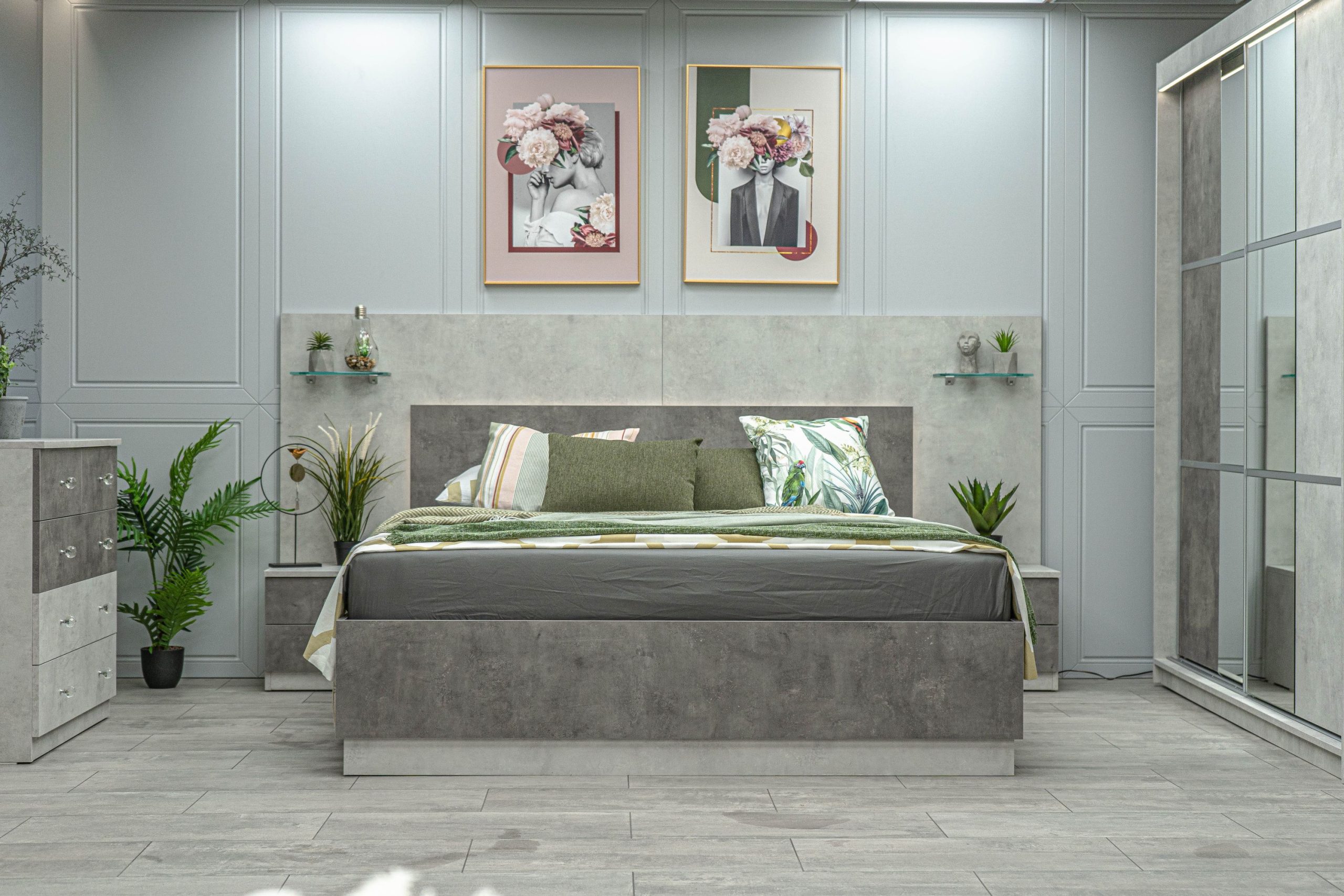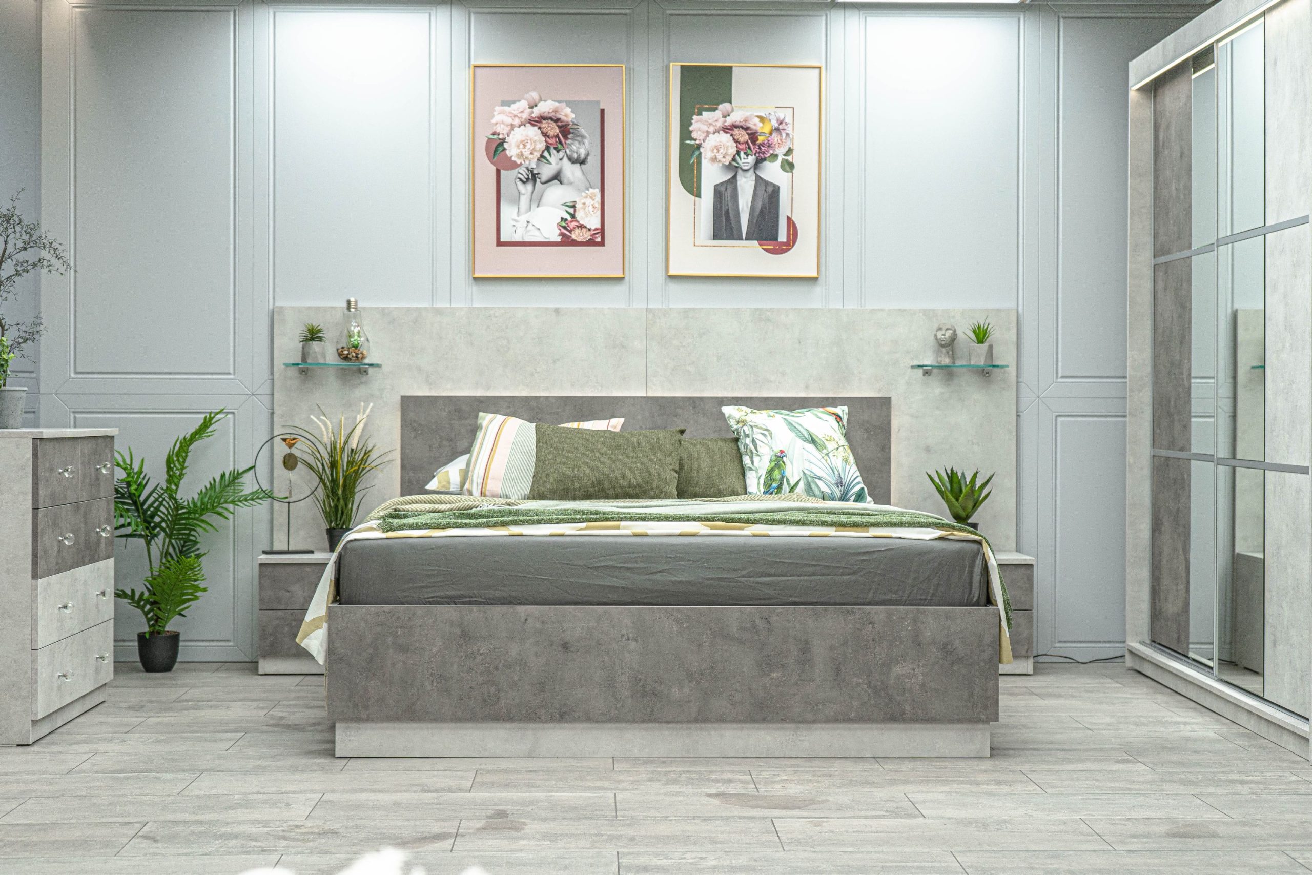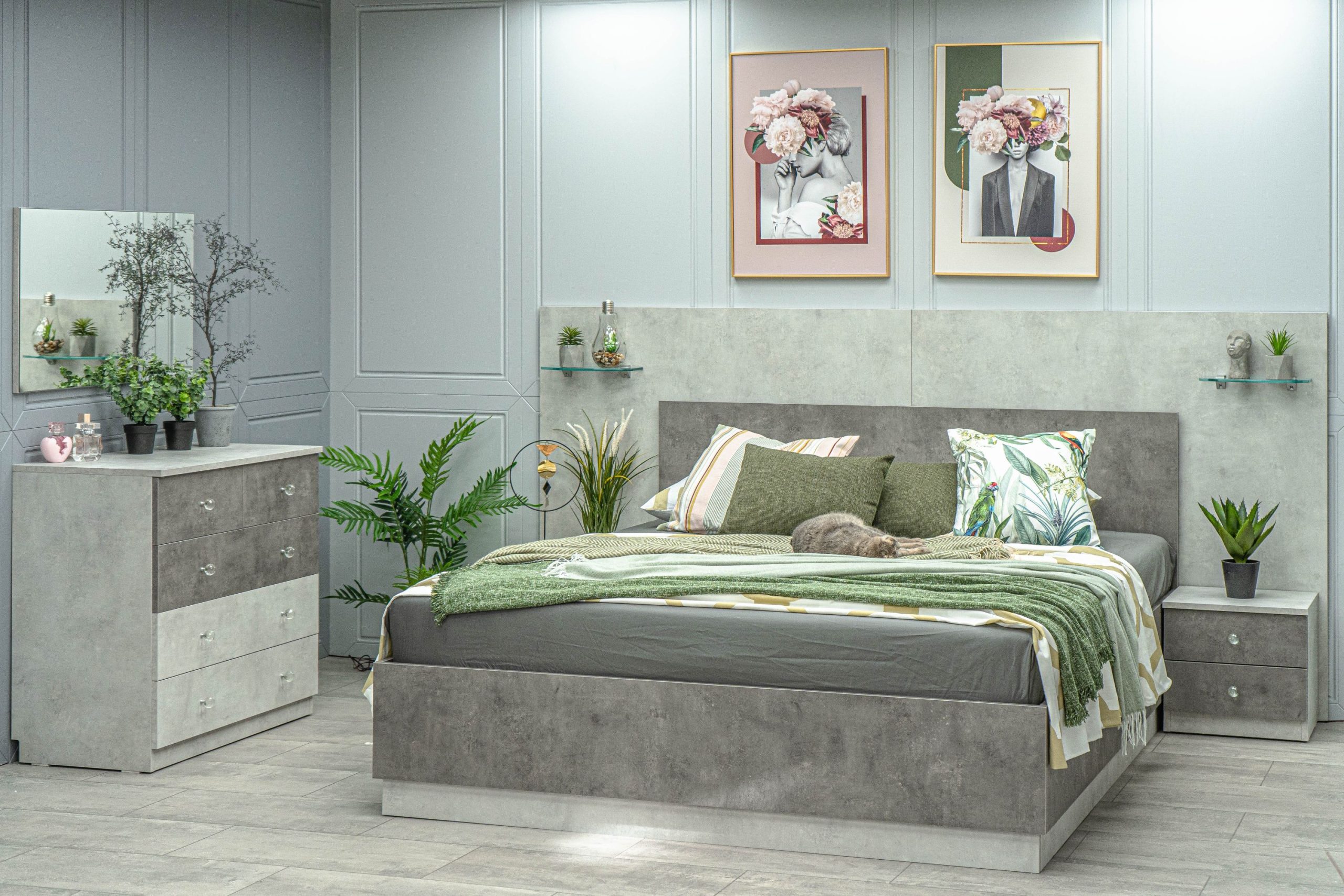 Легло: двойна табла  – основна – ПДЧ бетон- светъл, втора табла –  декор – бетон тъмен с вградено LED осветление по канта, режим на работа –  дистанционно с опция за регулиране силата на светлина,  база за матрак с вътрешна вертикална бленда  – гарантираща прав диагонал на леглото. Всички използвани сглобки са метални – скрит монтаж. Всички царги са сдвоени с обща дебелина 36 мм. Включени дъно и механизъм.