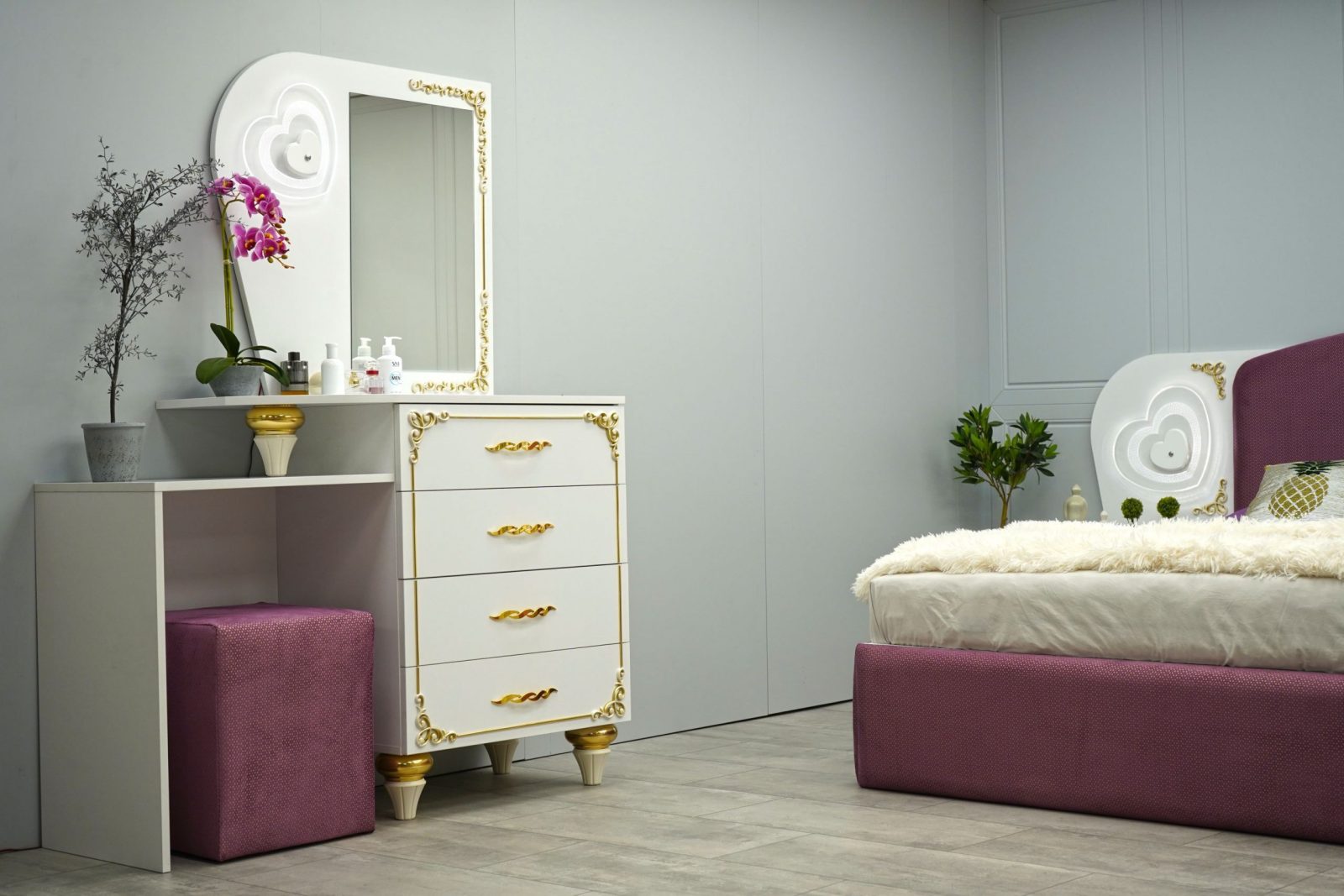 Тоалетка + пано с огледало: четири практични чекмеджета дръжки с форма дъга, покритие – злато, ажурни златни елементи в ъглите на изделието, вградено LED осветлени със дензор за допир контрол; повдигнати на крака в бяло и златно, метални ролкови водачи, пано с огледало позиционирано за стенен монтаж – 1 бр. в к-т;