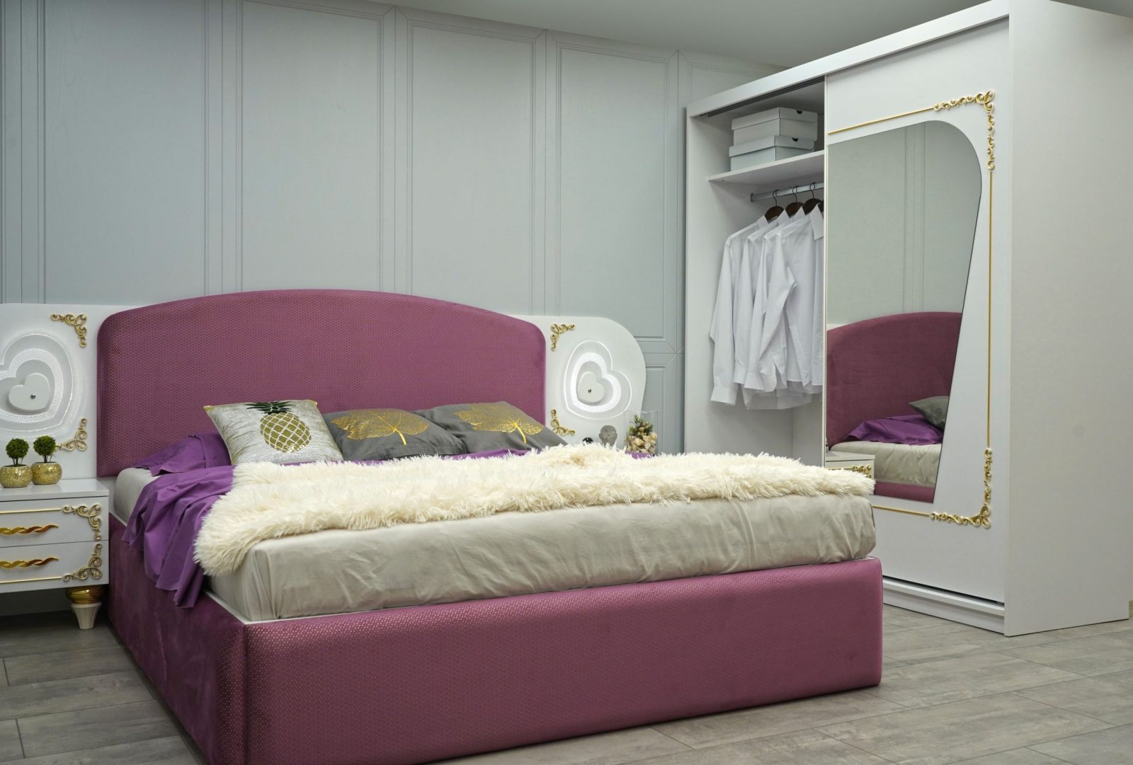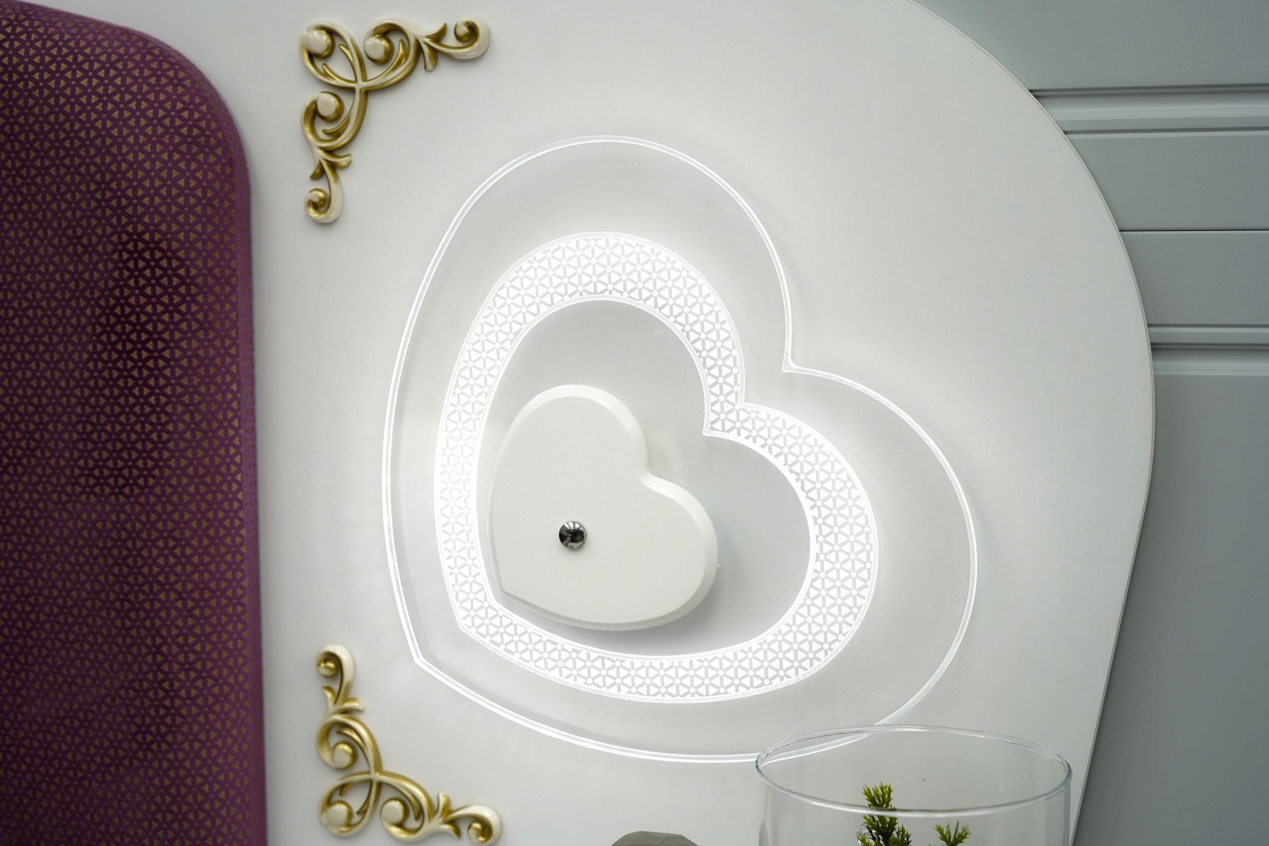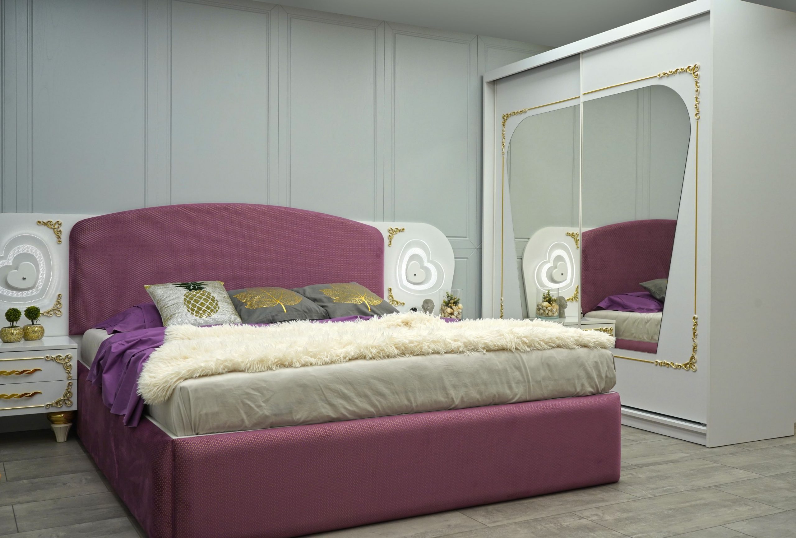 Легло: основна табла с вградено LED осветление – форма сърце, което ни оставя с усещането за красива дантела, през която светлината рисува причудливи форми, вградената елегантна тапицирана табла от високоизносовоустойчив плюш – подчертано от леки златисти орнаменти, придаващо усещане за уют и мекота, базата за матрак е с вграден вътрешен мост гарантиращ прав диагонал на матрака, елегантни тапицирани пана по всички царги – без външен ръб, паната лесно се откачат и претапицират при нужда. Всички използвани сглобки са метални – скрит монтаж – осигуряващи идеален външен вид на изделието. Леглото е изработено за матрак с размер 160/200 см;