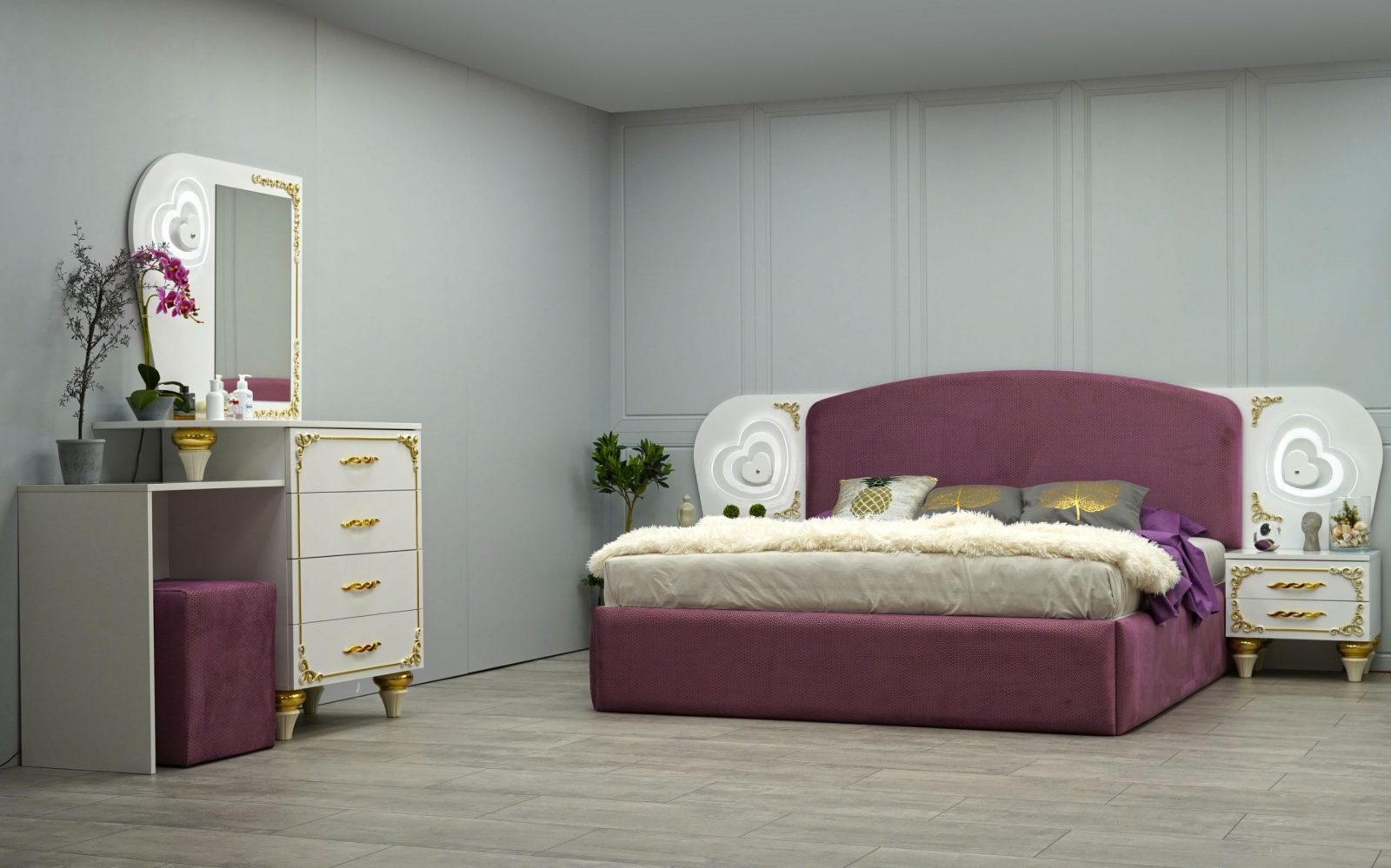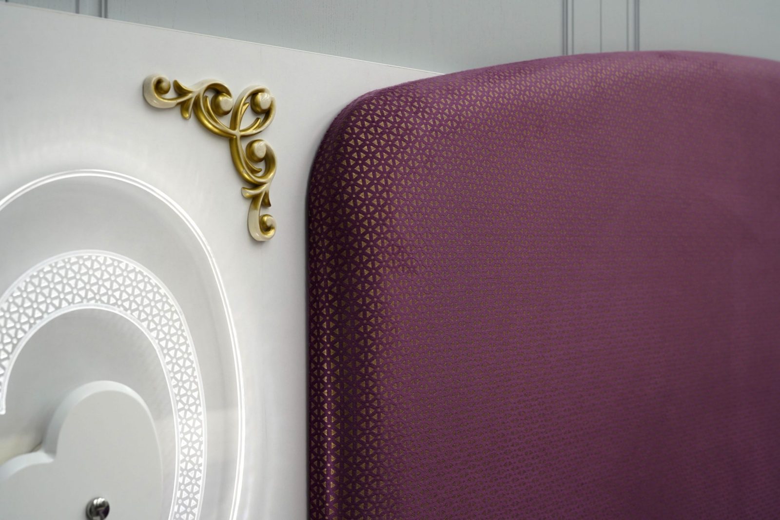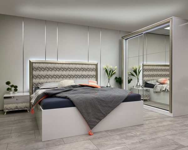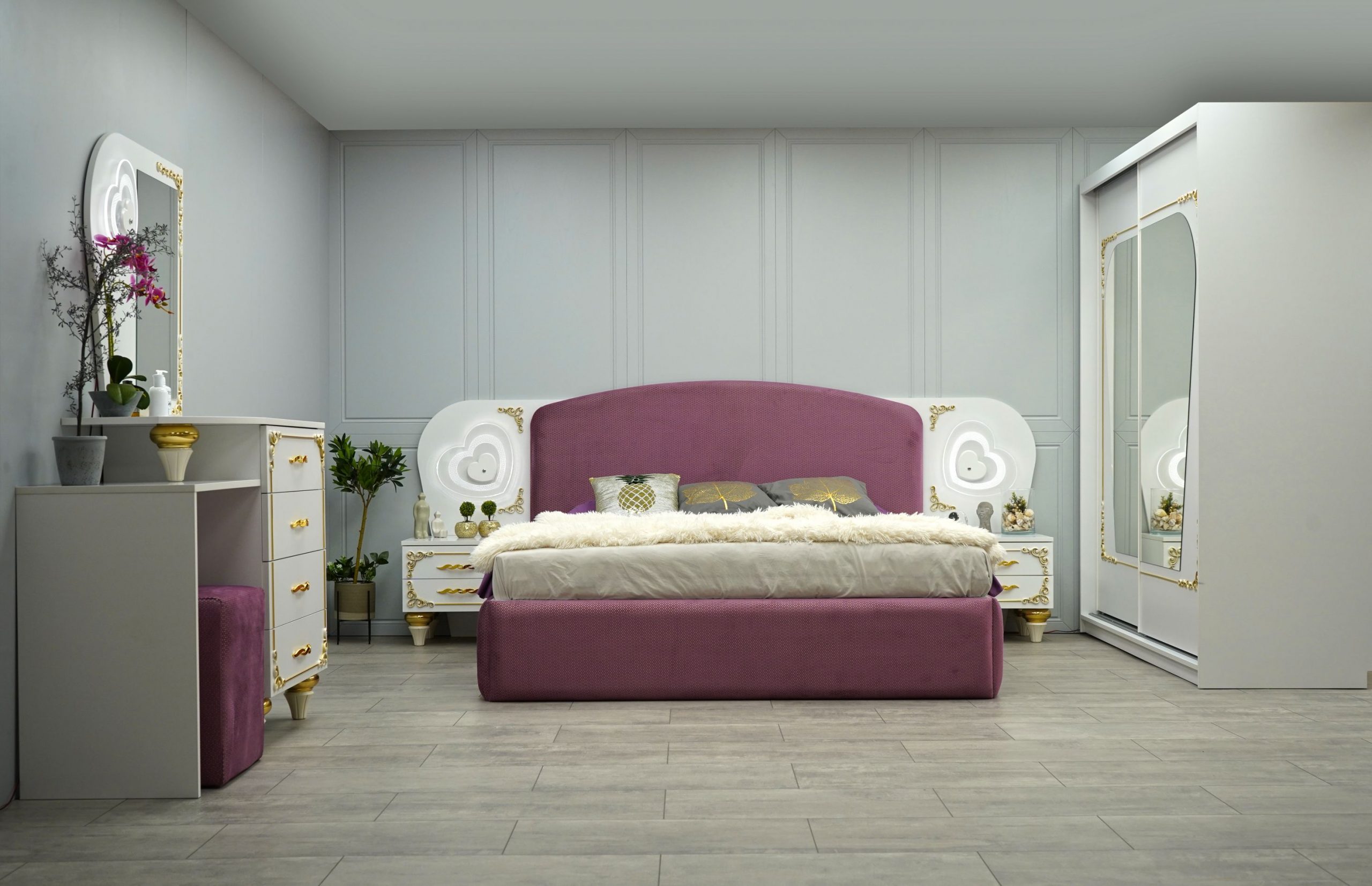 Легло: основна табла с вградено LED осветление – форма сърце, което ни оставя с усещането за красива дантела, през която светлината рисува причудливи форми, вградената елегантна тапицирана табла от високоизносовоустойчив плюш – подчертано от леки златисти орнаменти, придаващо усещане за уют и мекота, базата за матрак е с вграден вътрешен мост гарантиращ прав диагонал на матрака, елегантни тапицирани пана по всички царги – без външен ръб, паната лесно се откачат и претапицират при нужда. Всички използвани сглобки са метални – скрит монтаж – осигуряващи идеален външен вид на изделието. Леглото е изработено за матрак с размер 160/200 см;