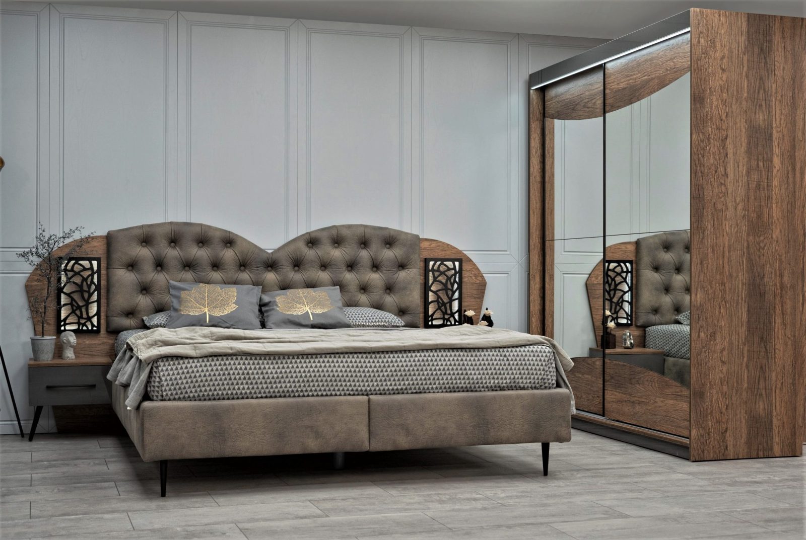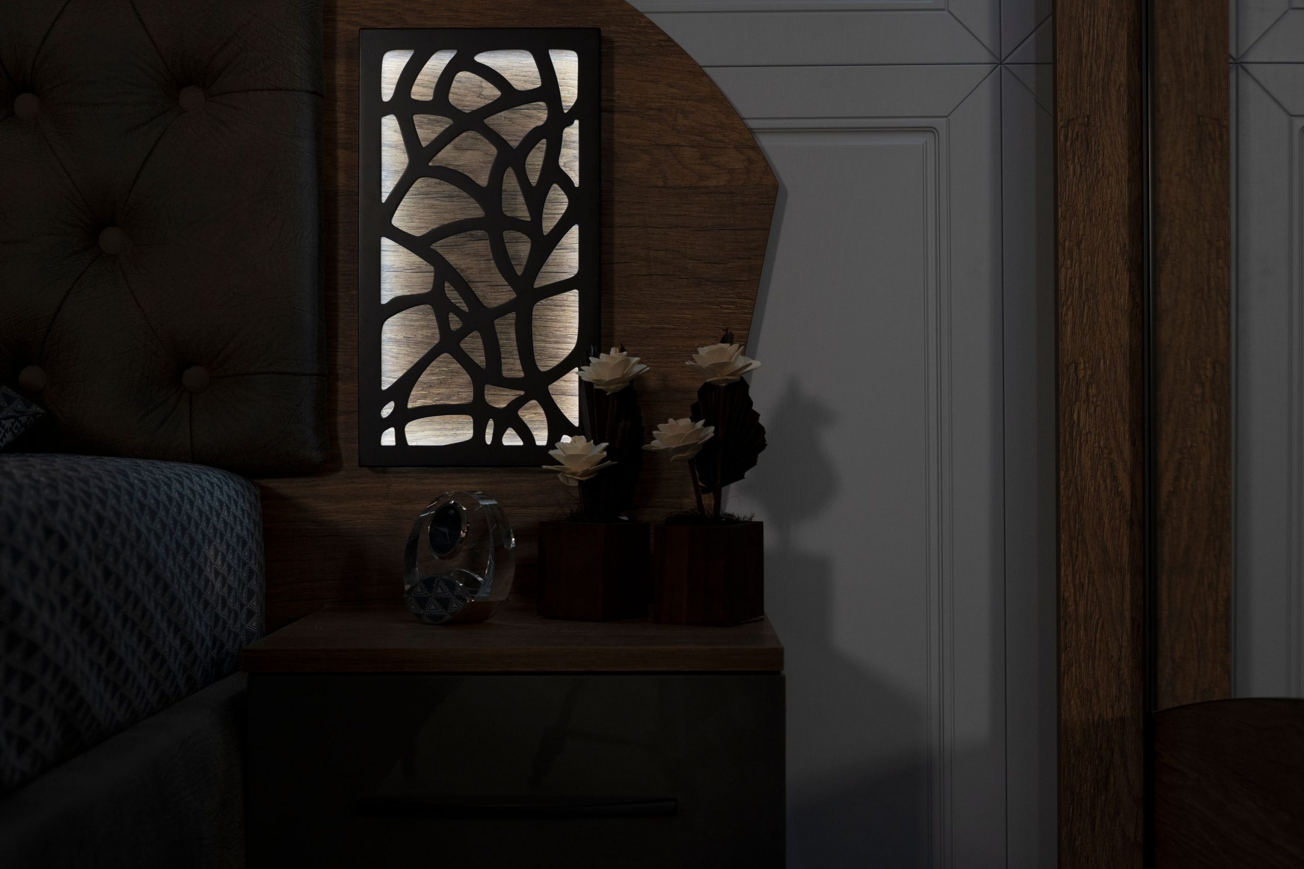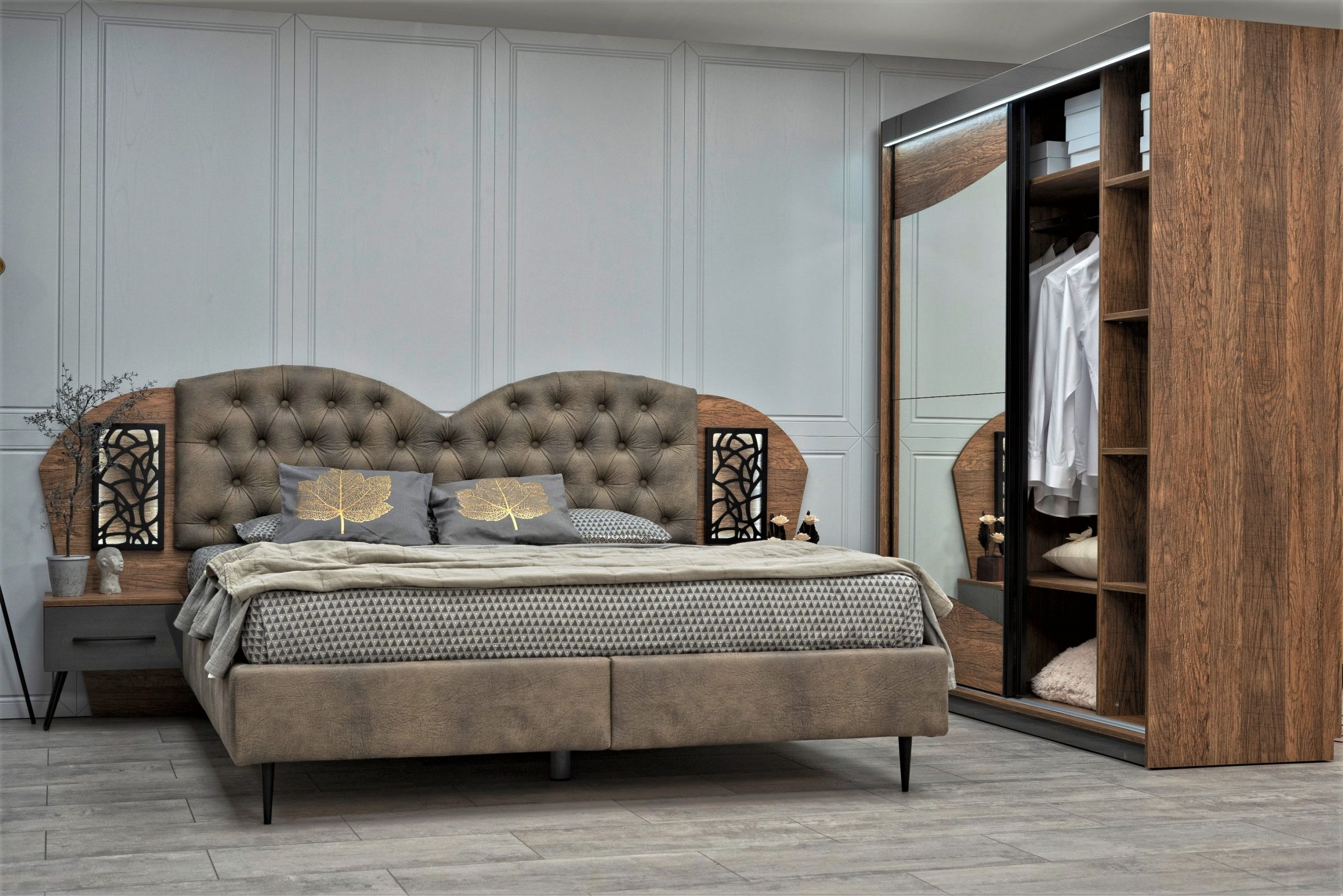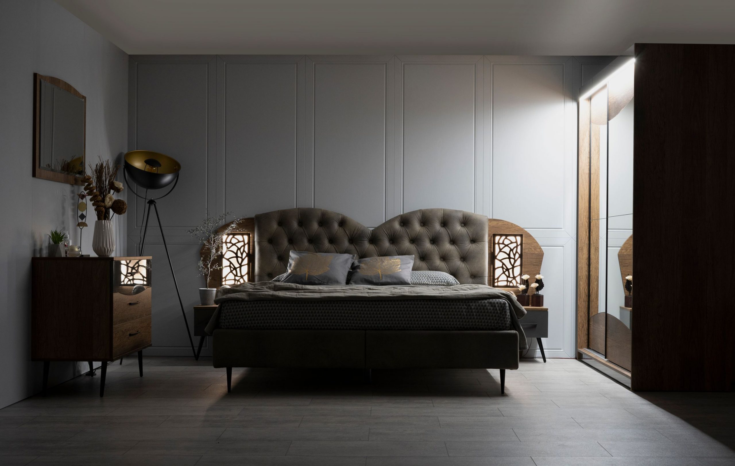 Легло: основна табла с вградено LED осветление, което ни оставя с усещането за красива дантела, през която светлината рисува причудливи форми – начин на работа – сензор за допир, елегантна тапицирана табла от високоизносовоустойчива дамаска – ръчен капитонаж – подчертан от тапицираните копчета придава усещане за уют и мекота, базата за матрак е с вграден вътрешен мост гарантиращ прав диагонал на матрака, конструкцията е повдигната на метални коносовидни крака – прахово боядисани – черен мат. Всички използвани сглобки са метални – скрит монтаж – осигуряващи идеален външен вид на изделието. Базата е изработена от 18 мм ПДЧ включително и дъното. Всички царги на леглото са сдвоени – въртешни ПДЧ, външна – тапицирана.