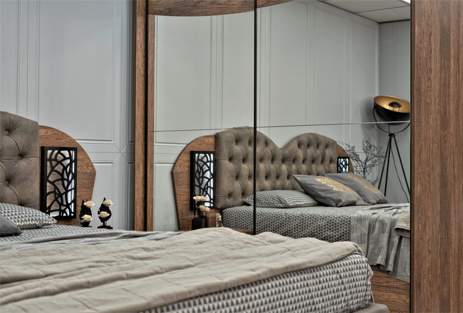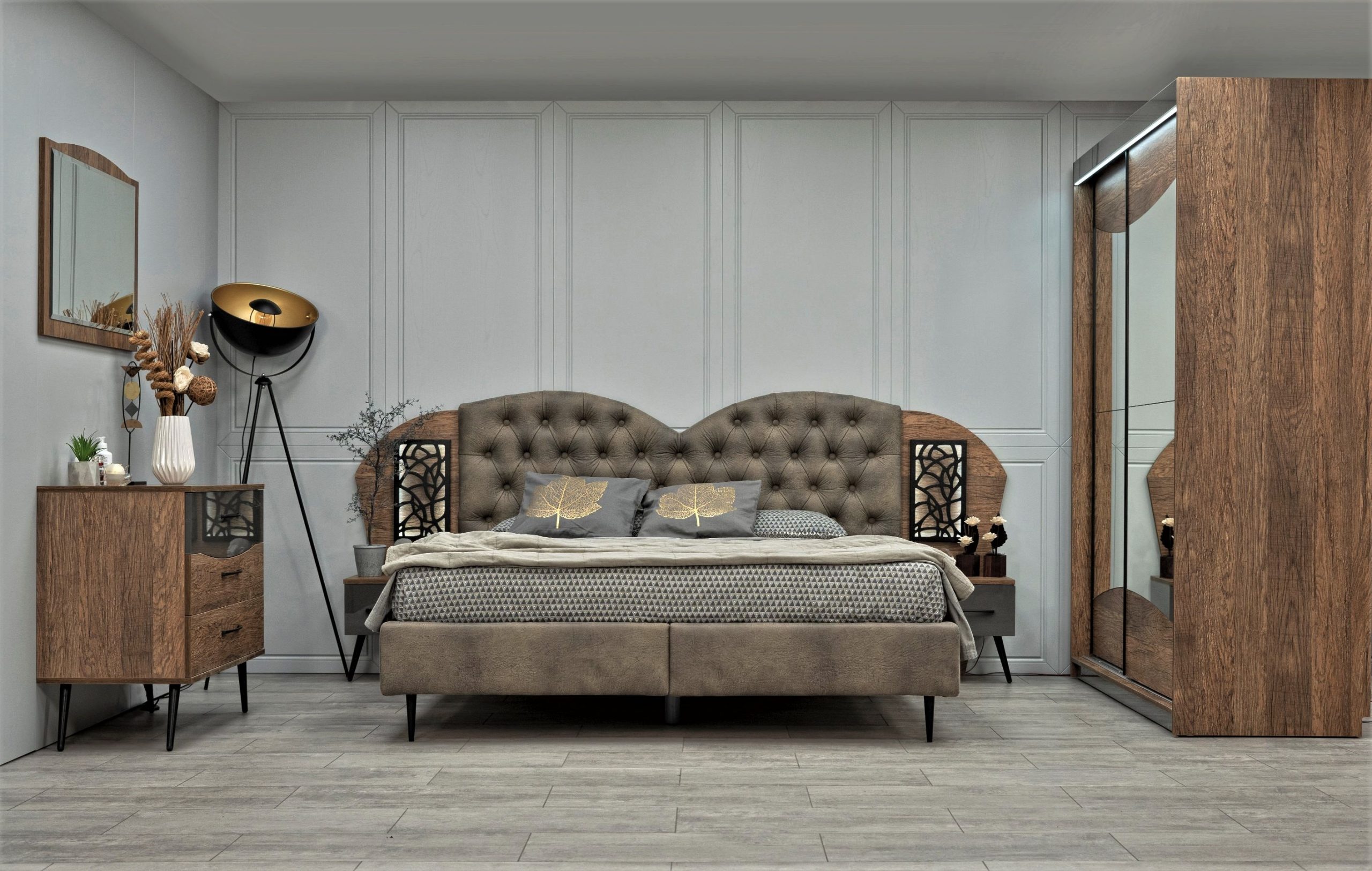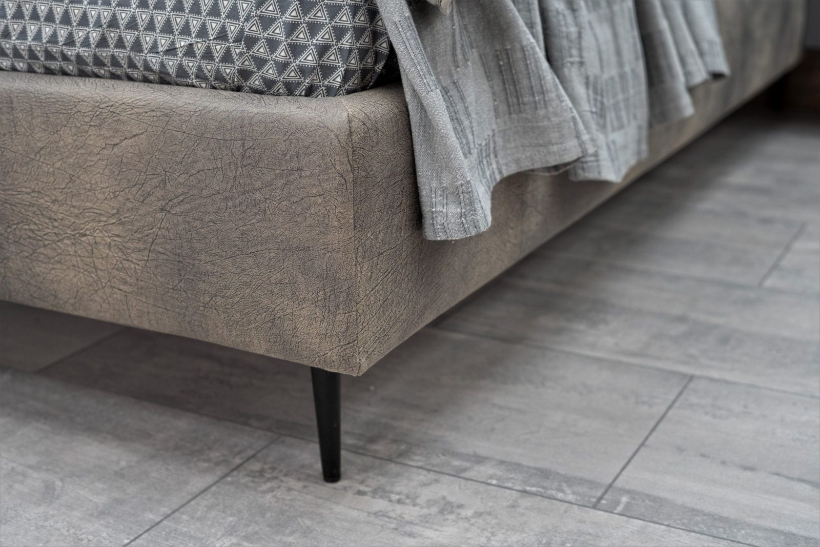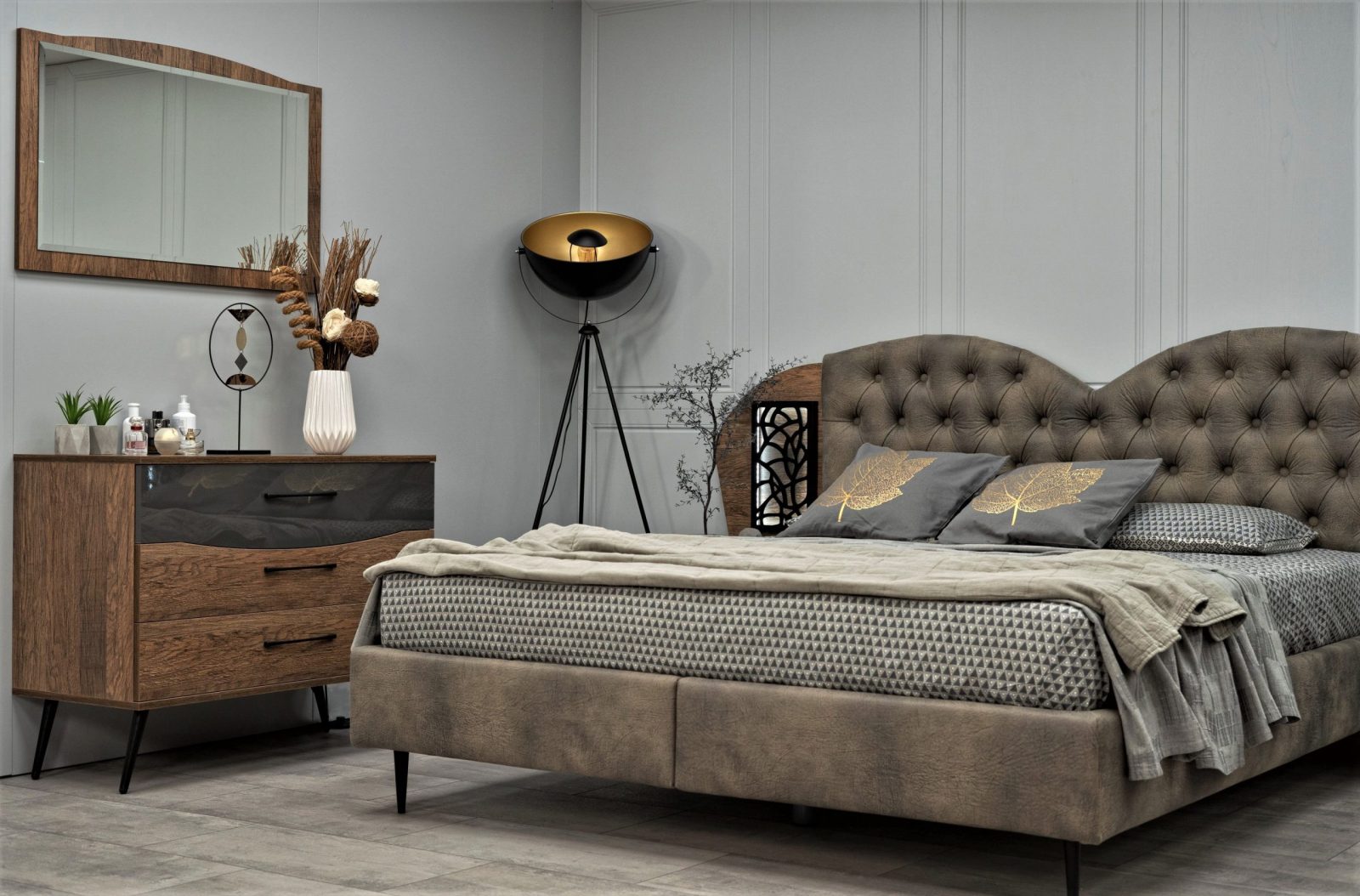 Легло: основна табла с вградено LED осветление, което ни оставя с усещането за красива дантела, през която светлината рисува причудливи форми – начин на работа – сензор за допир, елегантна тапицирана табла от високоизносовоустойчива дамаска – ръчен капитонаж – подчертан от тапицираните копчета придава усещане за уют и мекота, базата за матрак е с вграден вътрешен мост гарантиращ прав диагонал на матрака, конструкцията е повдигната на метални коносовидни крака – прахово боядисани – черен мат. Всички използвани сглобки са метални – скрит монтаж – осигуряващи идеален външен вид на изделието. Базата е изработена от 18 мм ПДЧ включително и дъното. Всички царги на леглото са сдвоени – въртешни ПДЧ, външна – тапицирана.