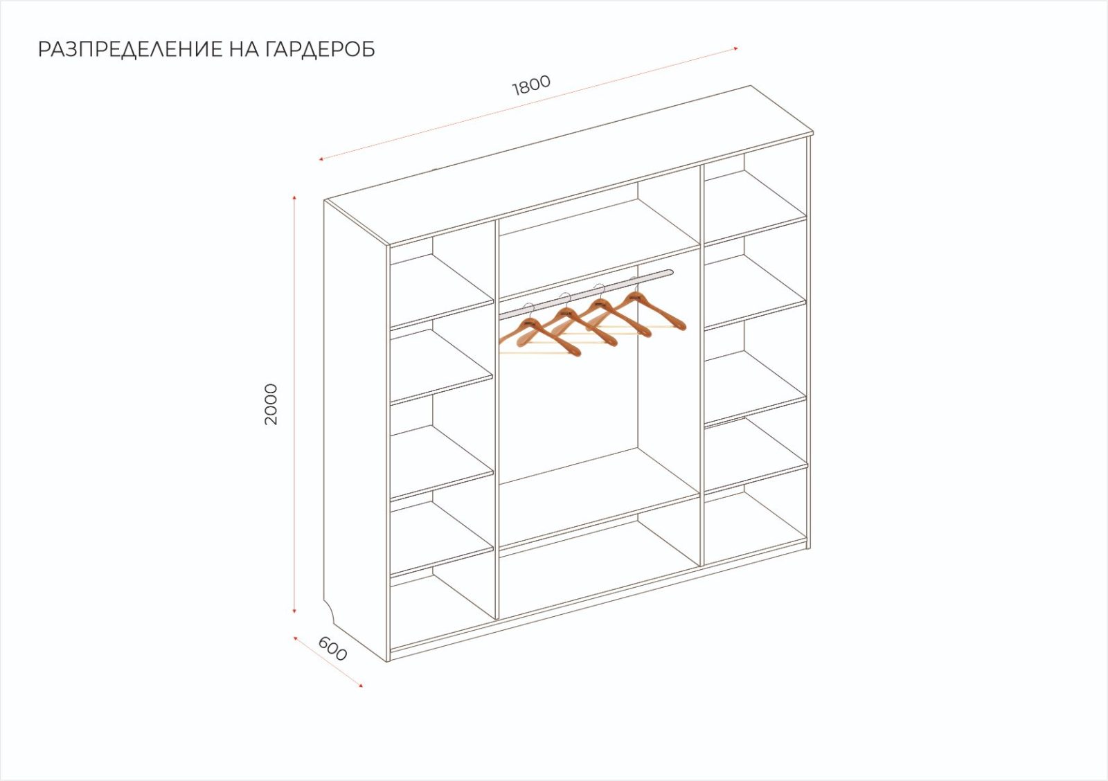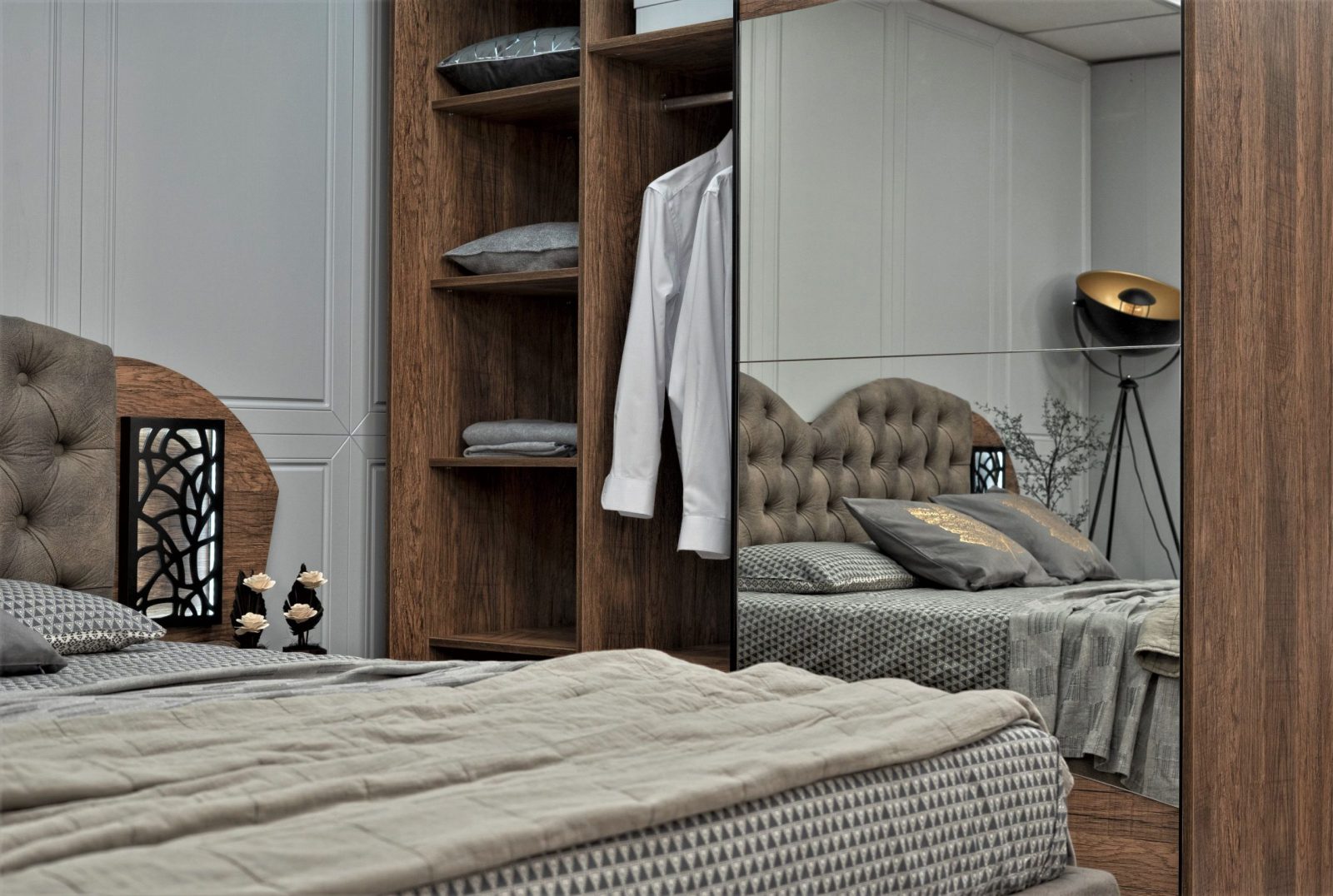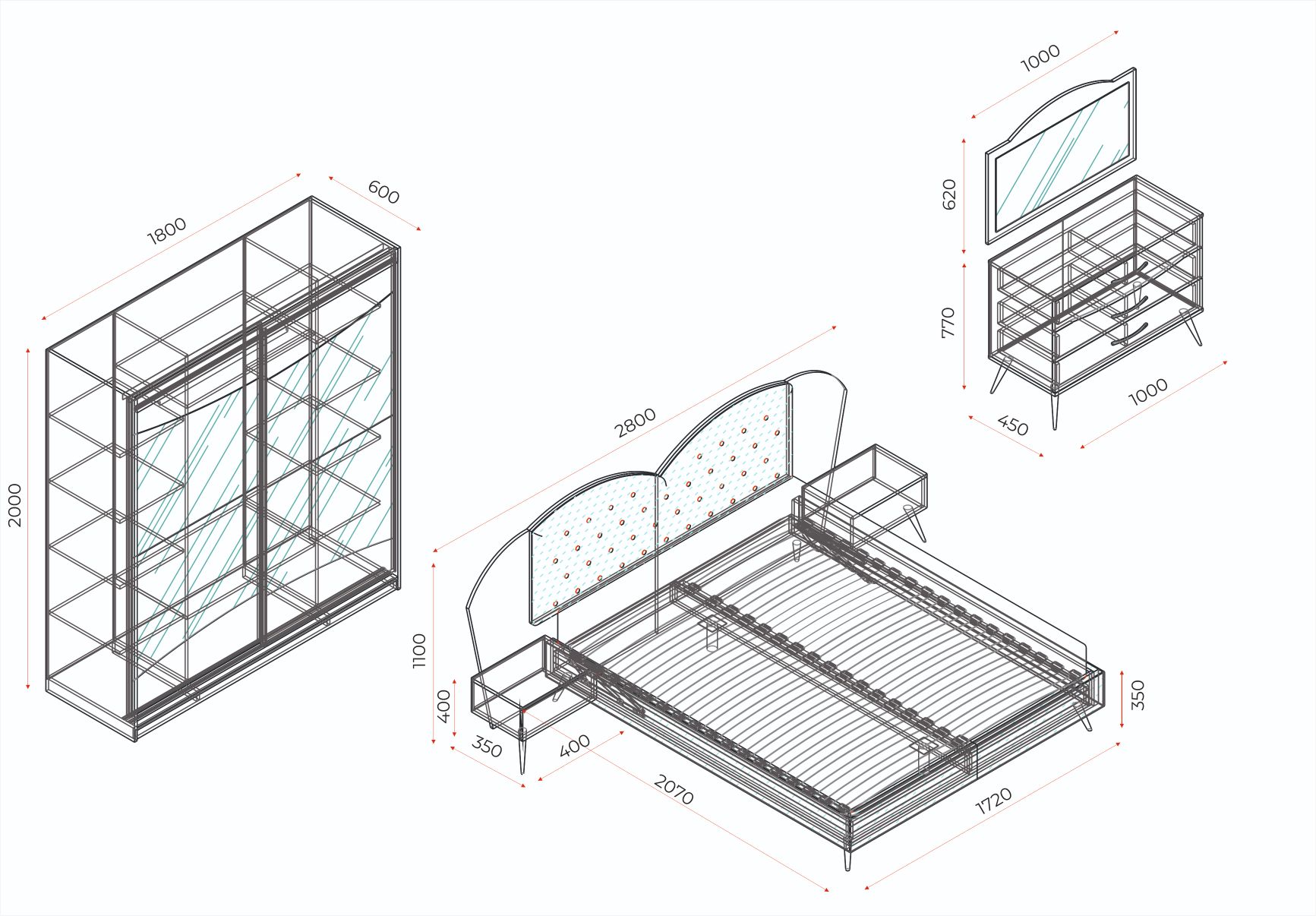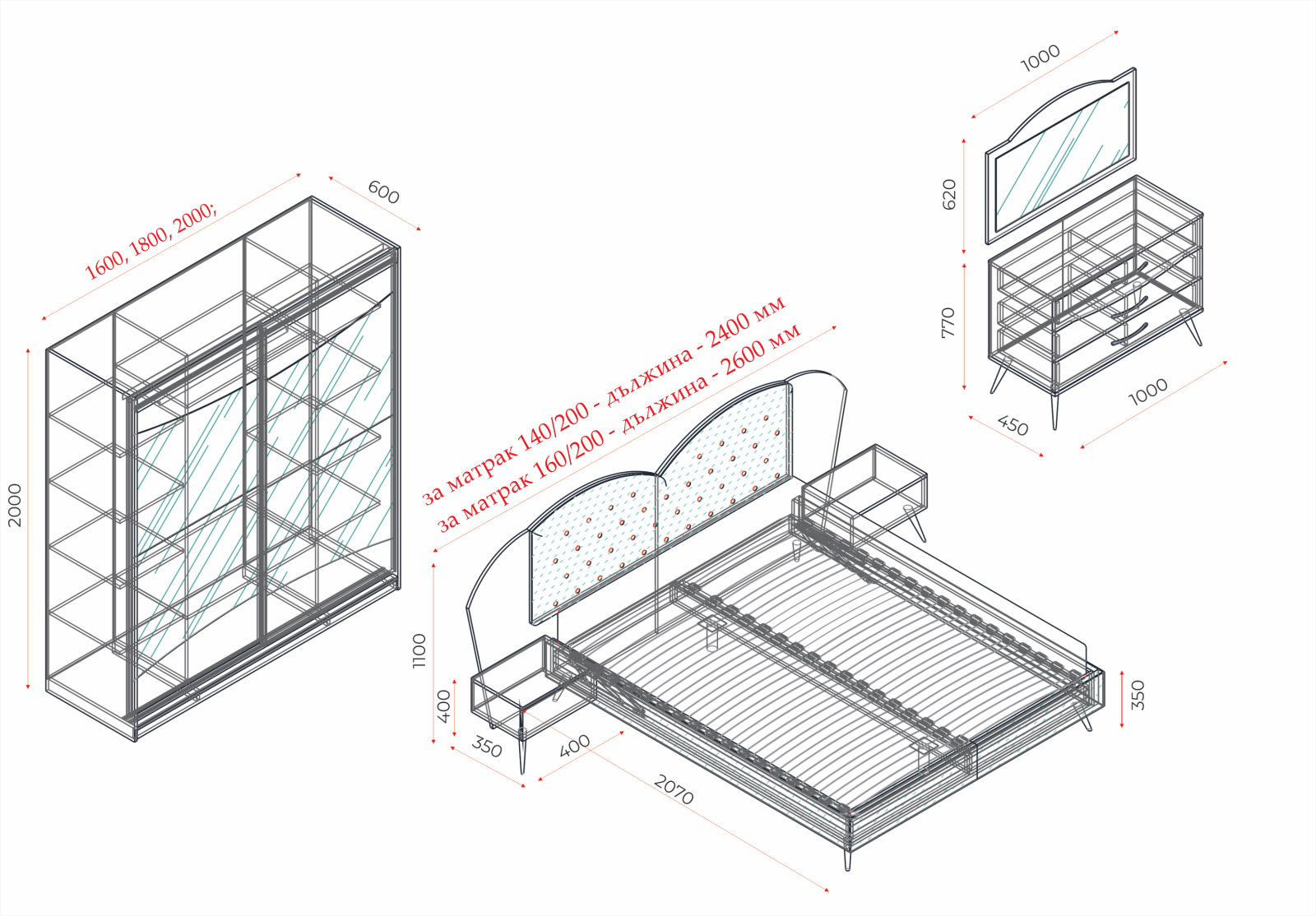 Гардероб: плъзгаща система – вътрешно водене, вертикално разположени вградени алуминиеви „П“- образни кант дръжки с допълнително излят външен улей за лесно и удобно захващане, спомагащи ефективното плъзгане на системата – гарантиращи устойчивост и здравина на вратите, използвани са сглобки – скрит монтаж, метални рафтоносачи за стабилност на рафтовете, лост за дрехи – метален – форма – елипса – покритие – никел, цялата конструкция на гардероба е монтирана върху метални реглажни „пети“ – осигуряващи изрядна нивелация на изделието и правилната му експлоатация, таблени врати в съчетание на двата декора, вградени извити огледала на двете врати;