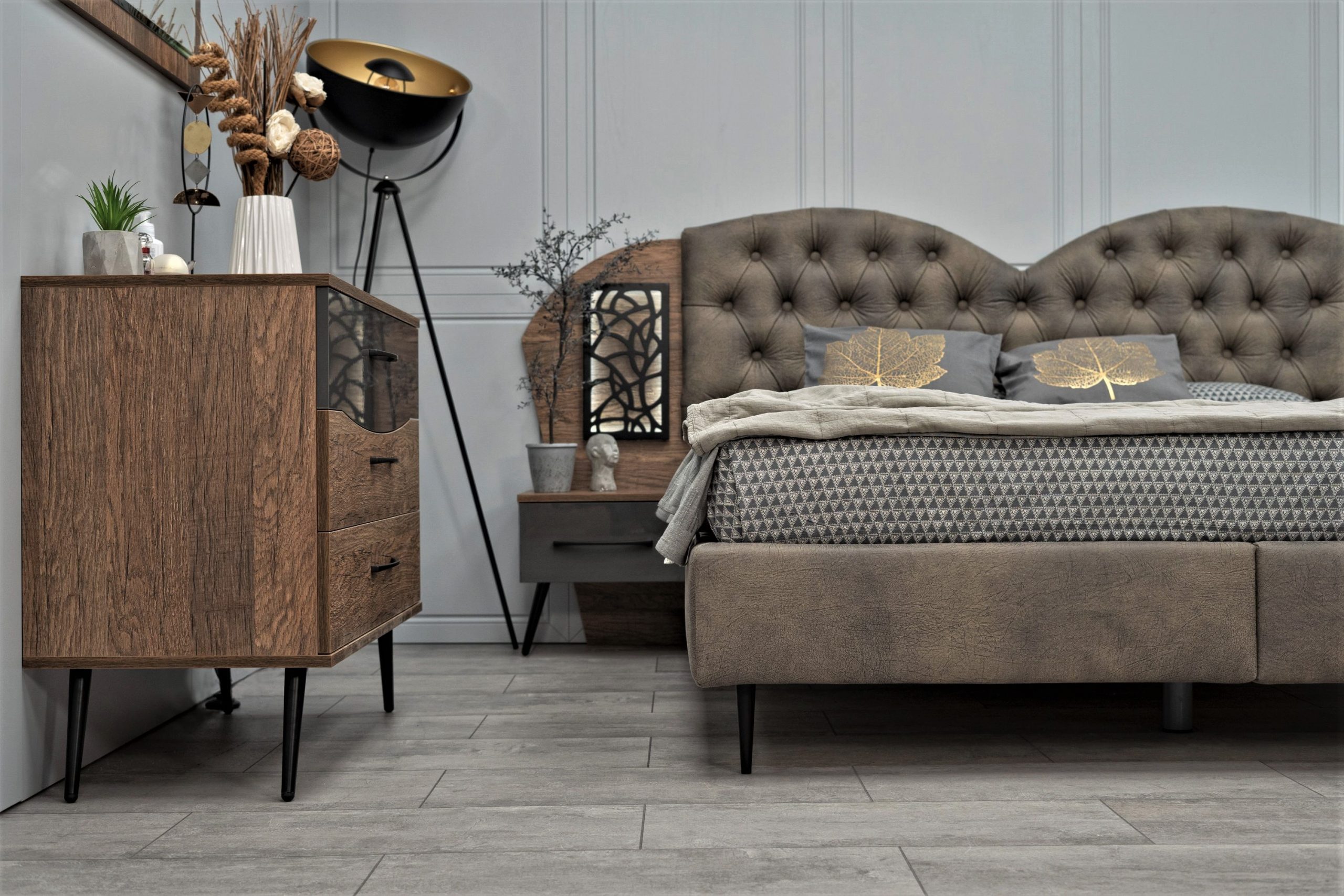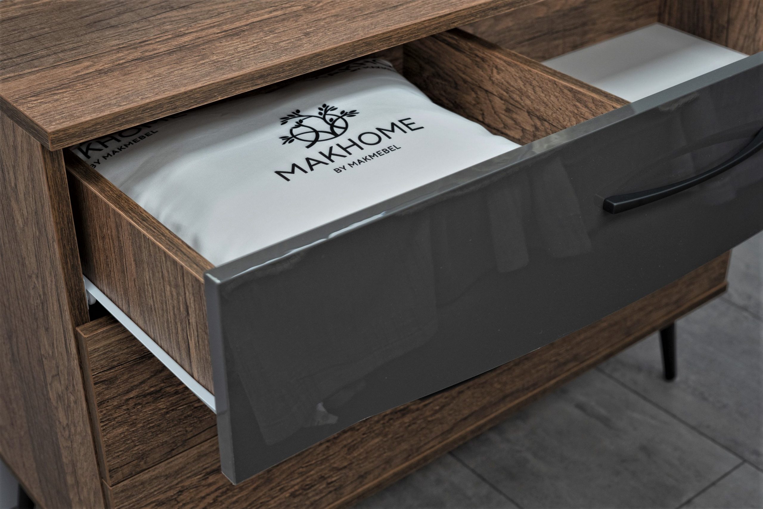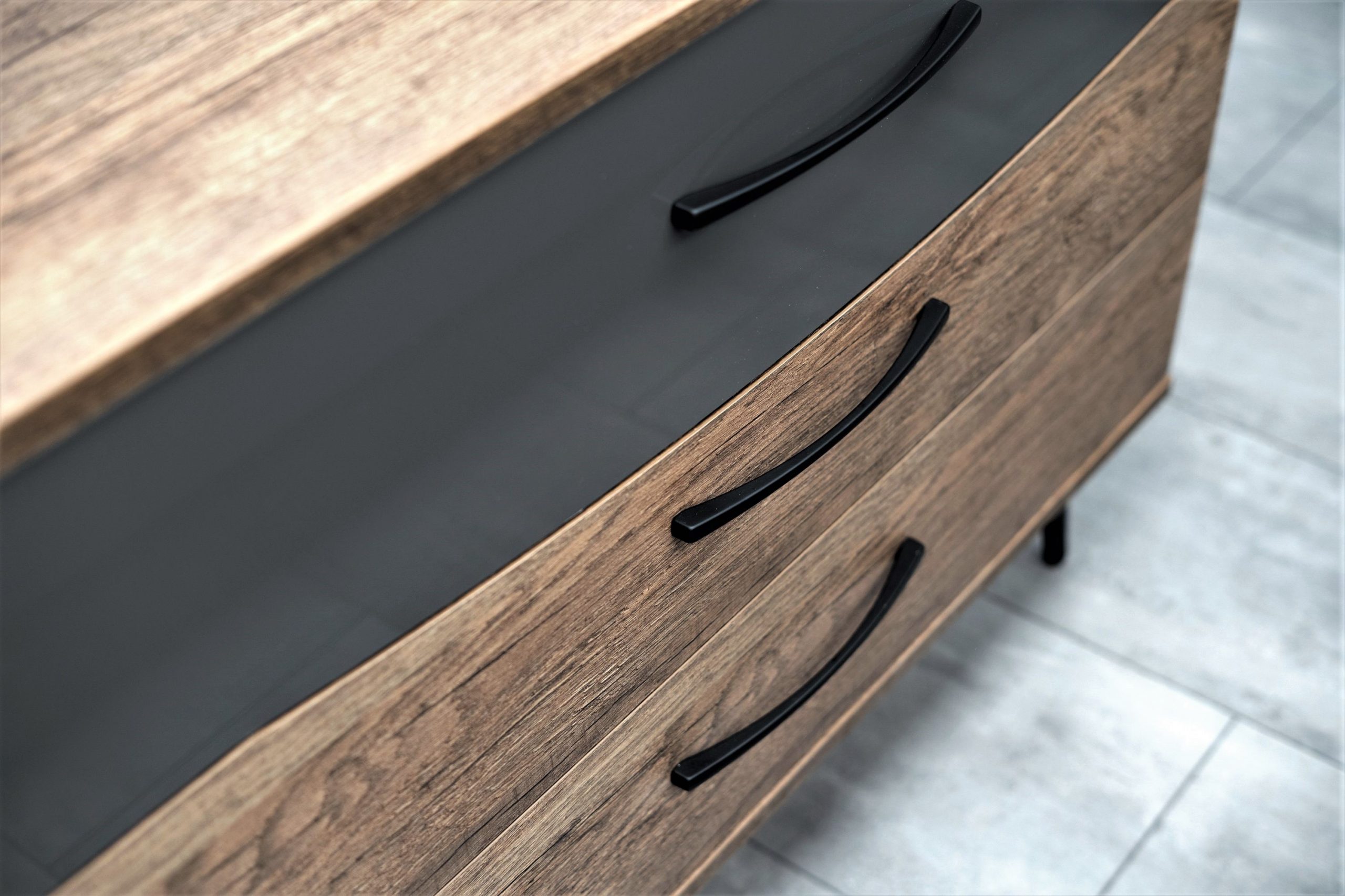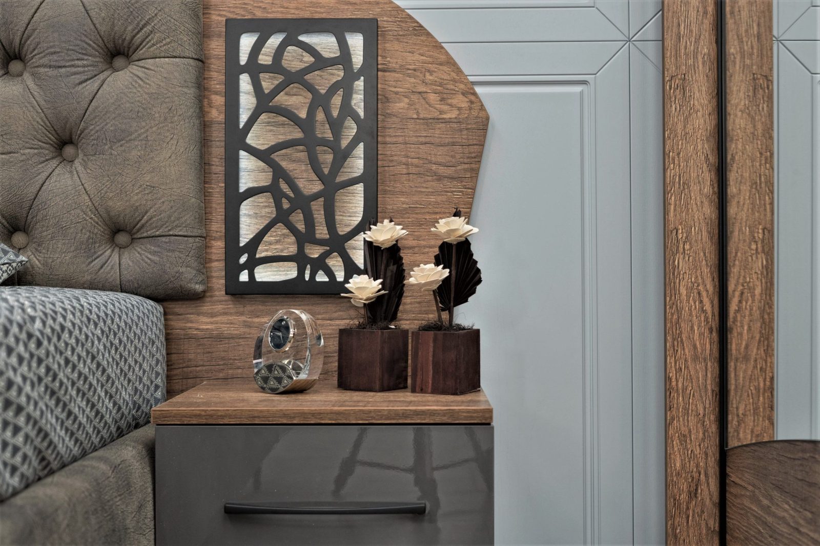 Нощно шкафче: вградено в таблата практично чекмедже, дръжки с форма дъга с покритие – черен мат, система скрити водачи Quadro Hettich – плавно затваряне – 2 бр. в к-т;