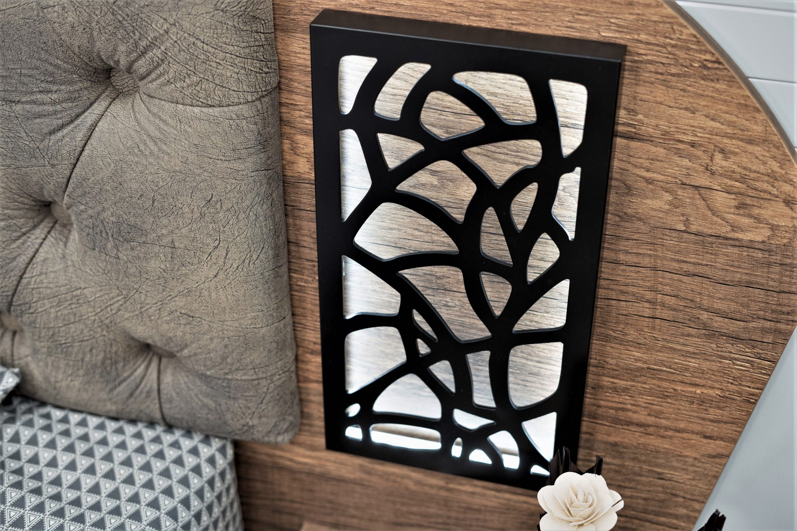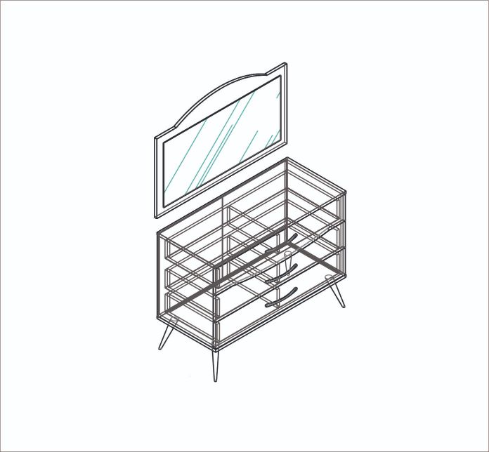 Скрин с огледало – опция! шест практични чекмеджета – всяко чекмедже е разделено от делител на две части – осигуряващо практично използване, дръжки с форма дъга, покритие – черен мат, система скрити водачи Quadro Hettich – плавно затваряне, пано с огледало позиционирано за стенен монтаж – 1 бр.