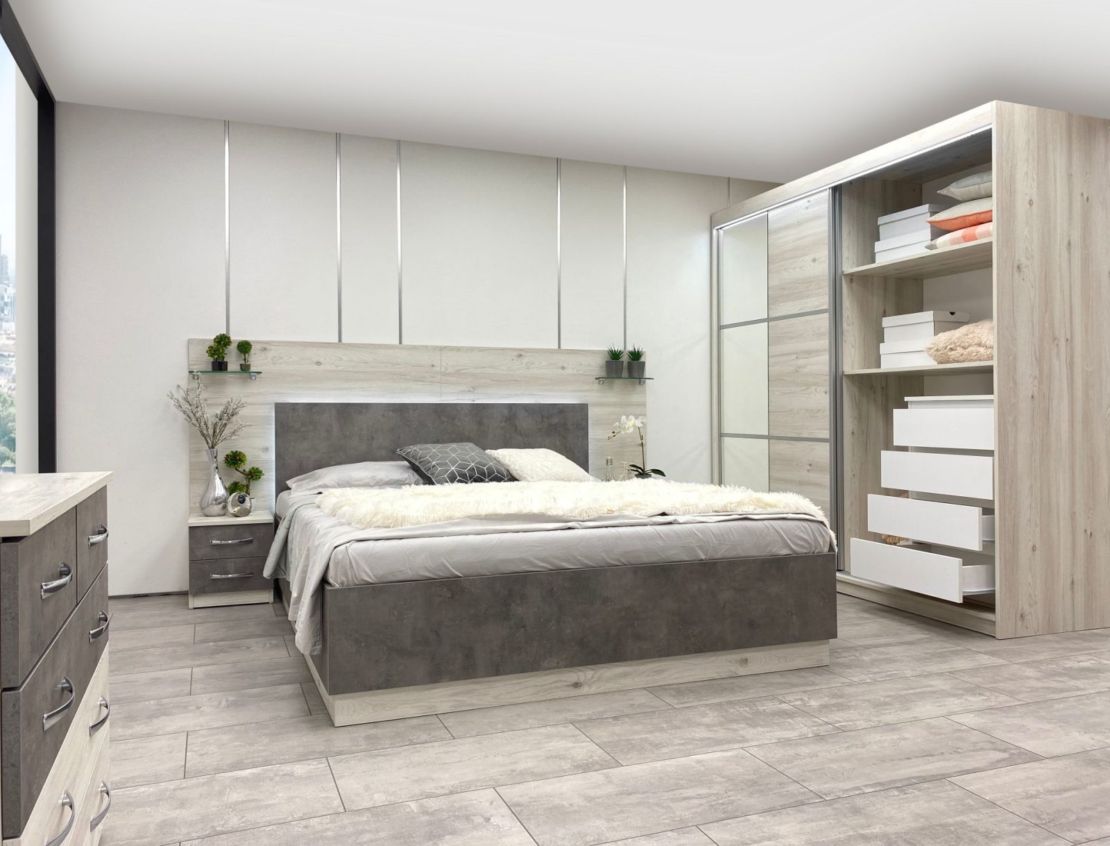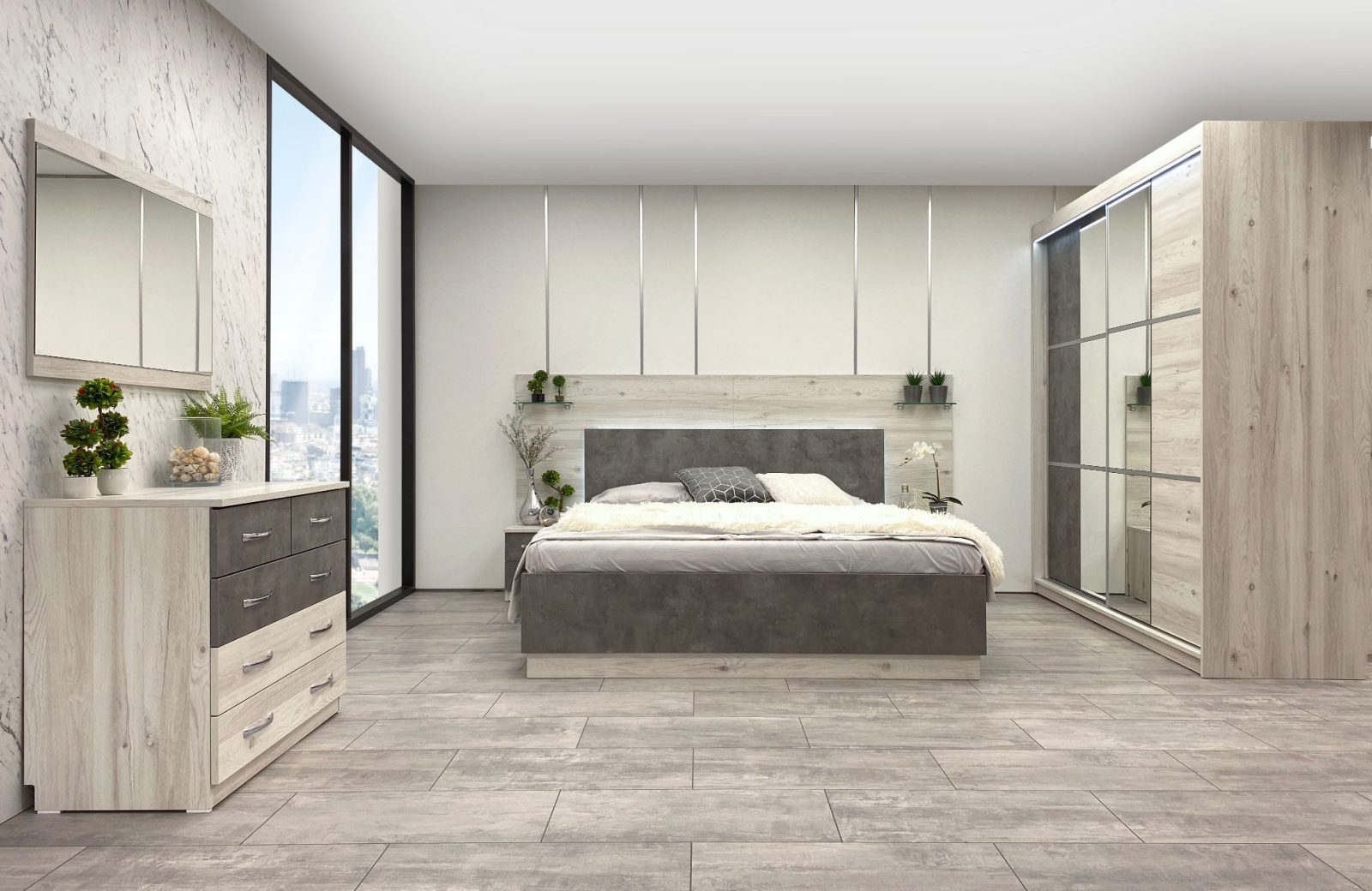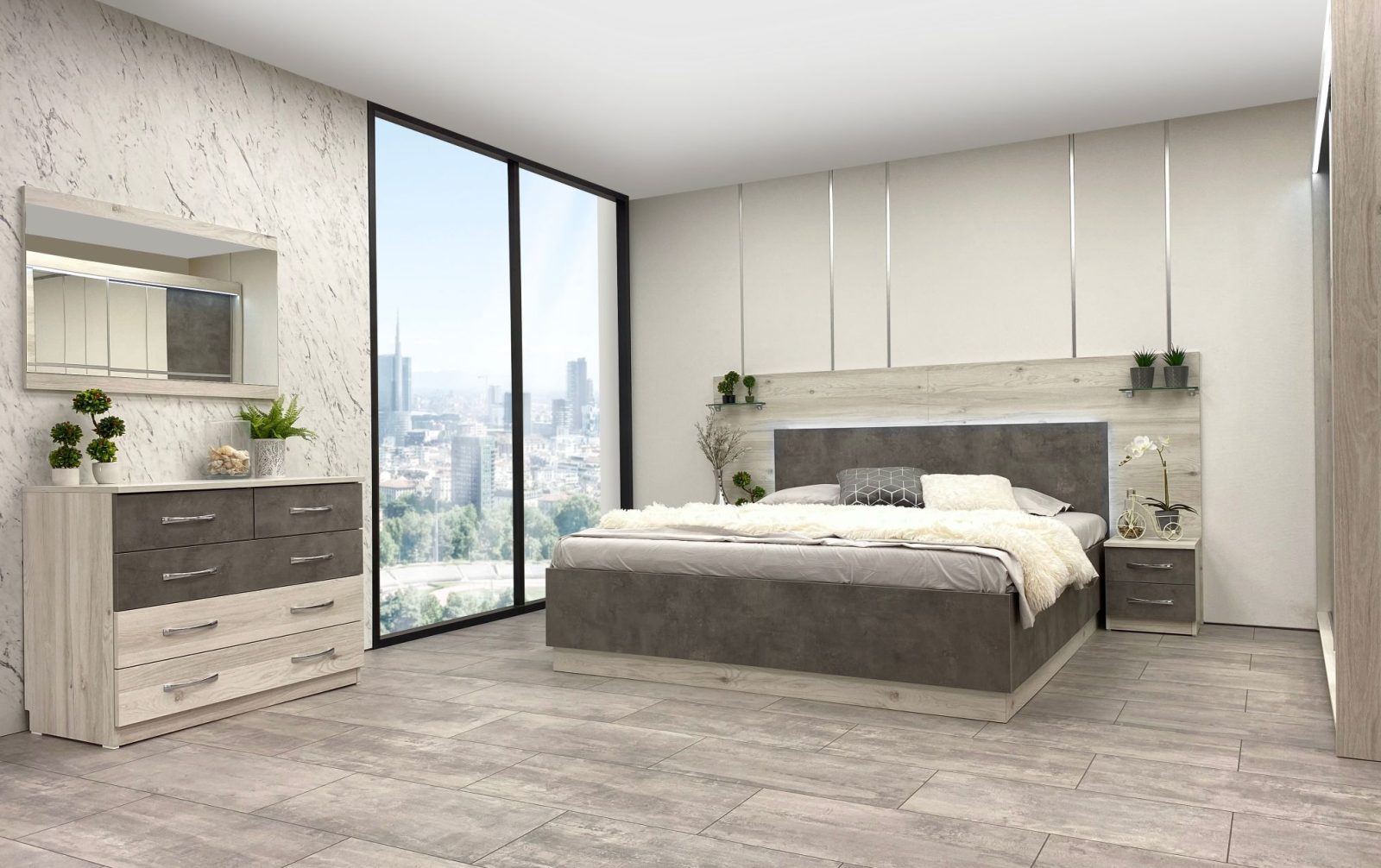 [vc_row type=“in_container“ full_screen_row_position=“middle“ column_margin=“default“ column_direction=“default“ column_direction_tablet=“default“ column_direction_phone=“default“ scene_position=“center“ text_color=“dark“ text_align=“left“ row_border_radius=“none“ row_border_radius_applies=“bg“ overflow=“visible“ overlay_strength=“0.3″ gradient_direction=“left_to_right“ shape_divider_position=“bottom“ bg_image_animation=“none“][vc_column column_padding=“no-extra-padding“ column_padding_tablet=“inherit“ column_padding_phone=“inherit“ column_padding_position=“all“ column_element_direction_desktop=“default“ column_element_spacing=“default“ desktop_text_alignment=“default“ tablet_text_alignment=“default“ phone_text_alignment=“default“ background_color_opacity=“1″ background_hover_color_opacity=“1″ column_backdrop_filter=“none“ column_shadow=“none“ column_border_radius=“none“ column_link_target=“_self“ column_position=“default“ gradient_direction=“left_to_right“ overlay_strength=“0.3″ width=“1/1″ tablet_width_inherit=“default“ animation_type=“default“ bg_image_animation=“none“ border_type=“simple“ column_border_width=“none“ column_border_style=“solid“][vc_column_text el_class=“description-holder-field“]спален комплект „Нове“ е произведен от висококачествено ламинирано ПДЧ 18 мм, основен декор капри, съпътстващ  декор – бетон тъмен. Всички части са обкантени от кант с дебелина 1,00 мм –  фасетиран по ръбовете;