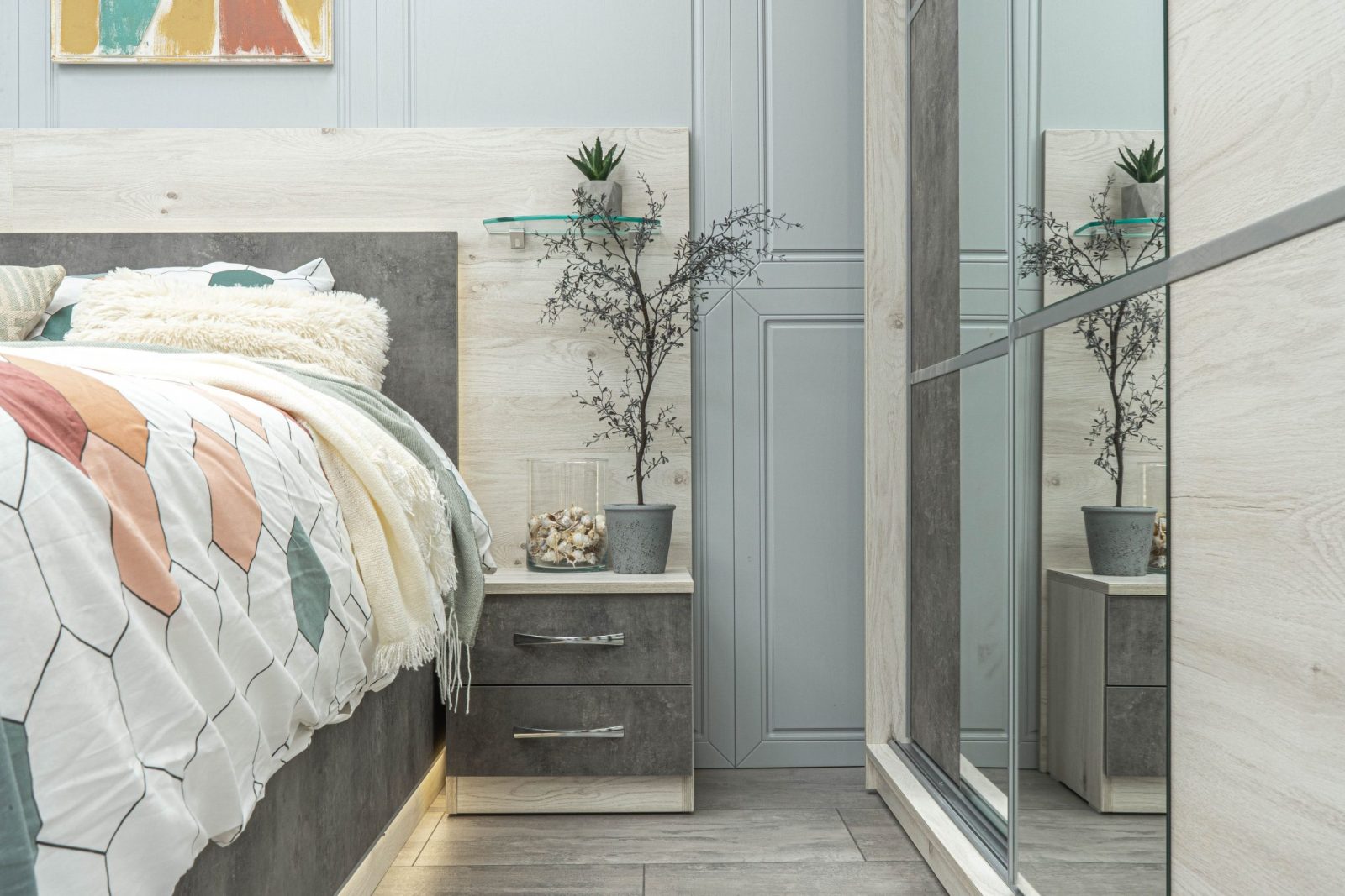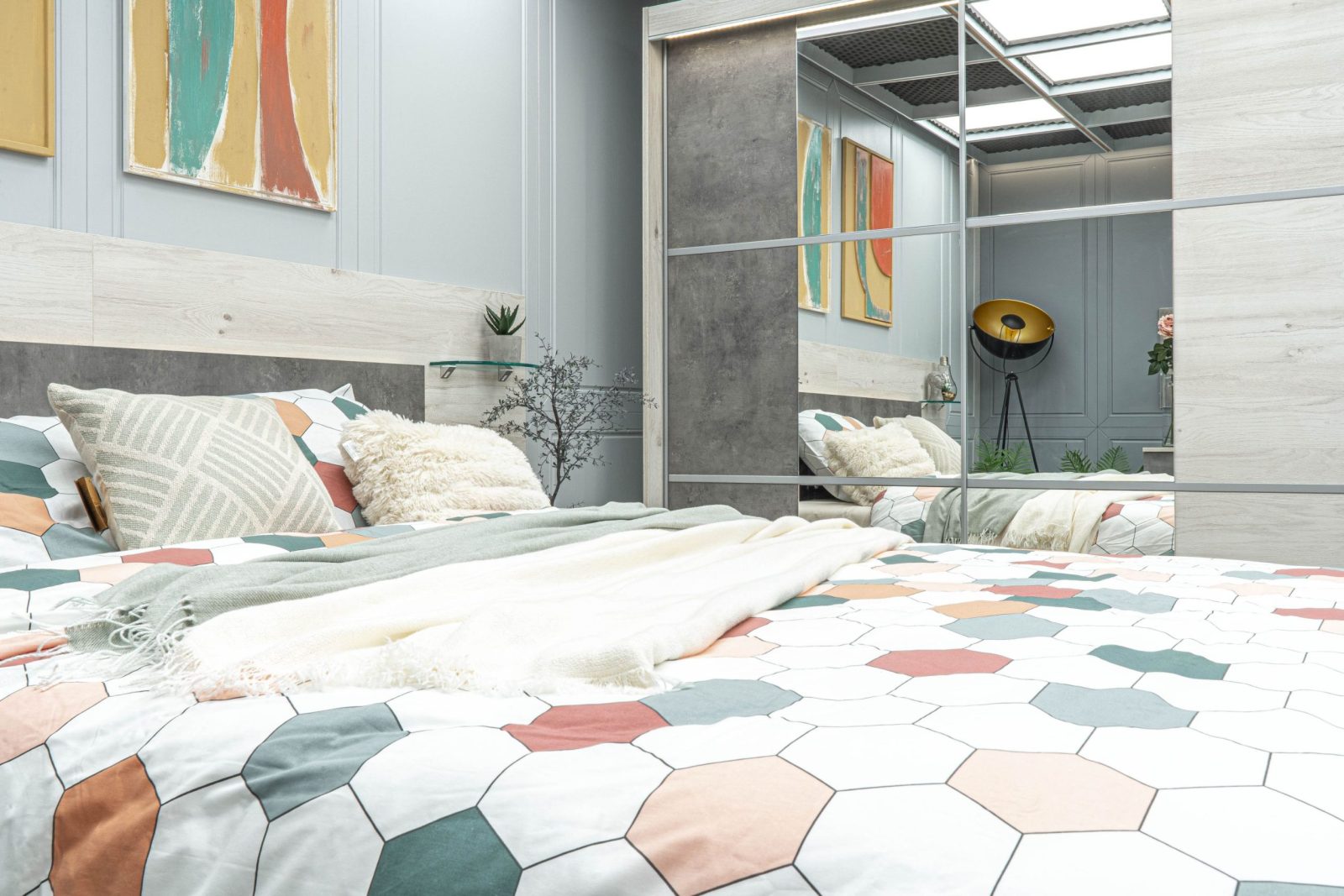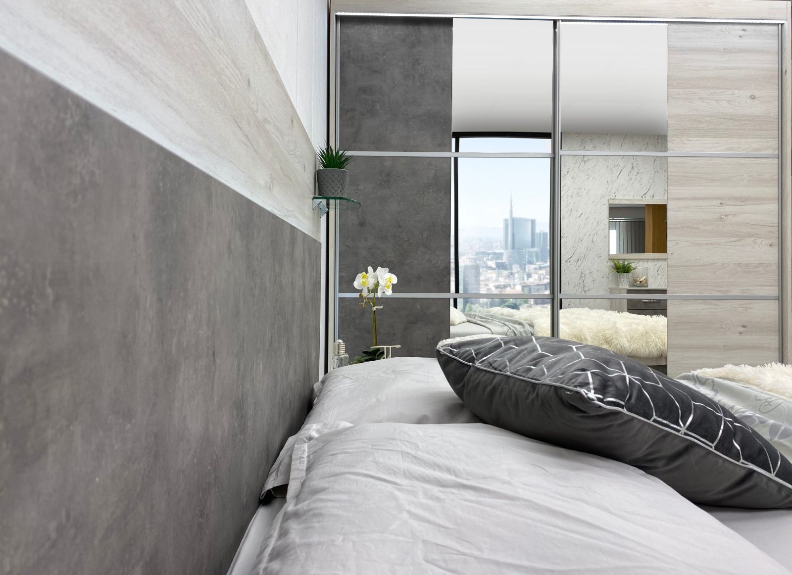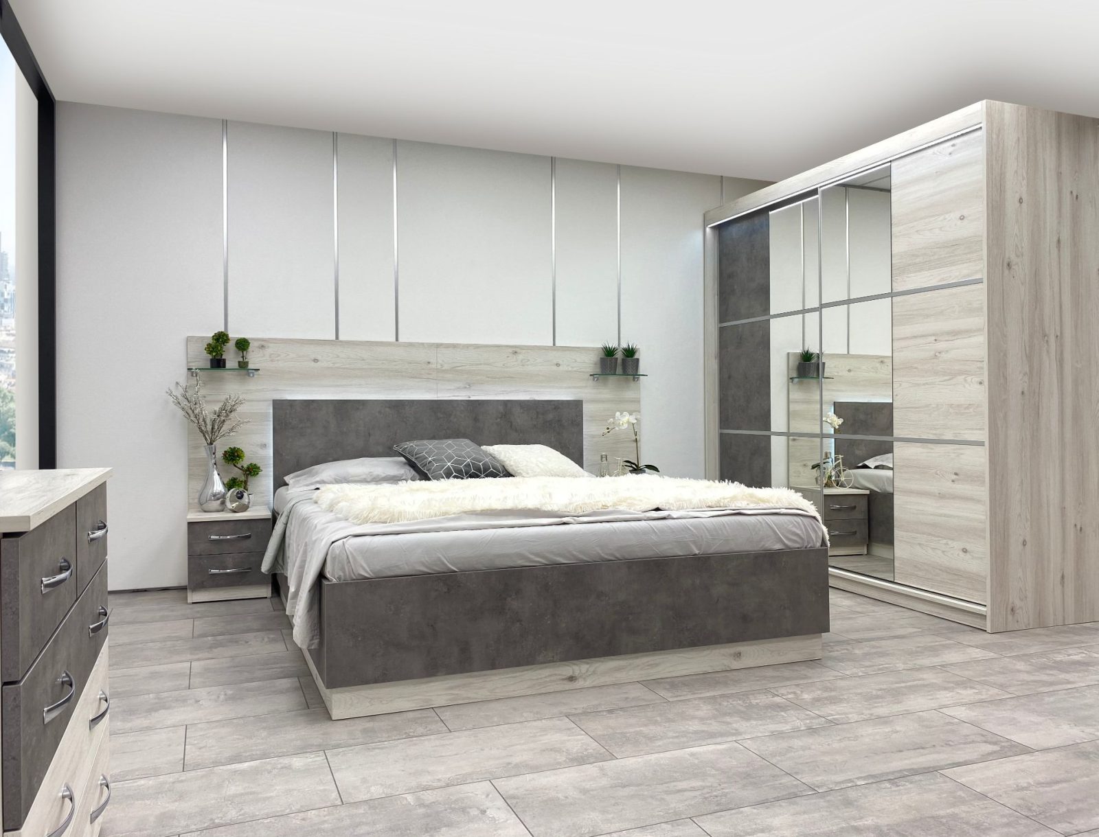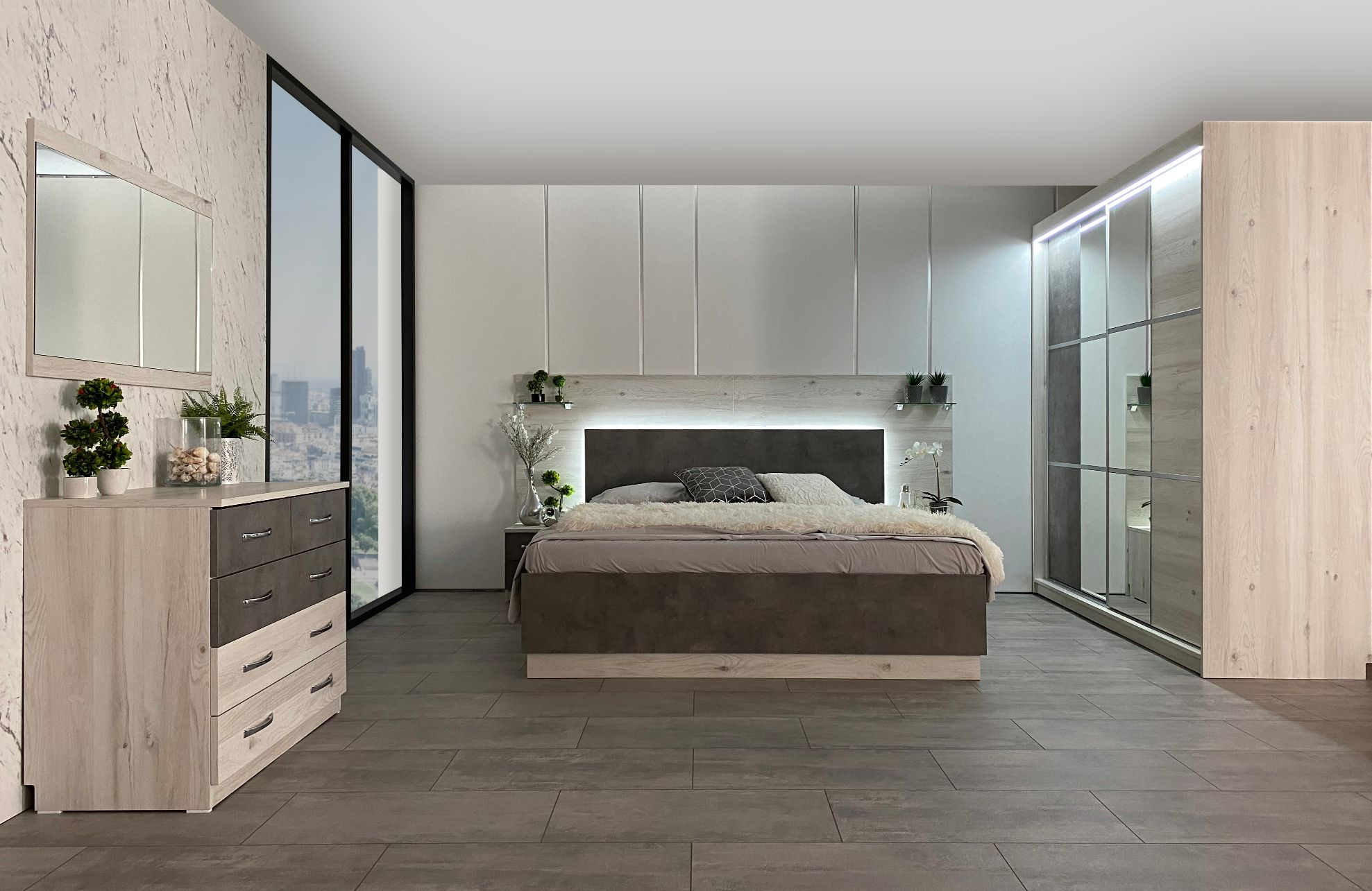 Гардероб: плъзгаща система вътрешно водене, вертикално разположени вградени алуминиеви „П“- образни кант дръжки с допълнително излят външен улей за лесно и удобно захващане, спомагащи ефективното плъзгане на системата – гарантиращи устойчивост и здравина на вратите, използвани са сглобки – скрит монтаж, метални рафтоносачи за стабилност на рафтовете, лост за дрехи – метален – форма – елипса – покритие – никел, цялата конструкция на гардероба е монтирана върху метални реглажни „пети“  – осигуряващи изрядна нивелация на изделието и правилната му експлоатация, вратите са изработени от пана декор тъмен бетон  и капри + вградени огледала  – 1 бр. в к-т;