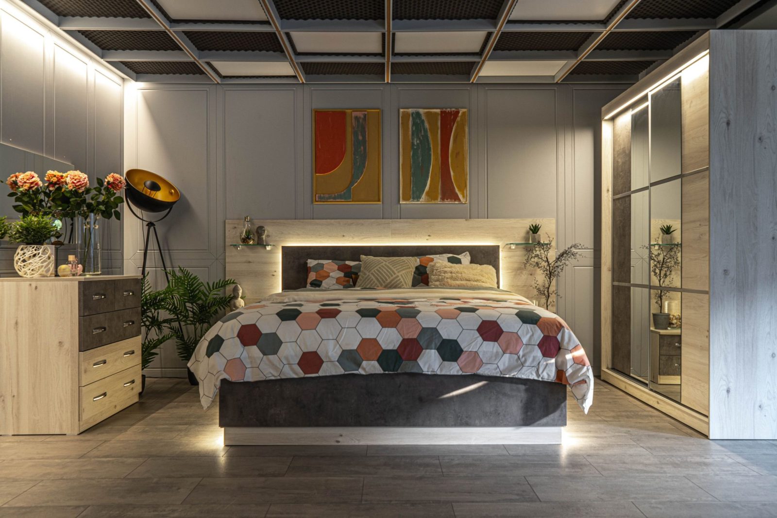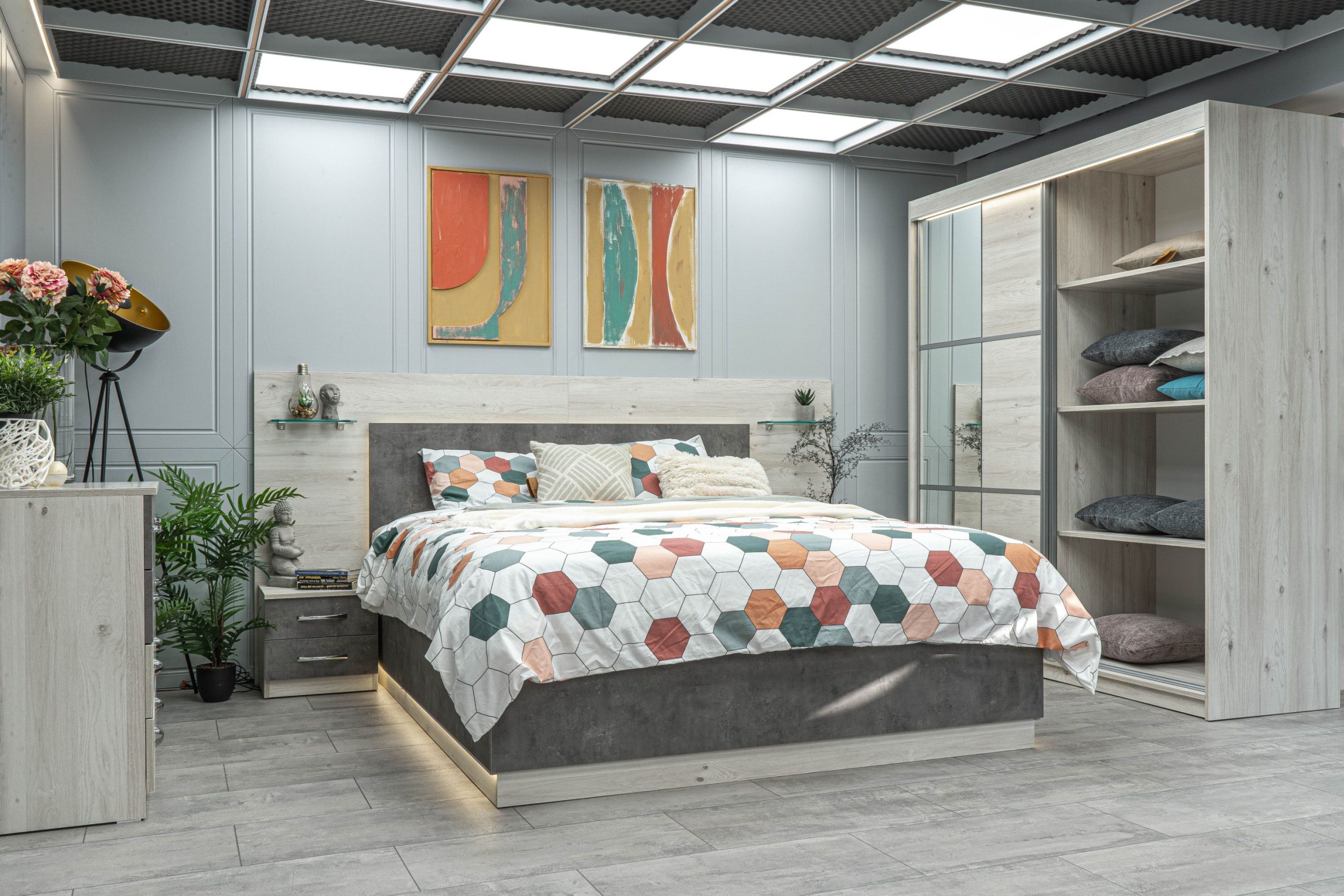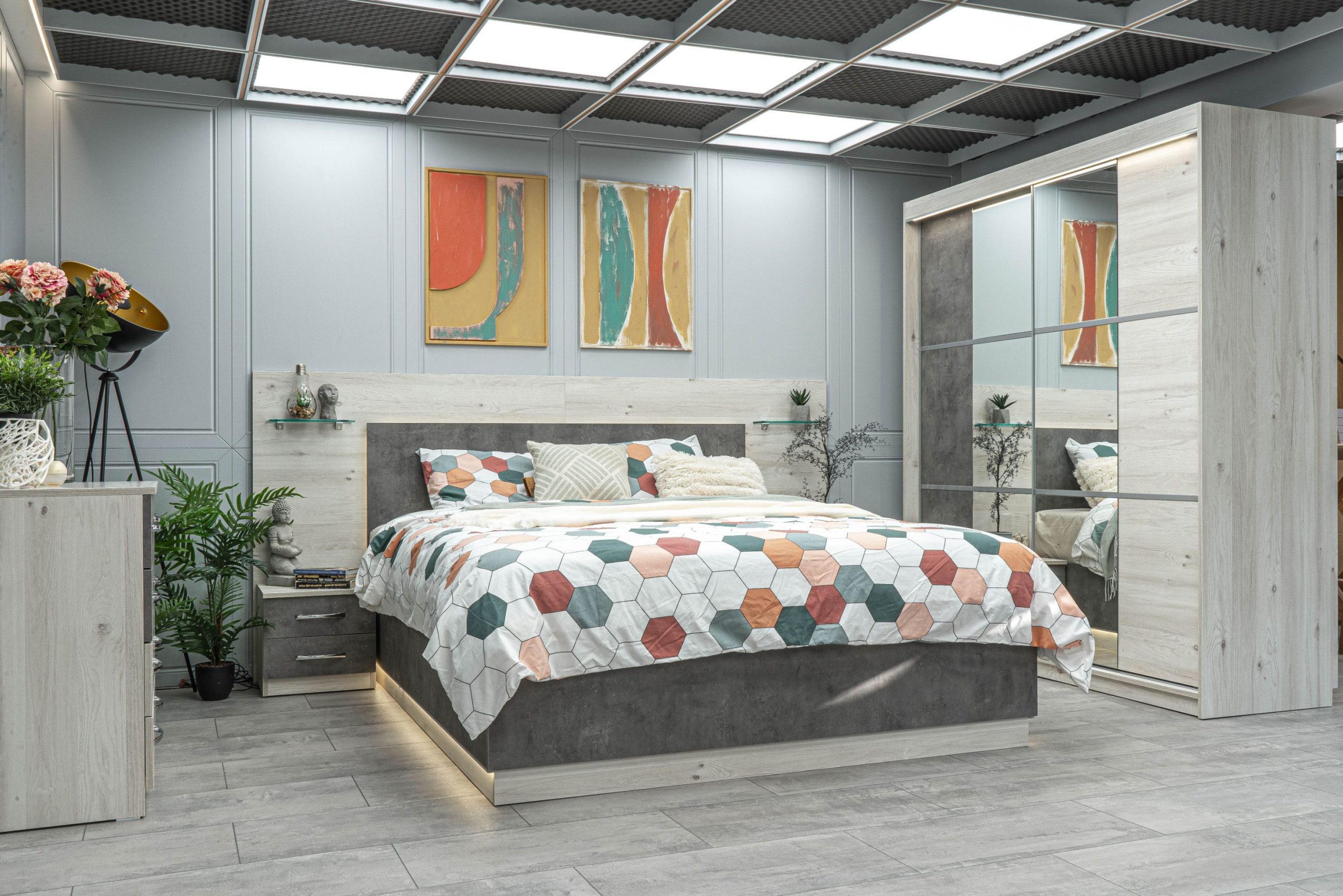 Легло: двойна табла  – основна – ПДЧ – капри, втора табла от бетон тъмен с вградено LED осветление, режим на работа – дистанционно с опция за регулиране силата на светлина.  База за матрак с вграден вътрешен мост – гарантираща прав диагонал на матрака. Всички използвани сглобки са метални – скрит монтаж. Сдвоени царги – външен декор – бетон, външен – капри;