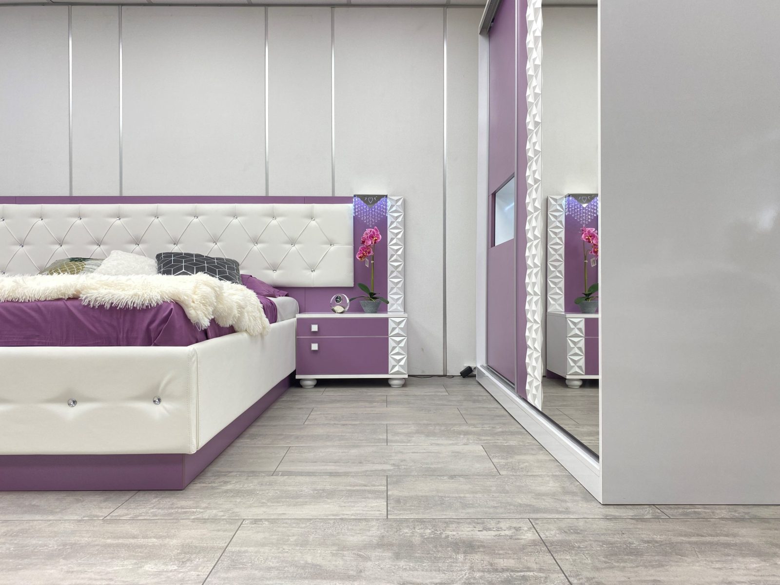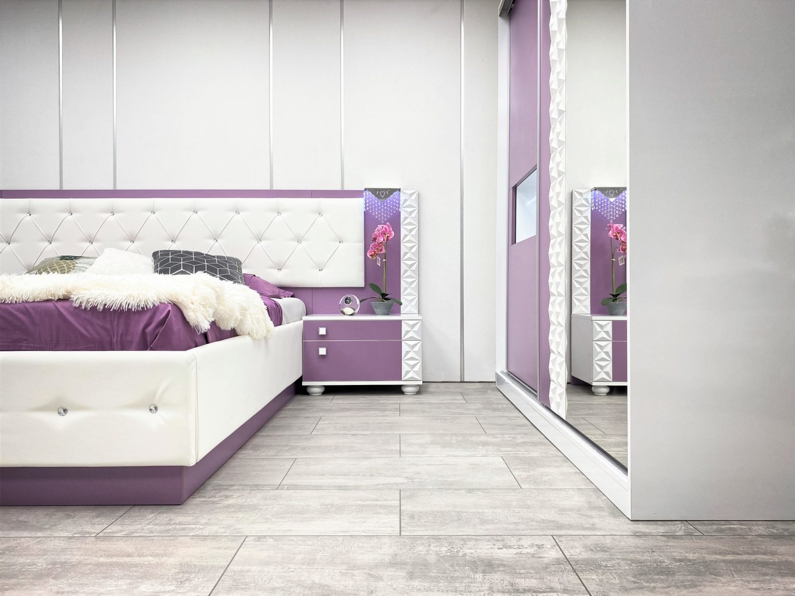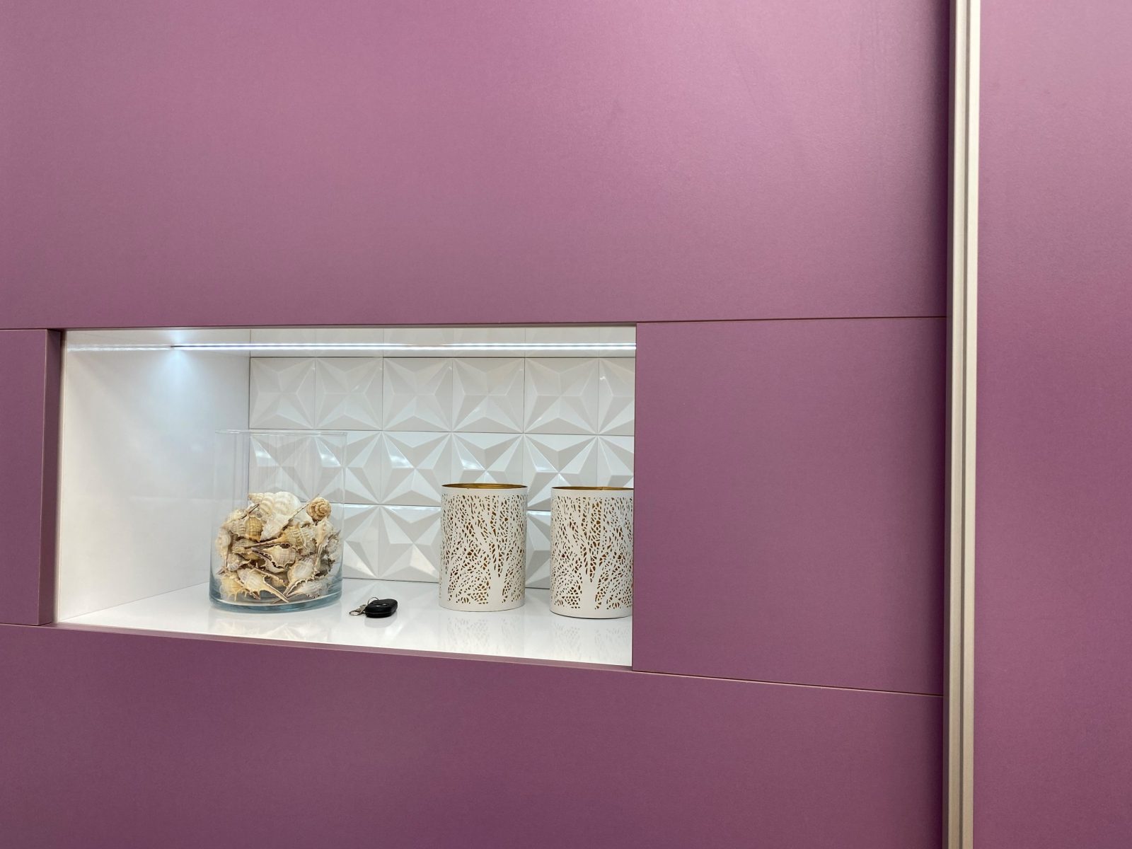 В едно помещение, обзаведено в модерен класически стил, се срещат деликатно лилаво и гланцирано бяло. Вграденото LED осветление, не е само елемент от интериора, но и източник на прекрасна атмосфера.
