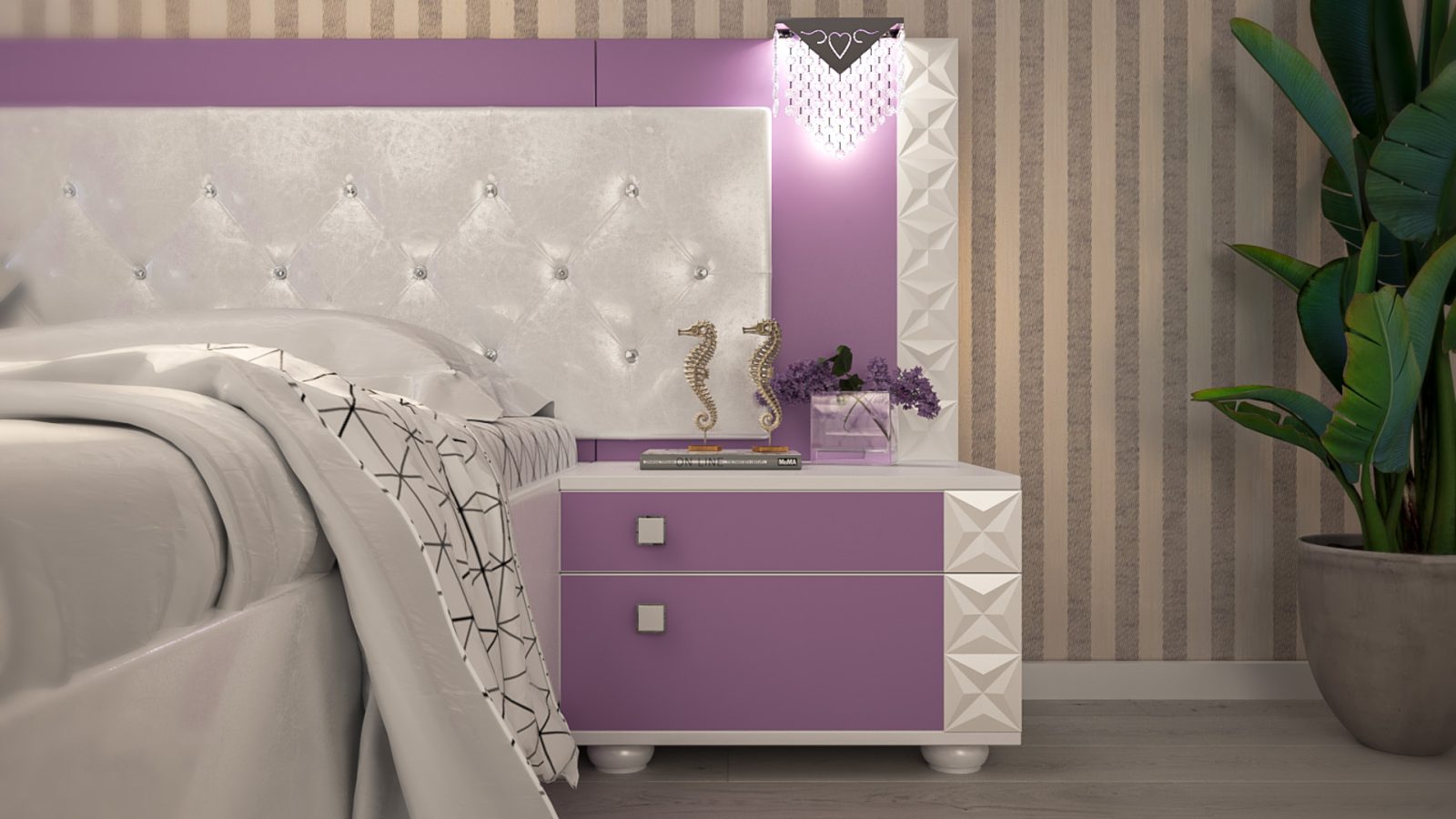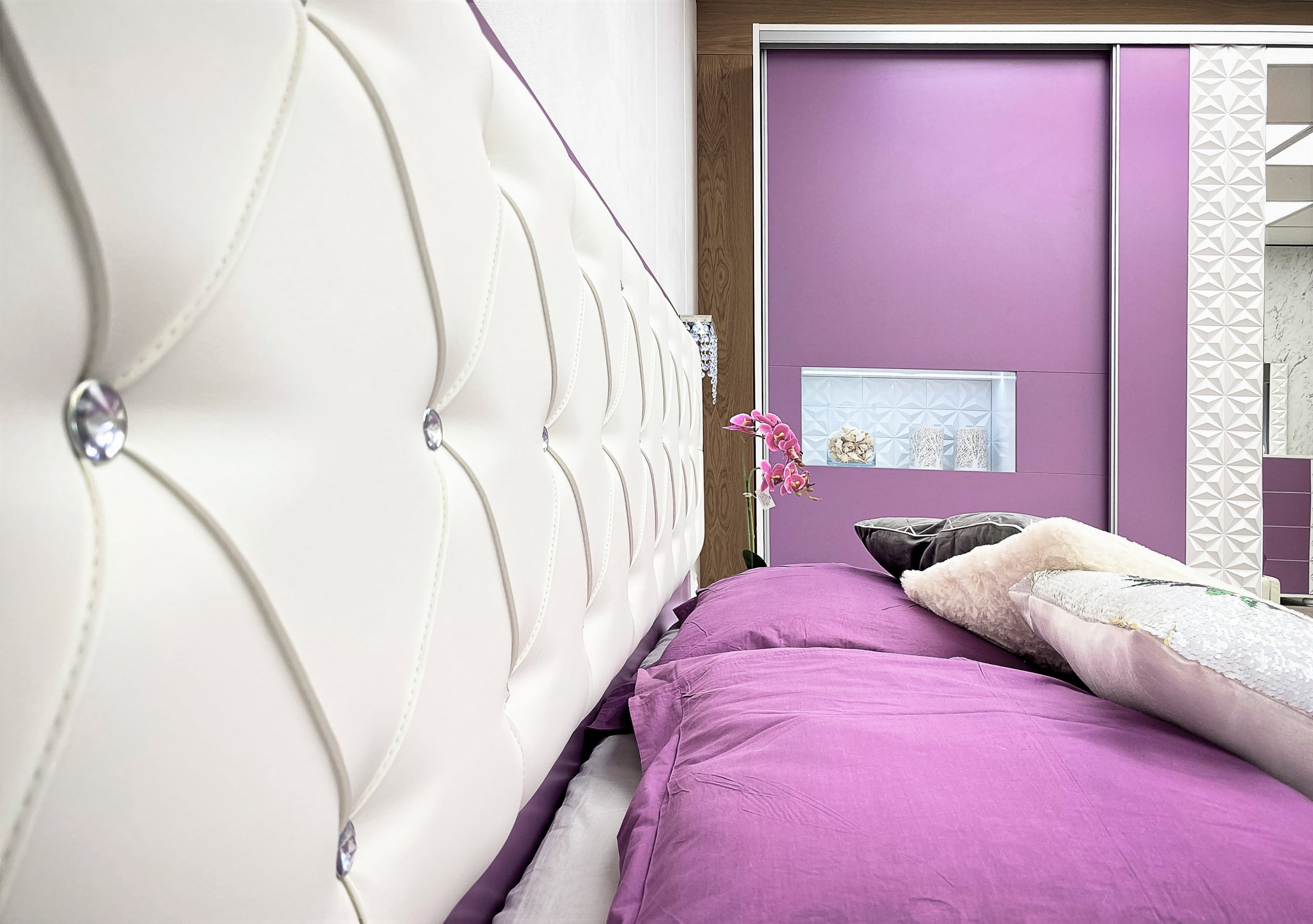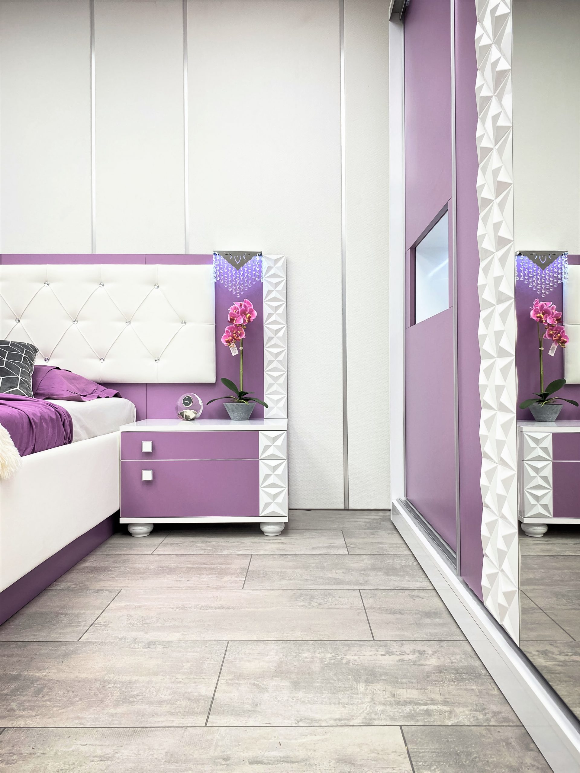 В едно помещение, обзаведено в модерен класически стил, се срещат деликатно лилаво и гланцирано бяло. Вграденото LED осветление, не е само елемент от интериора, но и източник на прекрасна атмосфера.