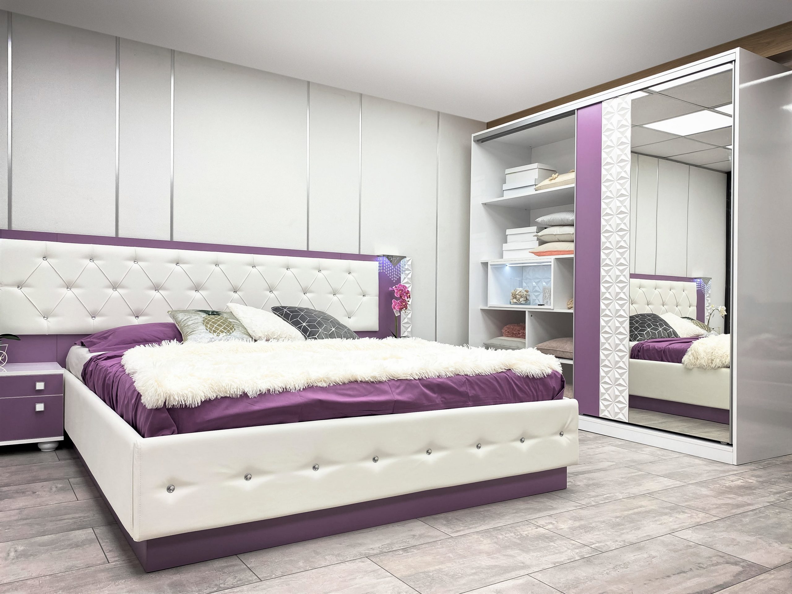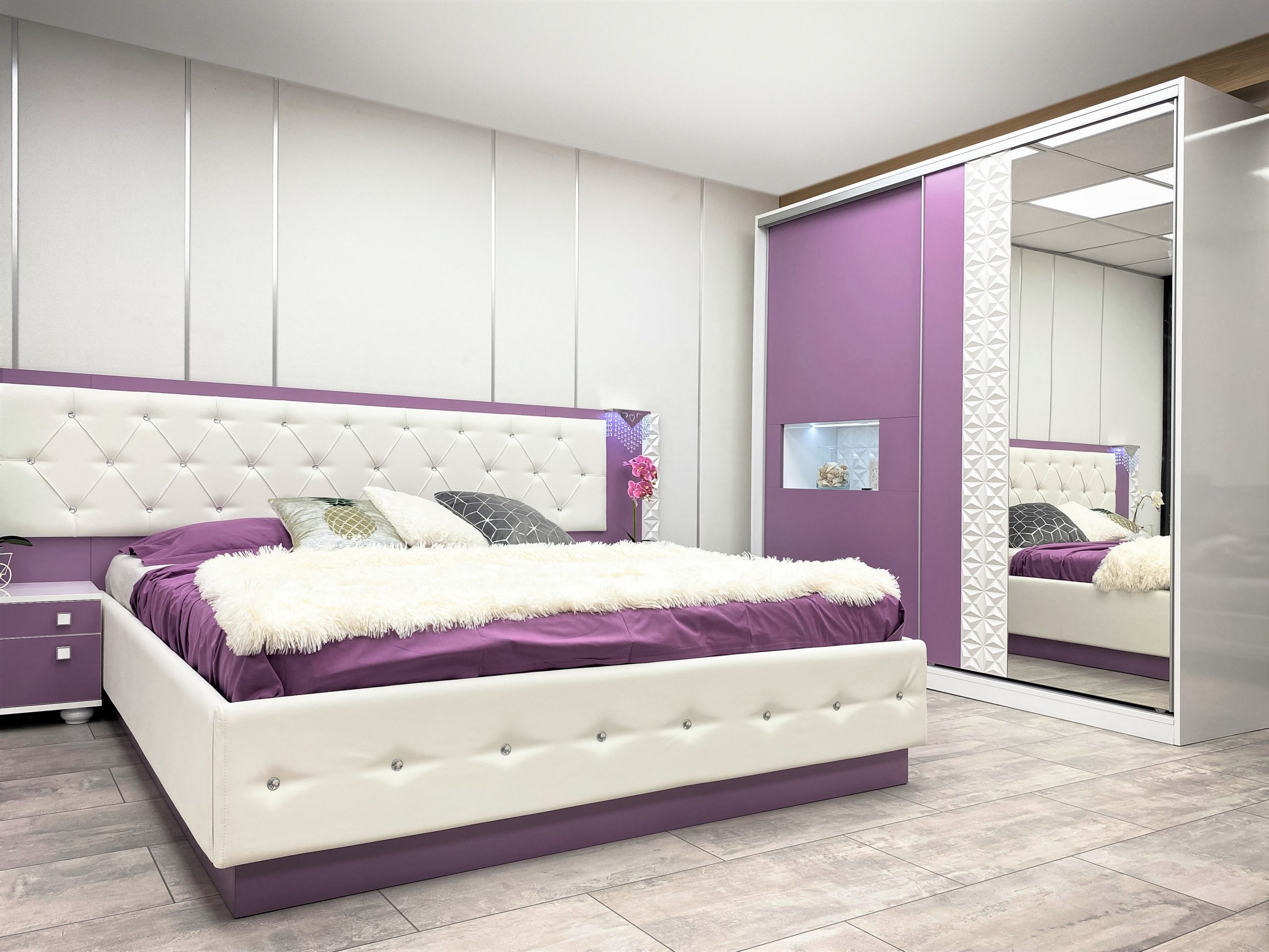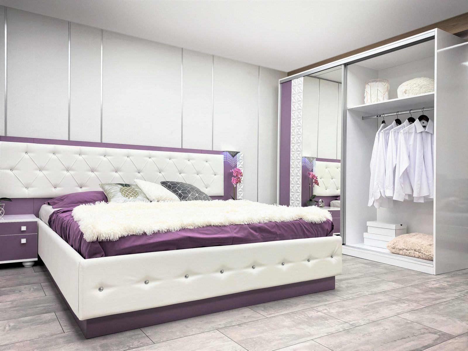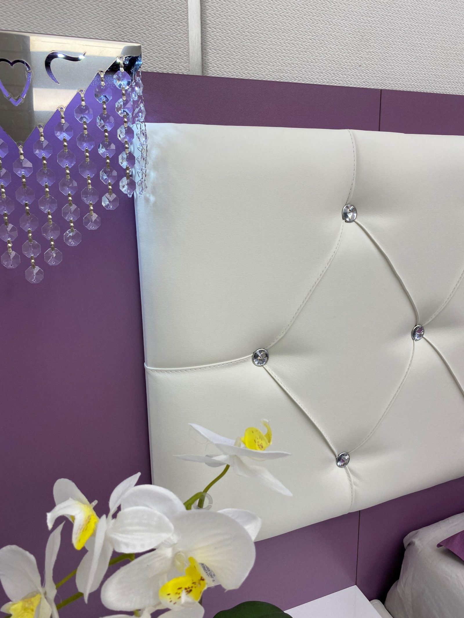 Легло: Eлегантна табла с фин капитонаж от еко кожа с висок клас на  износоустойчивост, цвят – снежно бял с акценти от прозрачен кристал и външен декоративен тигел – цвят снежно бял. База за матрак  с тапицерия от еко кожа с висока износоустойчивост , цвят – снежно бял, челната бленда  е с акценти от прозрачен бял кристал. Елегантни лампи с нежни кристали LED осветление – опция –  сензор с допир контрол.